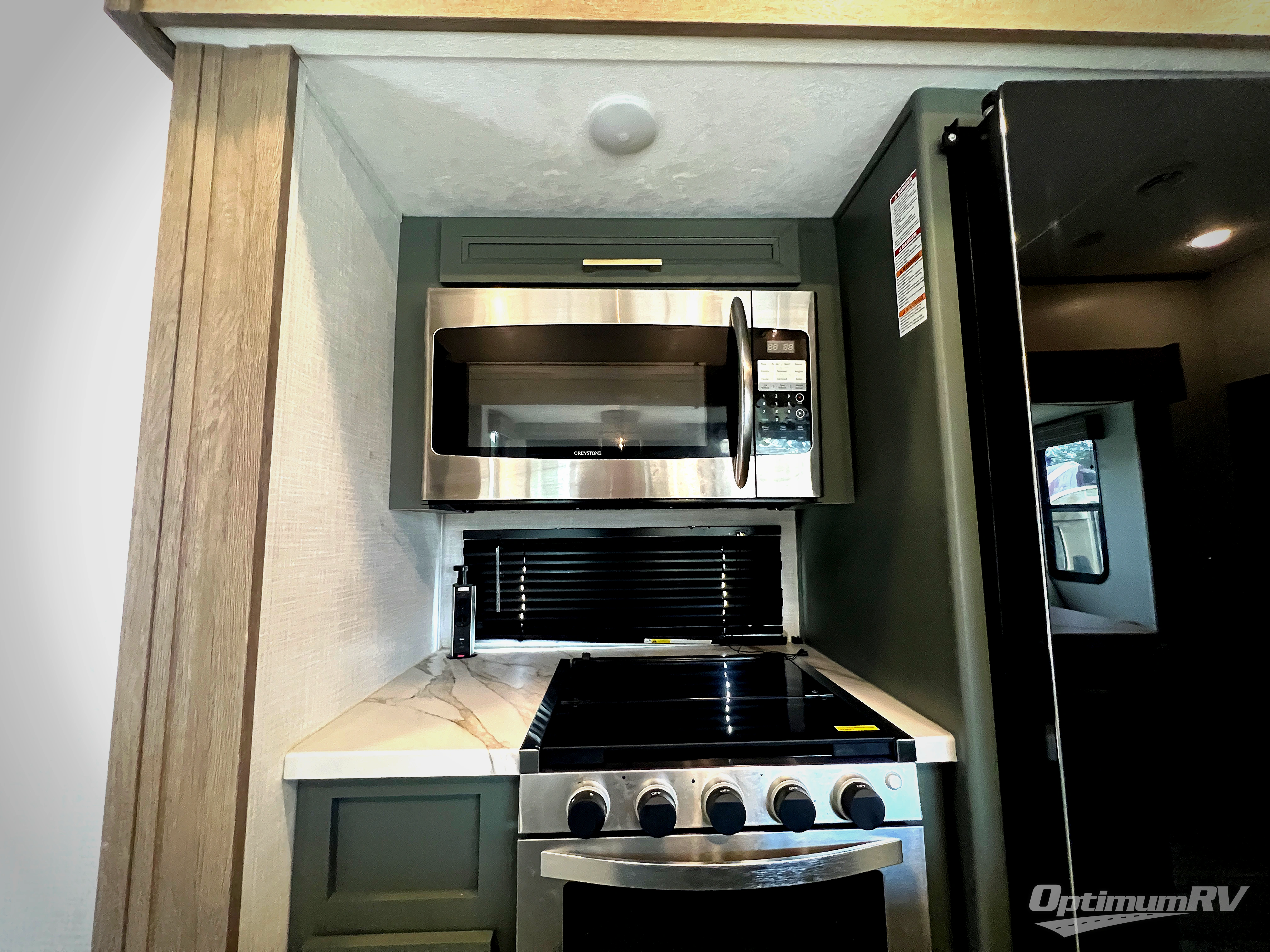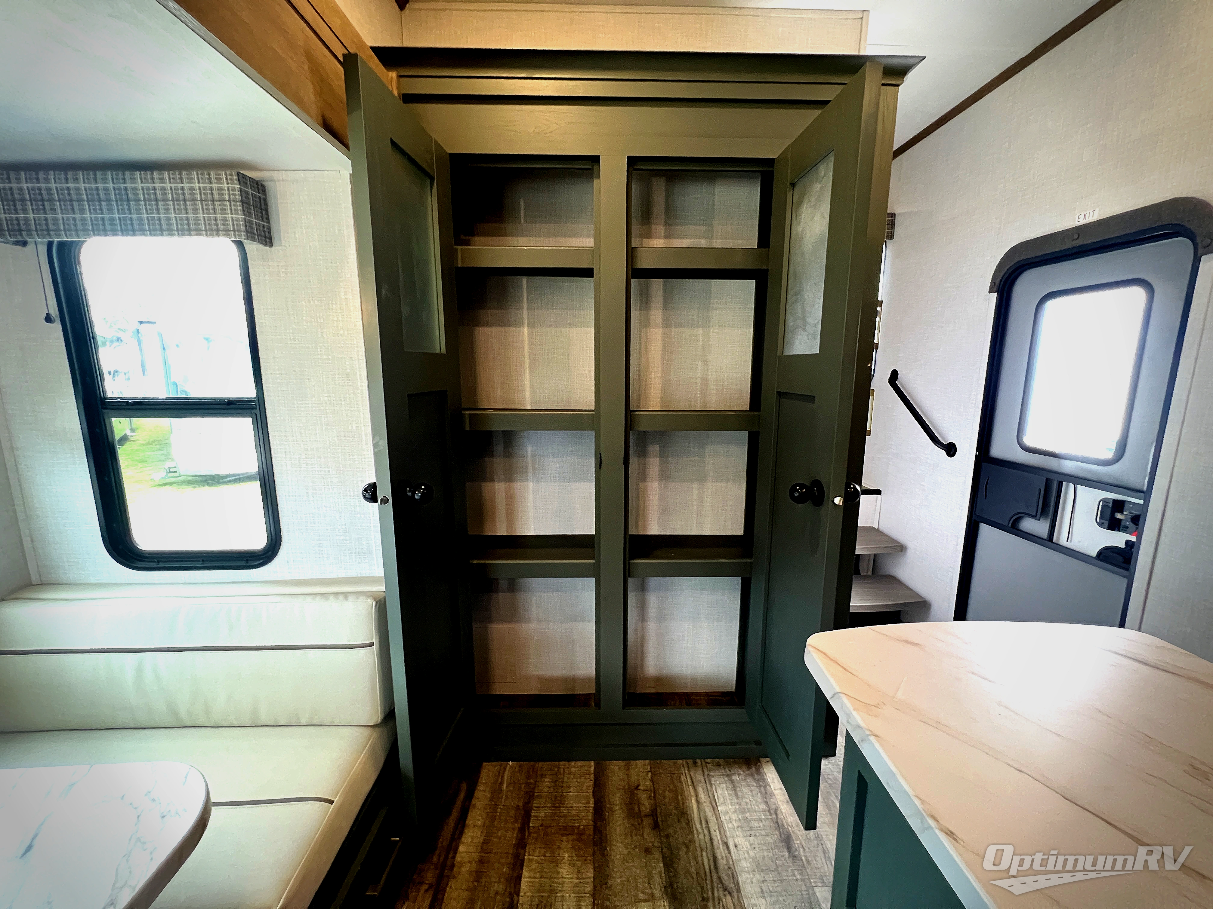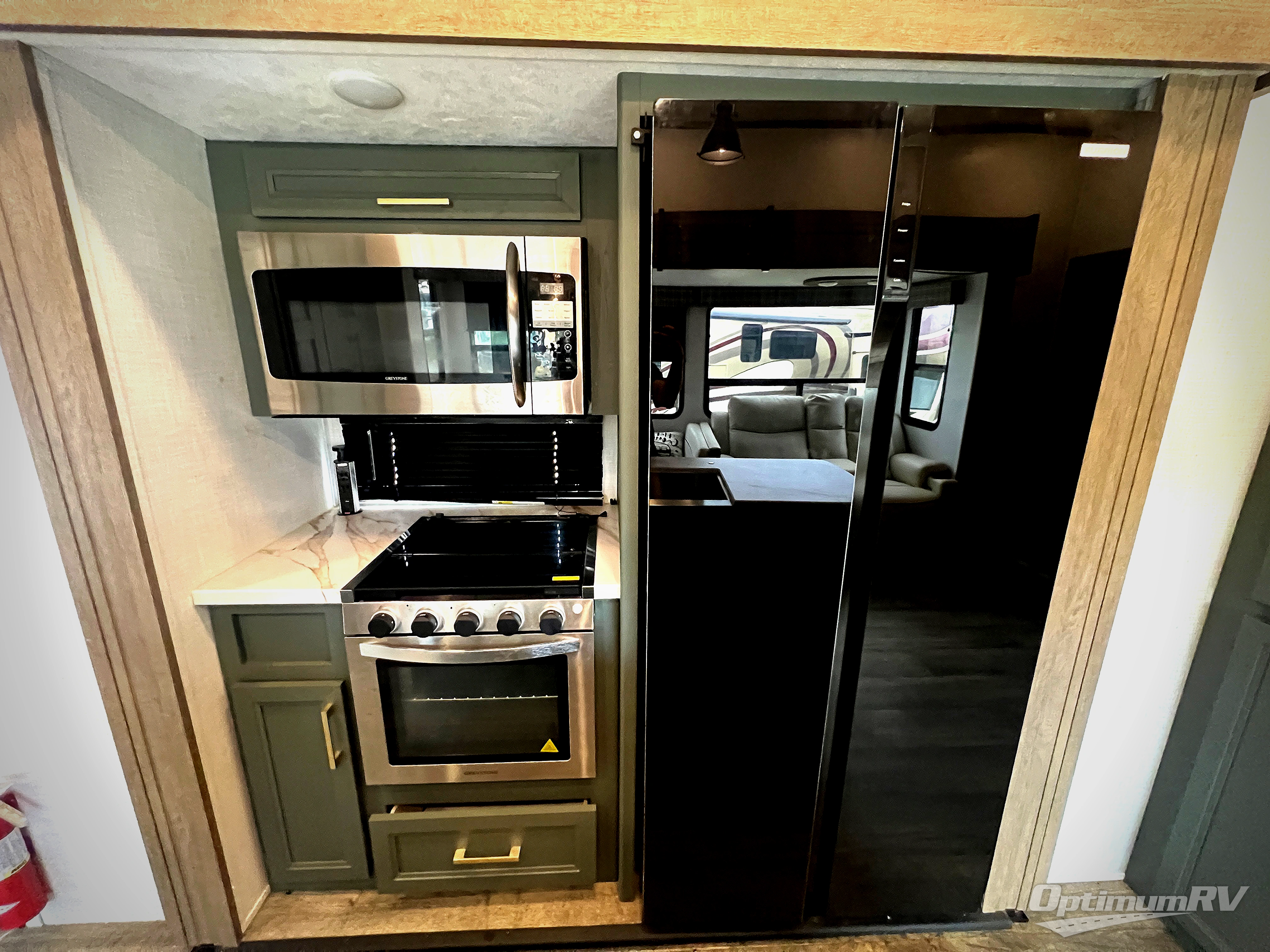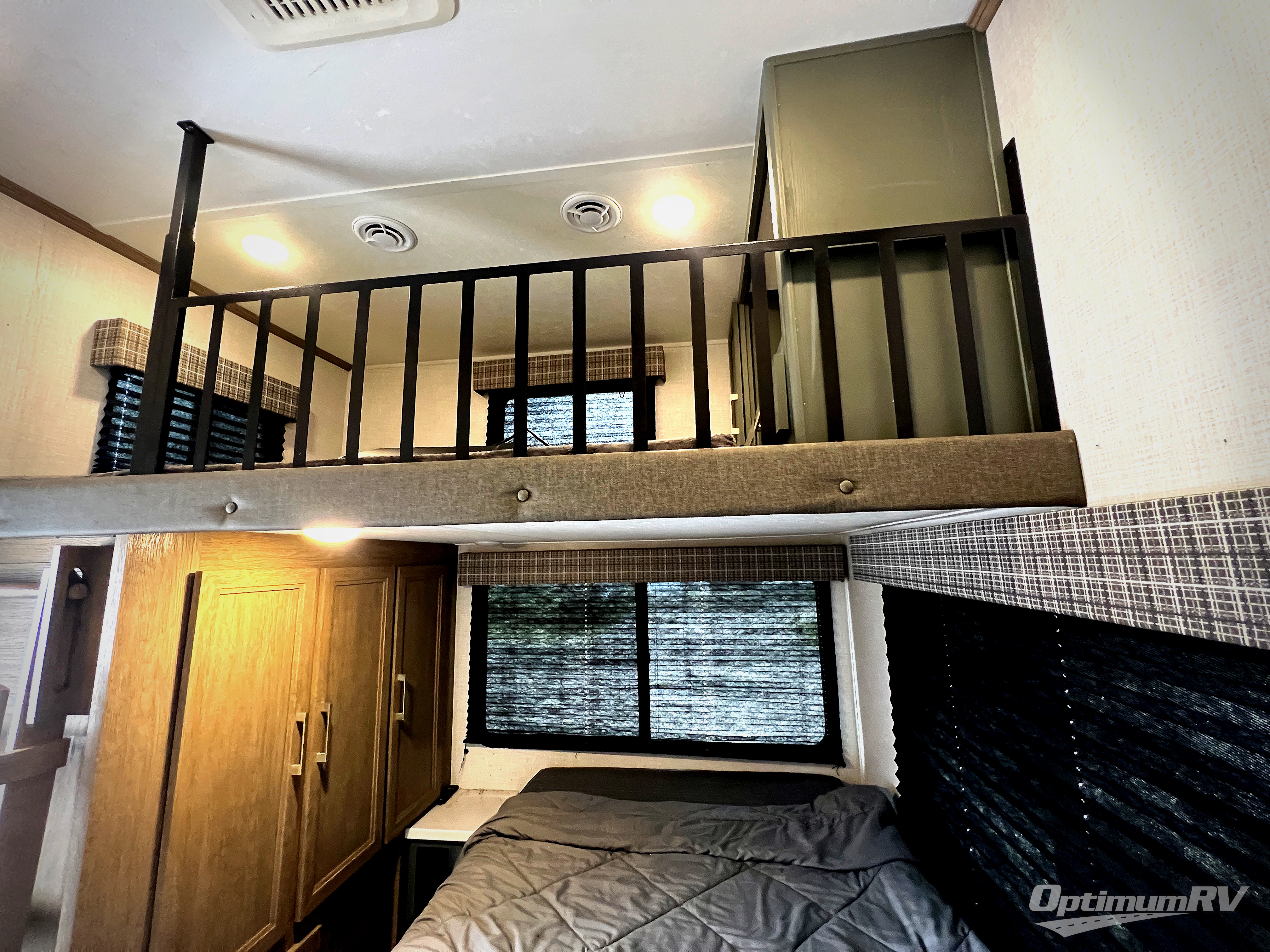 If you like to camp with a larger group, this fifth wheel is for you! There are two bedrooms; one up front with a king bed slide out, and one in the back with a bed plus a loft above to sleep more. There is even a half bath in the back bathroom for guests, and the full bath up front includes dual bath sinks for added convenience. Everyone can meet in the combined living area and kitchen since there is a booth dinette and theater seating in great view of the fireplace and HD LED TV, and the kitchen island will bring this whole room together. A large pantry is also found here and a spacious 16 cu. ft. refrigerator to hold food for the whole week. Head outside to find the outdoor kitchen, two patio awnings, plus dual entry doors for a smooth flow of traffic!