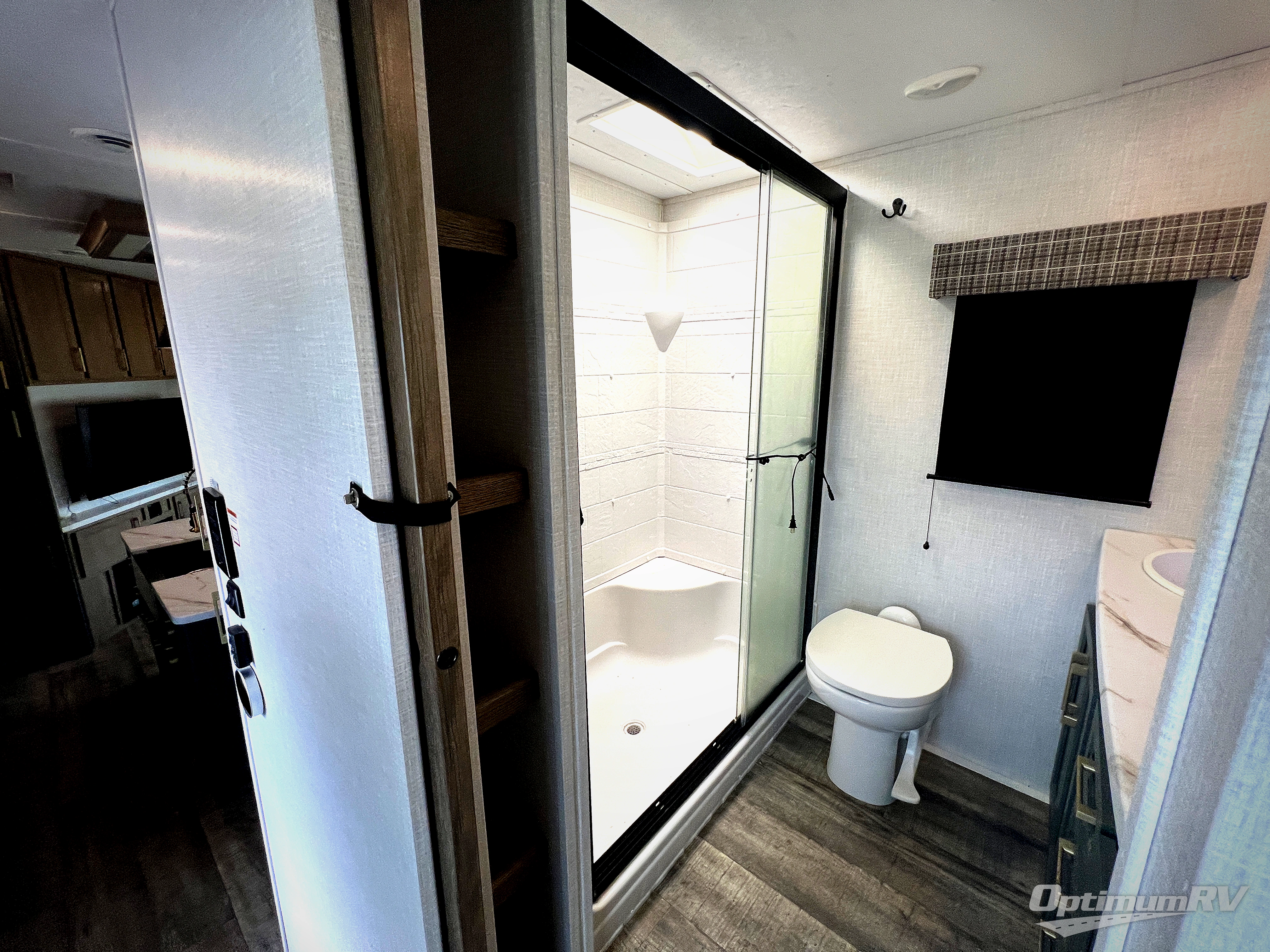Each Eddie Bauer fifth wheel and travel trailer by Dutchmen RV lets you adventure the great outdoors in style! The Journey Package includes a heated and enclosed underbelly to help extend your camping season, a back up camera for easier parking, and a tankless water heater which will come in handy if you're camping with a larger group of friends. The HyperDeck floor construction is ultra durable and the premium entry steps means you can safety come and go as you please. Some of the interior comforts you'll enjoy are the one-piece seamless countertops, cozy living room fireplace, convenient under bed storage, and the large farm style sink for easy clean up. Each Eddie Bauer also includes the Spirit I Package with inverter prep, roof panel prep, and side panel prep that provide off-grid capabilities!