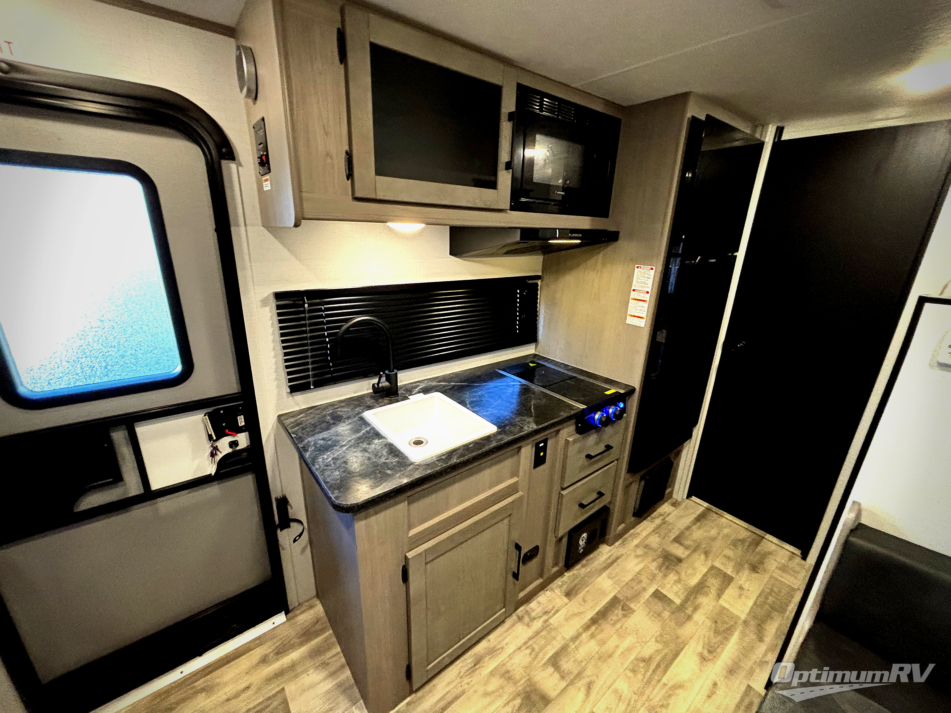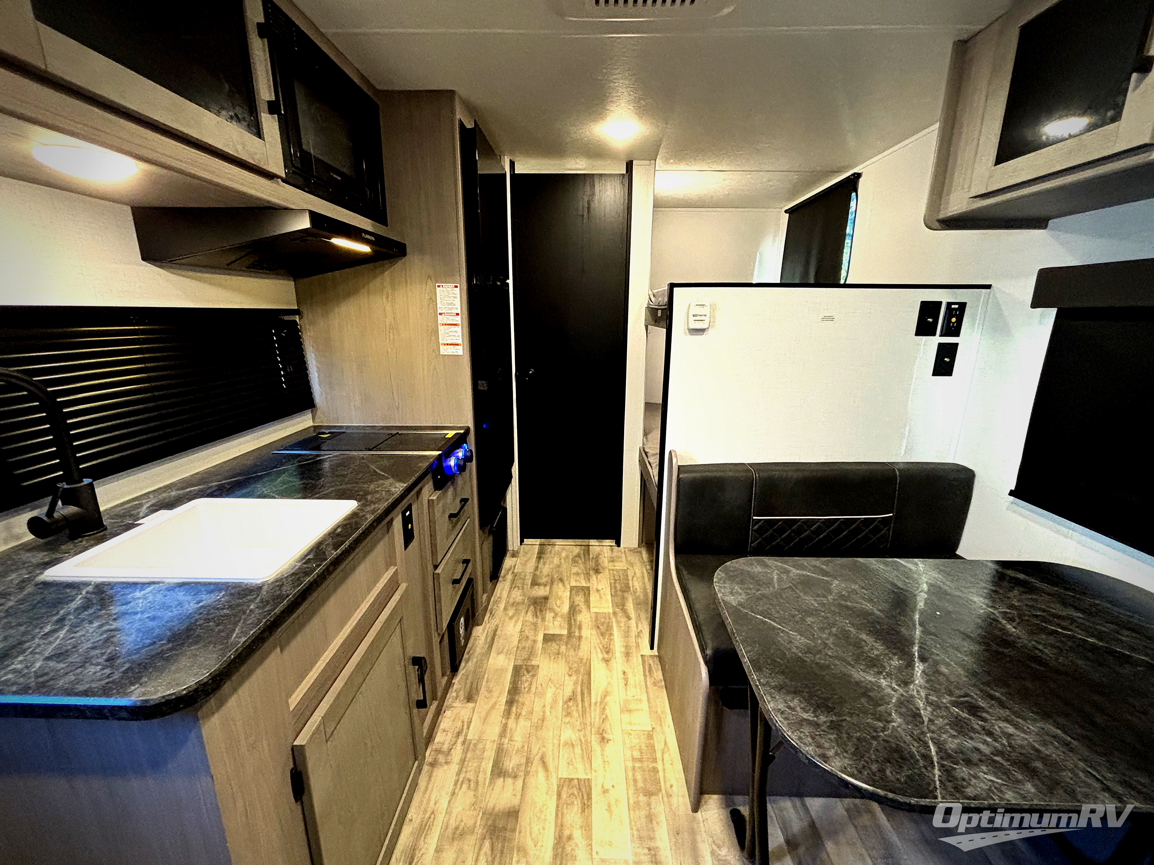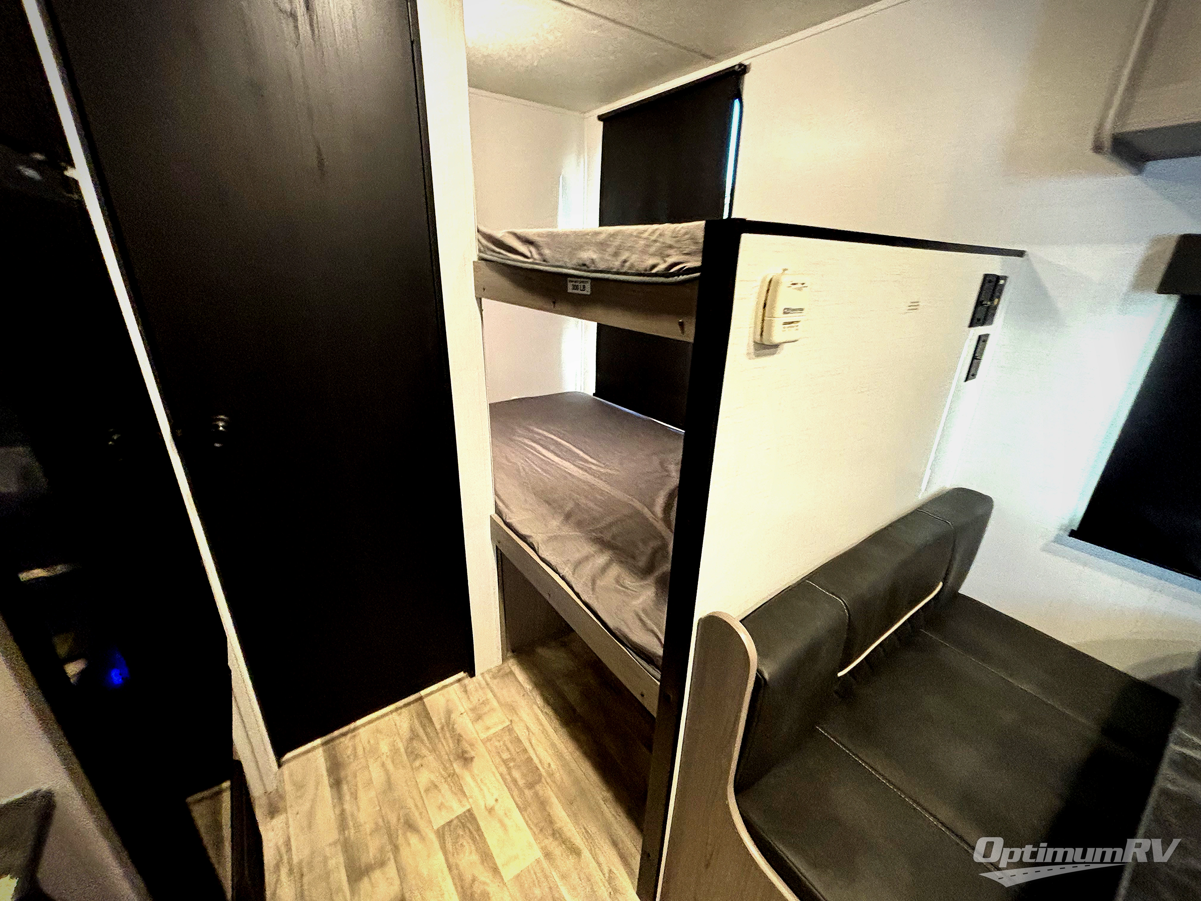 A perfect trailer for your family of three to five featuring a set of bunk beds for the kids, a queen bed up front for you, and the booth dinette that can be converted to sleep one or two more depending on size. This unit is cozy and convenient providing you just what you need to enjoy a little adventure away from home. For meals, there is a two burner cooktop and sink, plus a 10 cu. ft. 12V refrigerator for your perishables. Overhead cabinetry can be found along both sides for your dishes and things. You will all appreciate the convenience of having your own private shower and toilet so that you don't need to use the campground facilities at night. If you enjoy spending time outside, a 13' awning is available to provide even more living space outdoors!