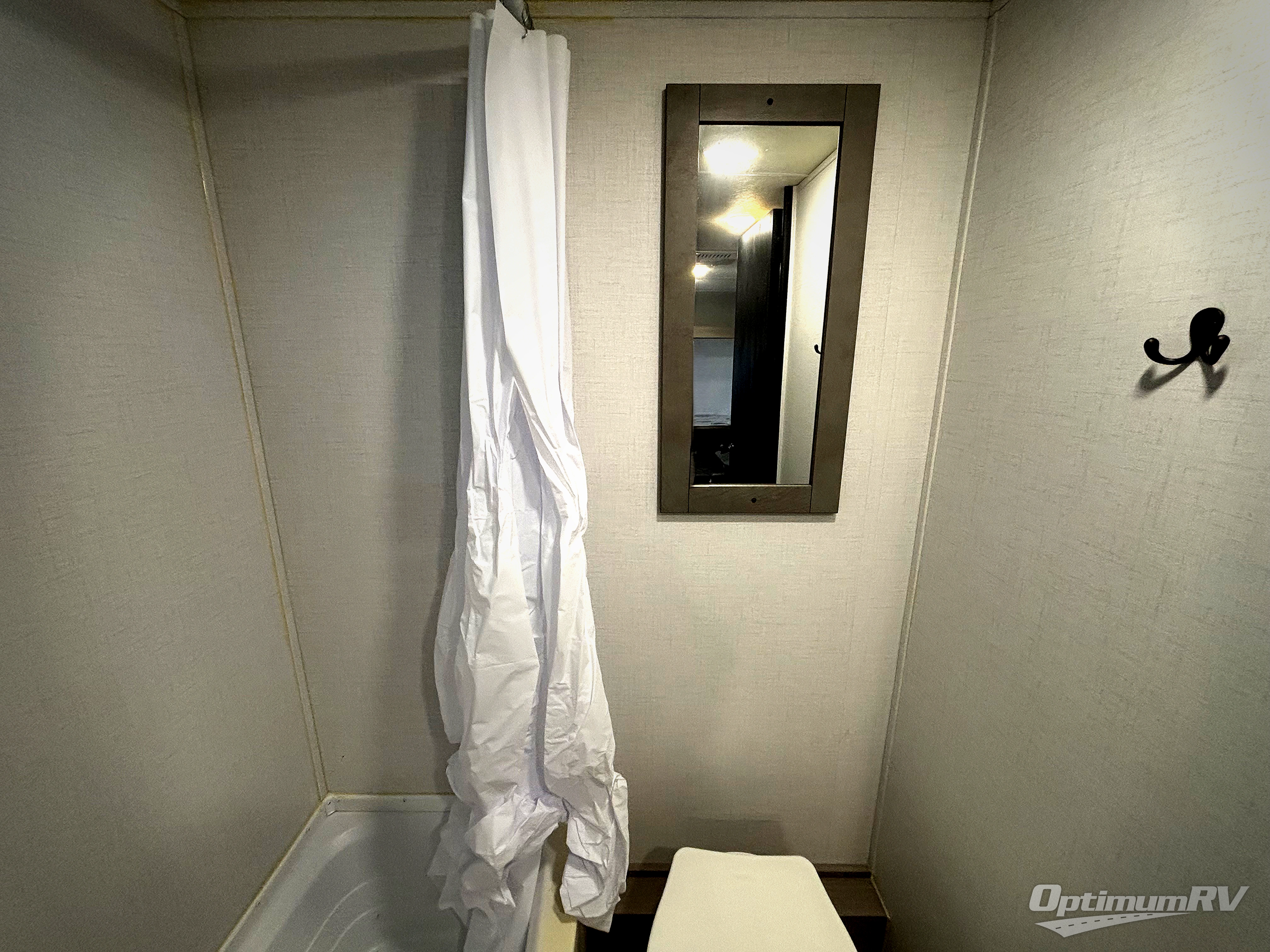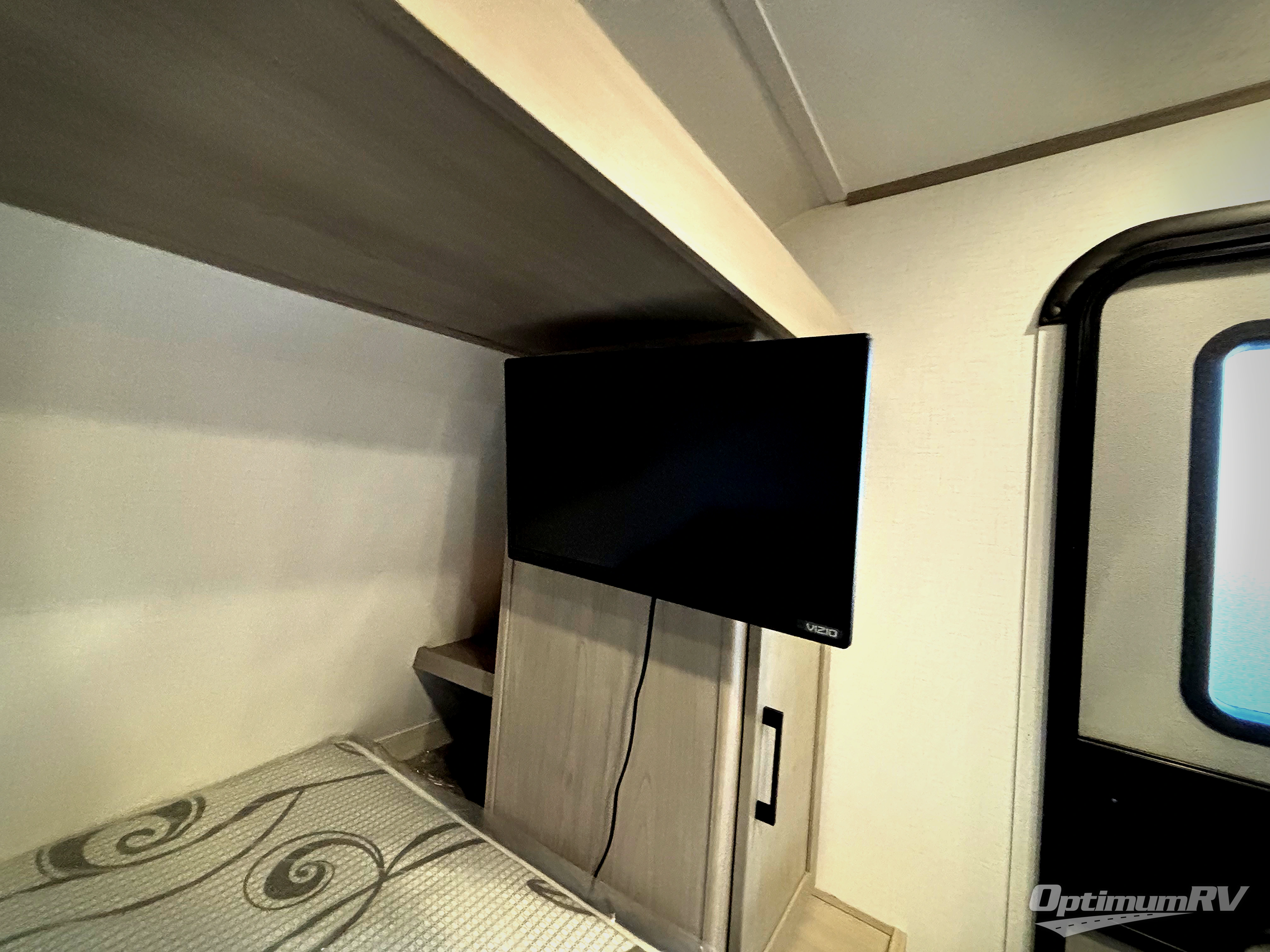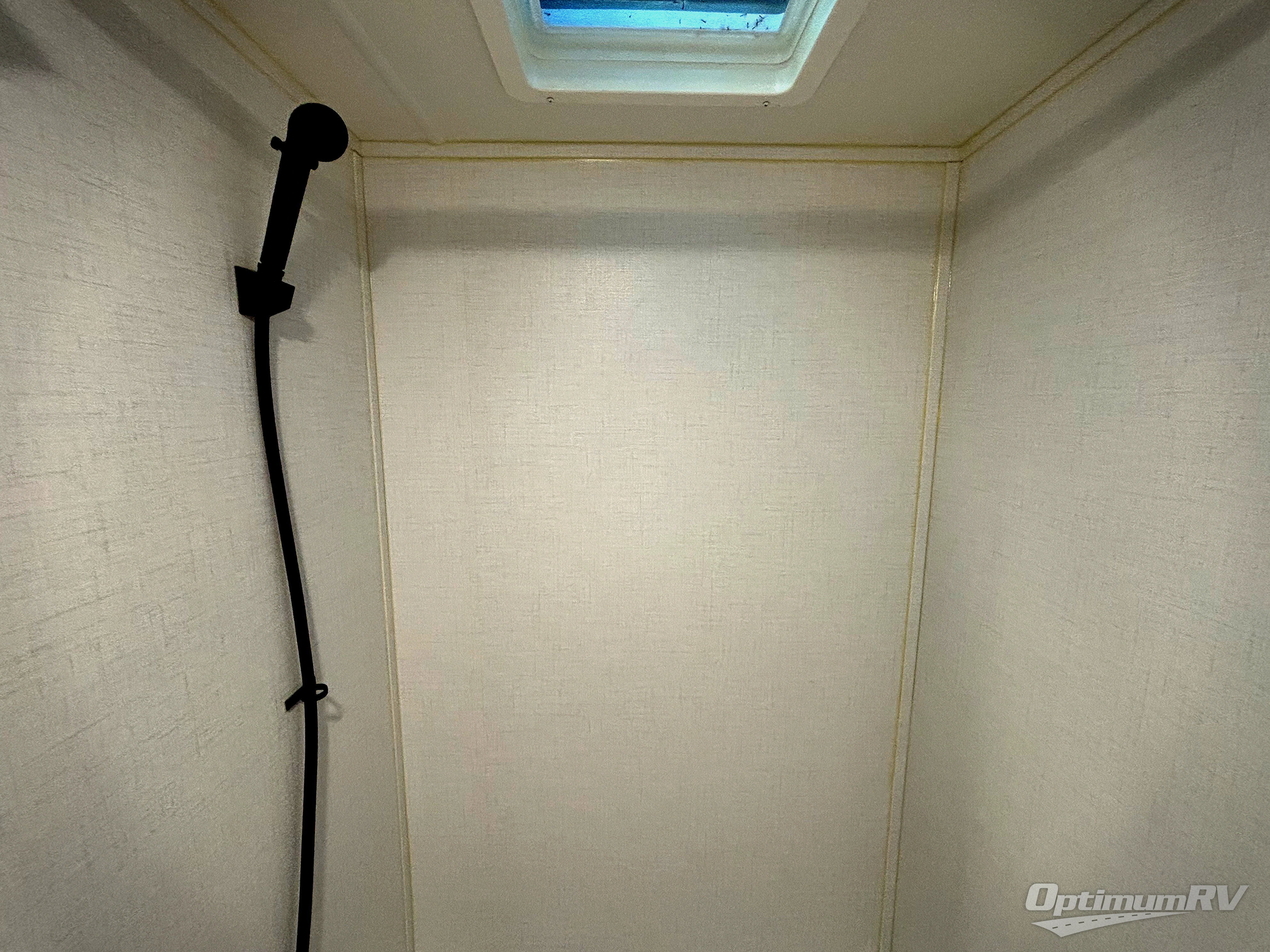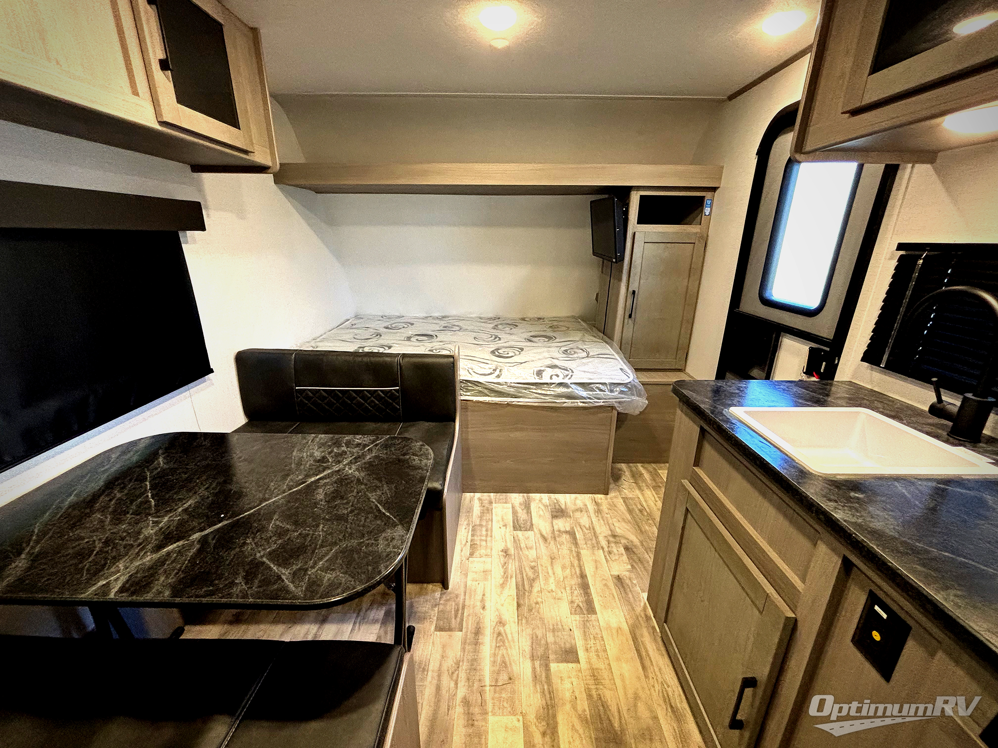 A perfect trailer for your family of three to five featuring a set of bunk beds for the kids, a queen bed up front for you, and the booth dinette that can be converted to sleep one or two more depending on size. This unit is cozy and convenient providing you just what you need to enjoy a little adventure away from home. For meals, there is a two burner cooktop and sink, plus a 10 cu. ft. 12V refrigerator for your perishables. Overhead cabinetry can be found along both sides for your dishes and things. You will all appreciate the convenience of having your own private shower and toilet so that you don't need to use the campground facilities at night. If you enjoy spending time outside, a 13' awning is available to provide even more living space outdoors!