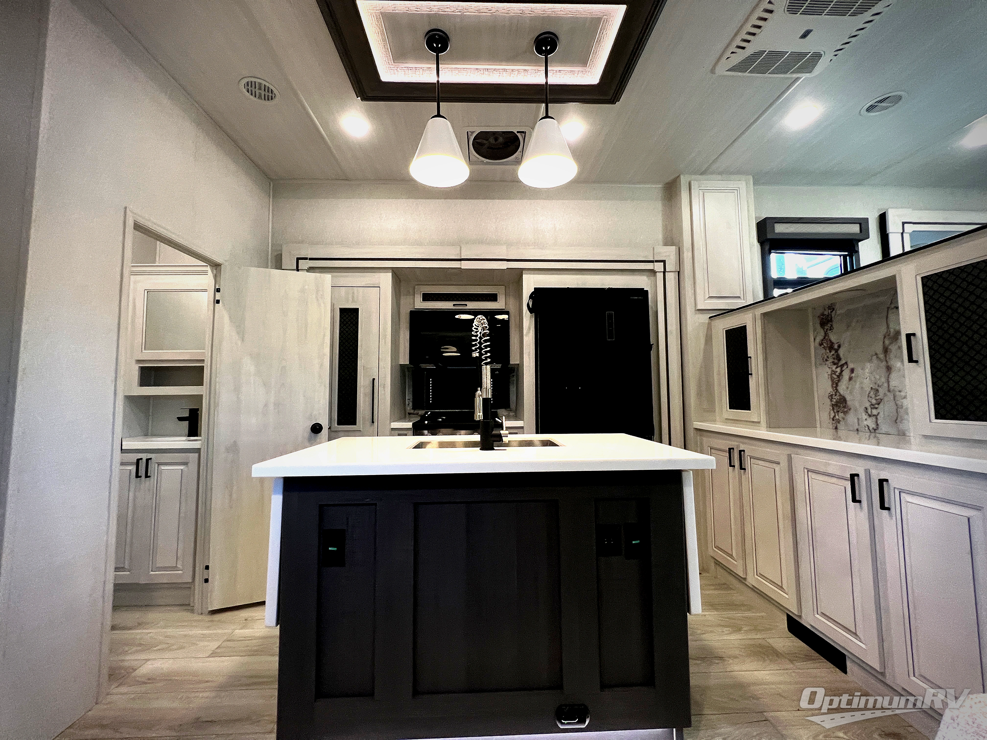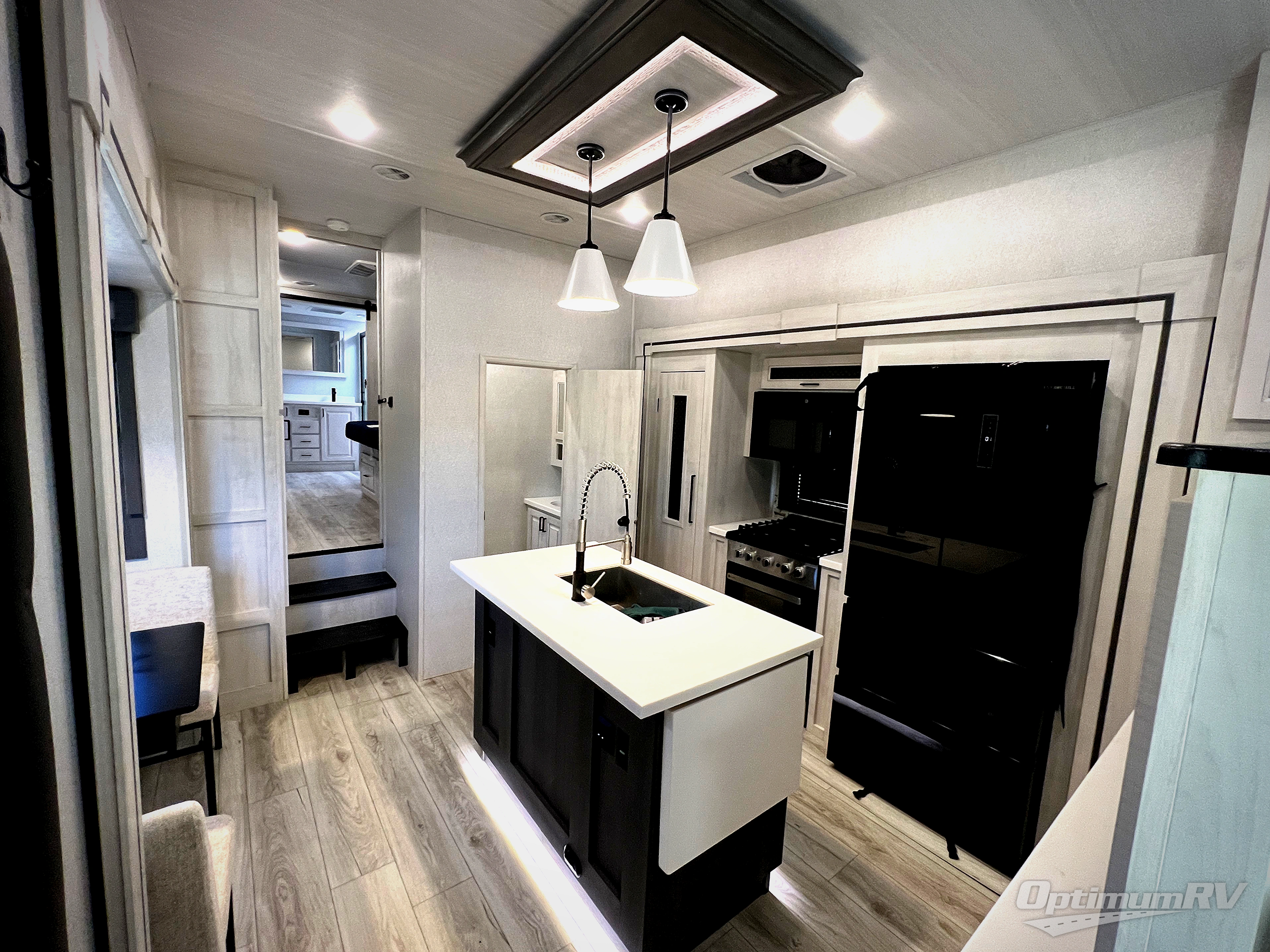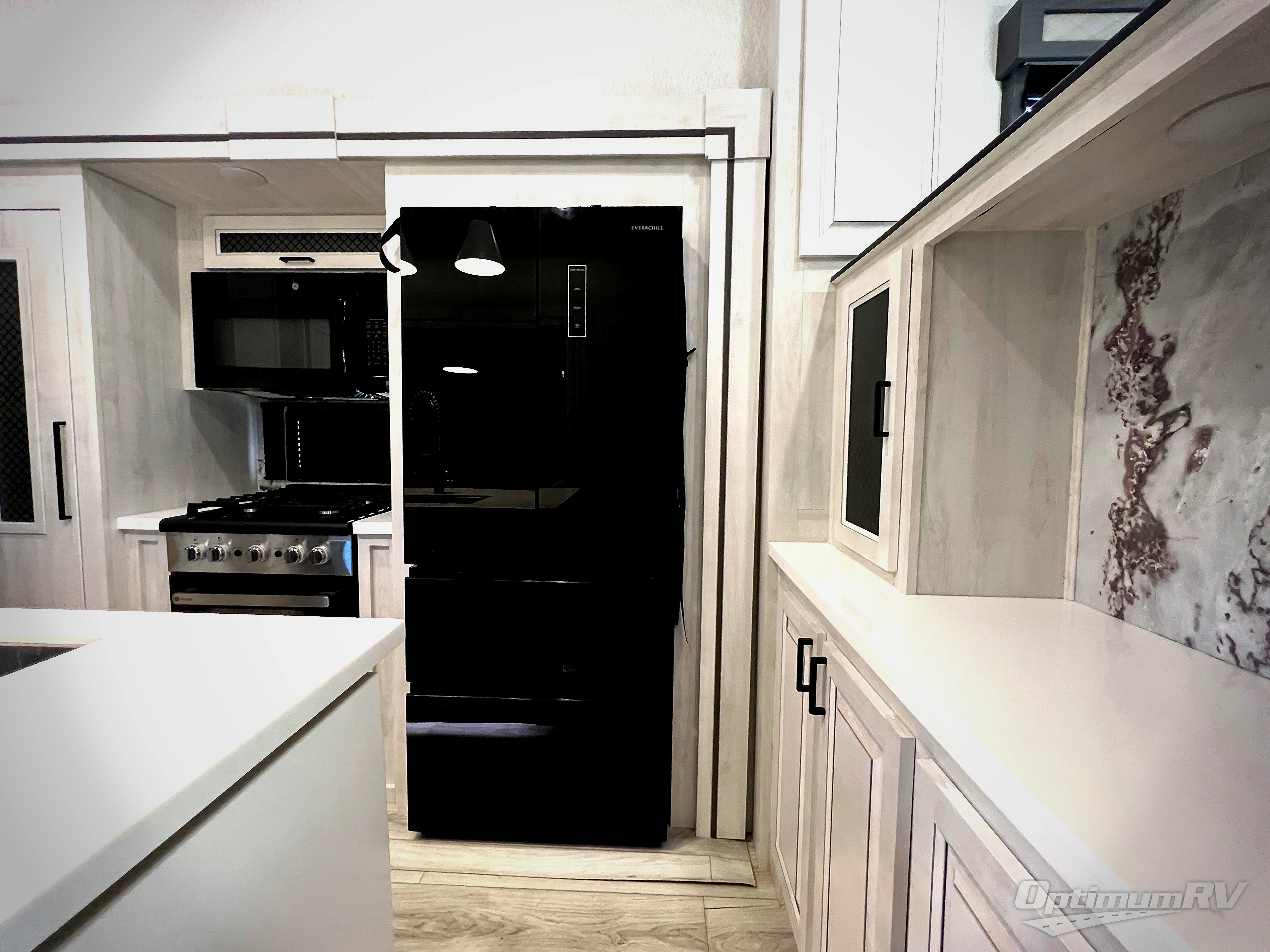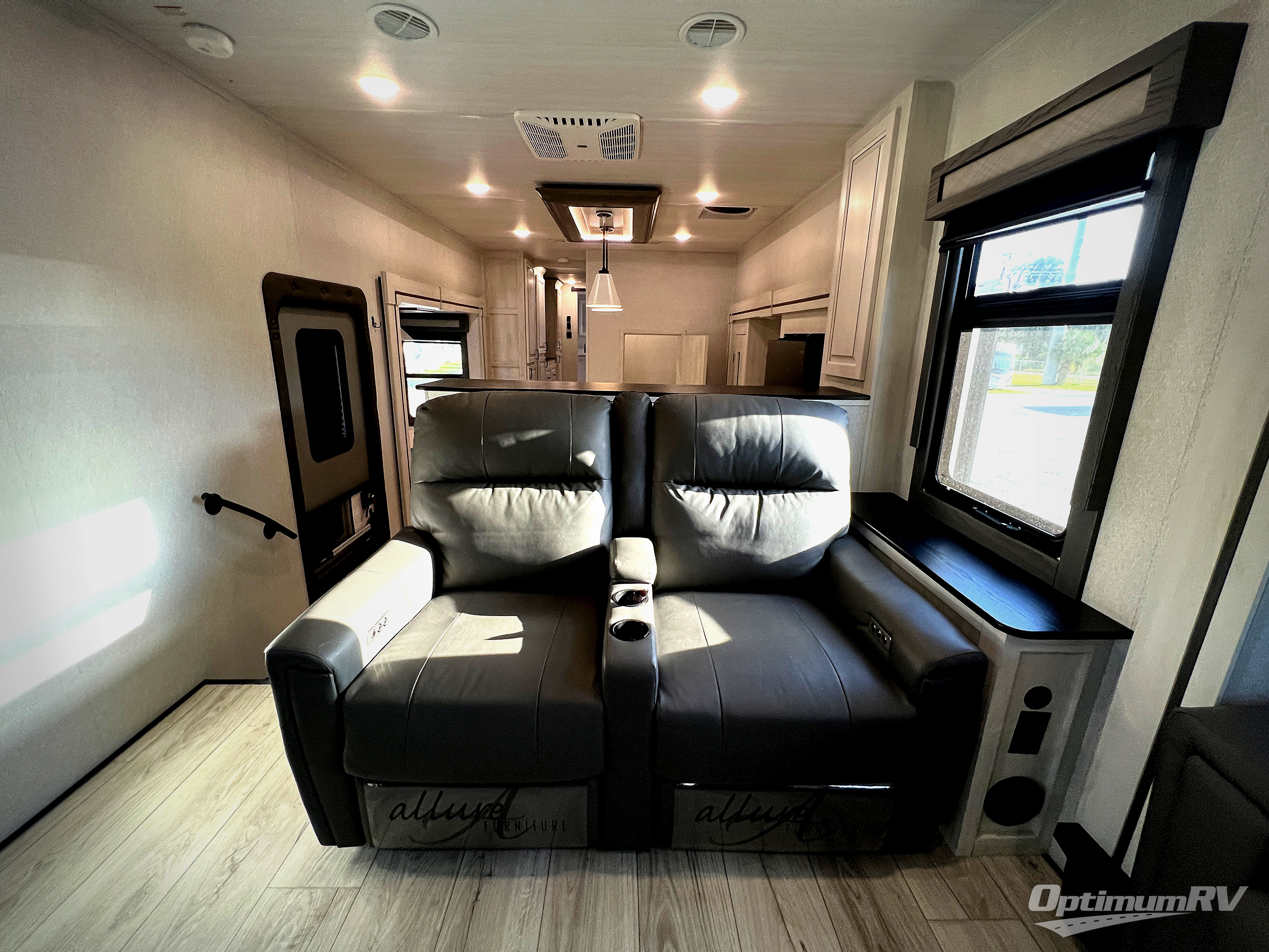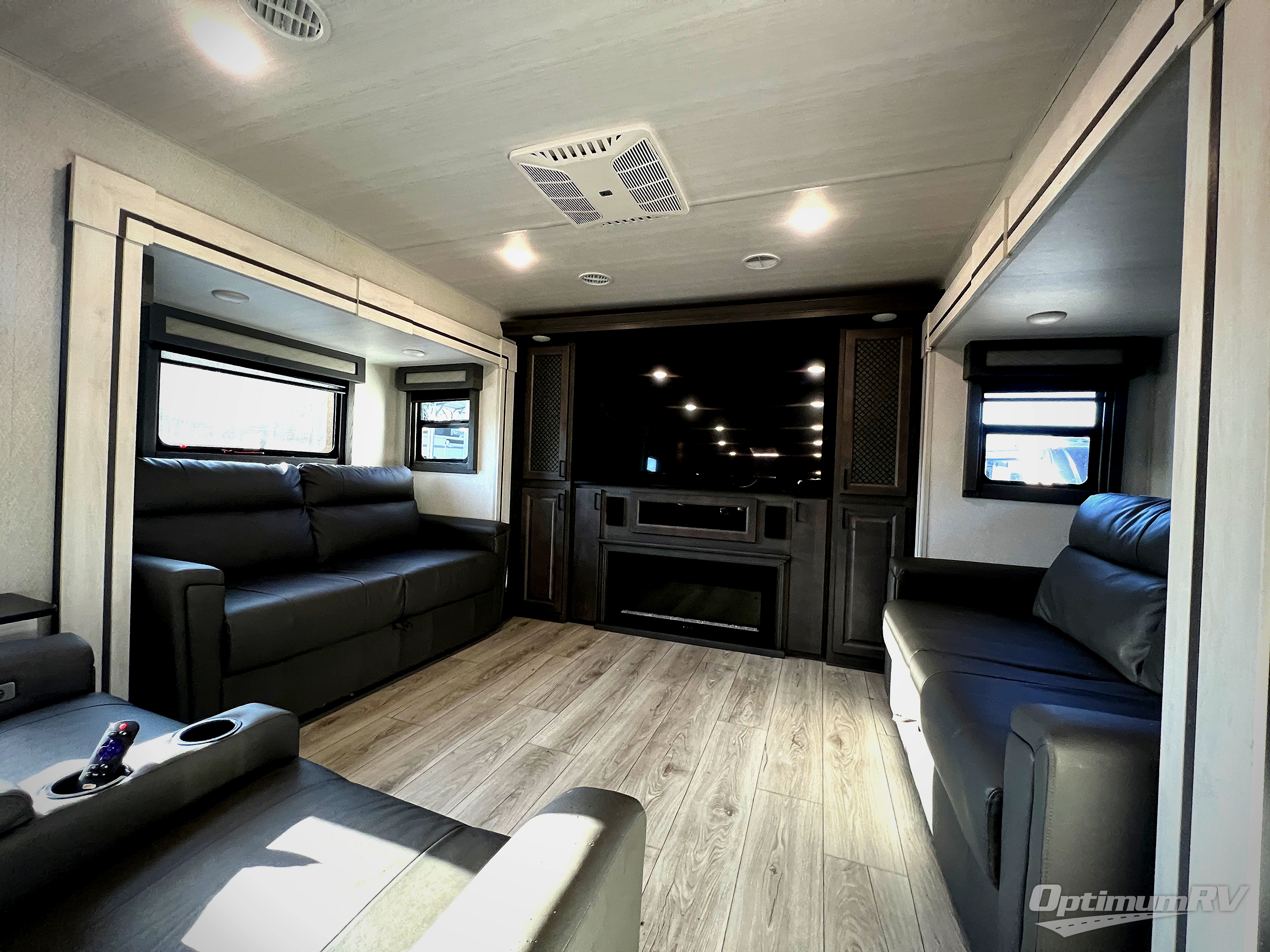 If you've been looking for a luxury fifth wheel to call your new home away from home, take a look at this Ahara! The front living area will be a favorite hangout spot with its dual hide-a-bed sofa, theater seating, and 65" TV with a fireplace. And since there are dual opposing slides here, your guests will have plenty of space to fold down the sofas at night for a great night's rest. If you're looking for your bedroom, head to the back and you'll enjoy a king bed slide out, a dresser with TV prep, two closets, plus your own full rear bath. The dual bath sinks are sure to come in handy when you're both getting ready for bed, and the spacious shower with a skylight will provide natural light as you clean up in the morning. There is even a closet with washer and dryer prep if you plan to go full-time. In the morning you can prepare breakfast on the four burner cooktop or in the 30" over-the-range residential microwave, and the 16 cu. ft. 12V French door refrigerator includes a double drawer freezer to hold more food. There is a free-standing dinette with a storage ottoman here, a hutch to store nice dishes, and the half bath is located off of this room for convenience!
