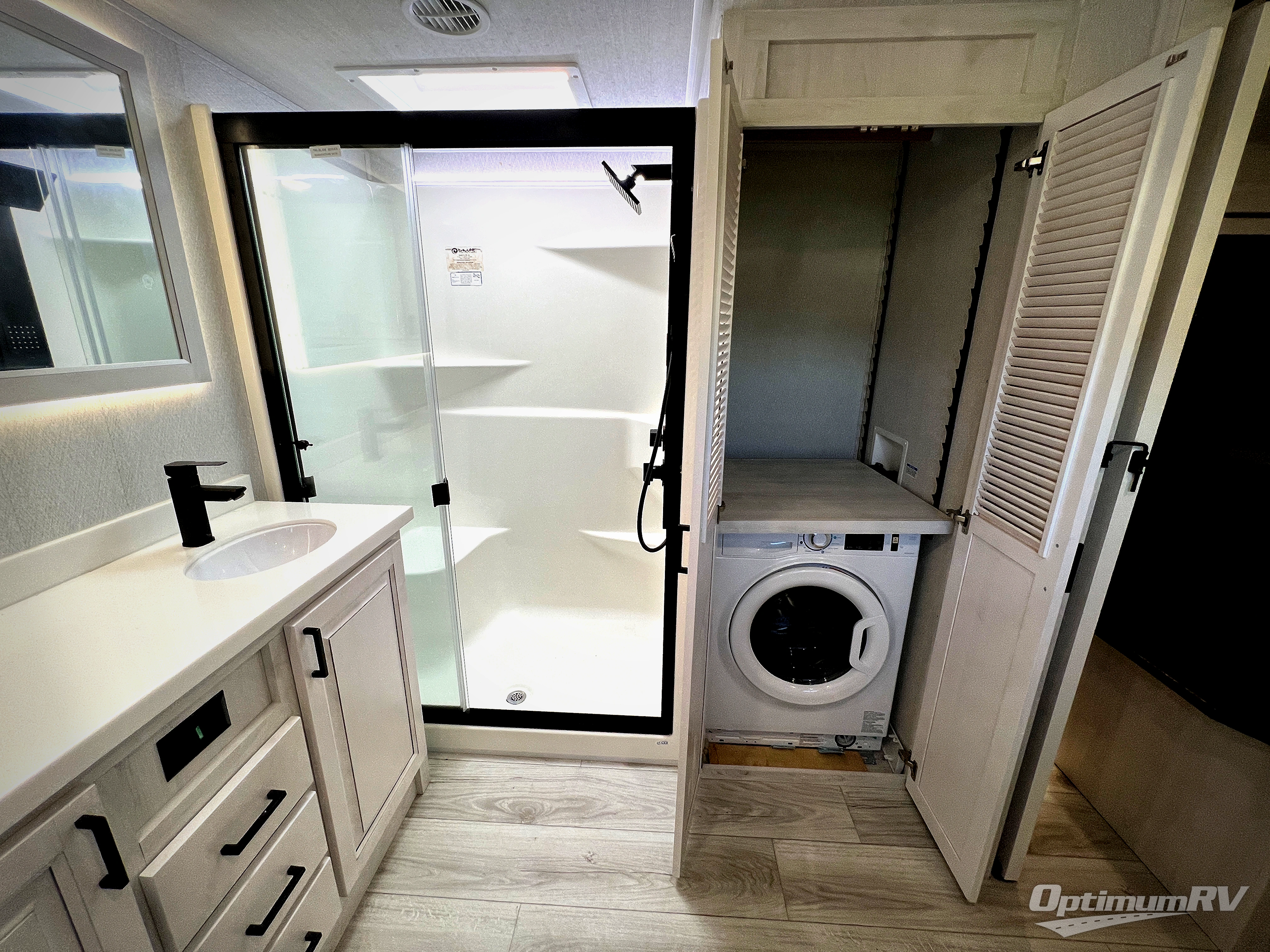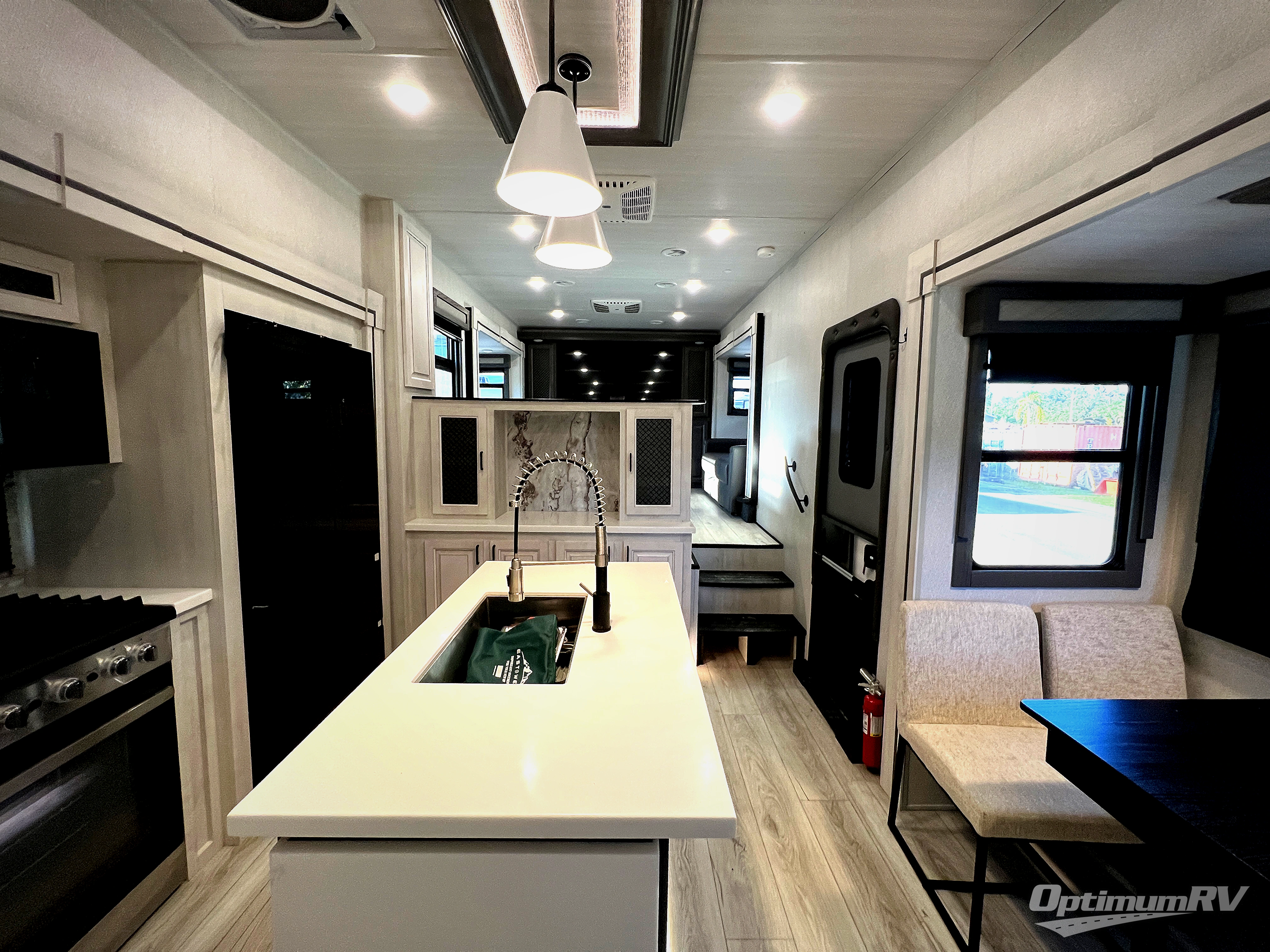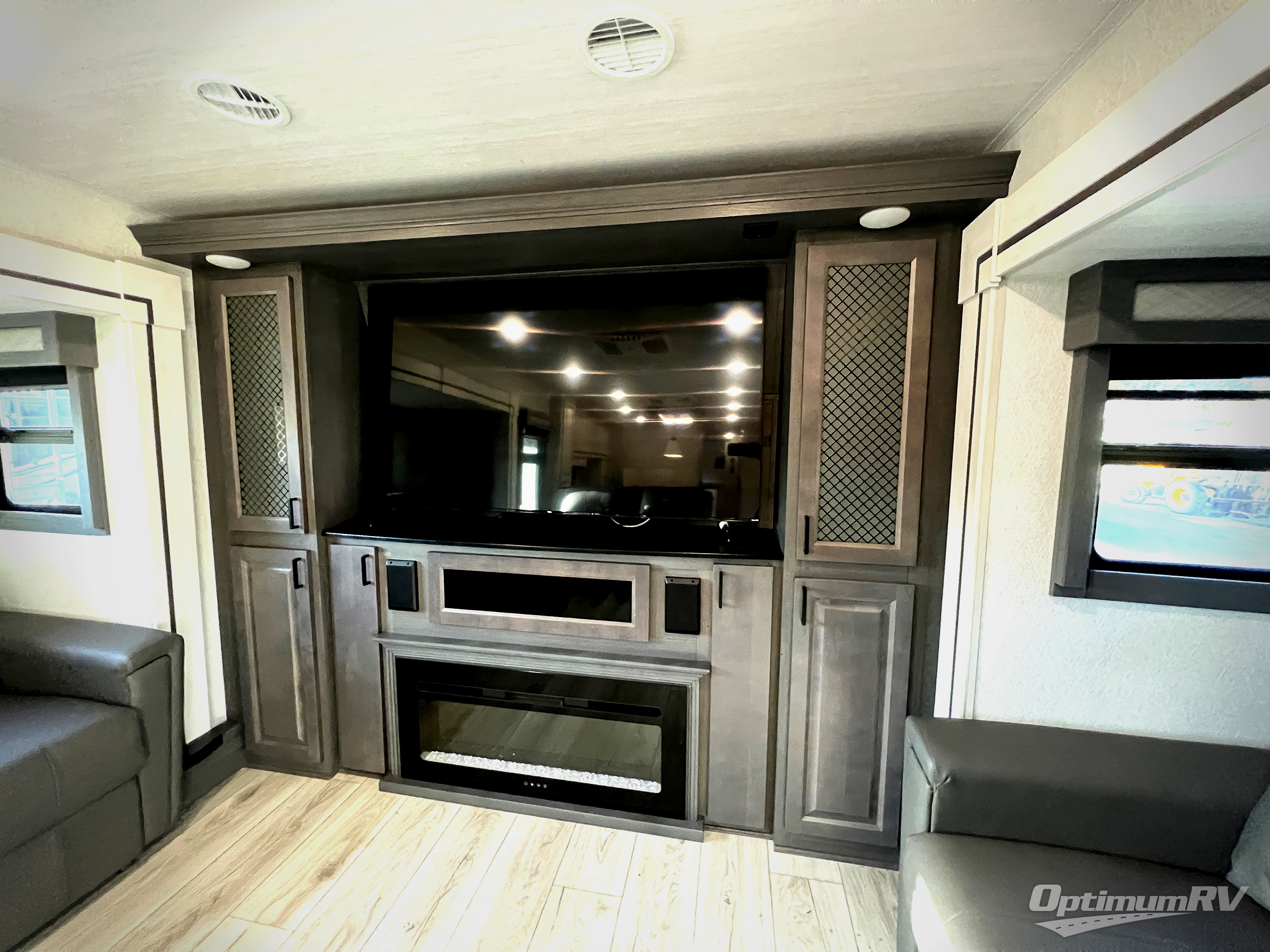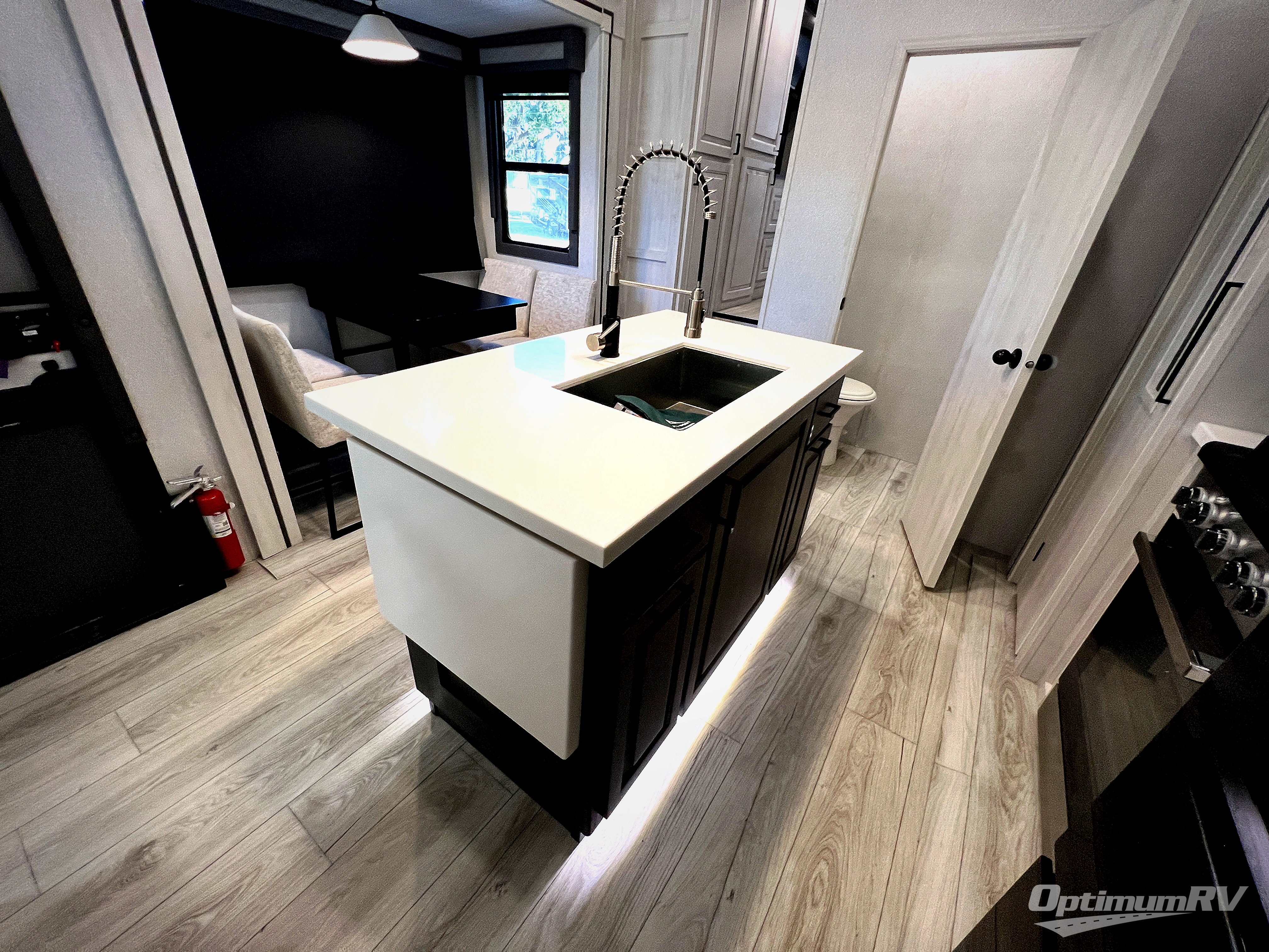 If you've been looking for a luxury fifth wheel to call your new home away from home, take a look at this Ahara! The front living area will be a favorite hangout spot with its dual hide-a-bed sofa, theater seating, and 65" TV with a fireplace. And since there are dual opposing slides here, your guests will have plenty of space to fold down the sofas at night for a great night's rest. If you're looking for your bedroom, head to the back and you'll enjoy a king bed slide out, a dresser with TV prep, two closets, plus your own full rear bath. The dual bath sinks are sure to come in handy when you're both getting ready for bed, and the spacious shower with a skylight will provide natural light as you clean up in the morning. There is even a closet with washer and dryer prep if you plan to go full-time. In the morning you can prepare breakfast on the four burner cooktop or in the 30" over-the-range residential microwave, and the 16 cu. ft. 12V French door refrigerator includes a double drawer freezer to hold more food. There is a free-standing dinette with a storage ottoman here, a hutch to store nice dishes, and the half bath is located off of this room for convenience!