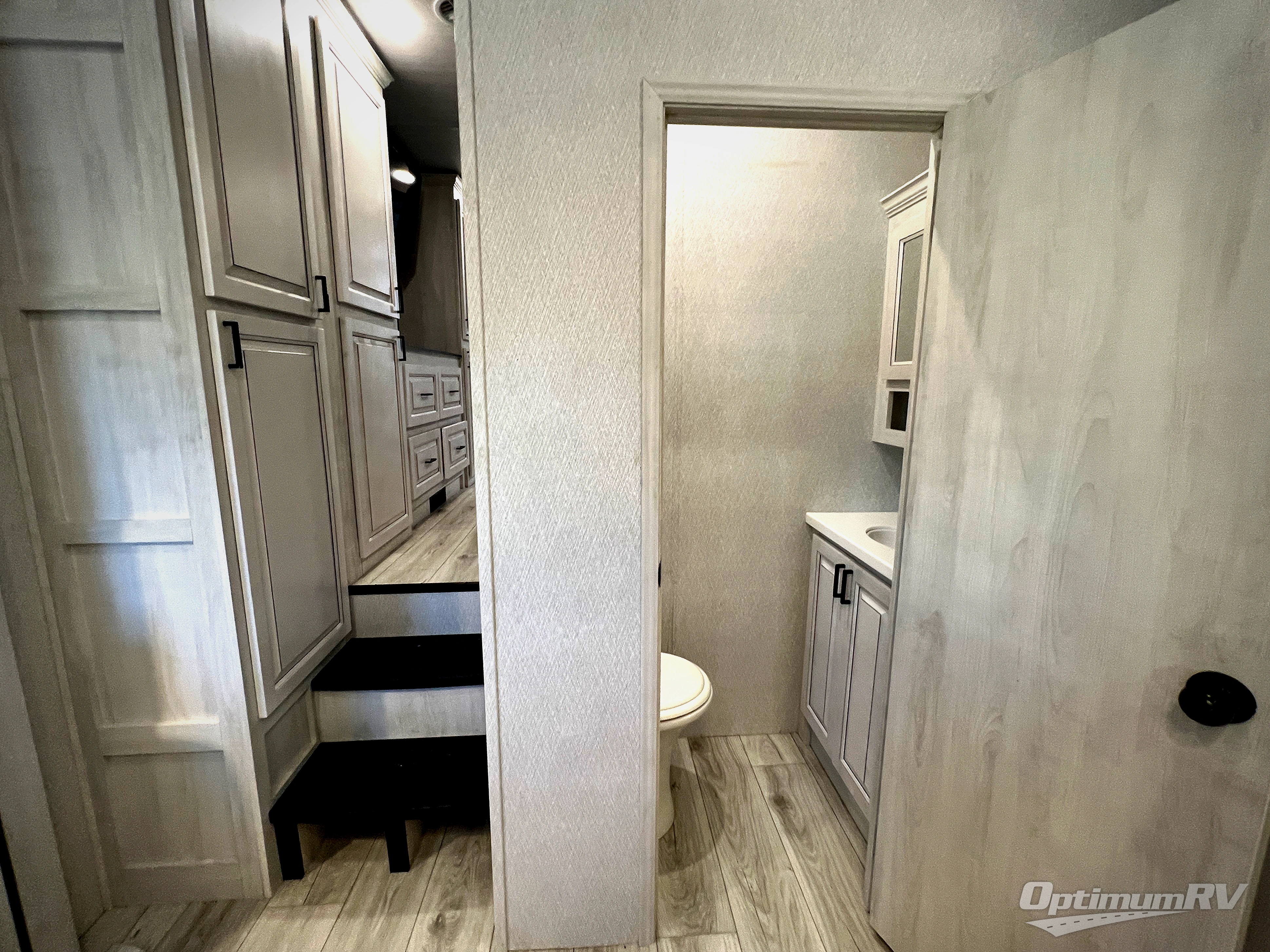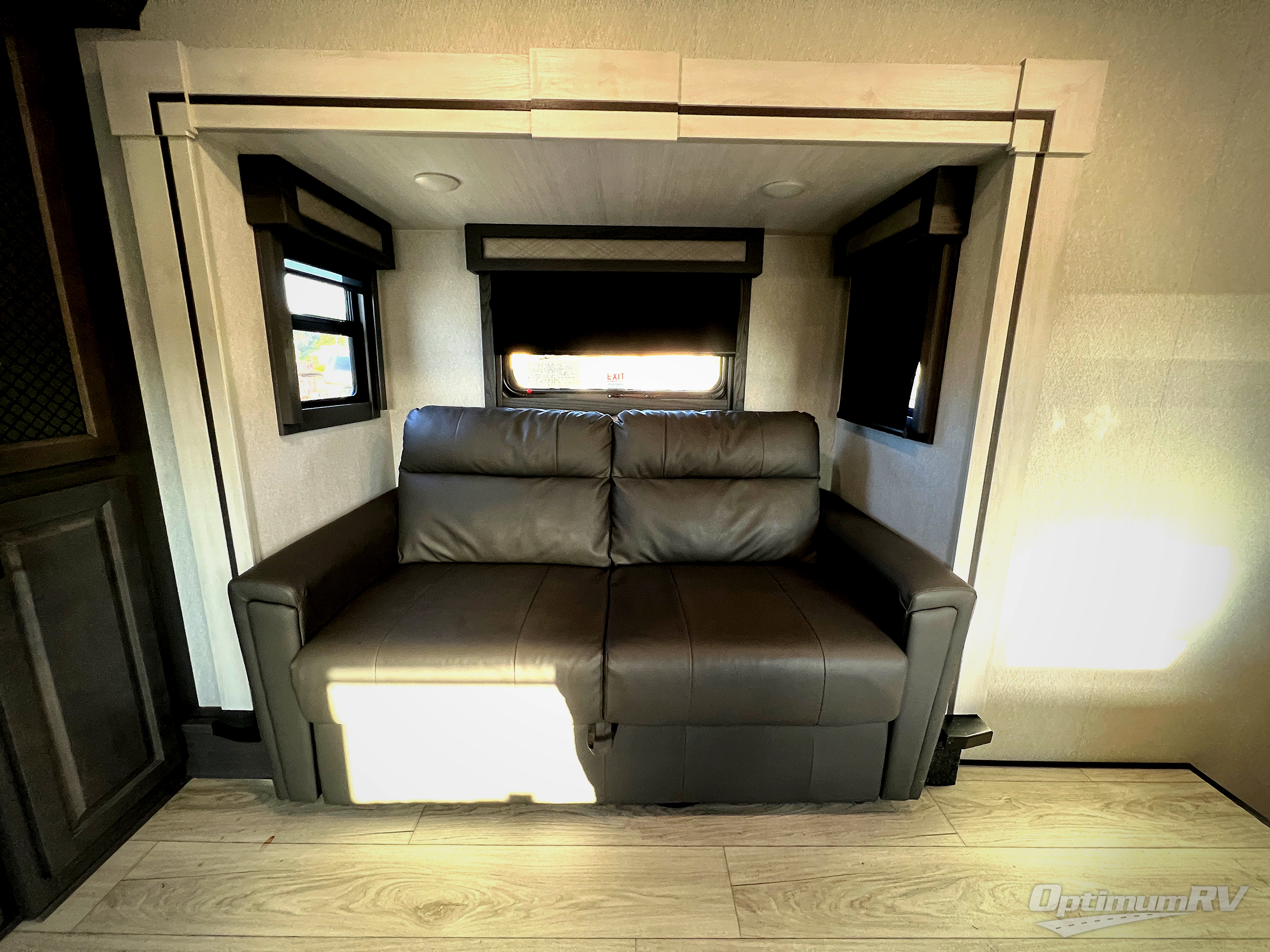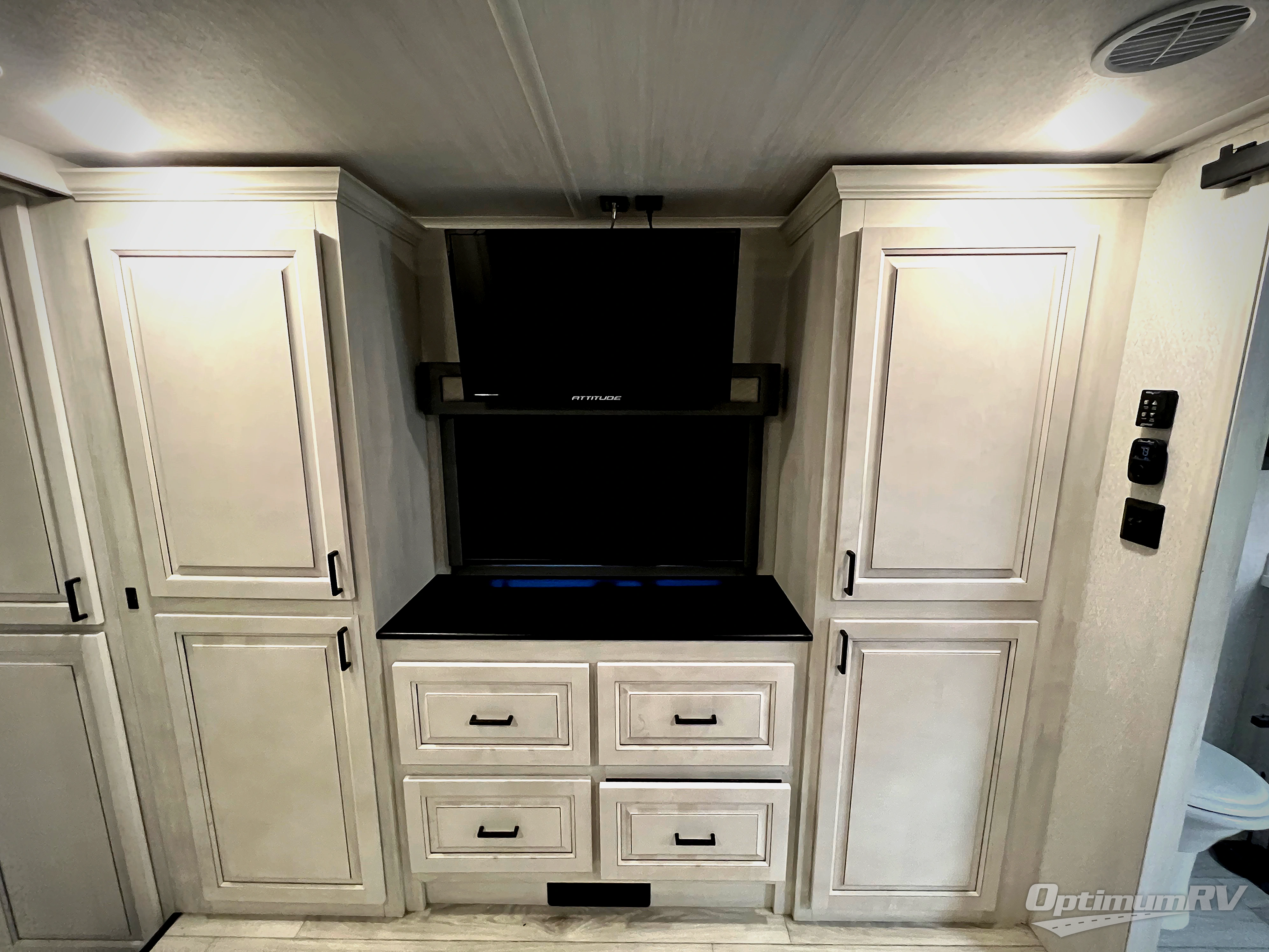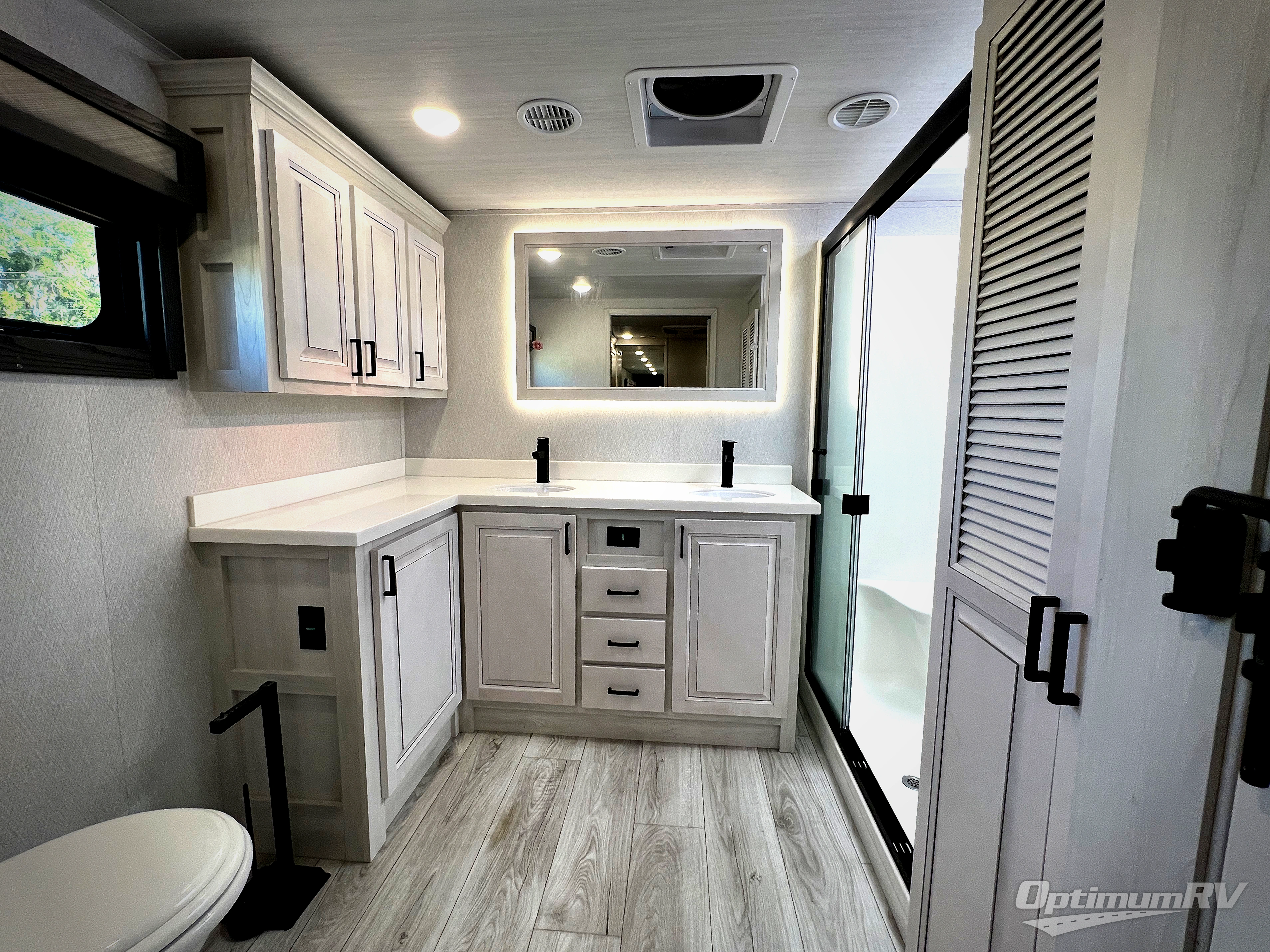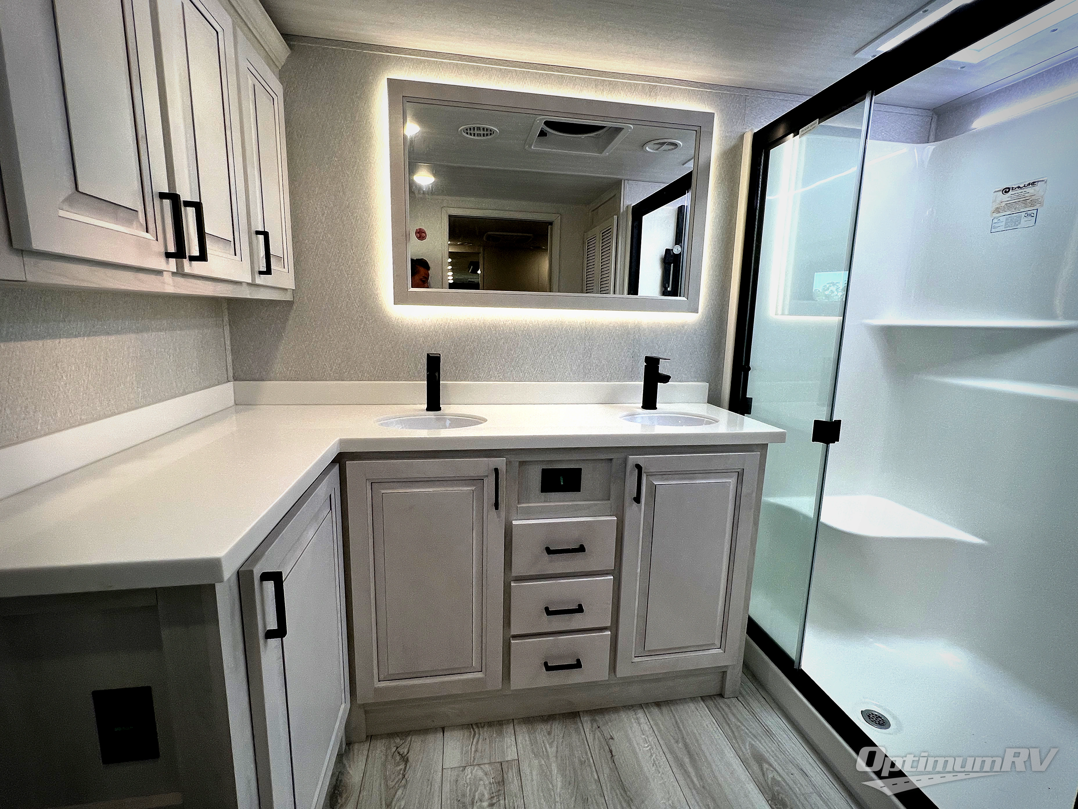 If you've been looking for a luxury fifth wheel to call your new home away from home, take a look at this Ahara! The front living area will be a favorite hangout spot with its dual hide-a-bed sofa, theater seating, and 65" TV with a fireplace. And since there are dual opposing slides here, your guests will have plenty of space to fold down the sofas at night for a great night's rest. If you're looking for your bedroom, head to the back and you'll enjoy a king bed slide out, a dresser with TV prep, two closets, plus your own full rear bath. The dual bath sinks are sure to come in handy when you're both getting ready for bed, and the spacious shower with a skylight will provide natural light as you clean up in the morning. There is even a closet with washer and dryer prep if you plan to go full-time. In the morning you can prepare breakfast on the four burner cooktop or in the 30" over-the-range residential microwave, and the 16 cu. ft. 12V French door refrigerator includes a double drawer freezer to hold more food. There is a free-standing dinette with a storage ottoman here, a hutch to store nice dishes, and the half bath is located off of this room for convenience!