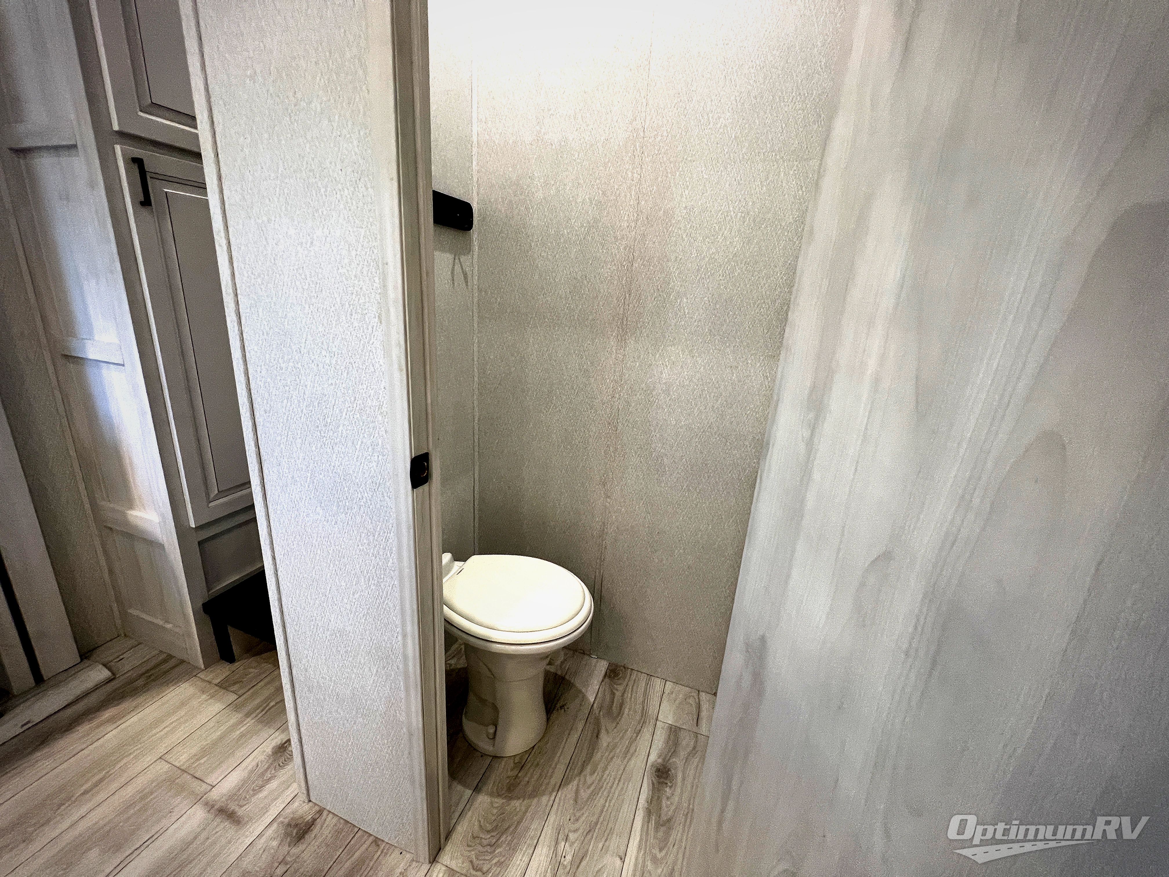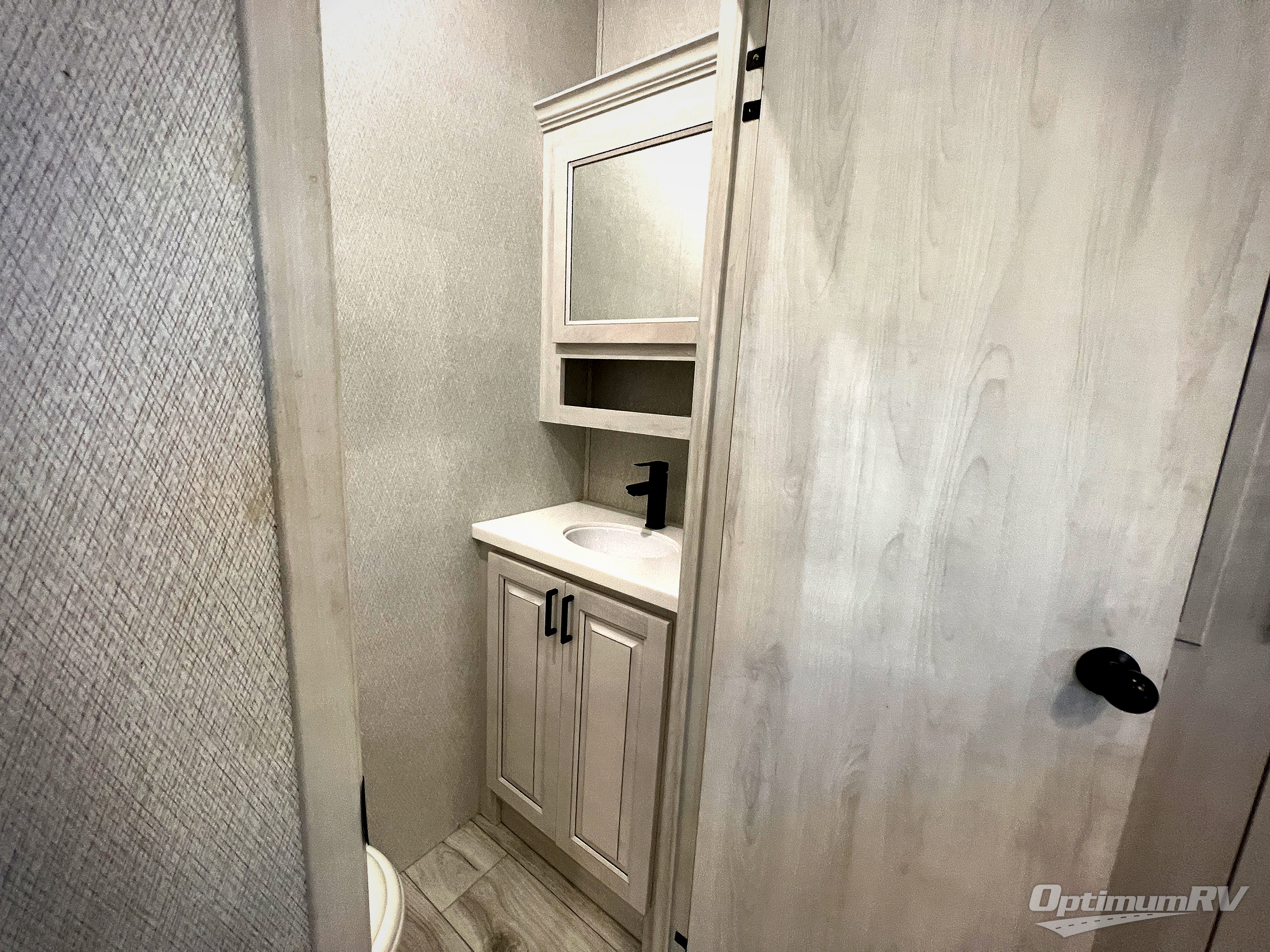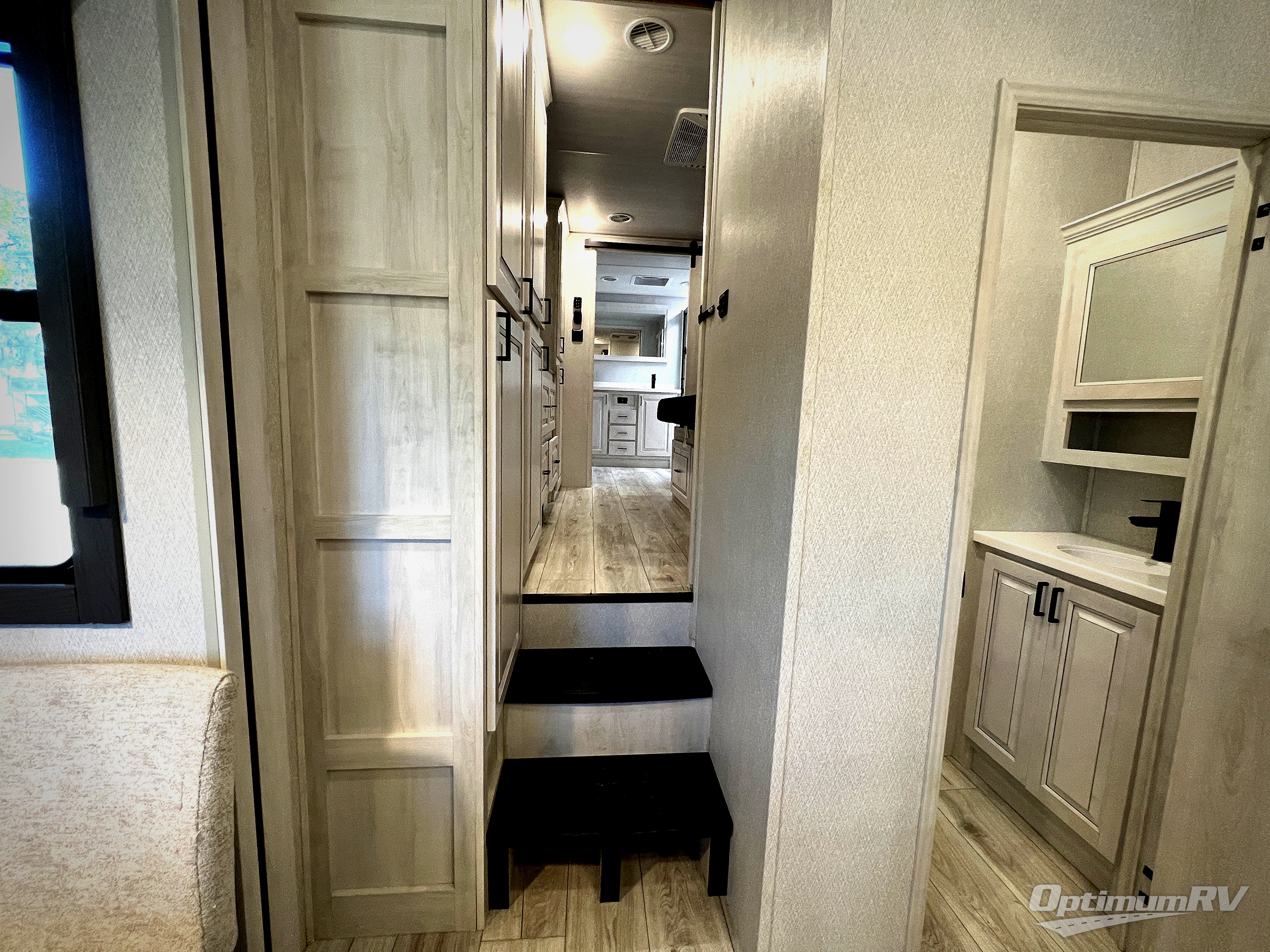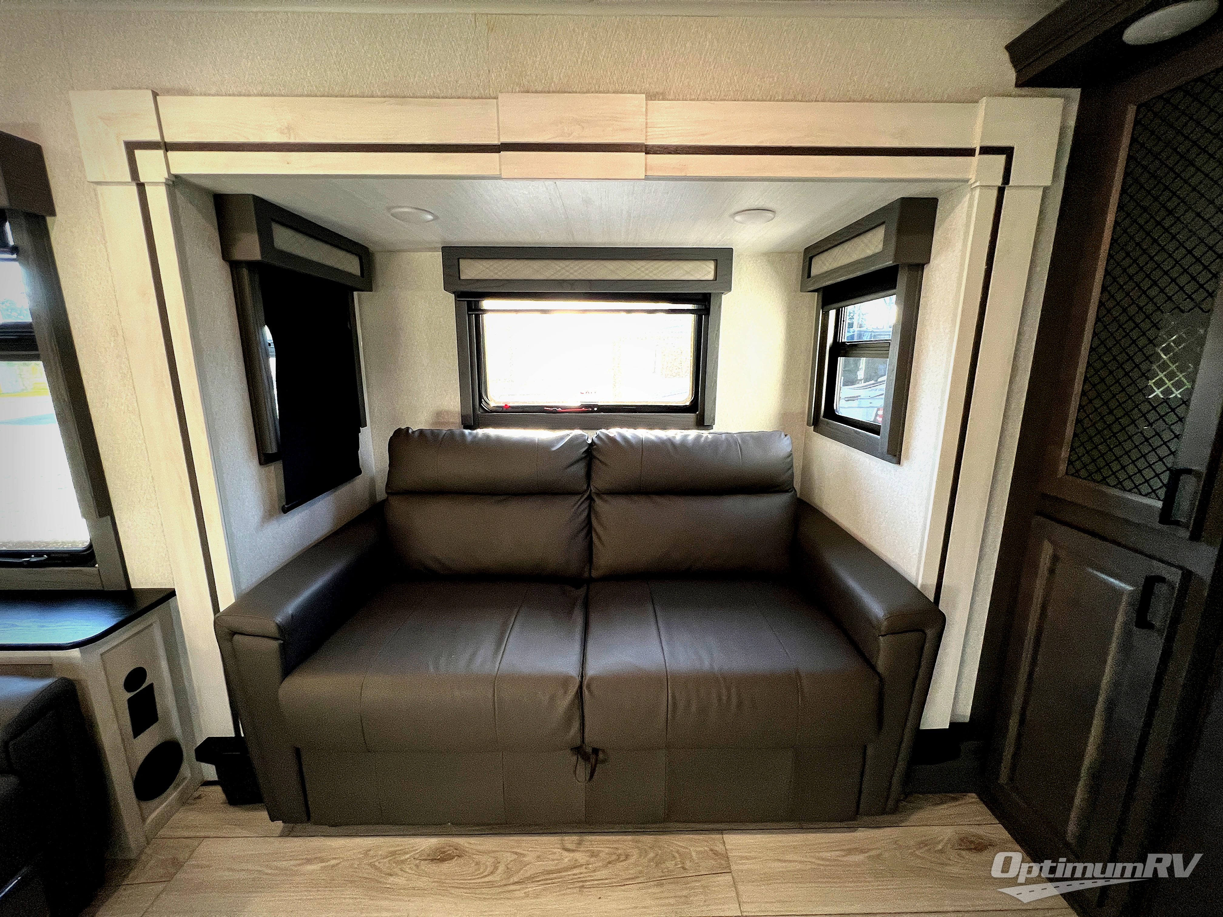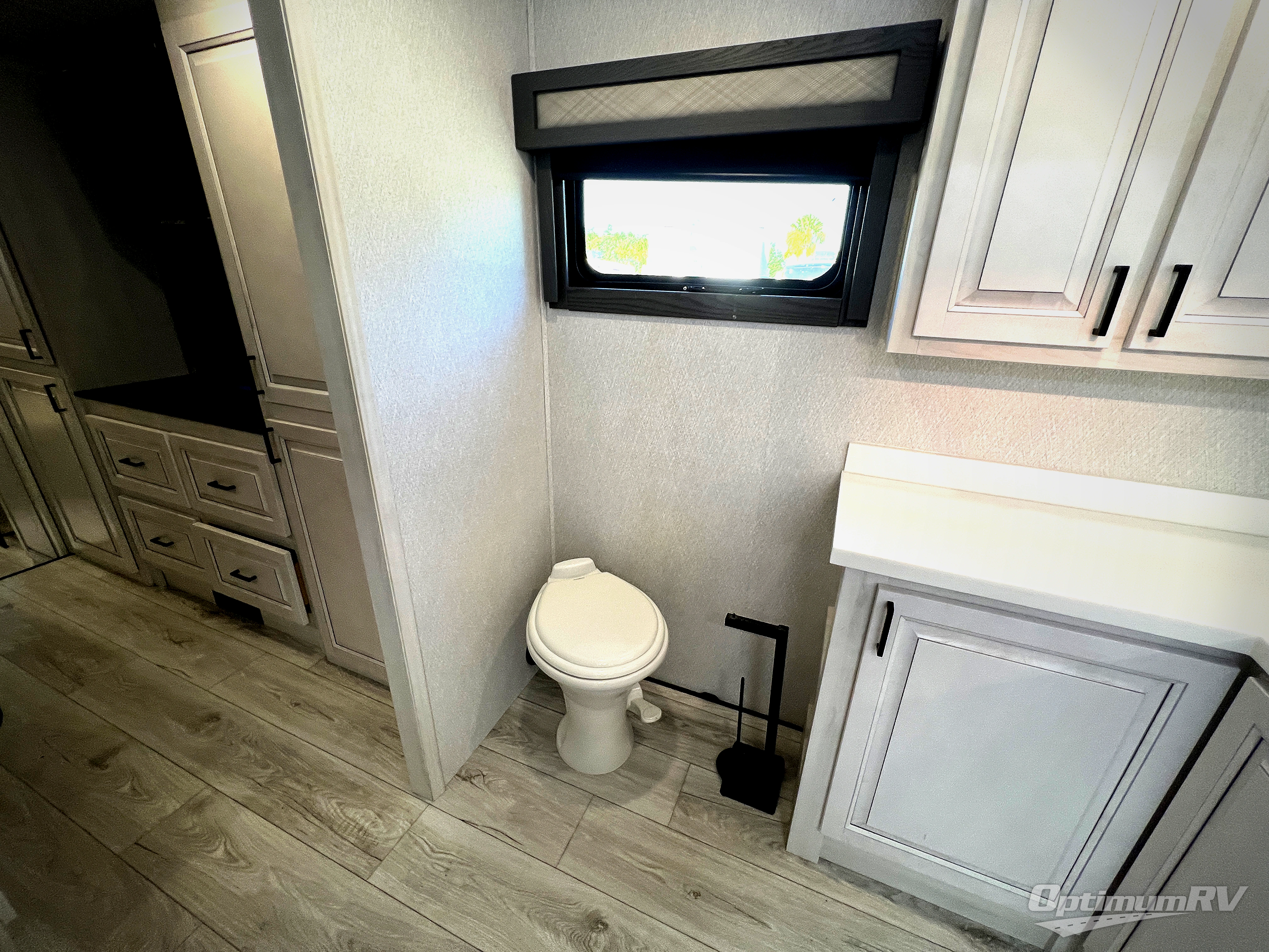 If you've been looking for a luxury fifth wheel to call your new home away from home, take a look at this Ahara! The front living area will be a favorite hangout spot with its dual hide-a-bed sofa, theater seating, and 65" TV with a fireplace. And since there are dual opposing slides here, your guests will have plenty of space to fold down the sofas at night for a great night's rest. If you're looking for your bedroom, head to the back and you'll enjoy a king bed slide out, a dresser with TV prep, two closets, plus your own full rear bath. The dual bath sinks are sure to come in handy when you're both getting ready for bed, and the spacious shower with a skylight will provide natural light as you clean up in the morning. There is even a closet with washer and dryer prep if you plan to go full-time. In the morning you can prepare breakfast on the four burner cooktop or in the 30" over-the-range residential microwave, and the 16 cu. ft. 12V French door refrigerator includes a double drawer freezer to hold more food. There is a free-standing dinette with a storage ottoman here, a hutch to store nice dishes, and the half bath is located off of this room for convenience!