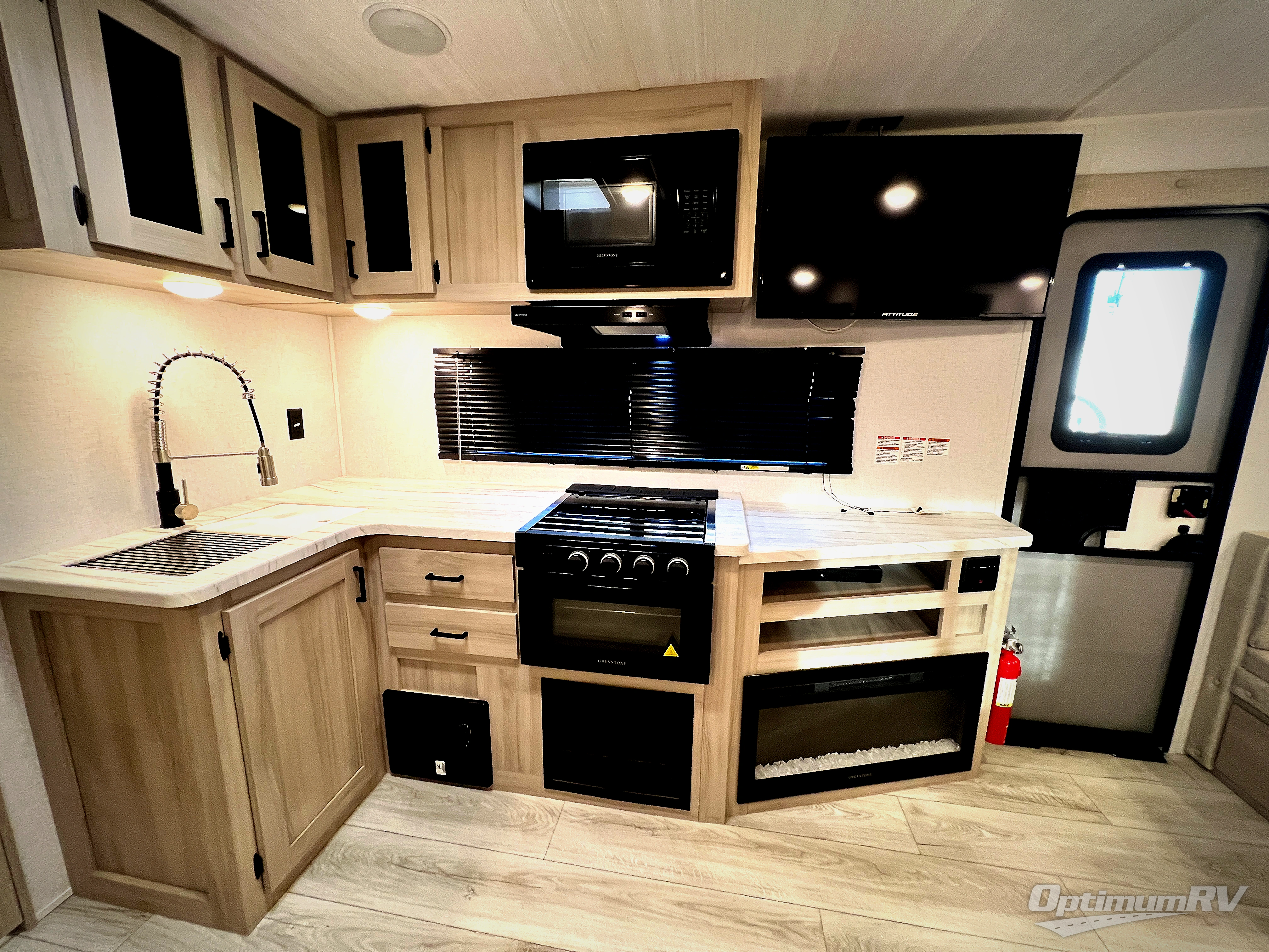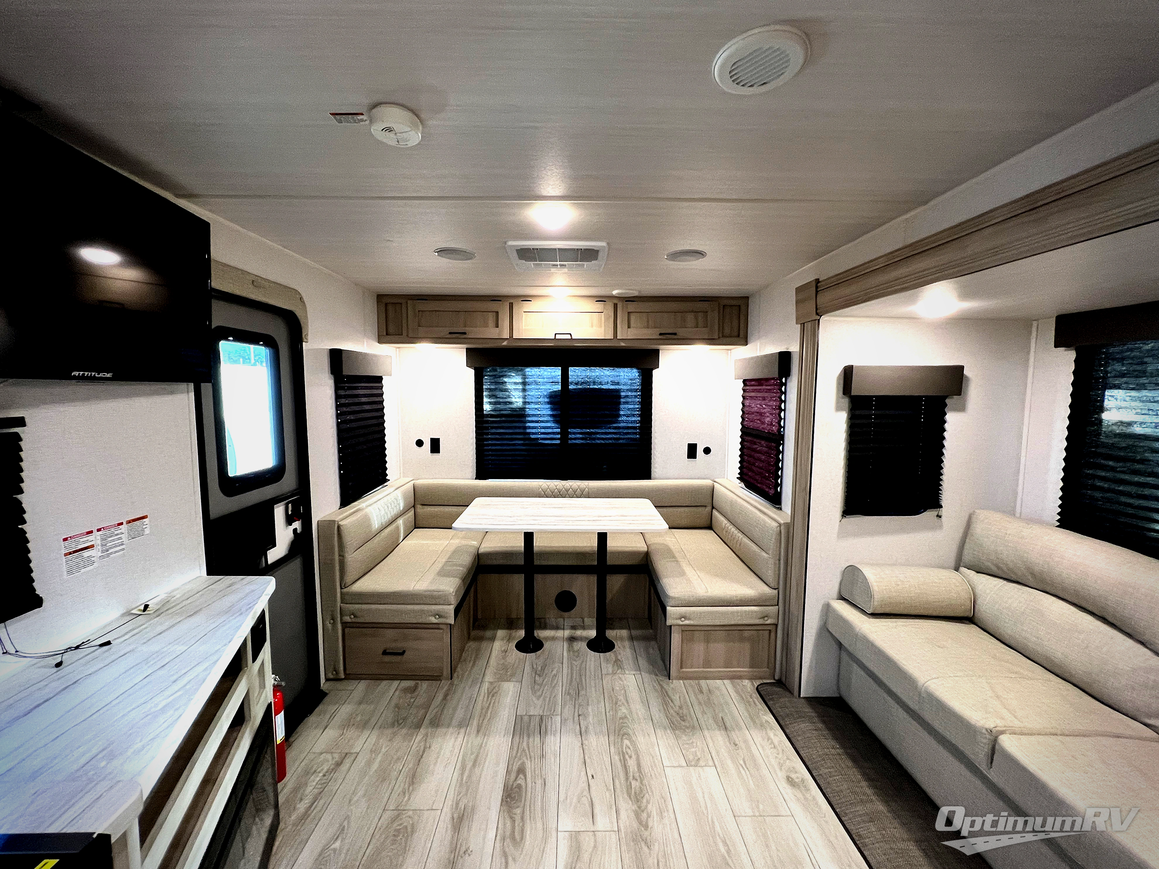 When you are wanting a little more interior space in your next travel trailer, take a look inside! This large slide out widens the main living space so you can easily make meals using full amenities without having to move for someone walking from the front bedroom and walk-through bath to the u-shaped dinette in the back. For sleeping, there is a king-size bed with storage on both sides at the very front of this unit giving you privacy from the rest, and even a private second entry/exit door from within the bedroom. You will find storage beneath the bed for larger items or extra blankets, plus a space saving sliding door. The U-shaped dinette and jack knife sofa offer comfortable seating as well as extra sleeping space for overnight guests, and the fireplace is just a nice feature to enjoy. On the outside, an 18' awning provides a large outdoor living area protected from the elements, and the oversized pass-through will house all of your exterior gear like lawn chairs, outdoor games and rugs, plus so much more!