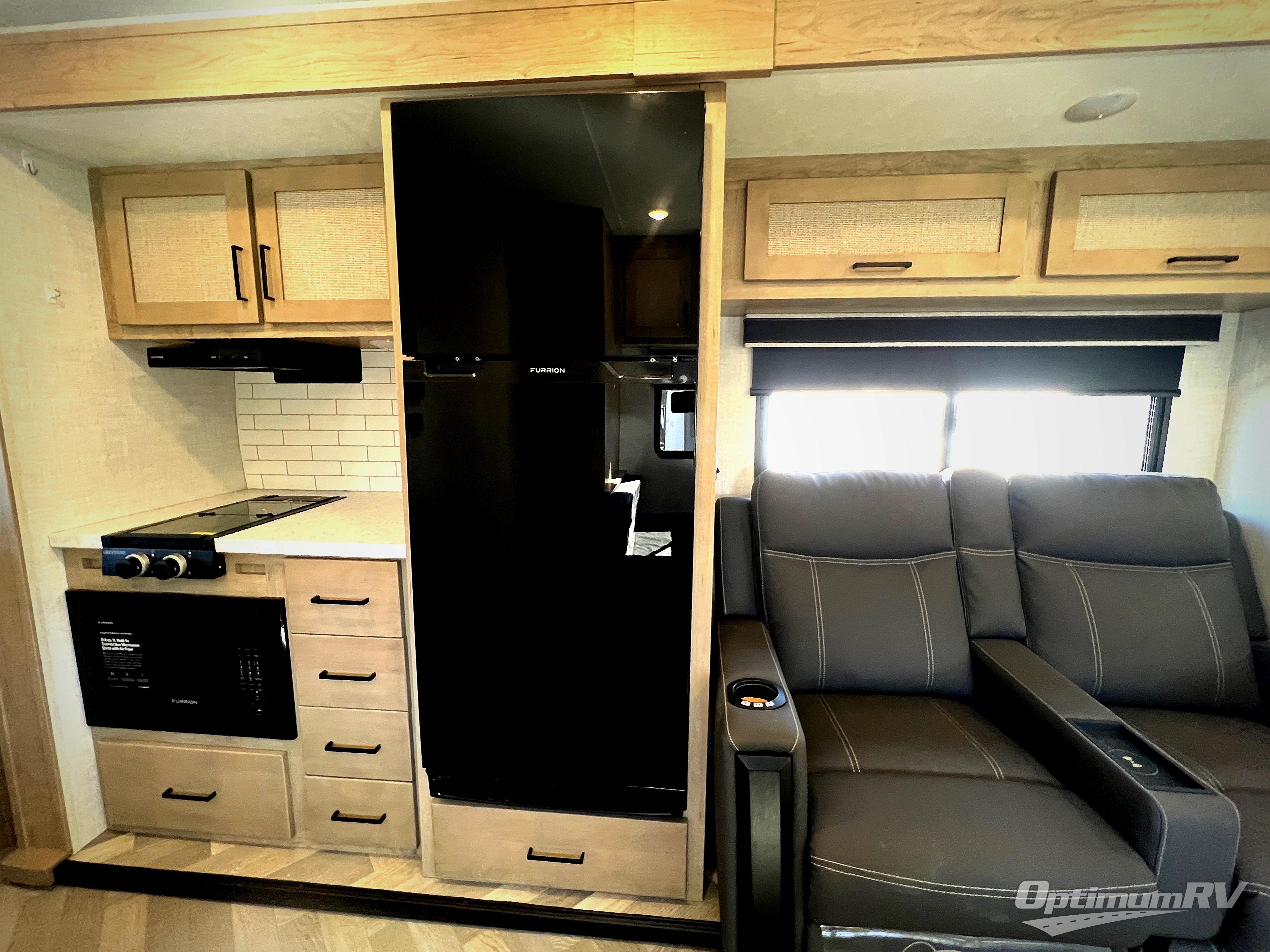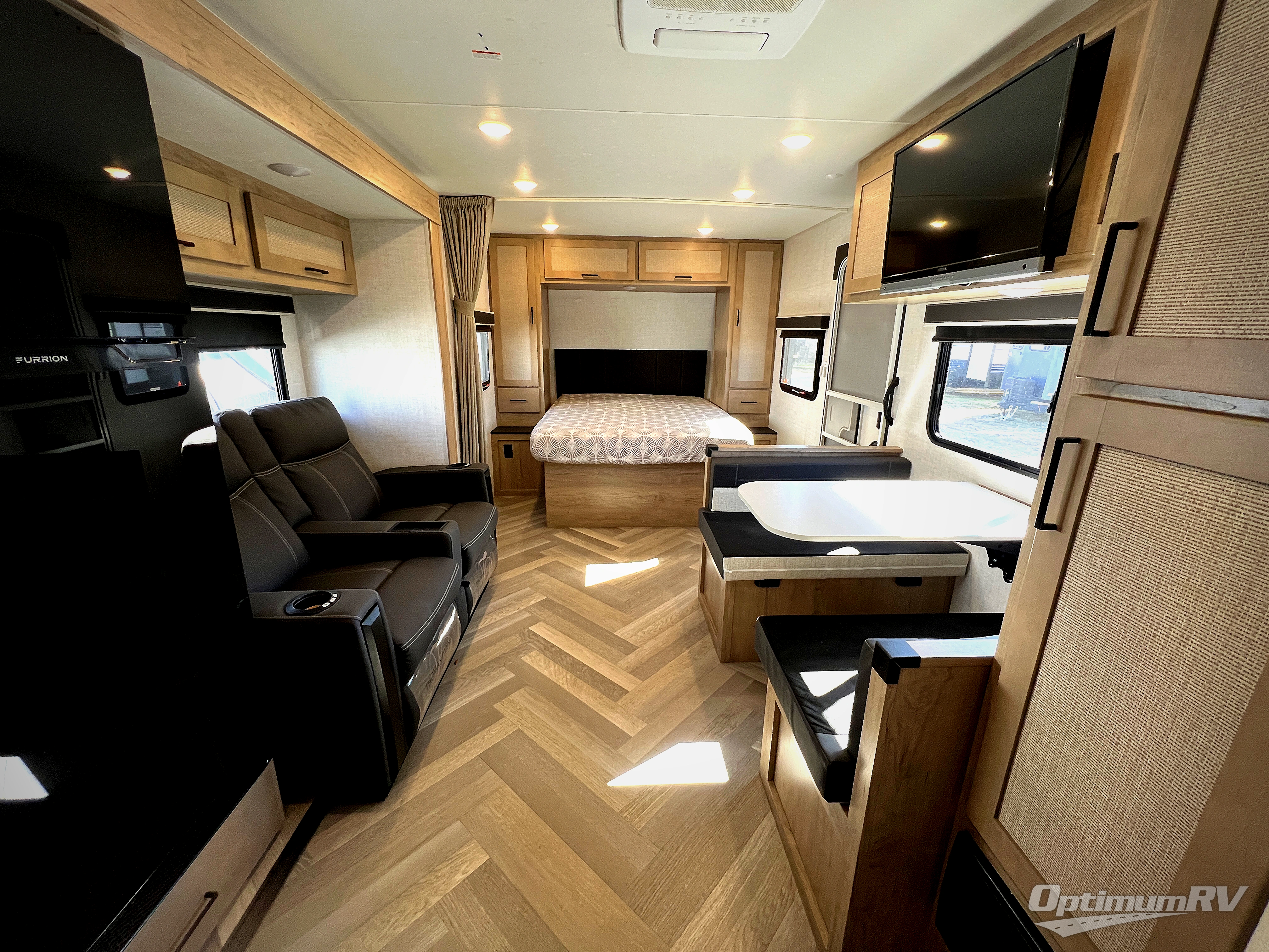 Camping trips just got a whole lot better in this tandem axle, single slide travel trailer! Once you arrive at the campground, you can put out the 18' power awning, grab your camp chairs from the pass-through storage, and relax! When you're getting hungry, head to the rear corner kitchen that includes ample counter space, a two burner cooktop, plus a 10 cu. ft. 12V refrigerator. There is also a pantry to store snacks and paper goods! You can get cozy after dinner on the theater seating that sits directly across from the HDTV for easy viewing, and there is a legless dinette if game night is in order. When you're ready for bed, the queen bed up front will provide a great night's rest, and there is a privacy curtain if you have a guest staying over on the dinette. And don't worry about storage space; this model has you covered with dual bedroom wardrobes, overhead cabinets, and convenient shoe storage!