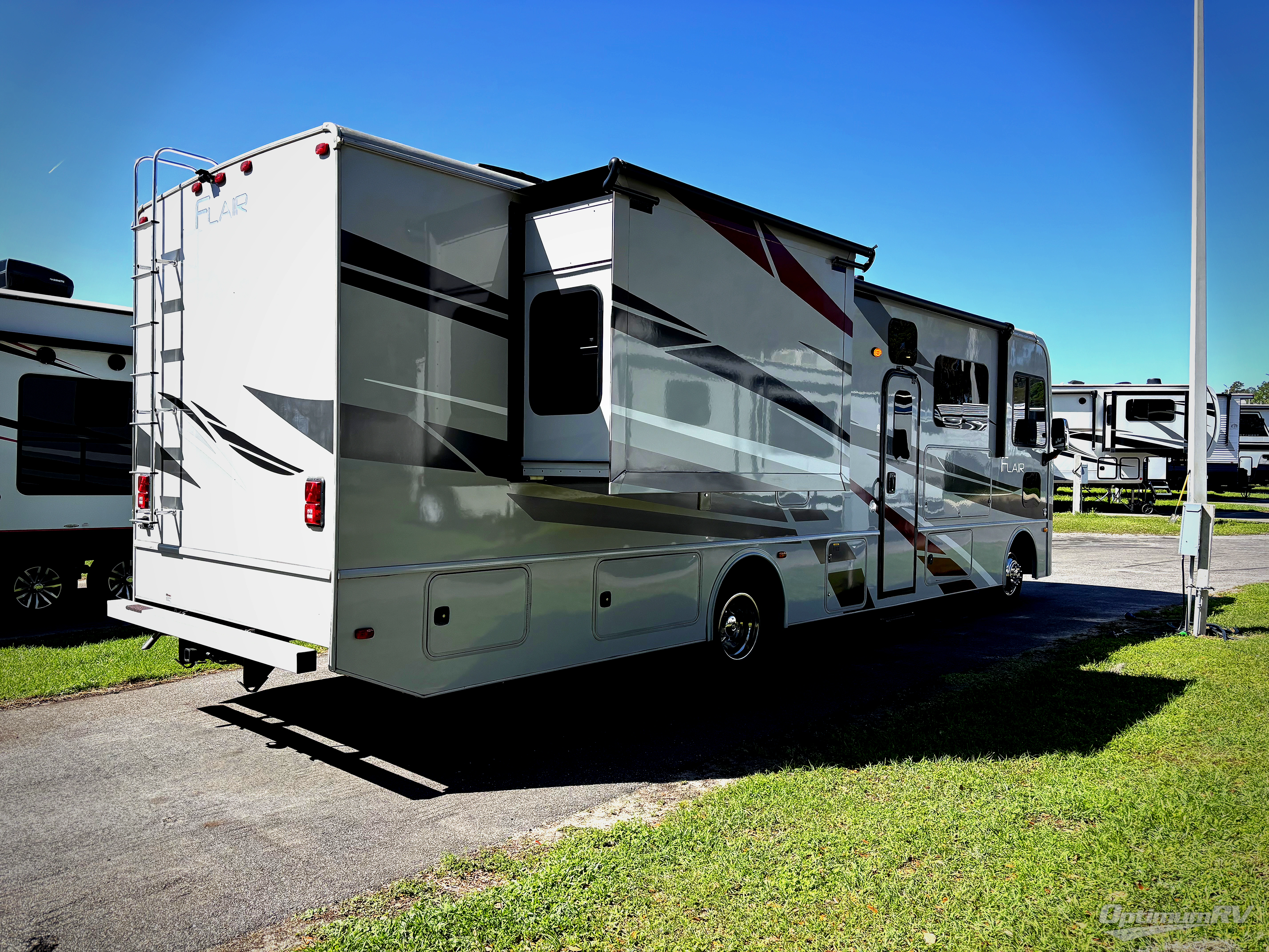 Step up your camping game by adding the Fleetwood Flair Class A gas motorhome to the line-up! The 7.3L 350HP engine with 468 LB/FT of torque forms the base, and the 8,000-LB towing capacity gives you the chance to bring a car with your coach. On the exterior you'll find an automotive, bonded one-piece windshield, exterior-mounted sideview cameras, and an exterior LED TV. The interior is decked out with a Sony dash radio, an all-new electronic instrument panel, a digital dash, and reclining/swivel cab chairs. There is also a workstation at the automotive-style dash, and the Bluetooth coach system in the bedroom has exterior speakers for fun party nights.