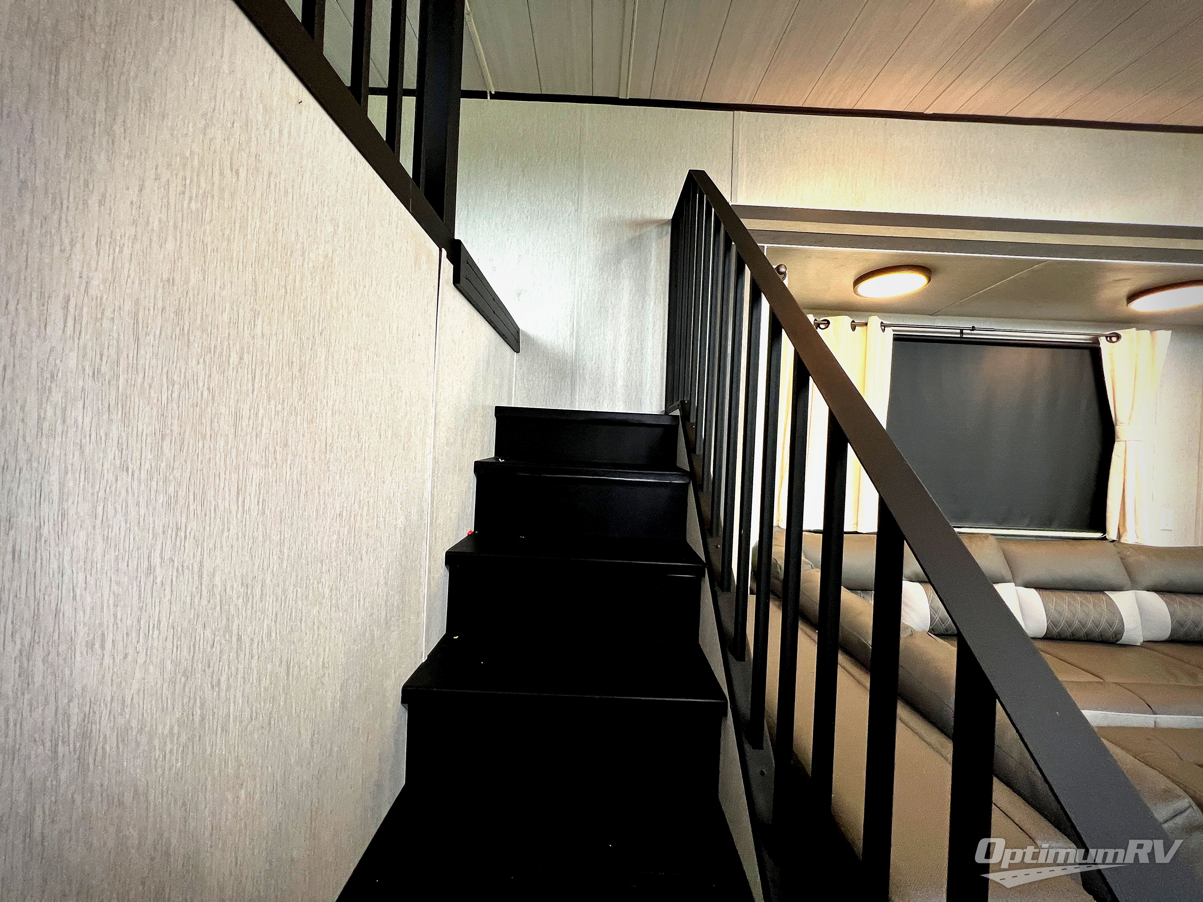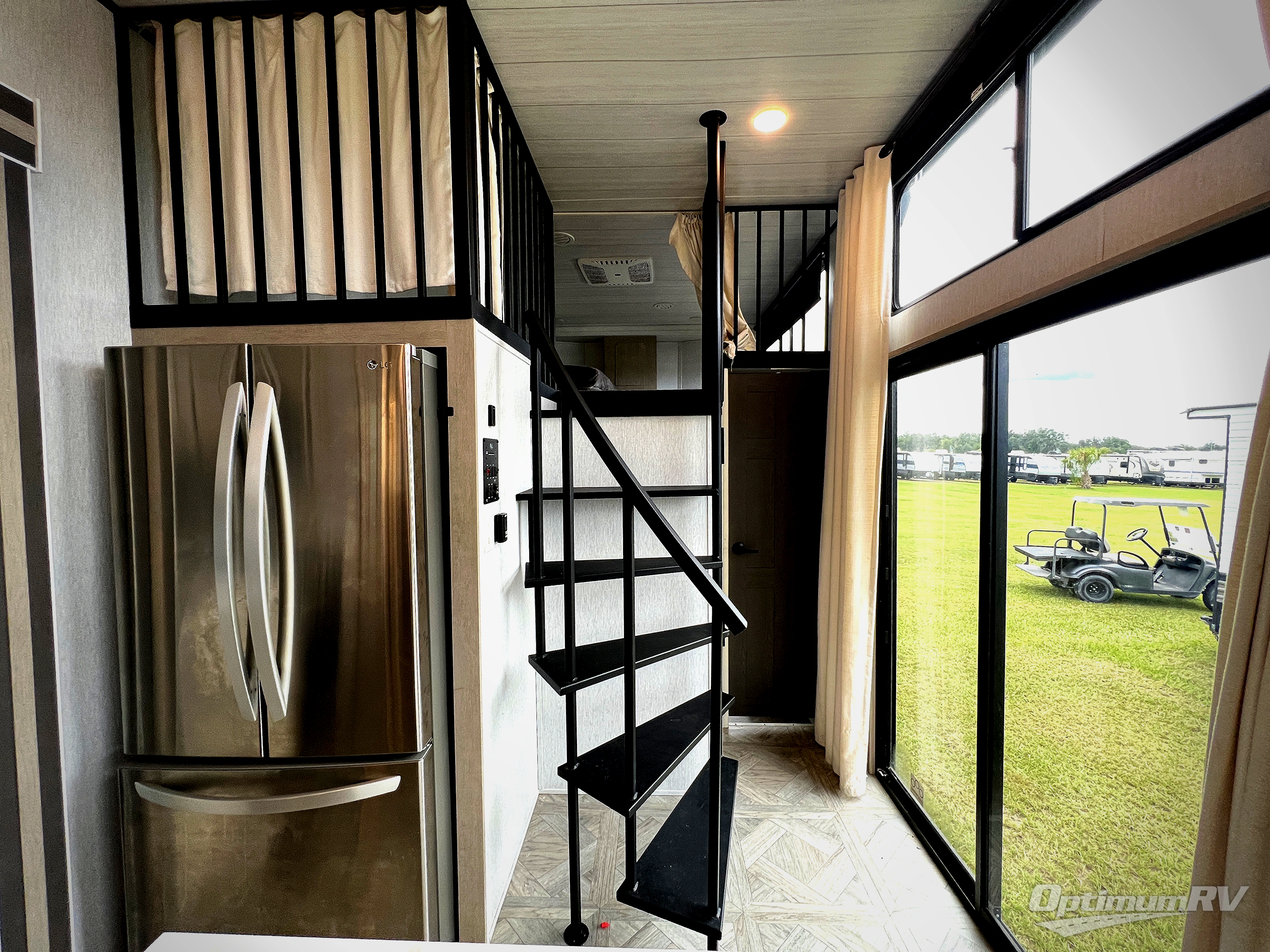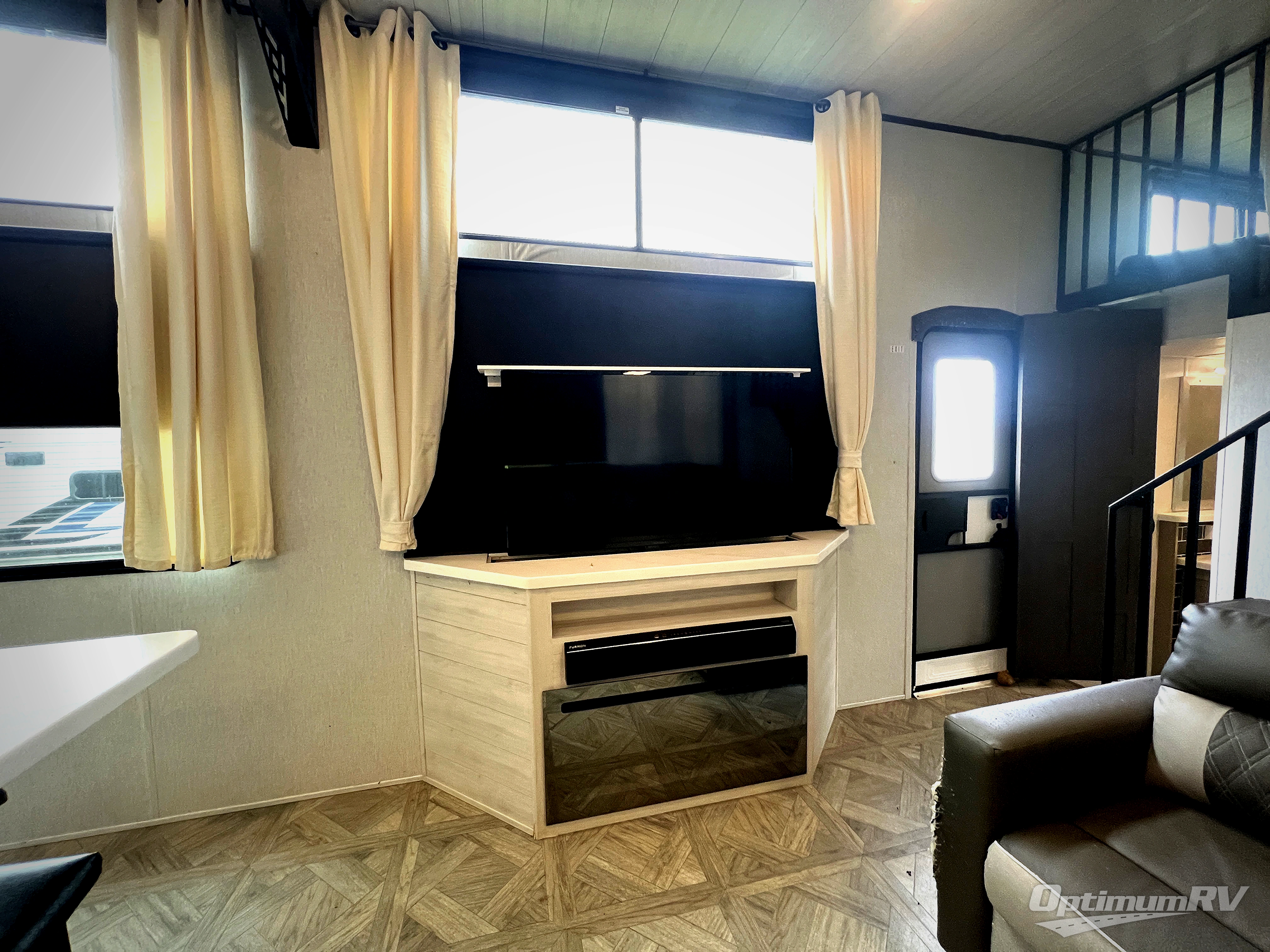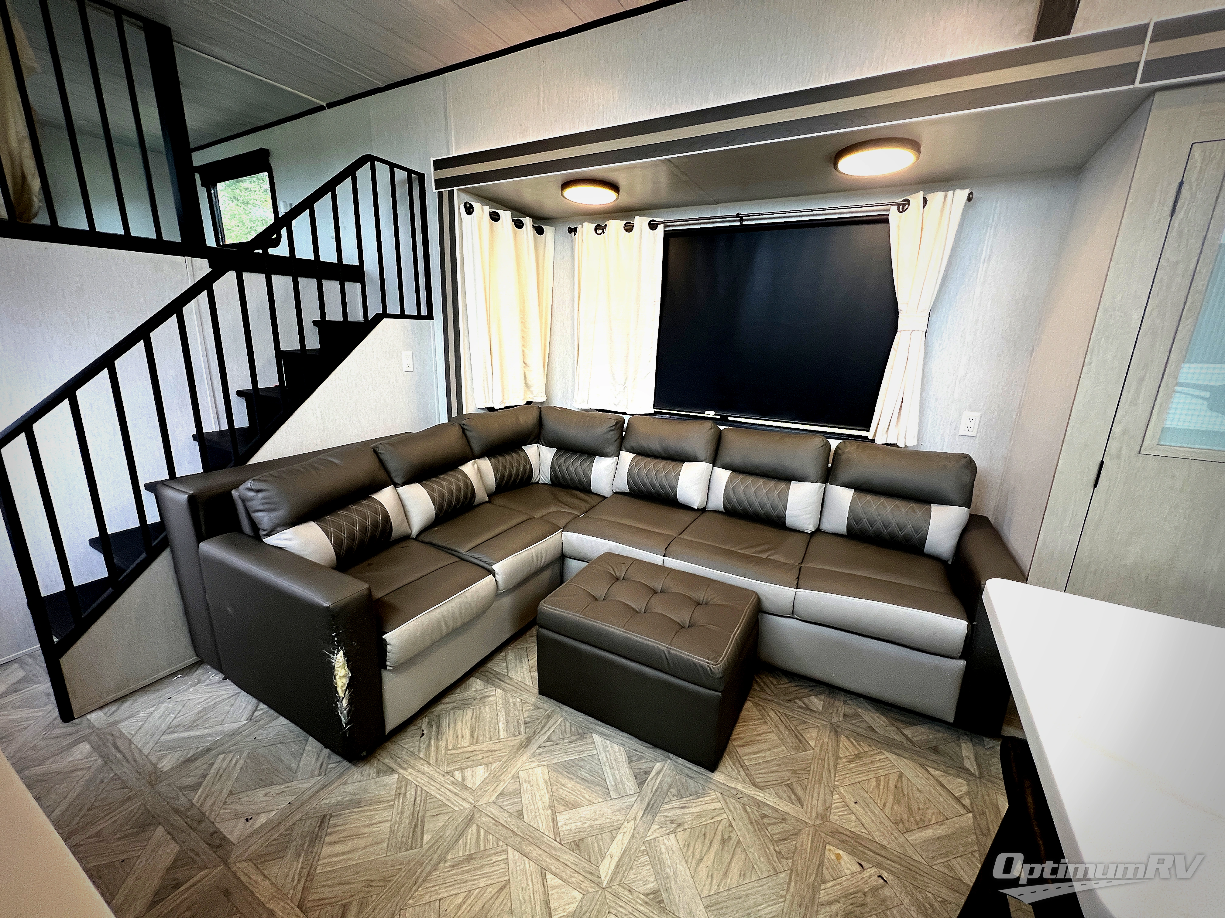 You will feel right at home in this destination trailer! It has not only has one loft in the rear with two 42" x 74" bunk mats, but also a second loft in the front with spiral steps leading up to two bunk mats. The front private bedroom features a king bed slide with versa-tilt to lay your head on at night with front windows to let in lots of natural lighting and sunshine in the morning. Relax in true comfort at night on the L-shaped sectional sofa across from the entertainment center with a fireplace. The kitchen island provides extra space to prepare delicious meals and comes with four bar stools to enjoy your breakfast each morning. Everyone will stay fresh and clean with a walk-in shower in the rear private bedroom, plus there is an area prepped to add an optional washer and dryer. Head outside through either the patio door or the second entry/exit door each day!