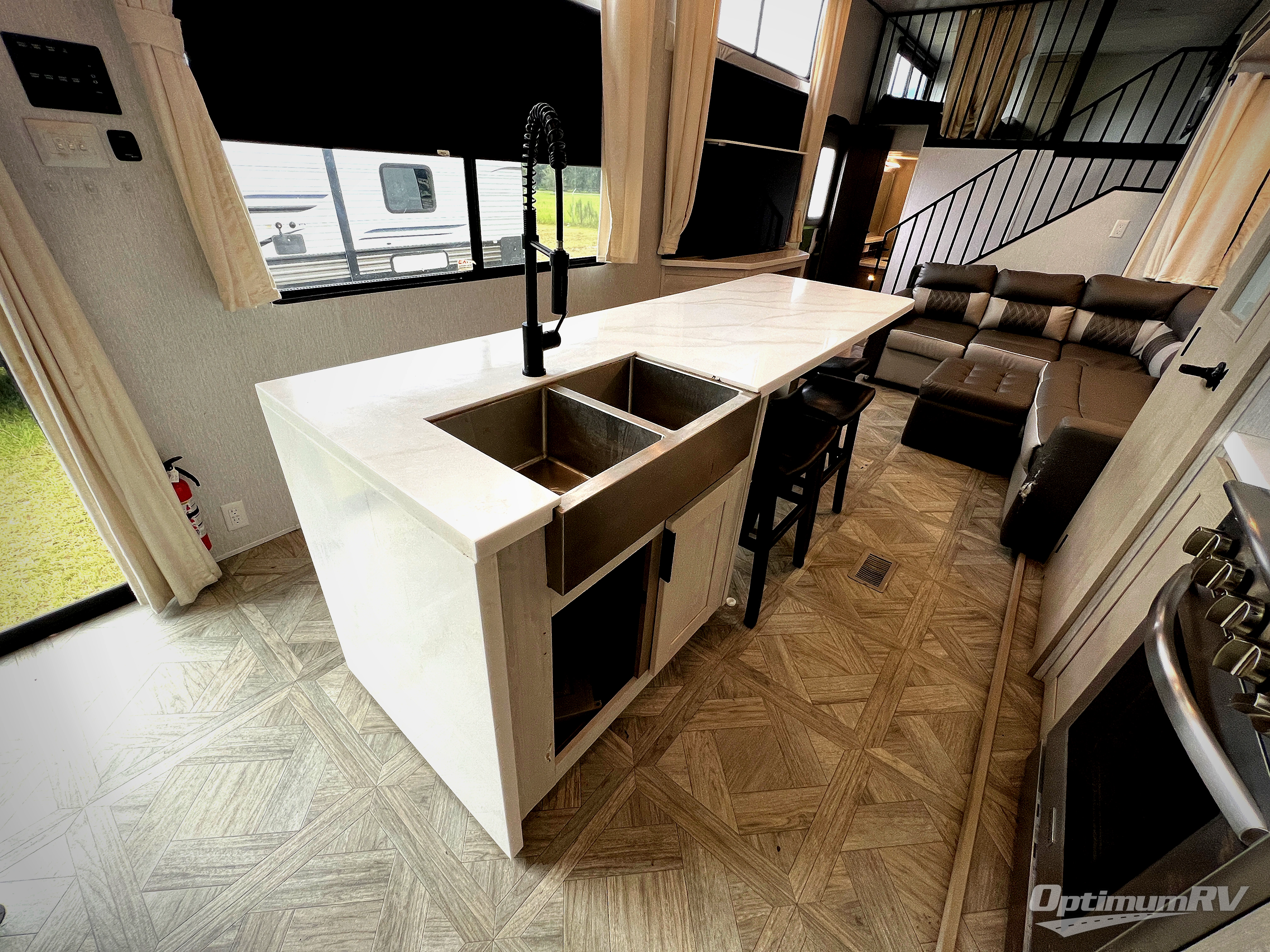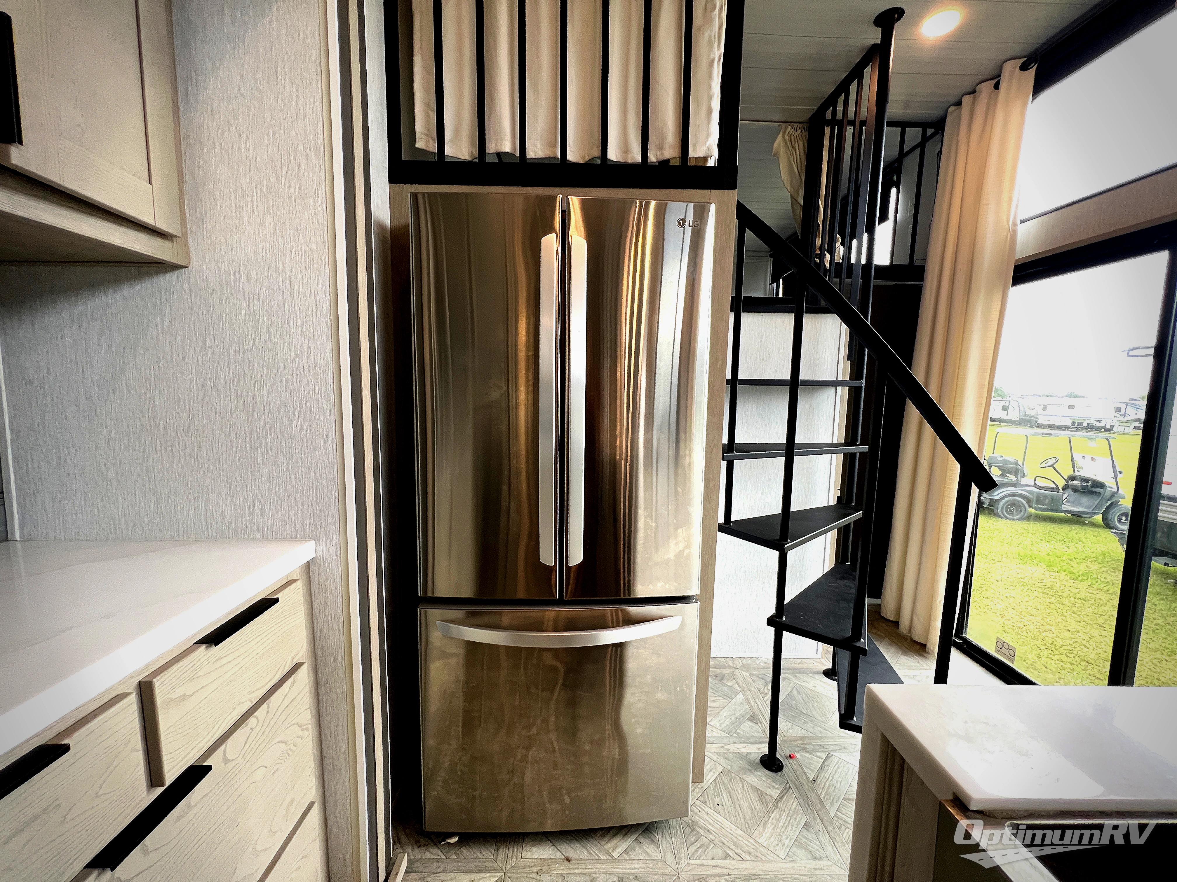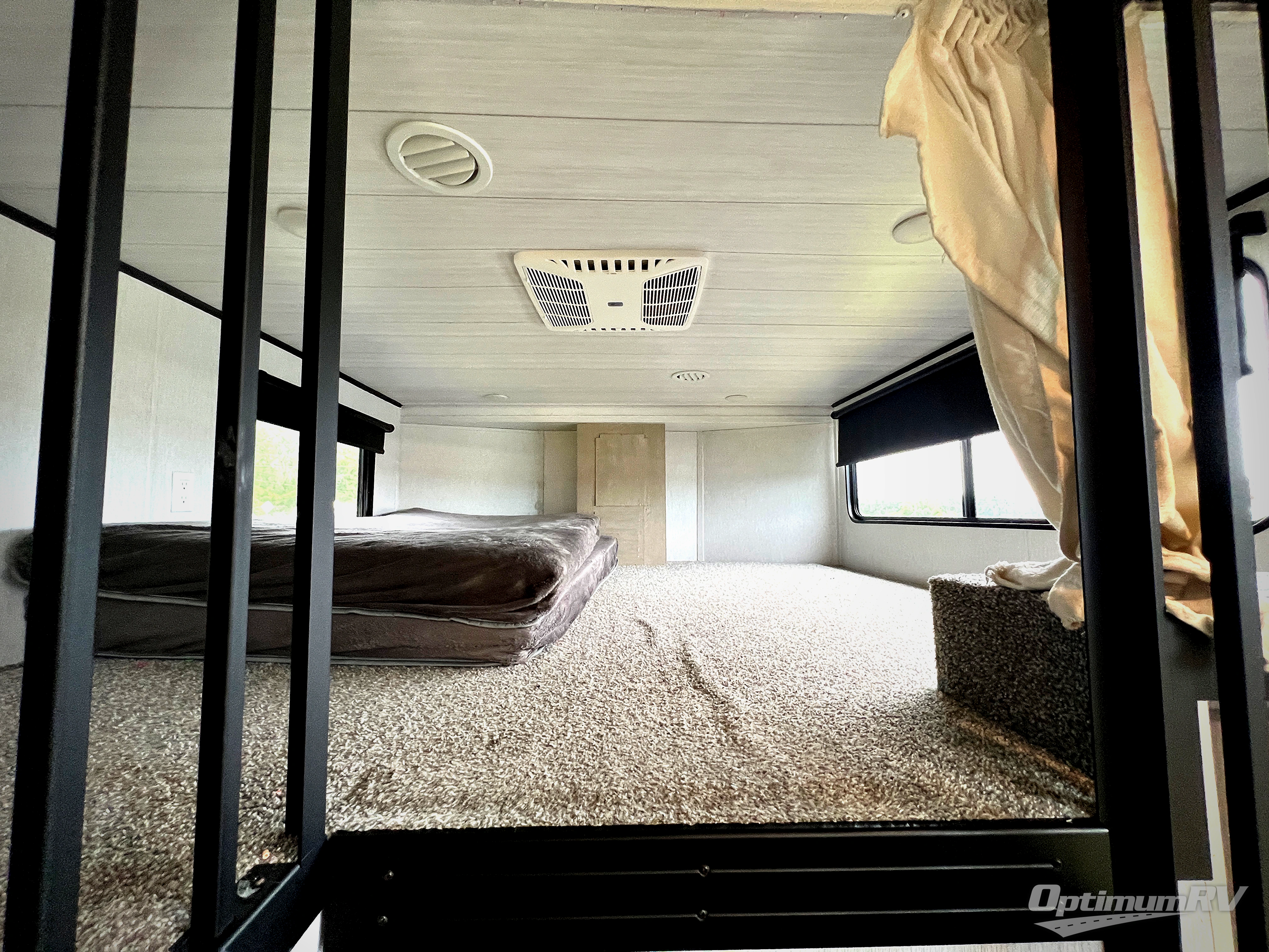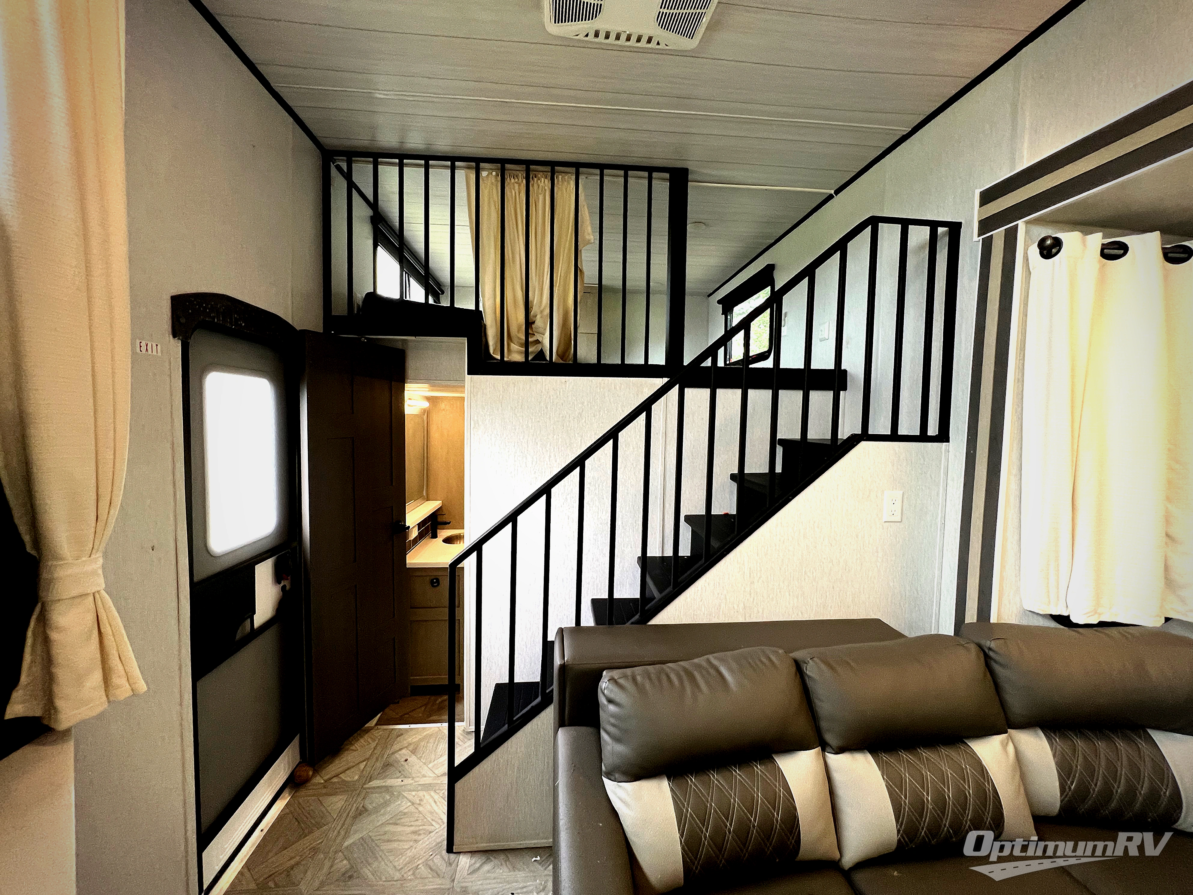 You will feel right at home in this destination trailer! It has not only has one loft in the rear with two 42" x 74" bunk mats, but also a second loft in the front with spiral steps leading up to two bunk mats. The front private bedroom features a king bed slide with versa-tilt to lay your head on at night with front windows to let in lots of natural lighting and sunshine in the morning. Relax in true comfort at night on the L-shaped sectional sofa across from the entertainment center with a fireplace. The kitchen island provides extra space to prepare delicious meals and comes with four bar stools to enjoy your breakfast each morning. Everyone will stay fresh and clean with a walk-in shower in the rear private bedroom, plus there is an area prepped to add an optional washer and dryer. Head outside through either the patio door or the second entry/exit door each day!