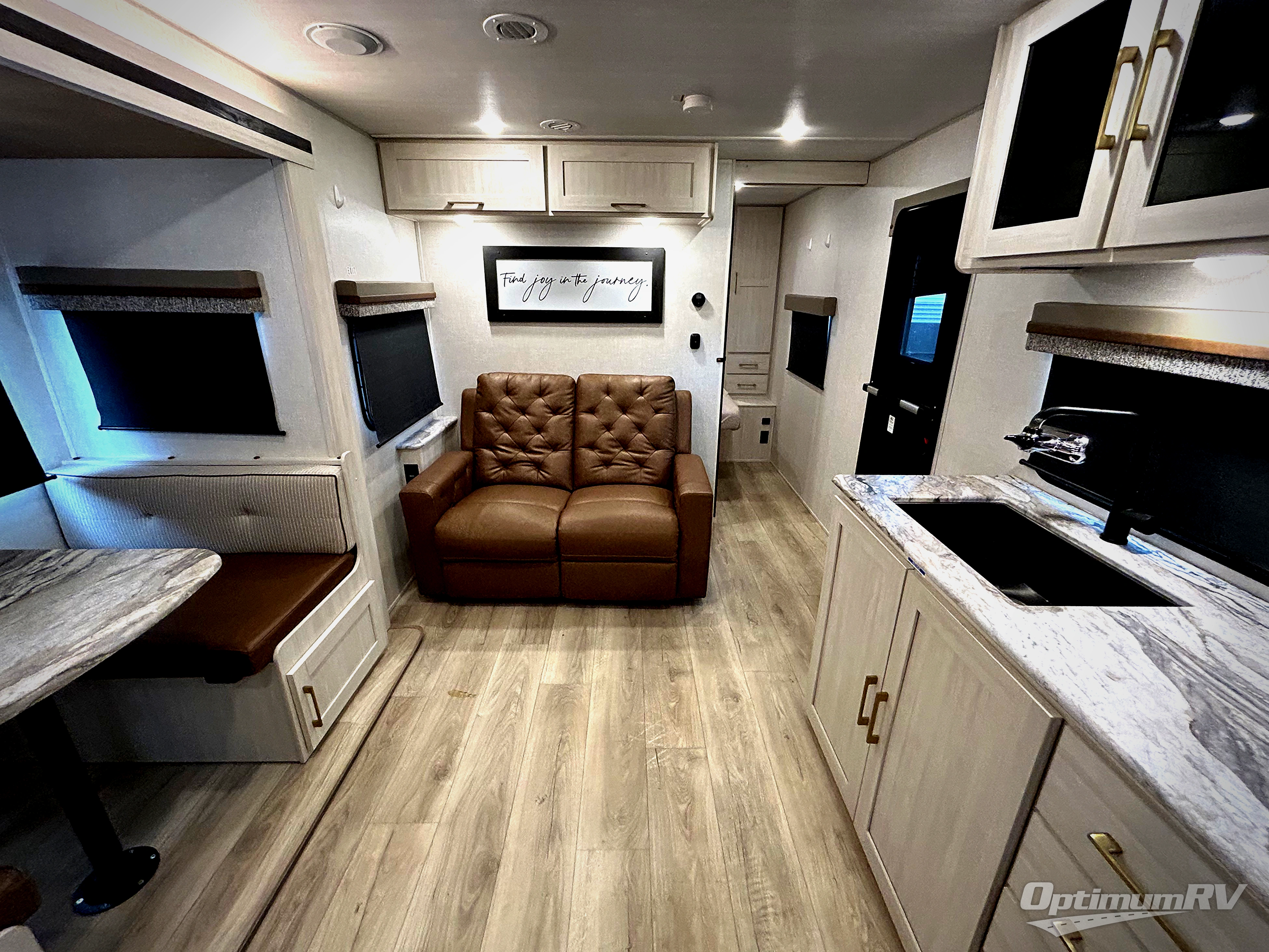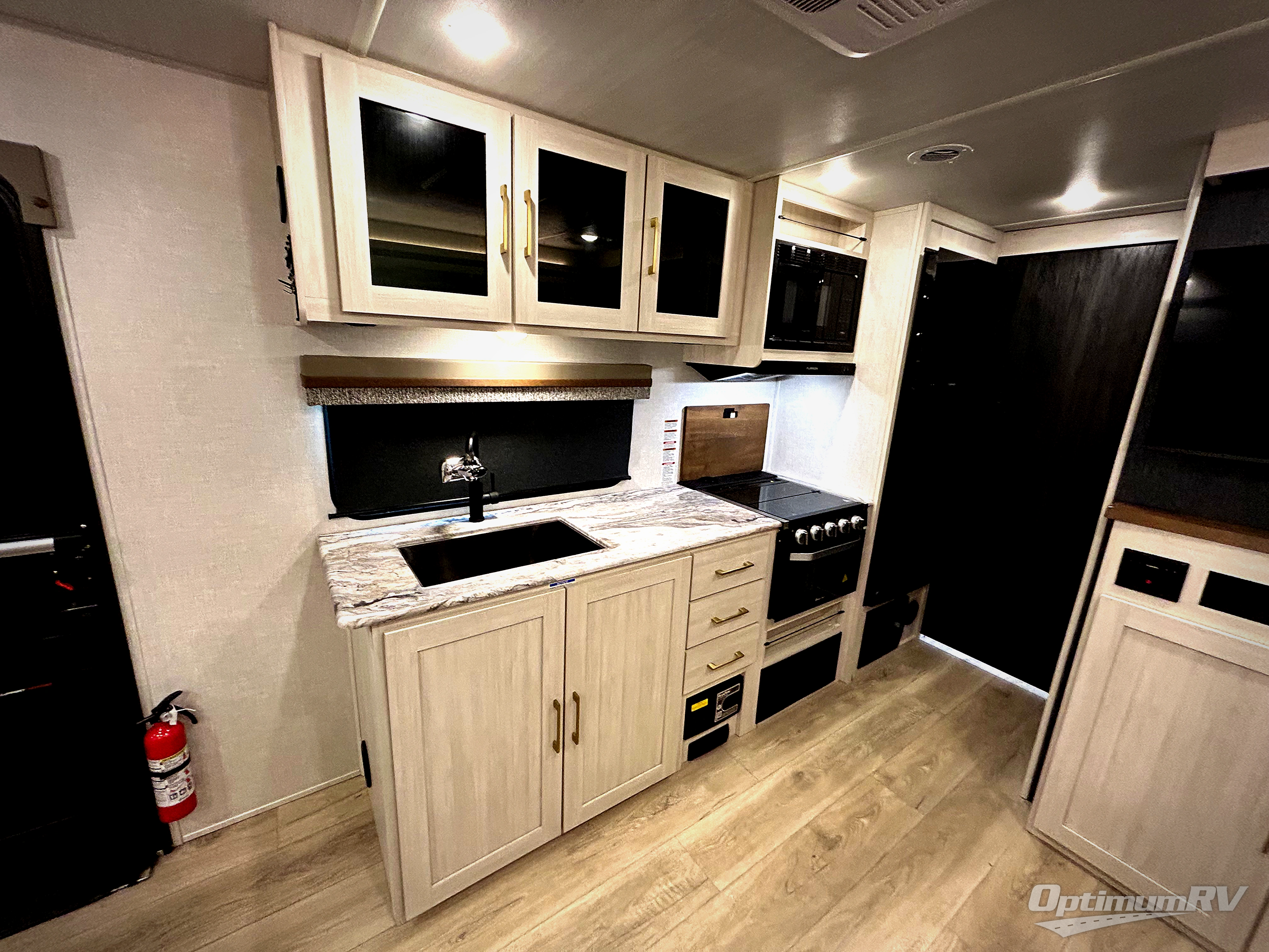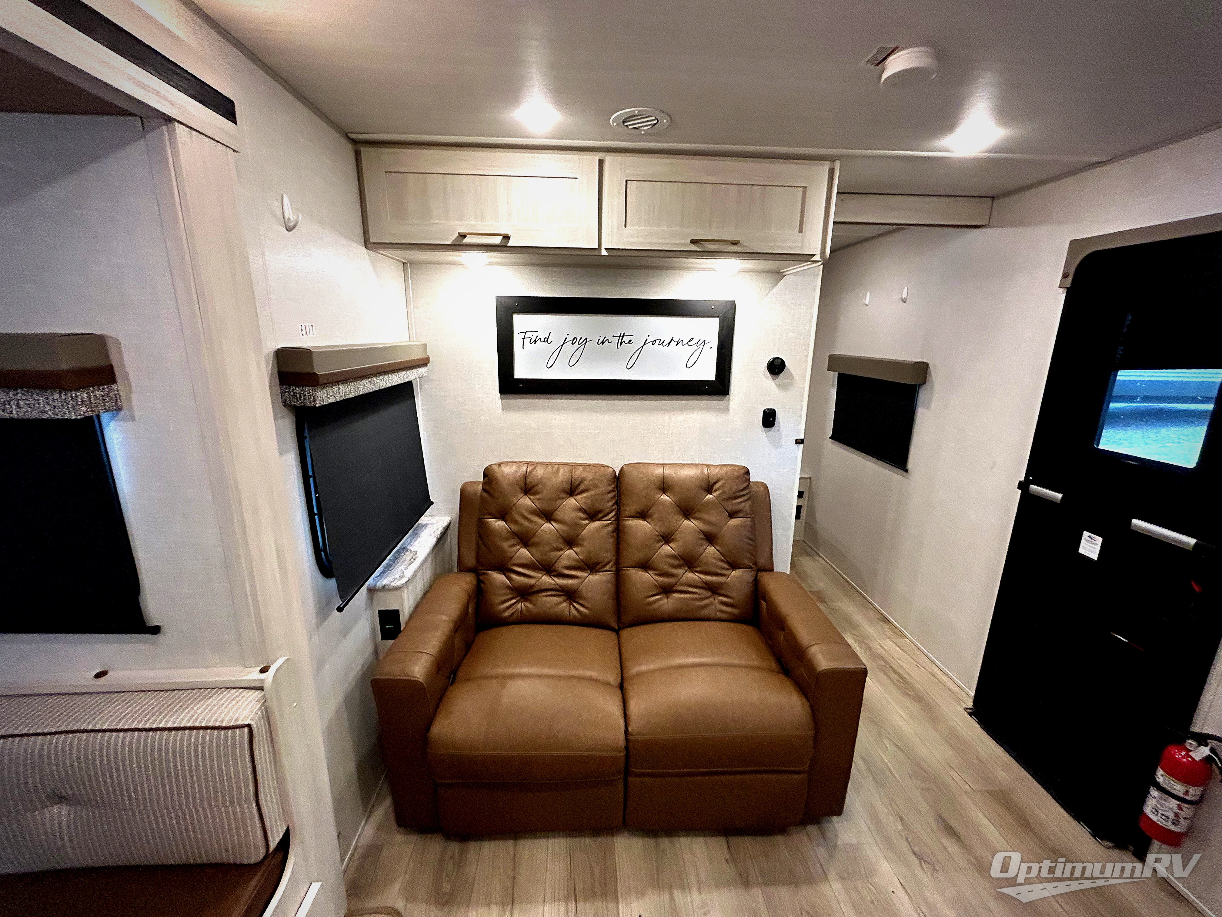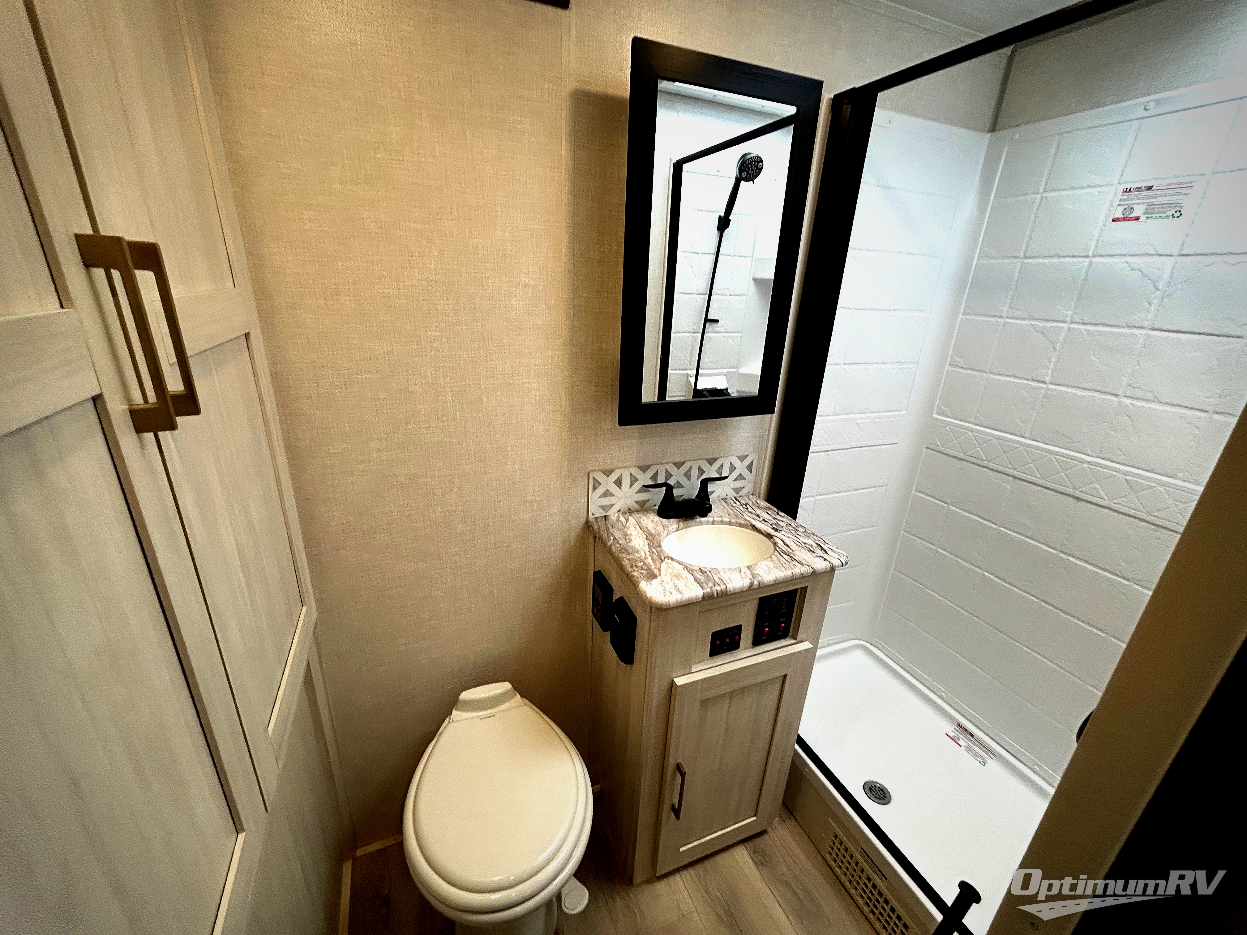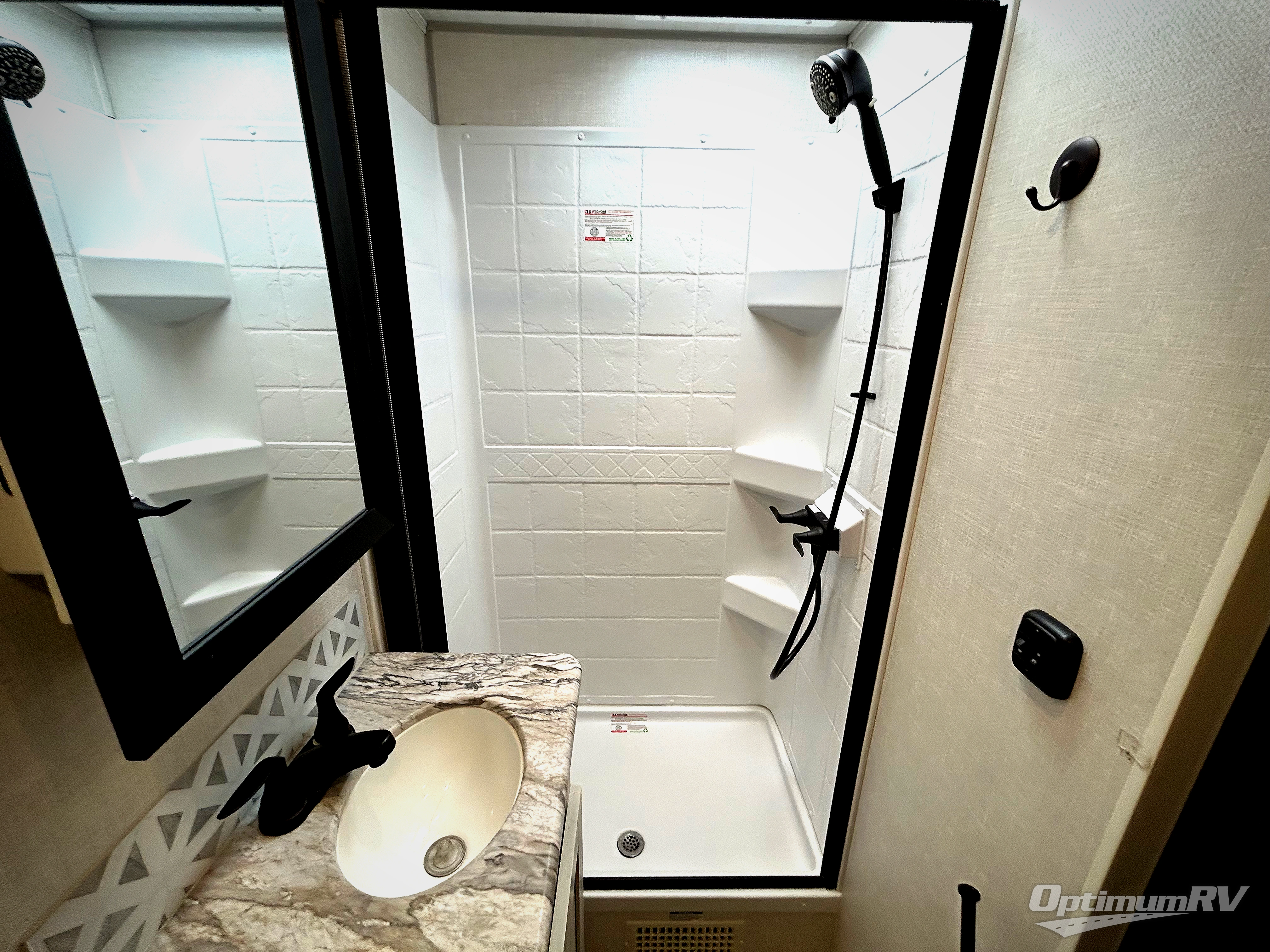 Whether you're camping with friends or family, you'll love the space and comfort found in this travel trailer. The outside kitchen is packed with features, such as a gas griddle, sink, refrigerator, and a shelf, plus there is a 21' electric awning for shade. Head inside to relax on the tri-fold sofa, or play a game at the booth dinette. You will also love the HD TV for your favorite shows at night. This model includes a full rear bath with a linen closet for clean towels and an upgraded slow-close shower door.