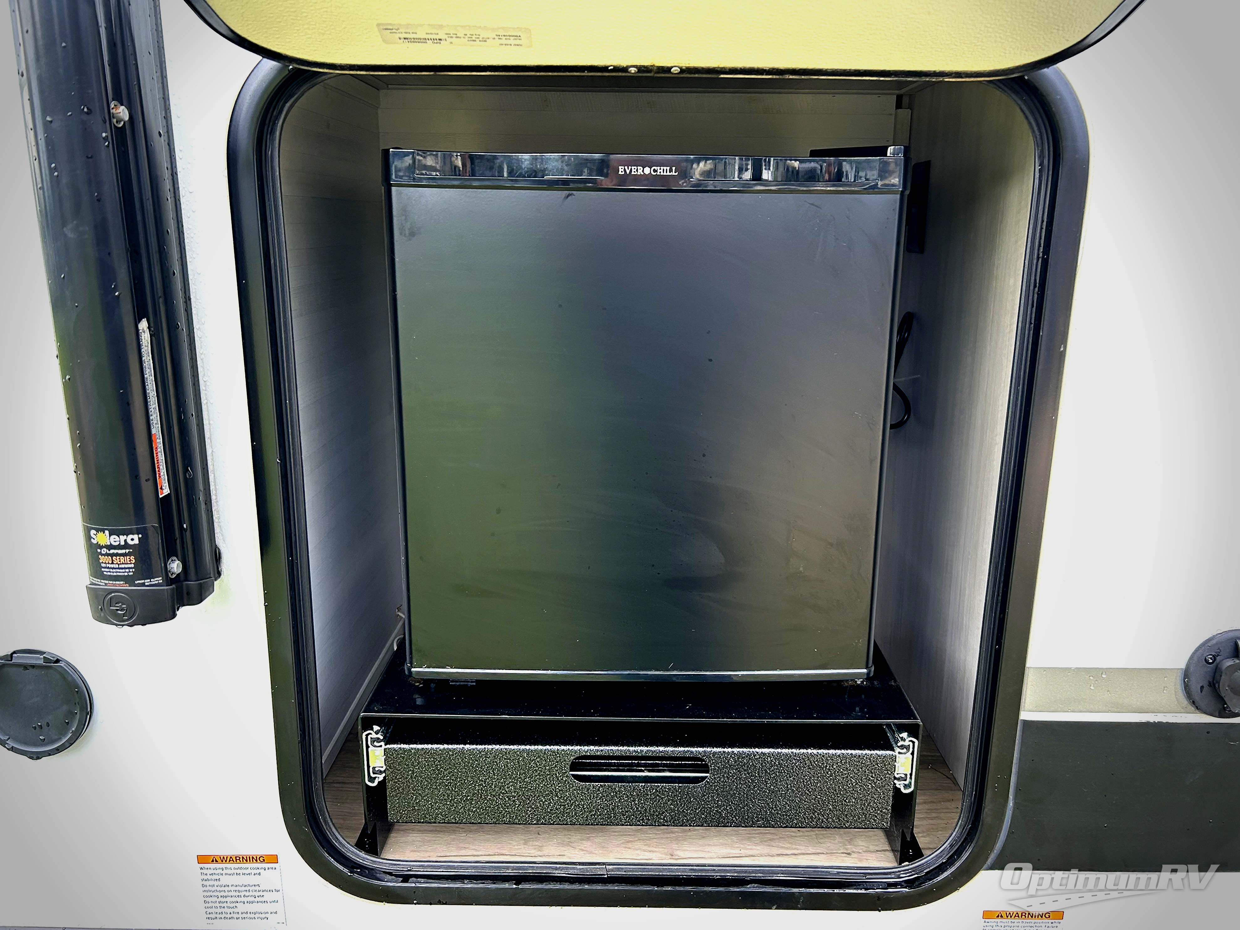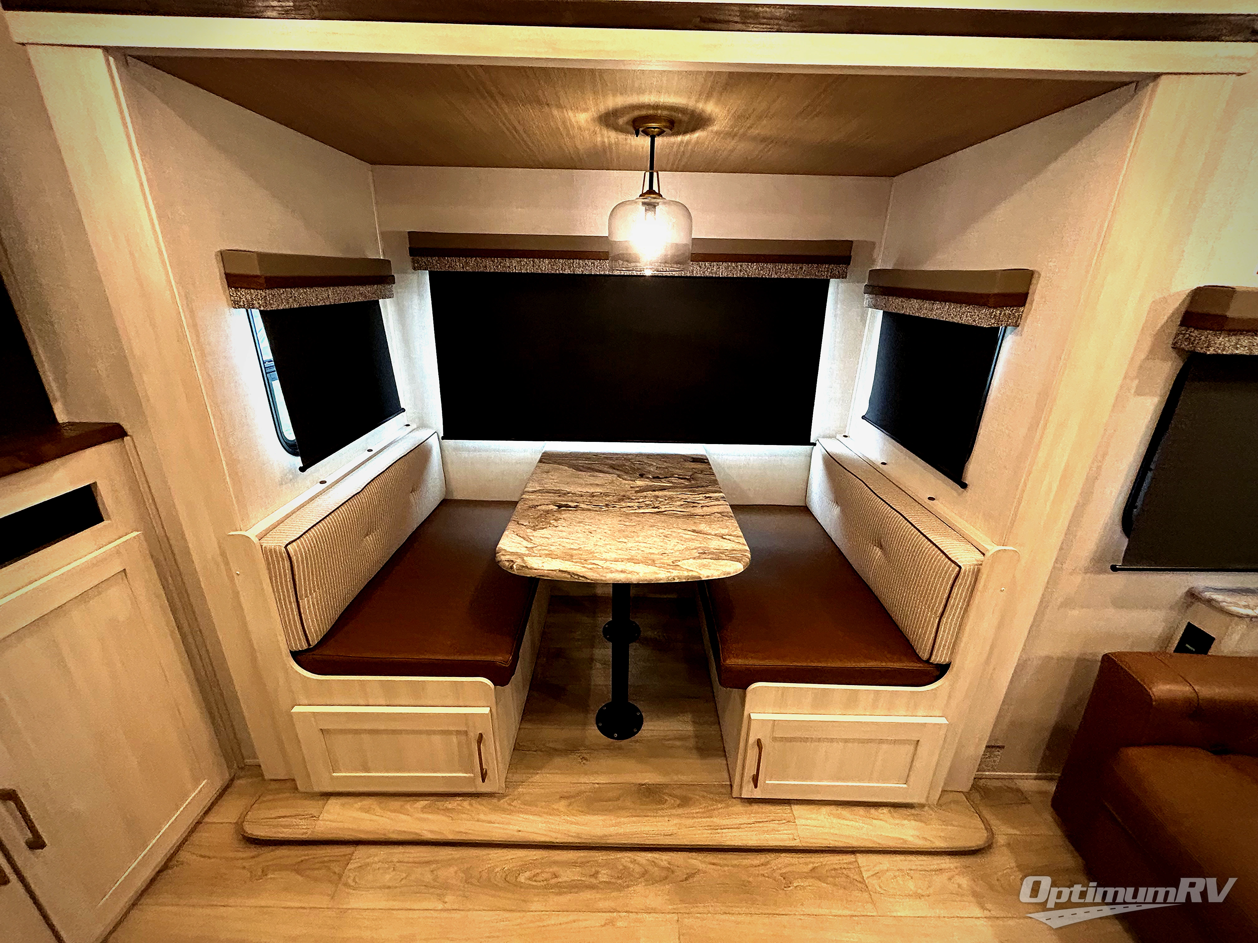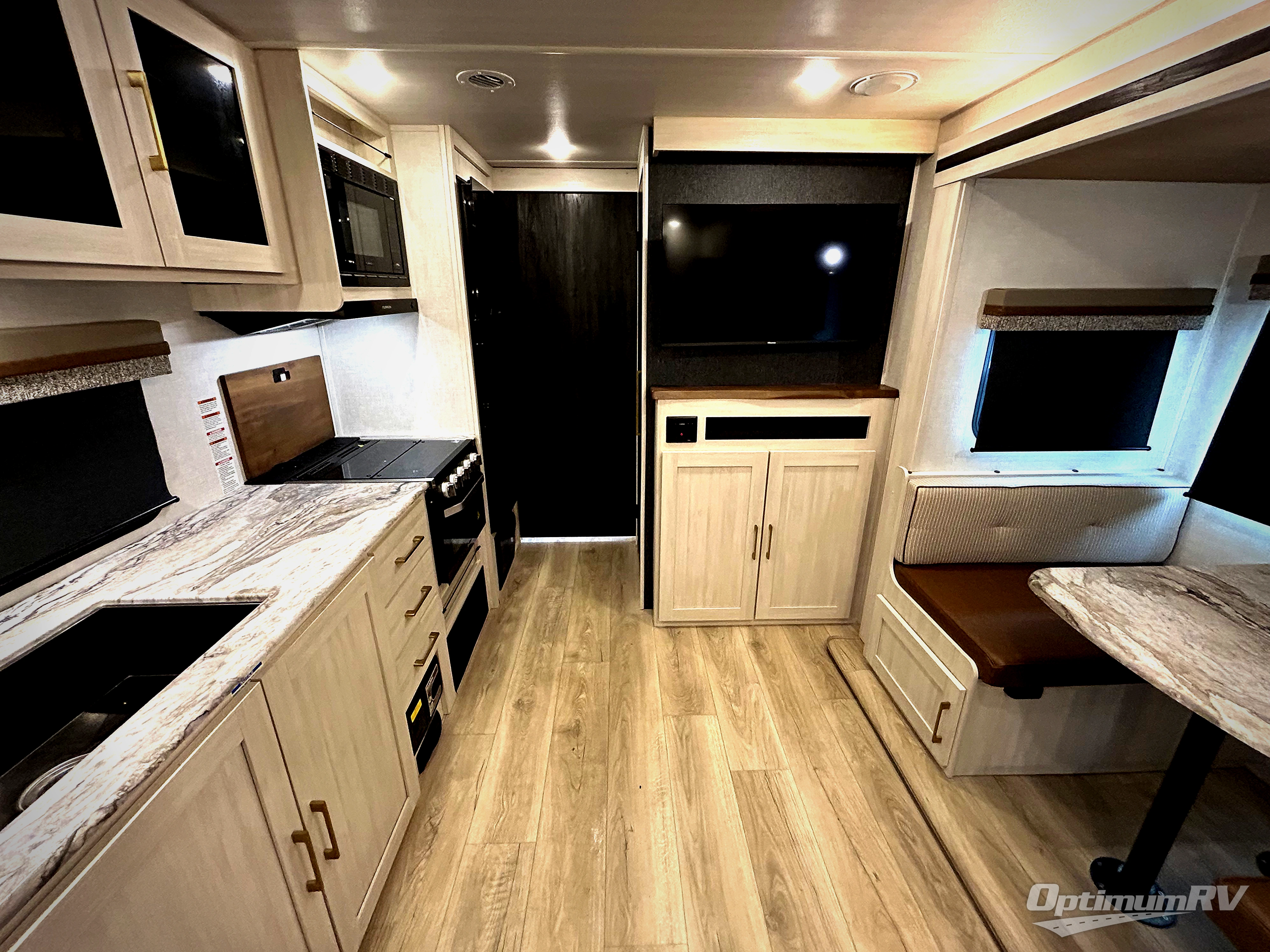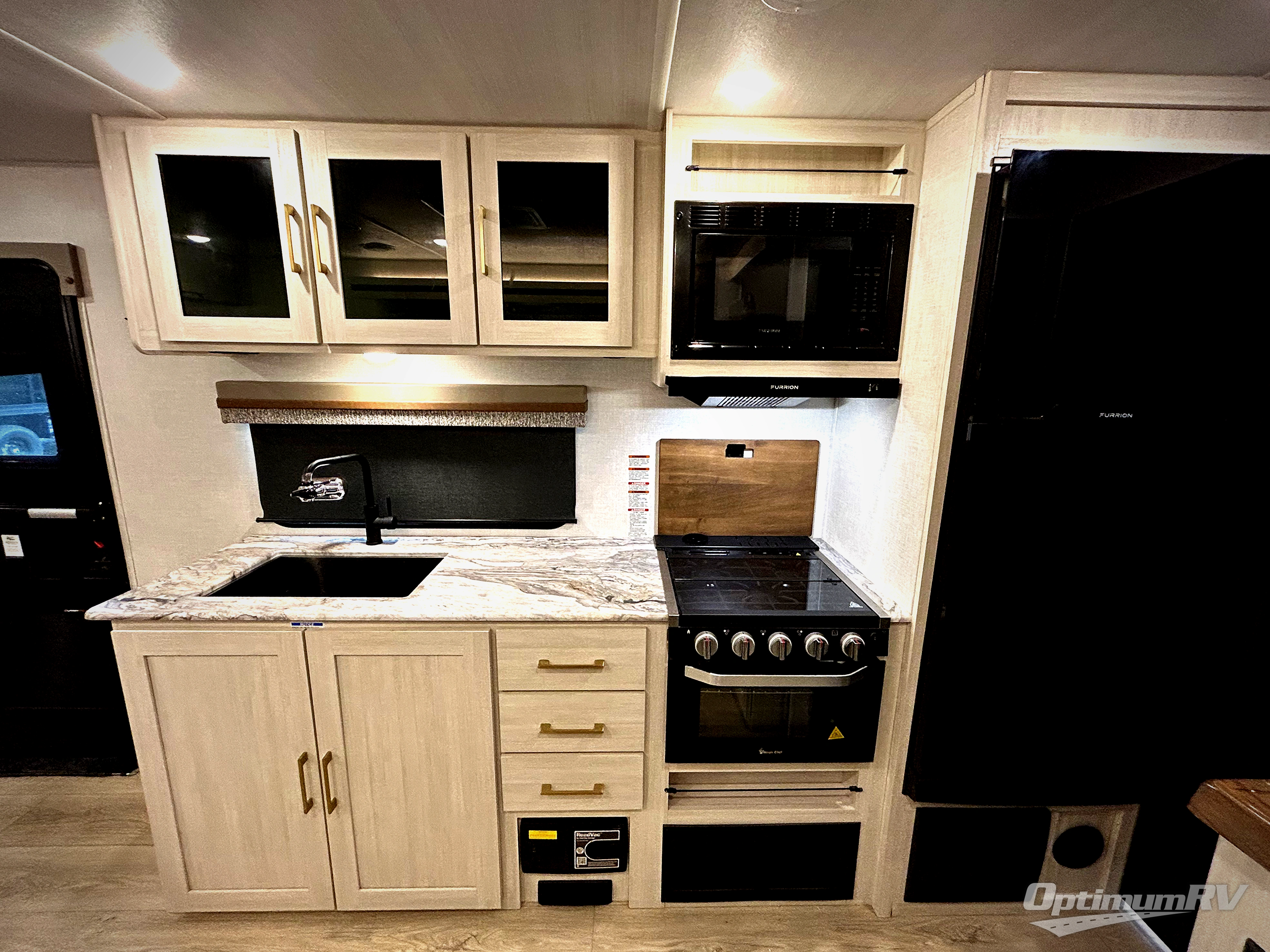 Whether you're camping with friends or family, you'll love the space and comfort found in this travel trailer. The outside kitchen is packed with features, such as a gas griddle, sink, refrigerator, and a shelf, plus there is a 21' electric awning for shade. Head inside to relax on the tri-fold sofa, or play a game at the booth dinette. You will also love the HD TV for your favorite shows at night. This model includes a full rear bath with a linen closet for clean towels and an upgraded slow-close shower door.