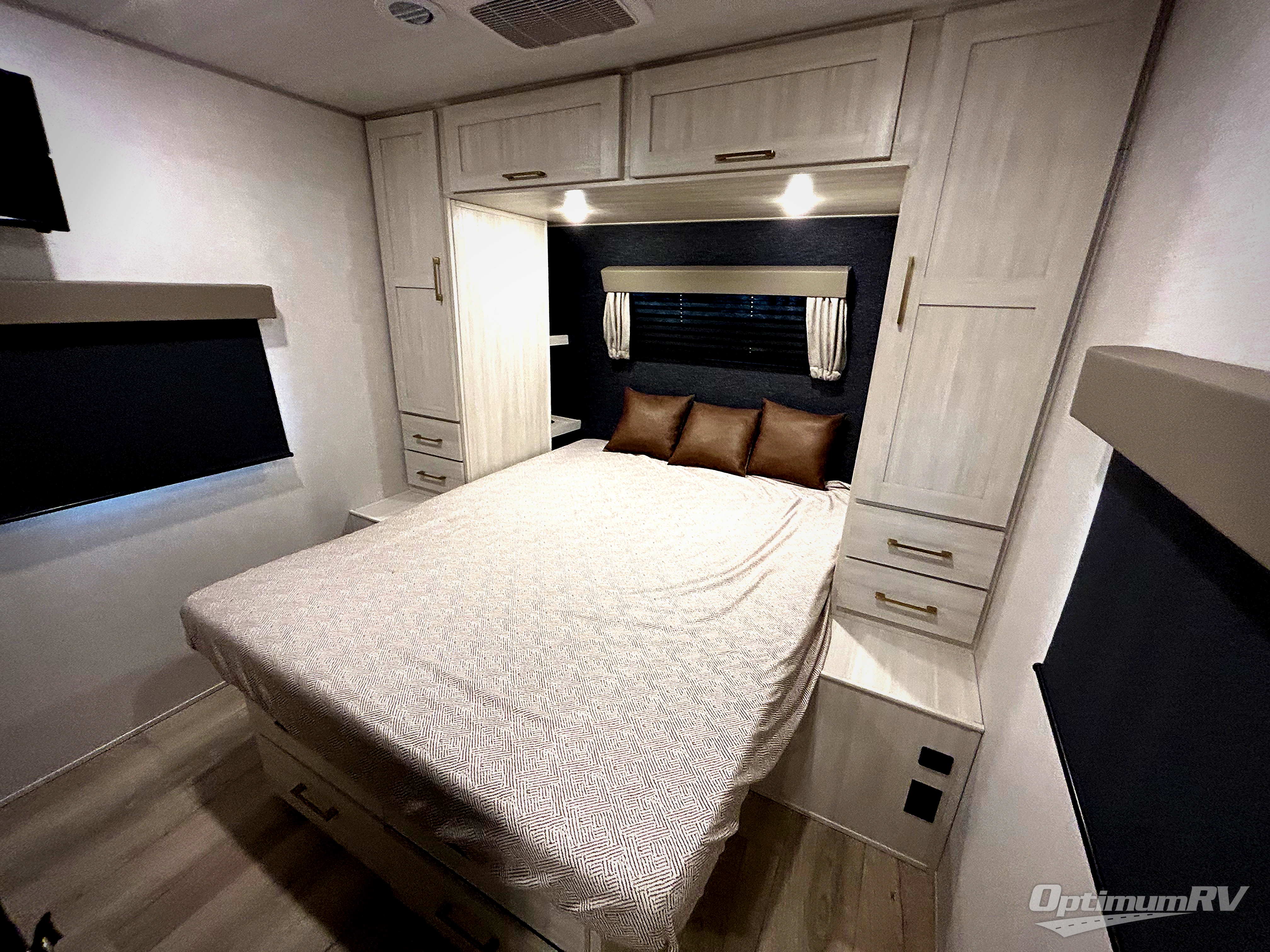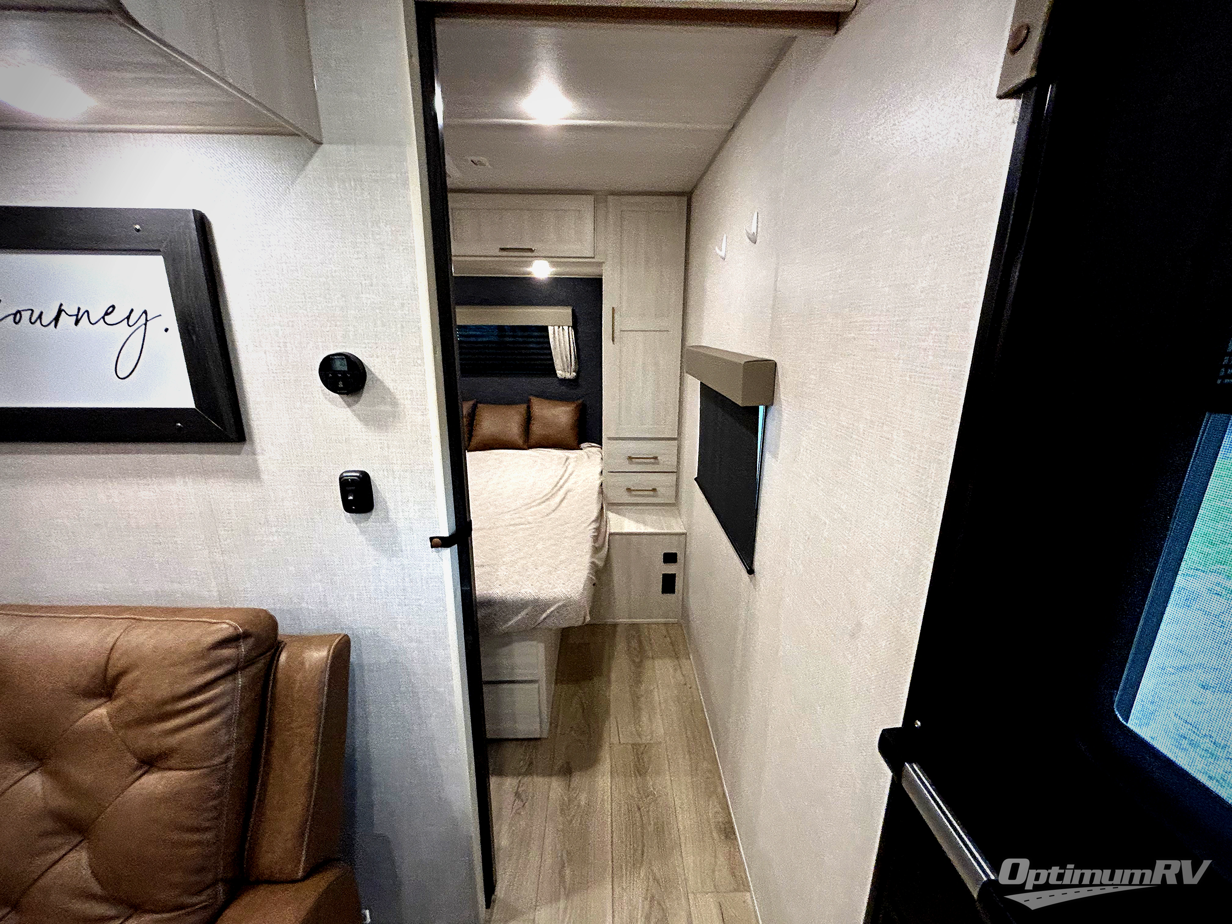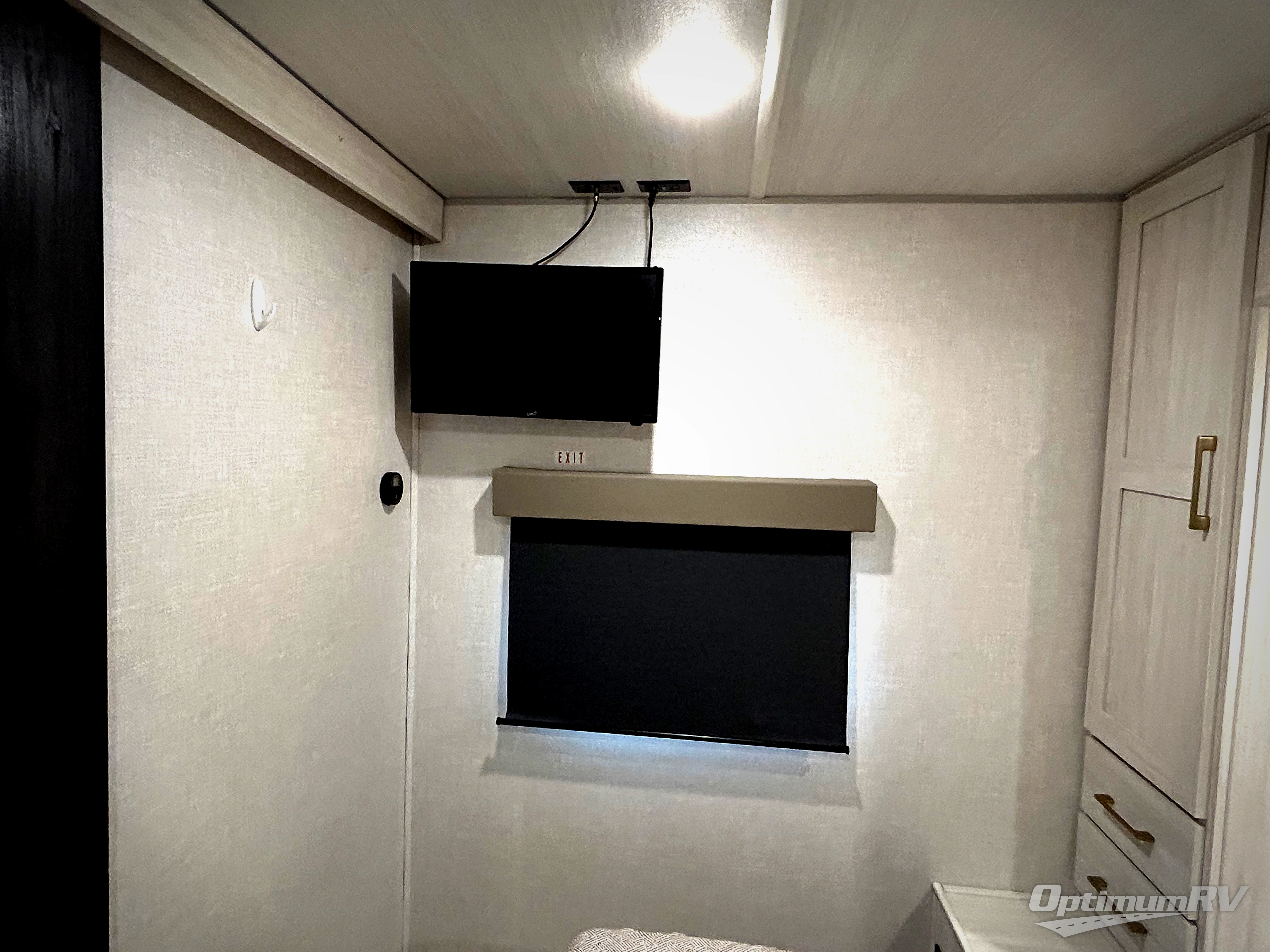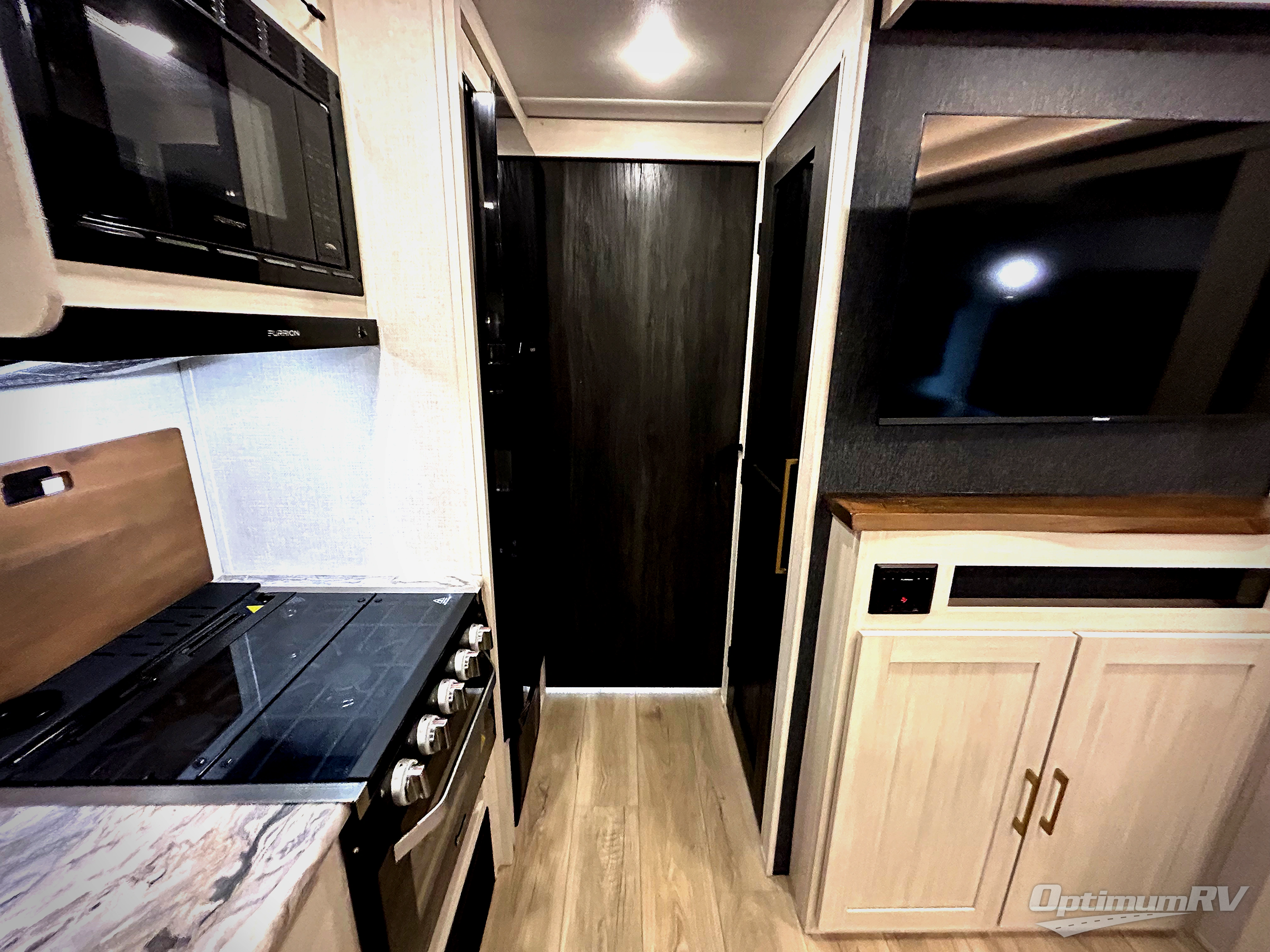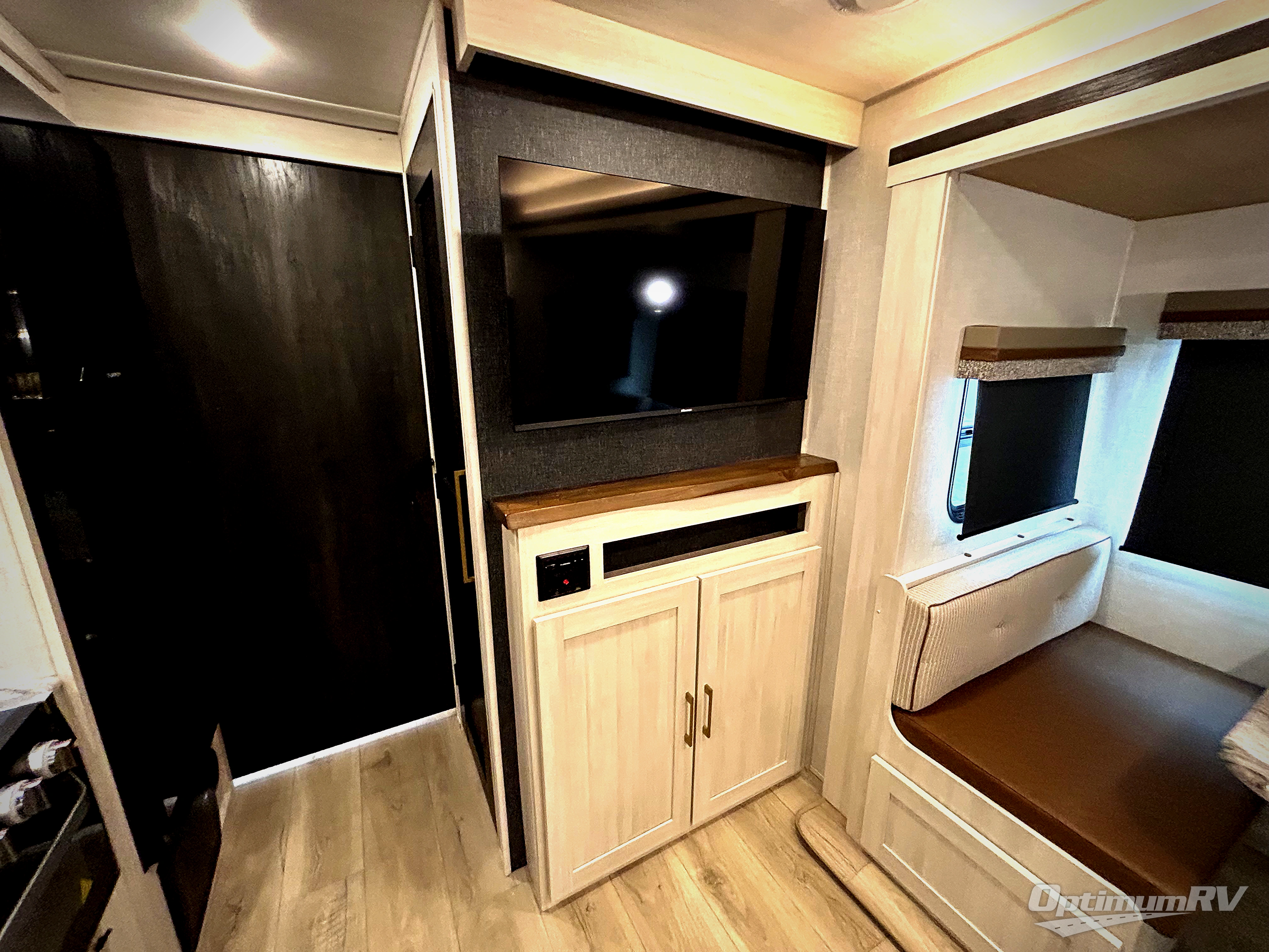 Whether you're camping with friends or family, you'll love the space and comfort found in this travel trailer. The outside kitchen is packed with features, such as a gas griddle, sink, refrigerator, and a shelf, plus there is a 21' electric awning for shade. Head inside to relax on the tri-fold sofa, or play a game at the booth dinette. You will also love the HD TV for your favorite shows at night. This model includes a full rear bath with a linen closet for clean towels and an upgraded slow-close shower door.