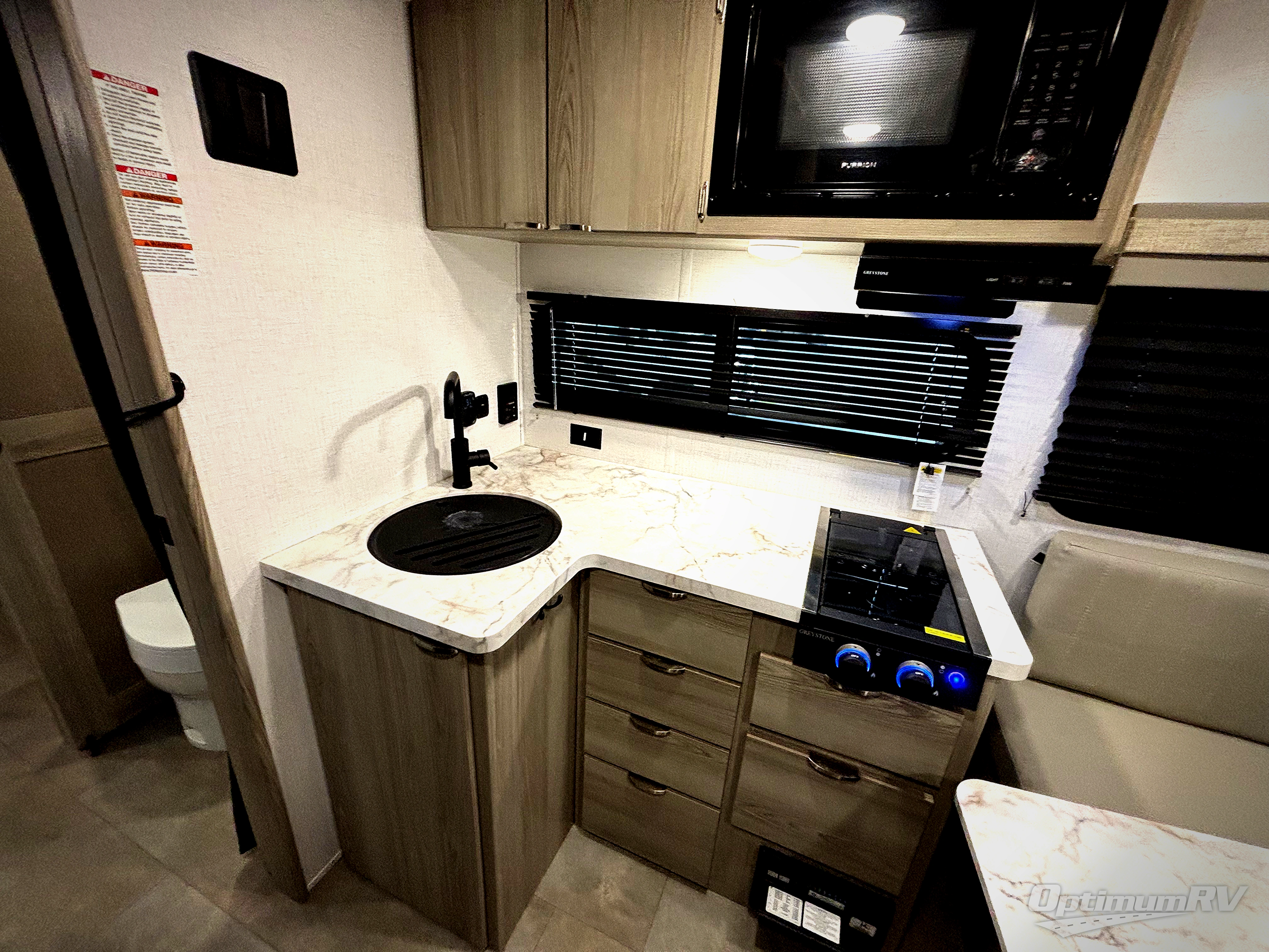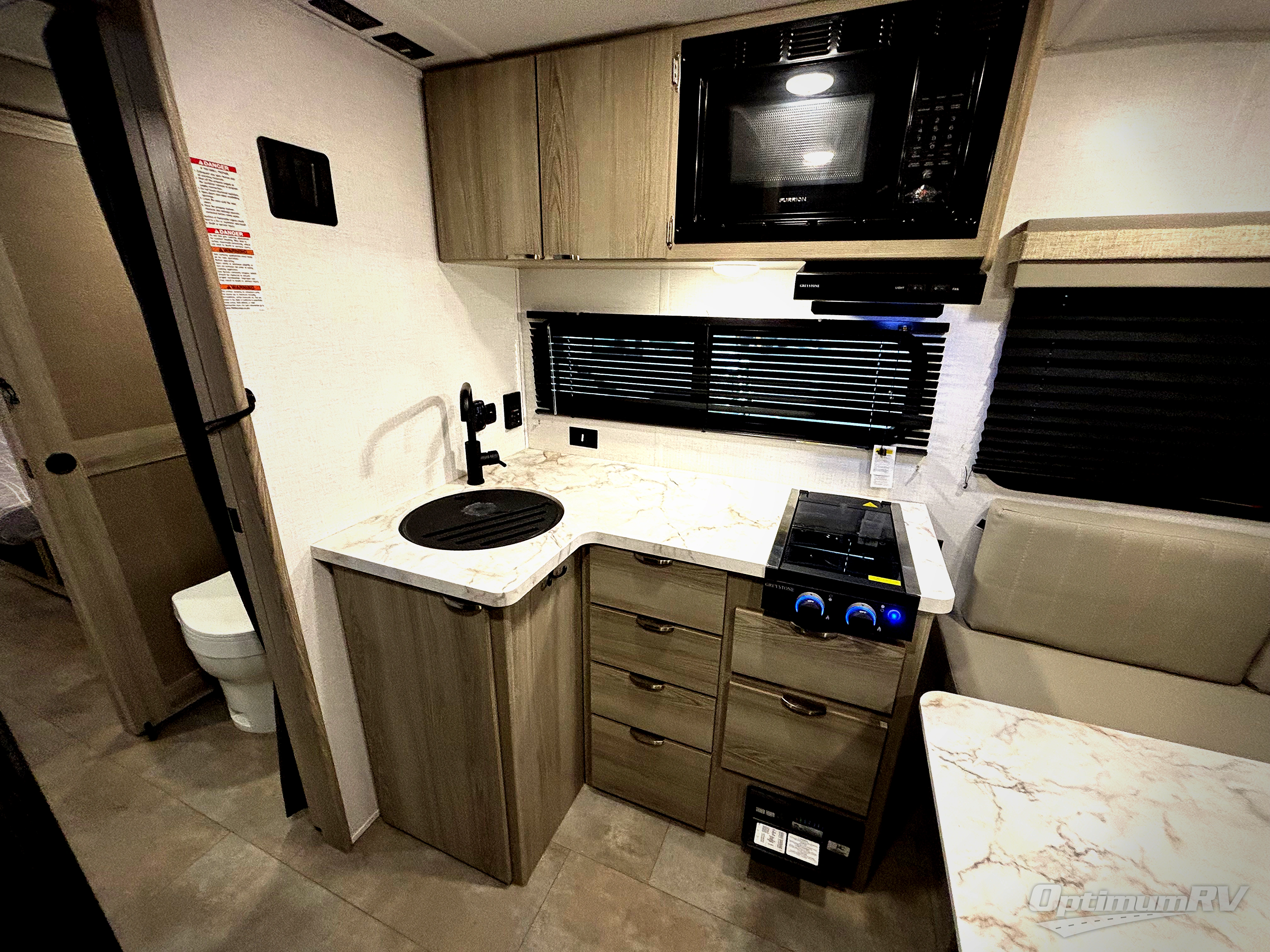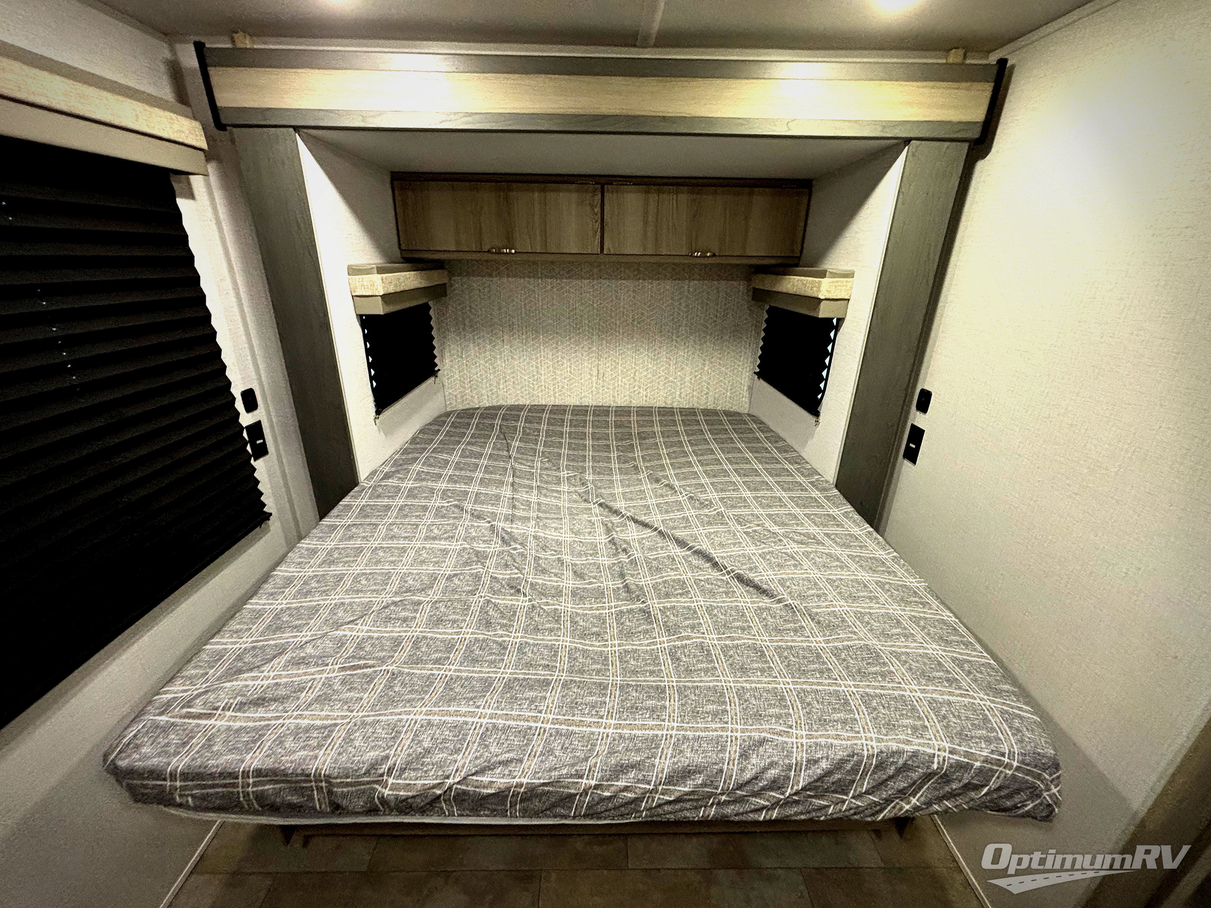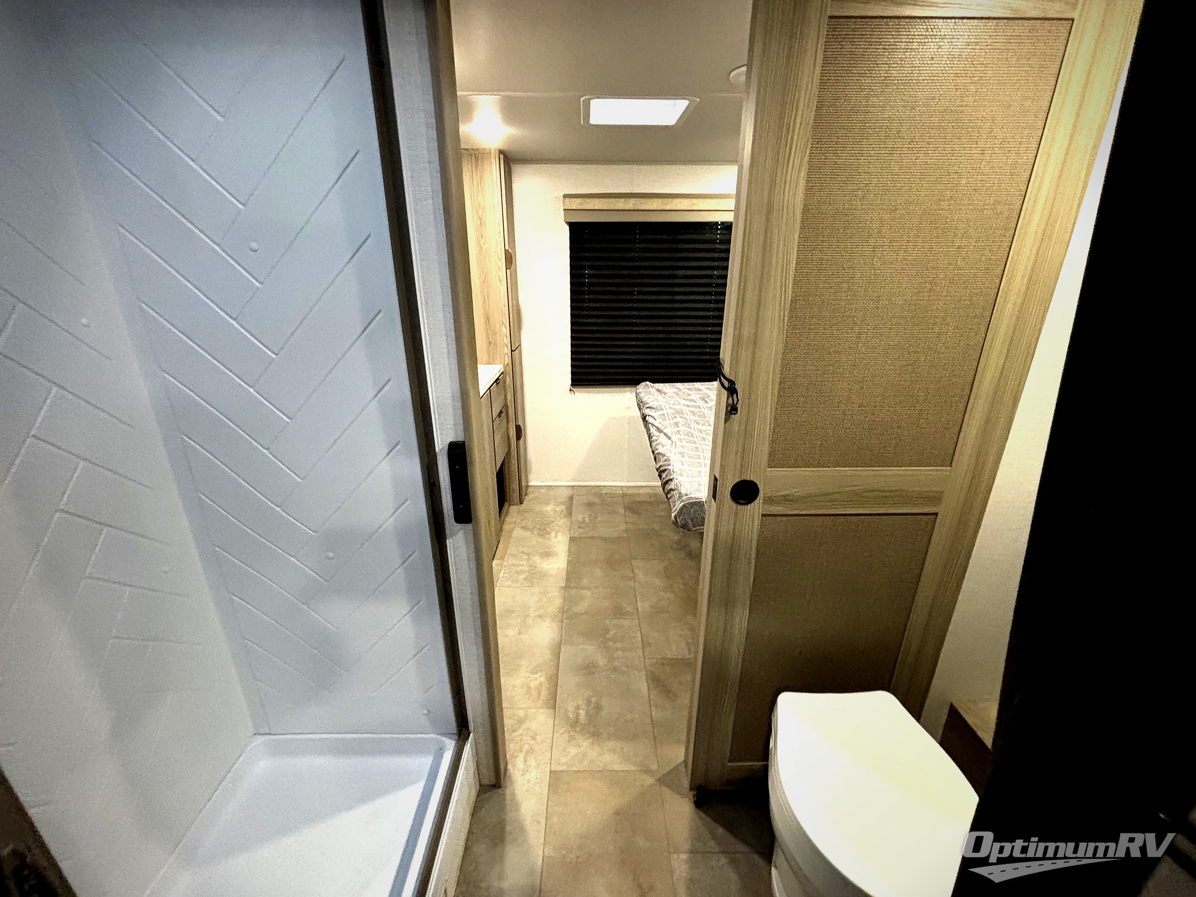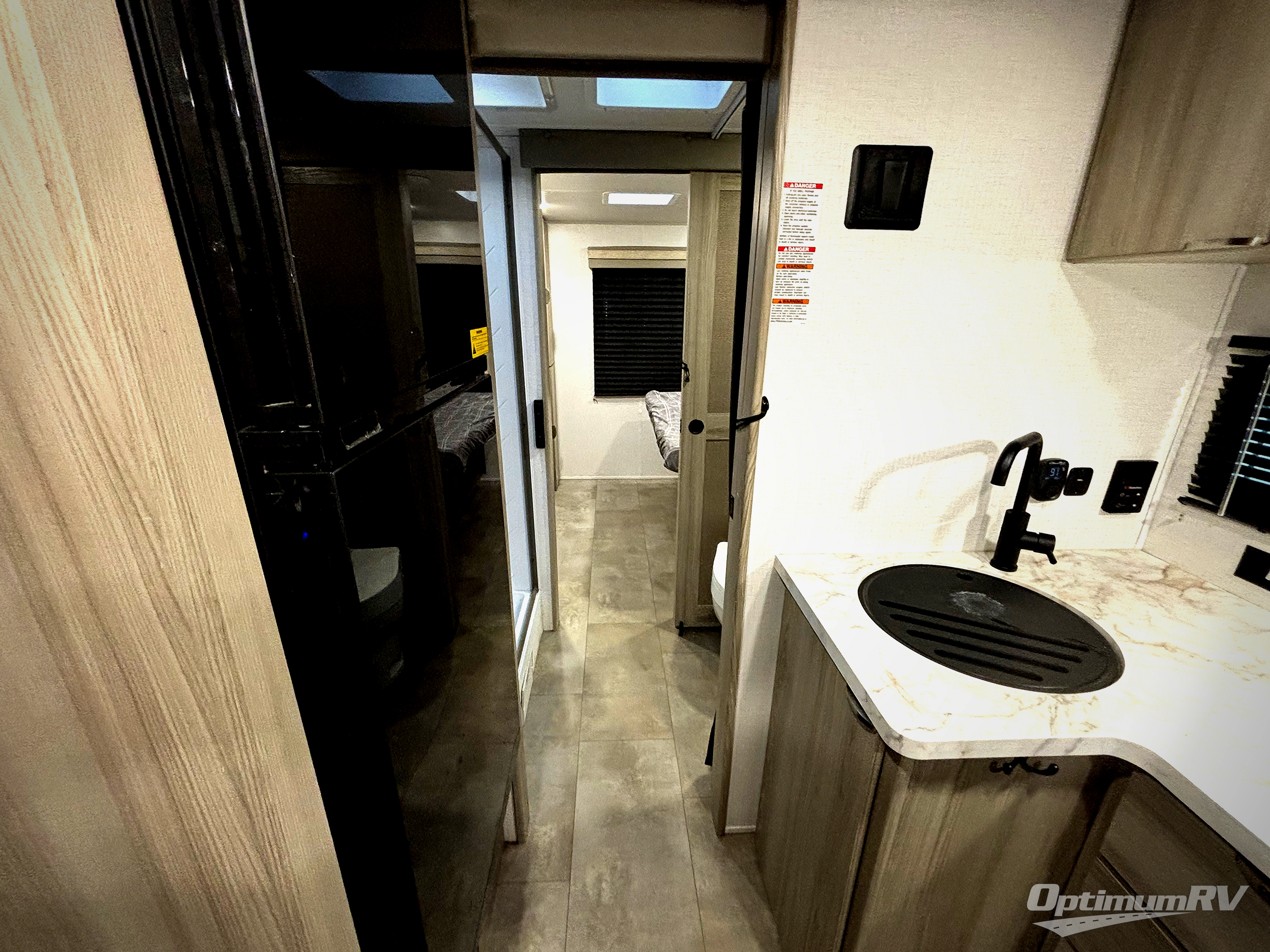 Adventure starts with this travel trailer in tow. Once you arrive at the campground, set up the 15' power awning with LED lights and fill the dog's water bowl using the hot/cold outside shower. Head inside to prepare lunch on the two burner cooktop, and you can dine together around the U-shaped dinette. This area can become your guests' sleeping space at night, while you enjoy the queen bed in the rear bedroom. There is a private toilet and sink, with the private shower right across the hall so two people can get ready for bed at the same time. How convenient!