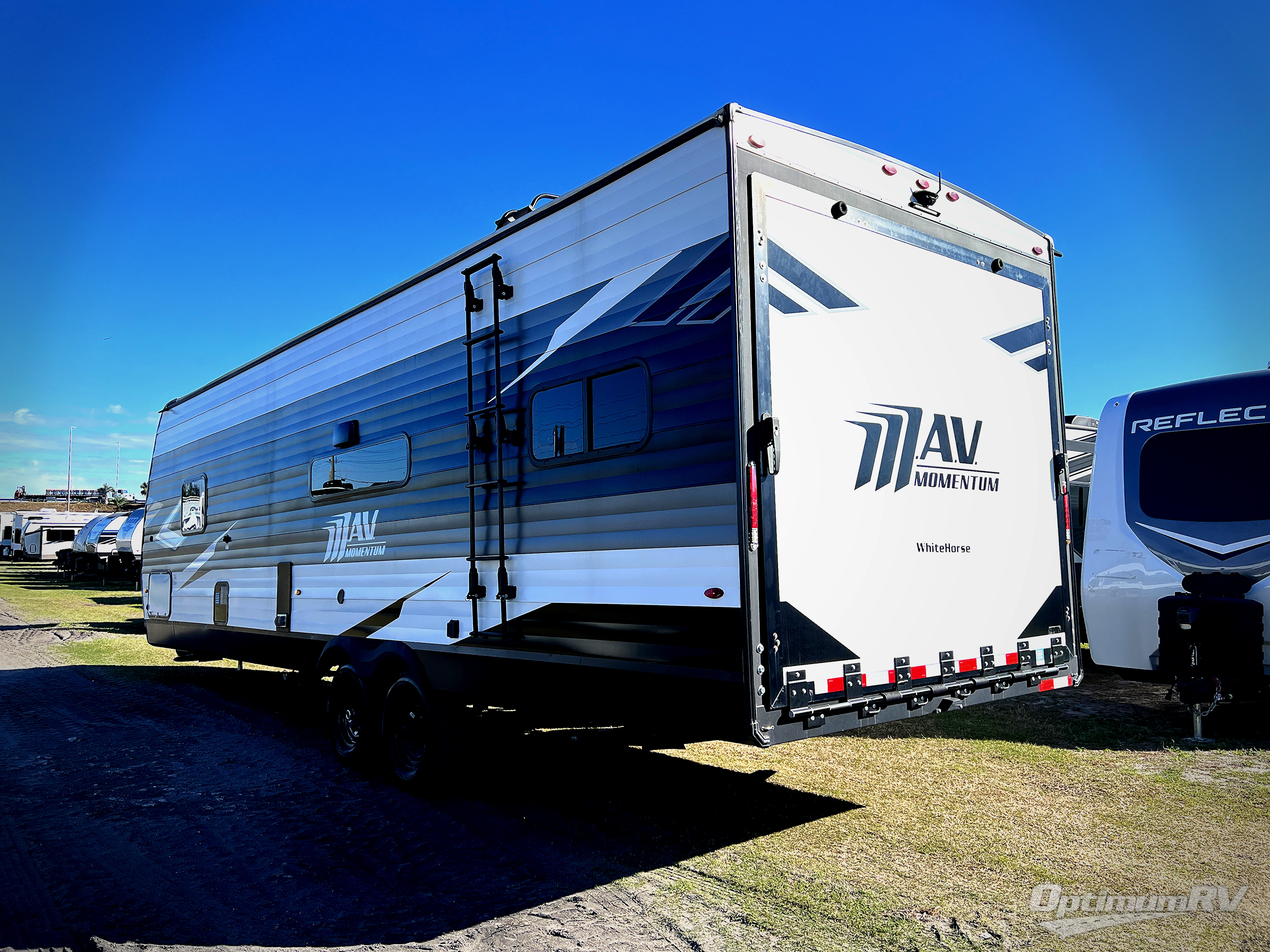 You will love this Momentum MAV toy hauler travel trailer! The front bedroom features a queen bed, and there is plenty of room to walk around. The sliding solid bedroom door helps with space. Overhead storage and a pair of nightstands are convenient storage, plus there is a wardrobe with both drawers and space to hang items. The kitchen offers a microwave, stainless steel sink, and an 8 cu. ft. 12V refrigerator. In the garage, you'll find rollover sofas with a table and a top bed for guests to sleep on. The ramp door/patio will provide additional living space once your toys are unloaded, and the pull down screen will keep bugs out!