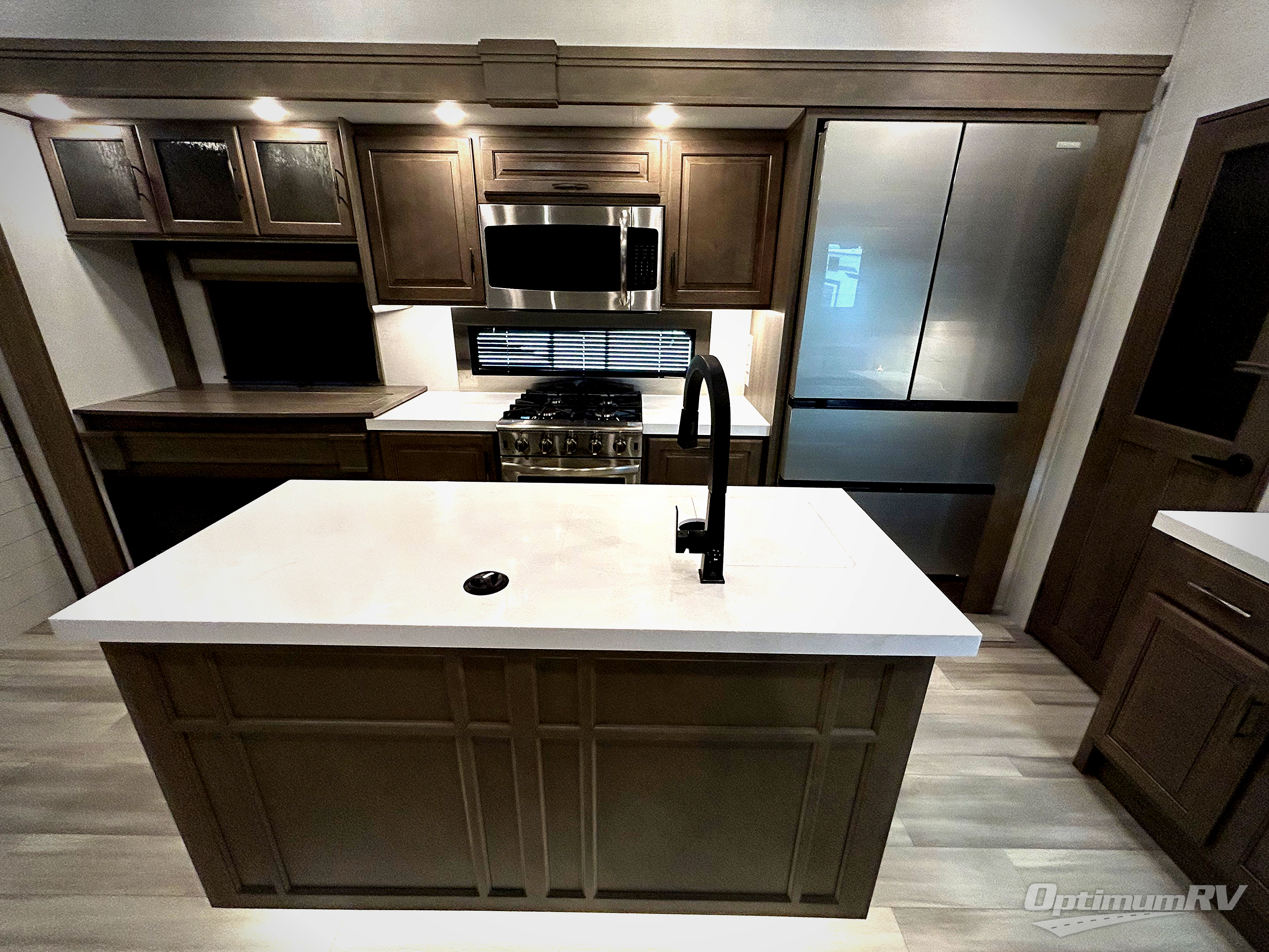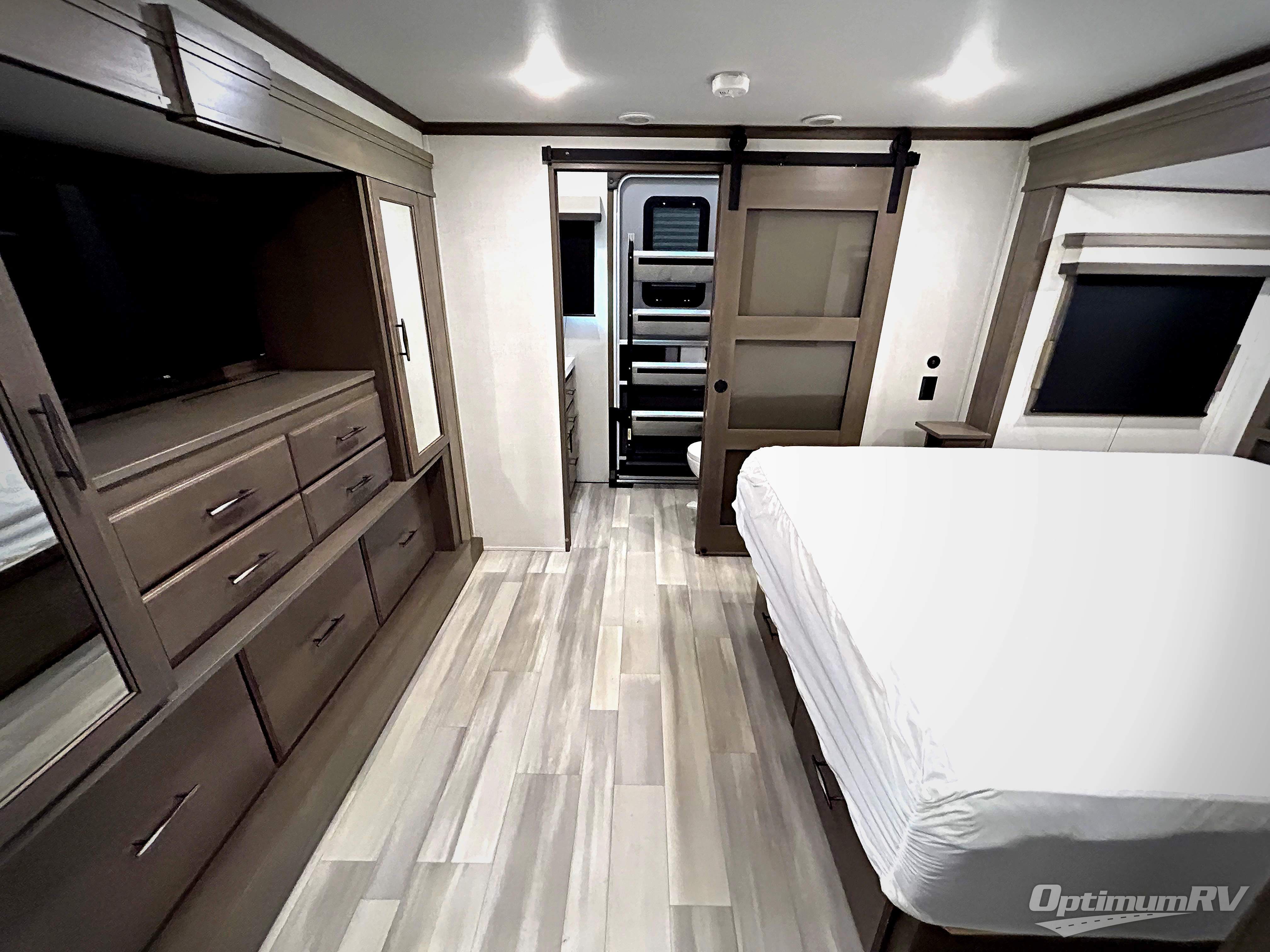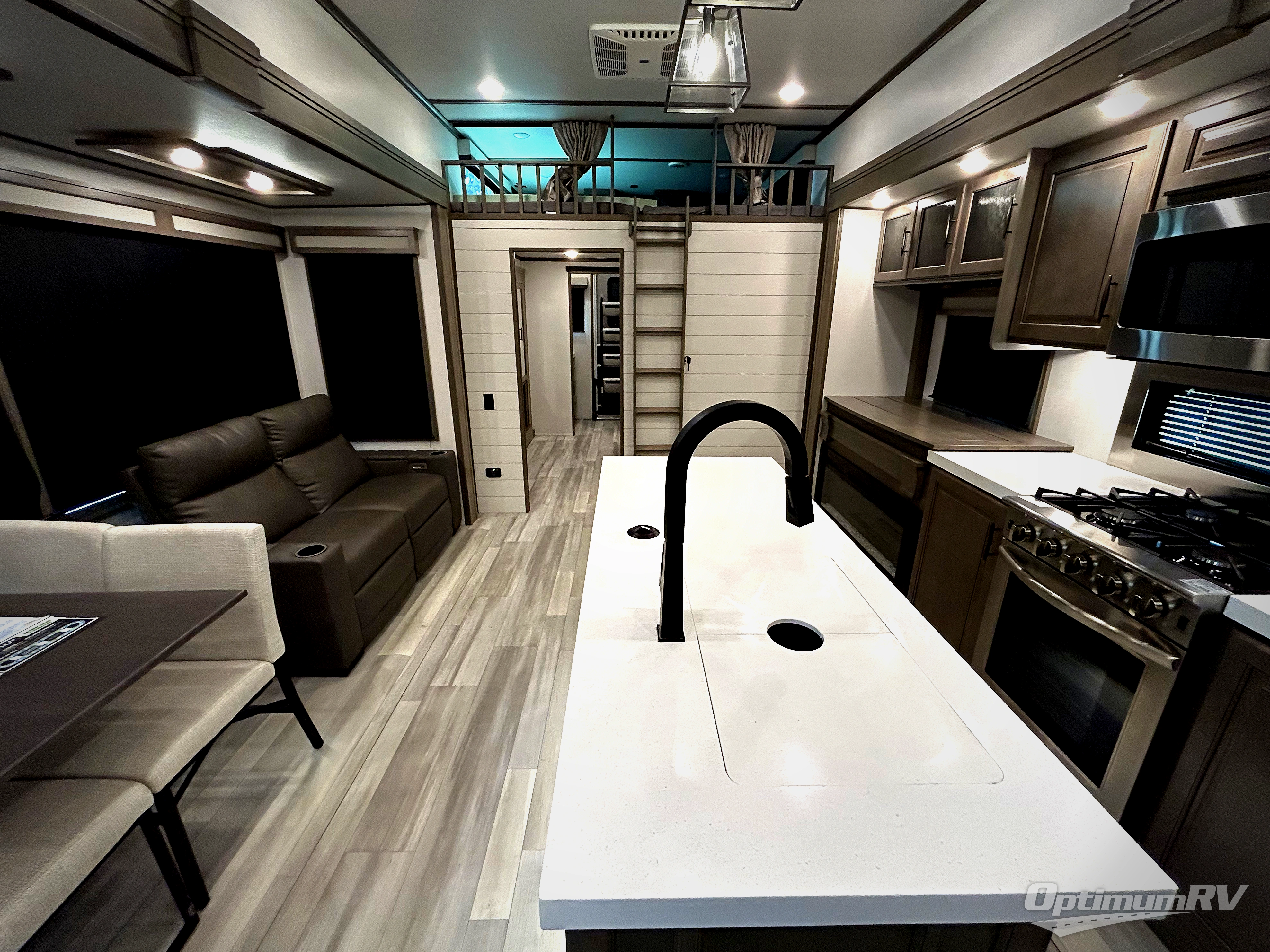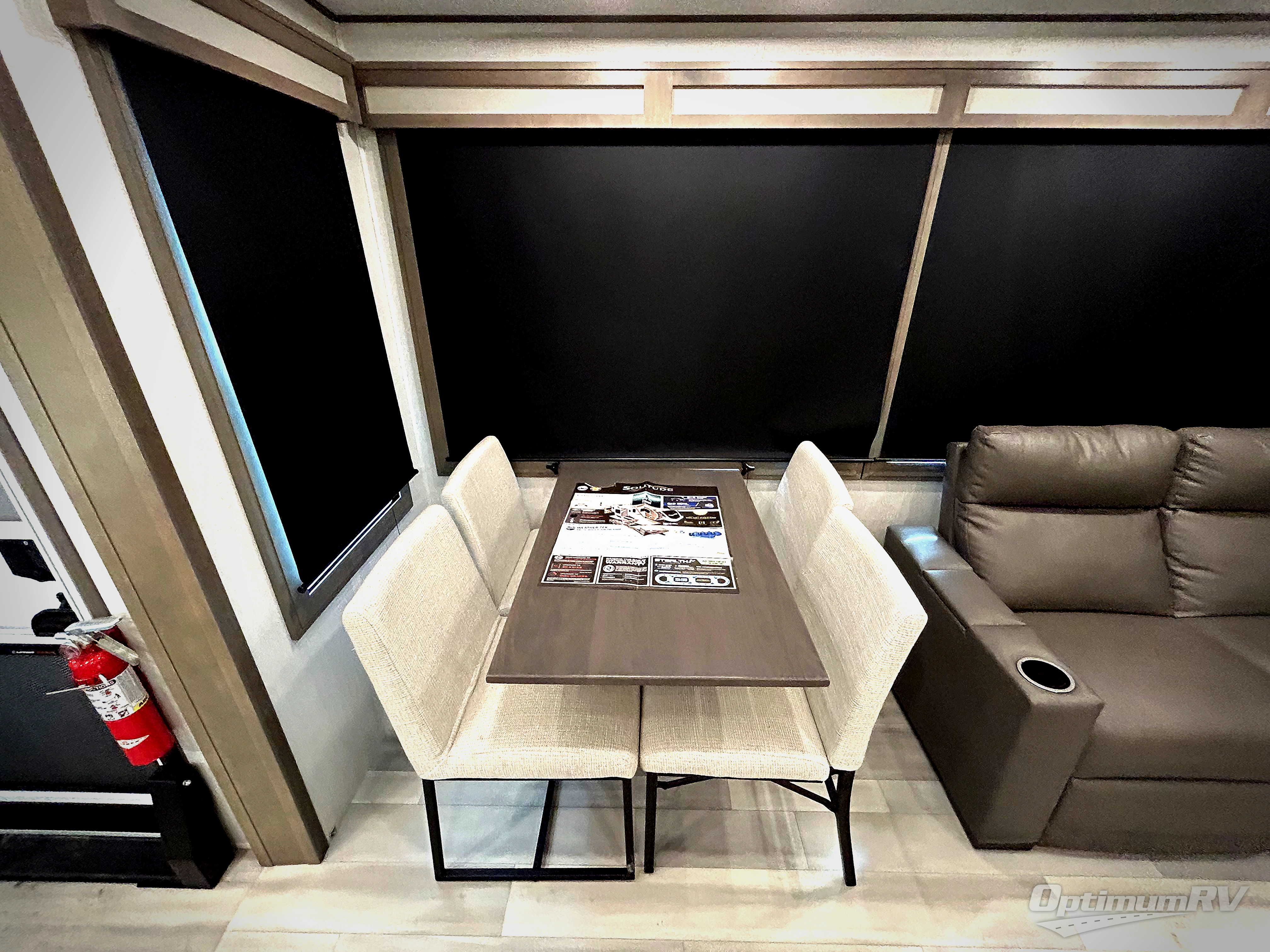 For an affordable luxury extended stay for your family, this Solitude is it! Two private bedrooms plus an overhead Sky Suite loft above the rear bedroom which also has it's own private rear entry/exit door is just the beginning of what is in store for your camping convenience. You will love the spacious feel that the Solitude provides with taller ceilings, larger scenic windows, and an interior width of 8' 5", not to mention FIVE slides in this unit alone. You may not even want to go home once you get a look inside. The upscale kitchen features an island with dishwasher prep, a large single bowl sink, a 12V 20 cu. ft. refrigerator for your perishables, and a 24" residential oven, not to mention you will also enjoy a microwave, pantry, and hutch for your dishes, plus a free standing dinette! You can easily take along extra family and friends with the second private bedroom featuring it's own private bath and entry which is great for another couple, and there is even loft space above this rear private bedroom for added storage or sleeping for children. Both bathrooms feature a shower with a skylight, vanity and sink, plus a toilet. And, you will find ample storage for clothing and belongings throughout with nice size closets, overhead cabinets, plus loads of outside storage. Speaking of outside, this unit features a spray port for rinsing off before heading inside, two awnings, a USB charging outlet, and four step aluminum shock assist entry steps at both entrances.