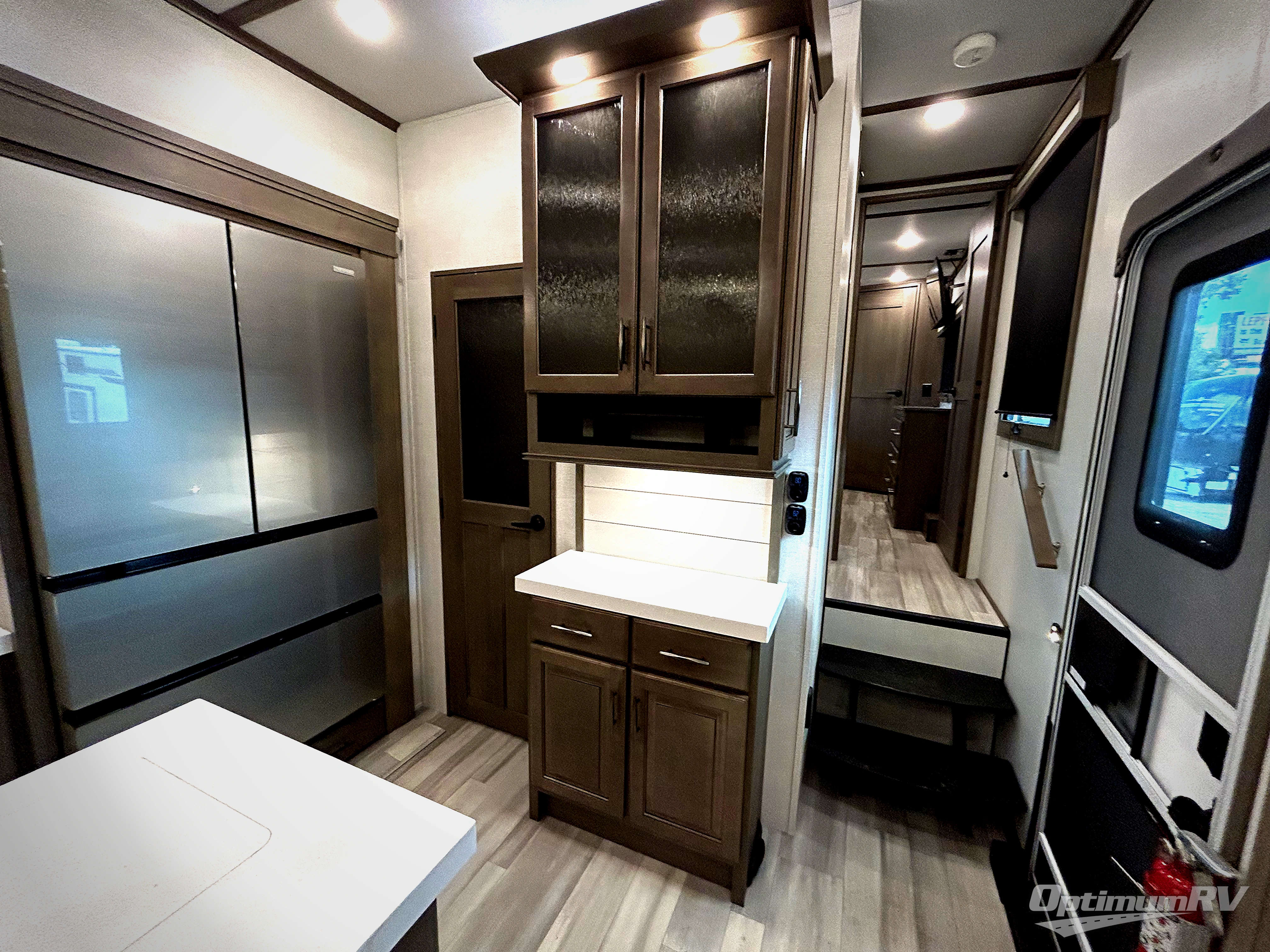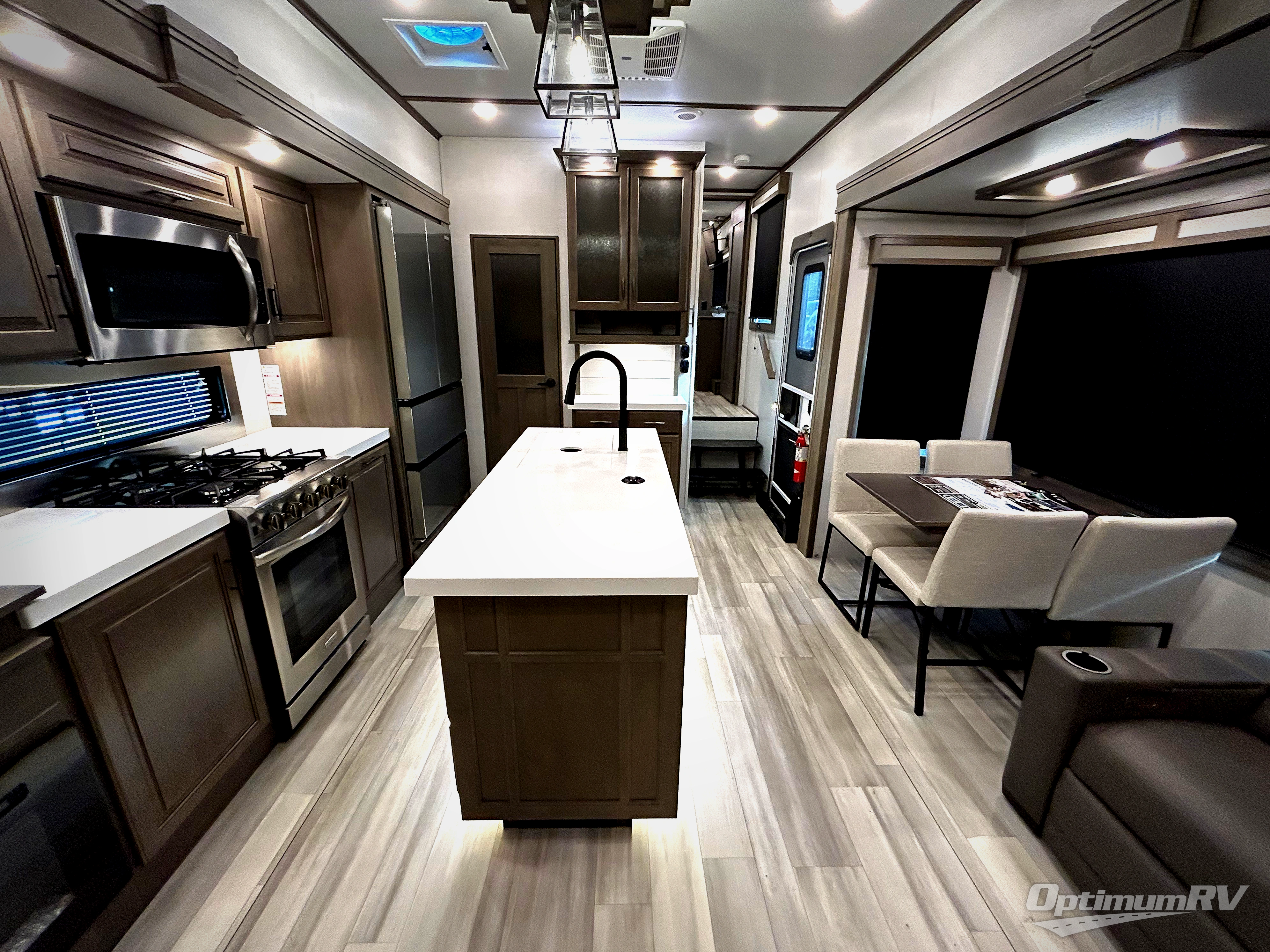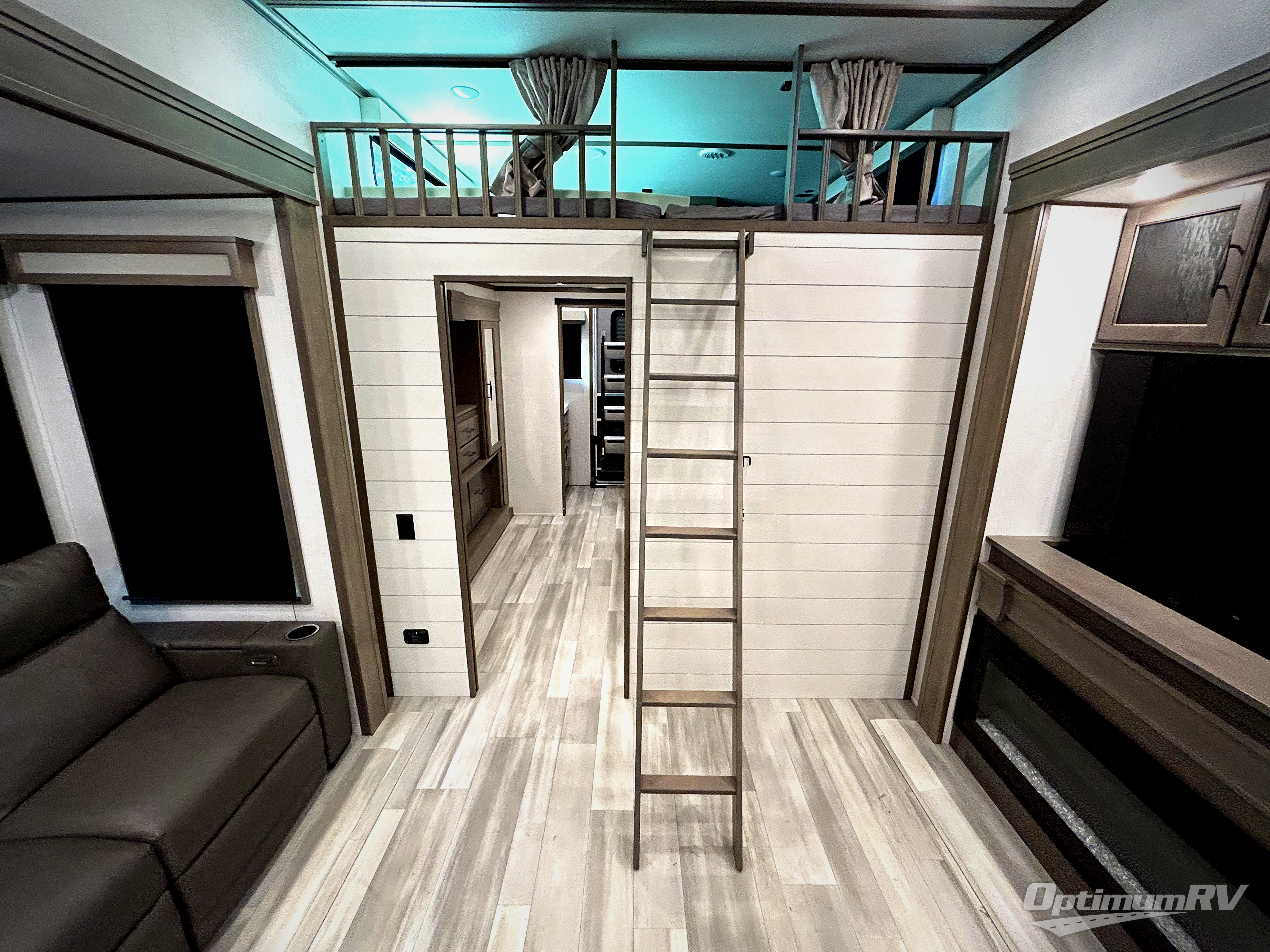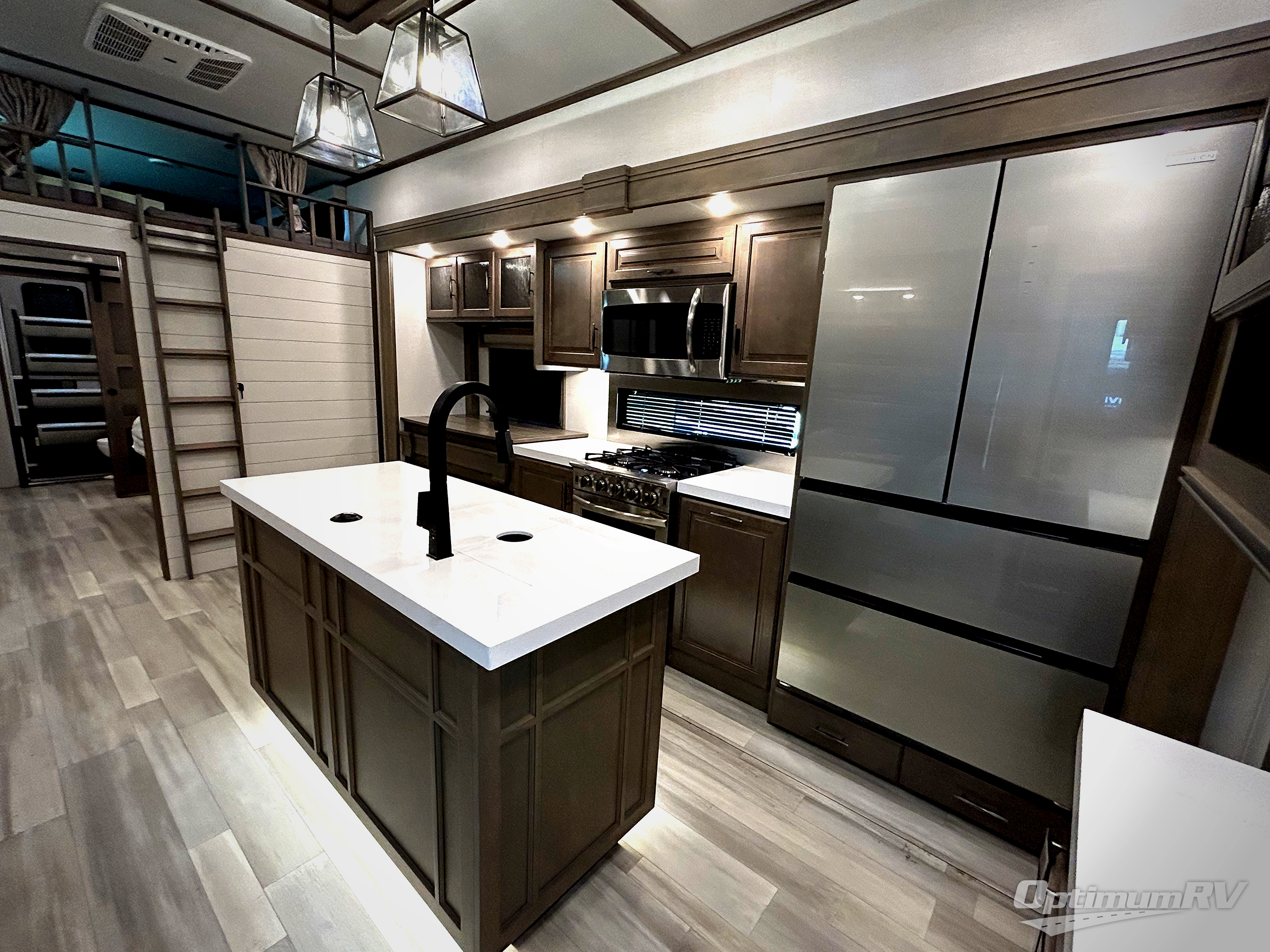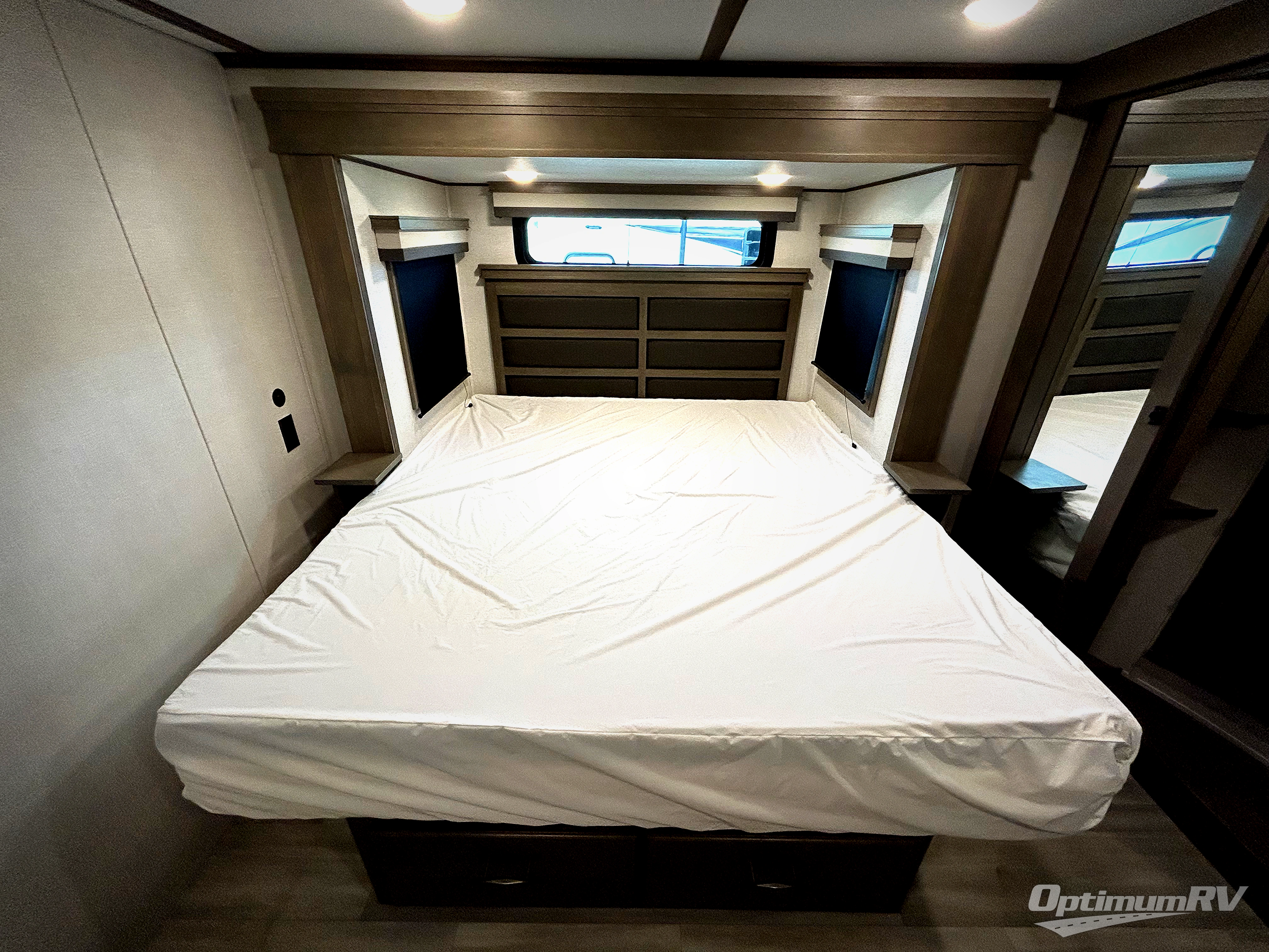 For an affordable luxury extended stay for your family, this Solitude is it! Two private bedrooms plus an overhead Sky Suite loft above the rear bedroom which also has it's own private rear entry/exit door is just the beginning of what is in store for your camping convenience. You will love the spacious feel that the Solitude provides with taller ceilings, larger scenic windows, and an interior width of 8' 5", not to mention FIVE slides in this unit alone. You may not even want to go home once you get a look inside. The upscale kitchen features an island with dishwasher prep, a large single bowl sink, a 12V 20 cu. ft. refrigerator for your perishables, and a 24" residential oven, not to mention you will also enjoy a microwave, pantry, and hutch for your dishes, plus a free standing dinette! You can easily take along extra family and friends with the second private bedroom featuring it's own private bath and entry which is great for another couple, and there is even loft space above this rear private bedroom for added storage or sleeping for children. Both bathrooms feature a shower with a skylight, vanity and sink, plus a toilet. And, you will find ample storage for clothing and belongings throughout with nice size closets, overhead cabinets, plus loads of outside storage. Speaking of outside, this unit features a spray port for rinsing off before heading inside, two awnings, a USB charging outlet, and four step aluminum shock assist entry steps at both entrances.