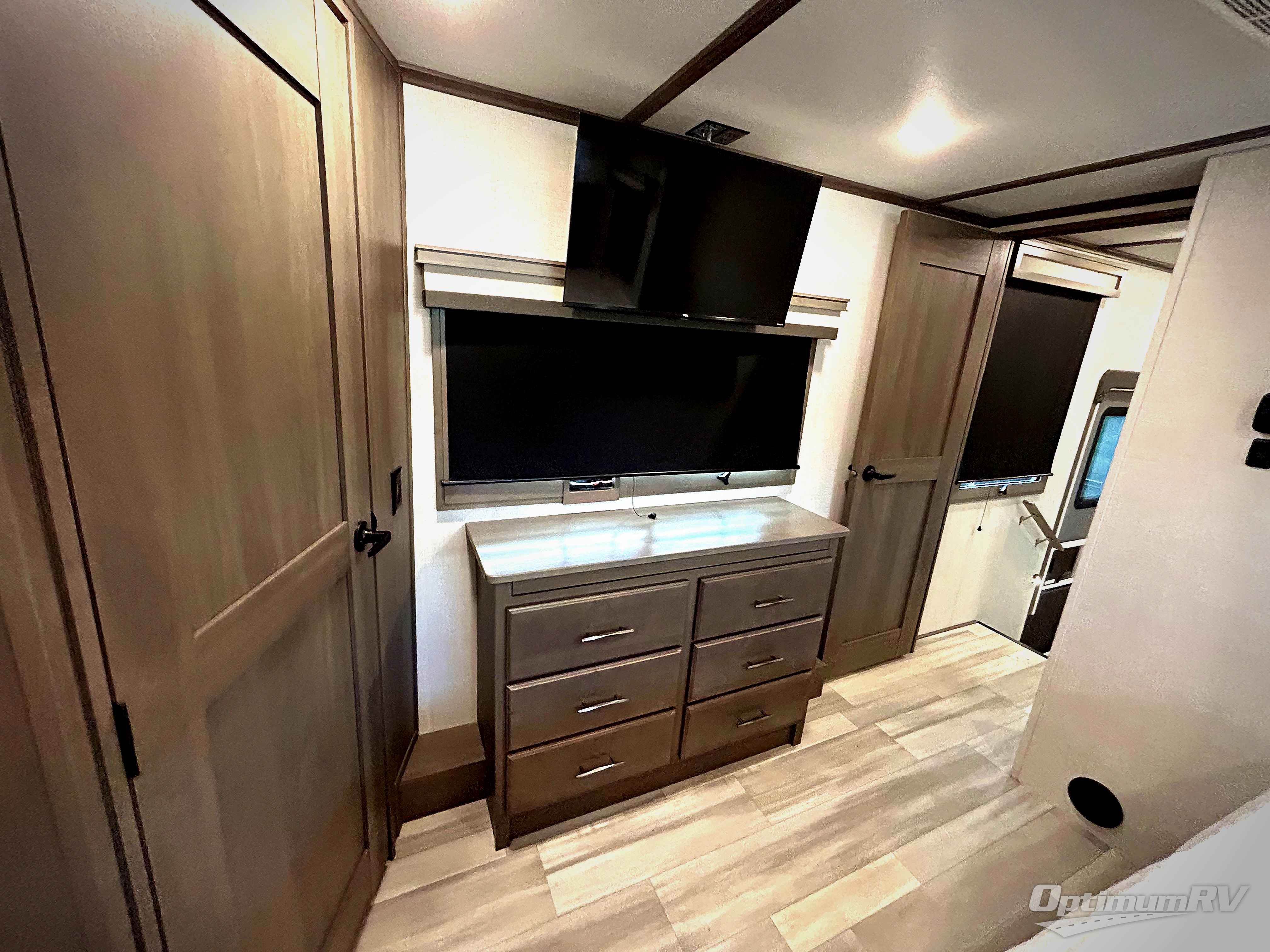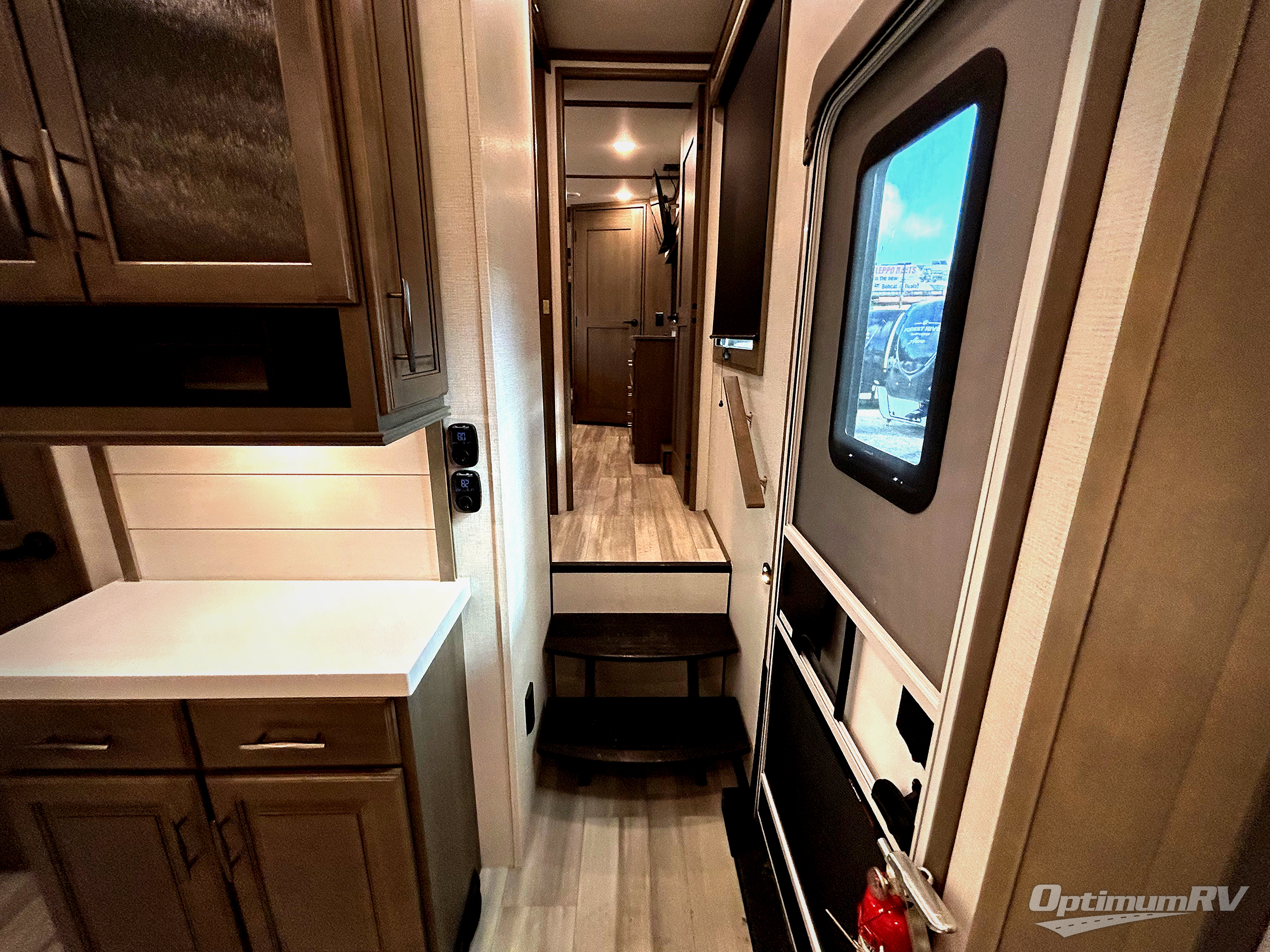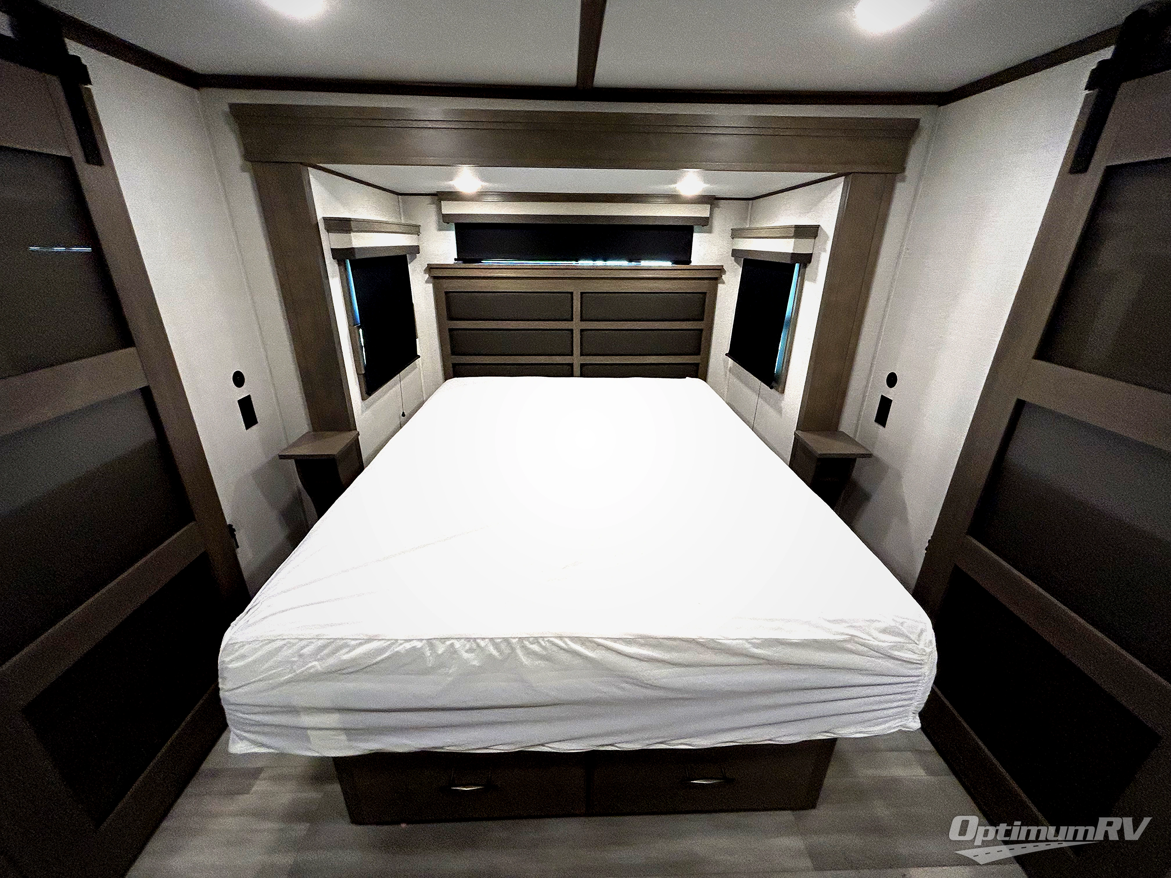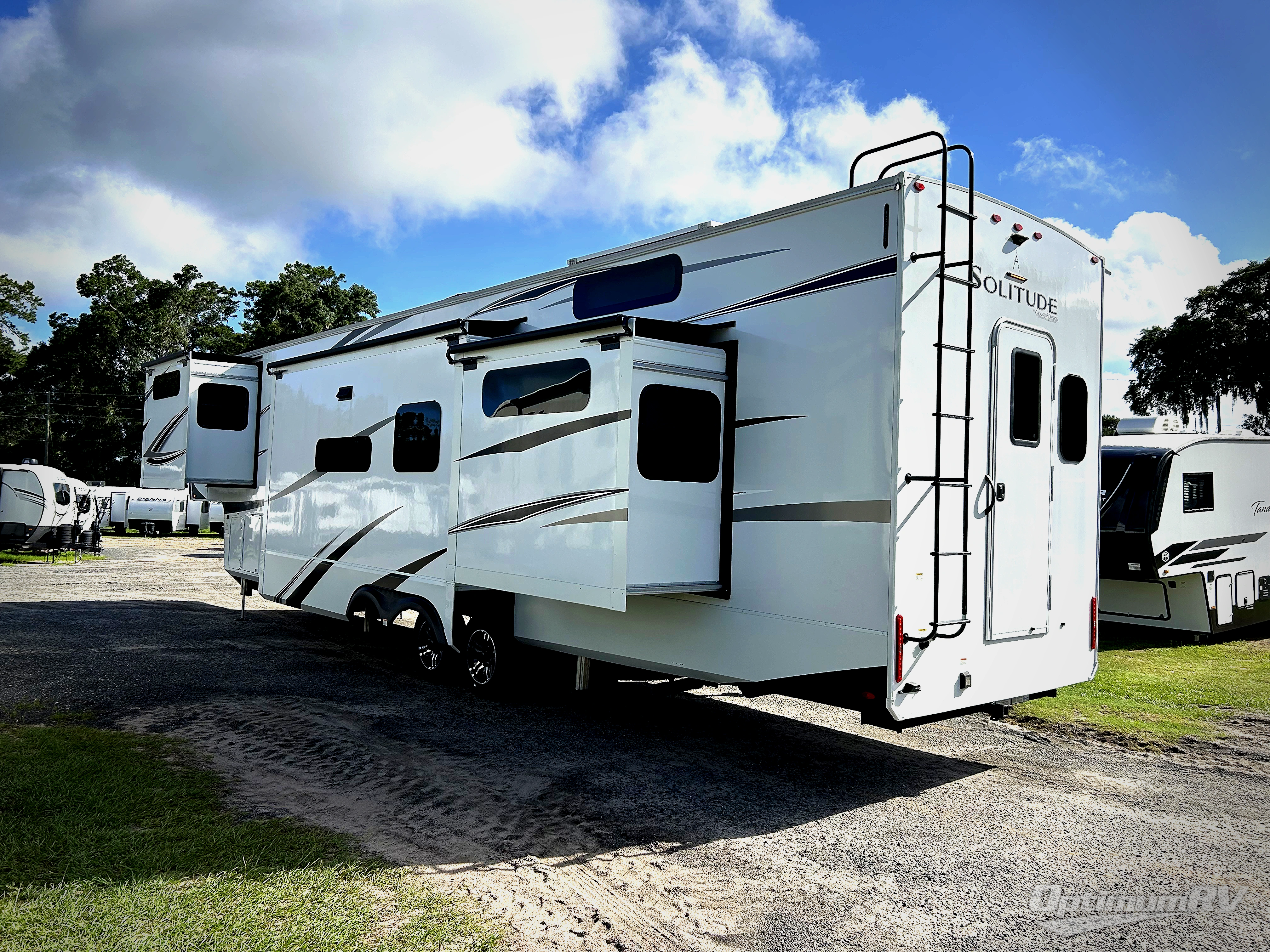 Each Solitude fifth wheel by Grand Design features a 101" wide-body construction, heavy duty 7,000 lb. axles, frameless tinted windows, and high-gloss gel coat sidewalls. You can camp year around thanks to the Weather-Tek Package that includes a 35K BTU high-capacity furnace, an all-in-one enclosed and heated utility center, and a fully enclosed underbelly with heated tanks and storage. Inside, you'll love the premium roller shades, hardwood cabinet doors, solid surface countertops and sinks, plus residential finishes throughout to make you truly feel at home. Each model also includes a MORryde CRE3000 suspension system, self adjusting brakes, and a MORryde pin box that will provide smooth towing from home to campground. Affordable luxury is possible with the Solitude fifth wheels; choose yours today!