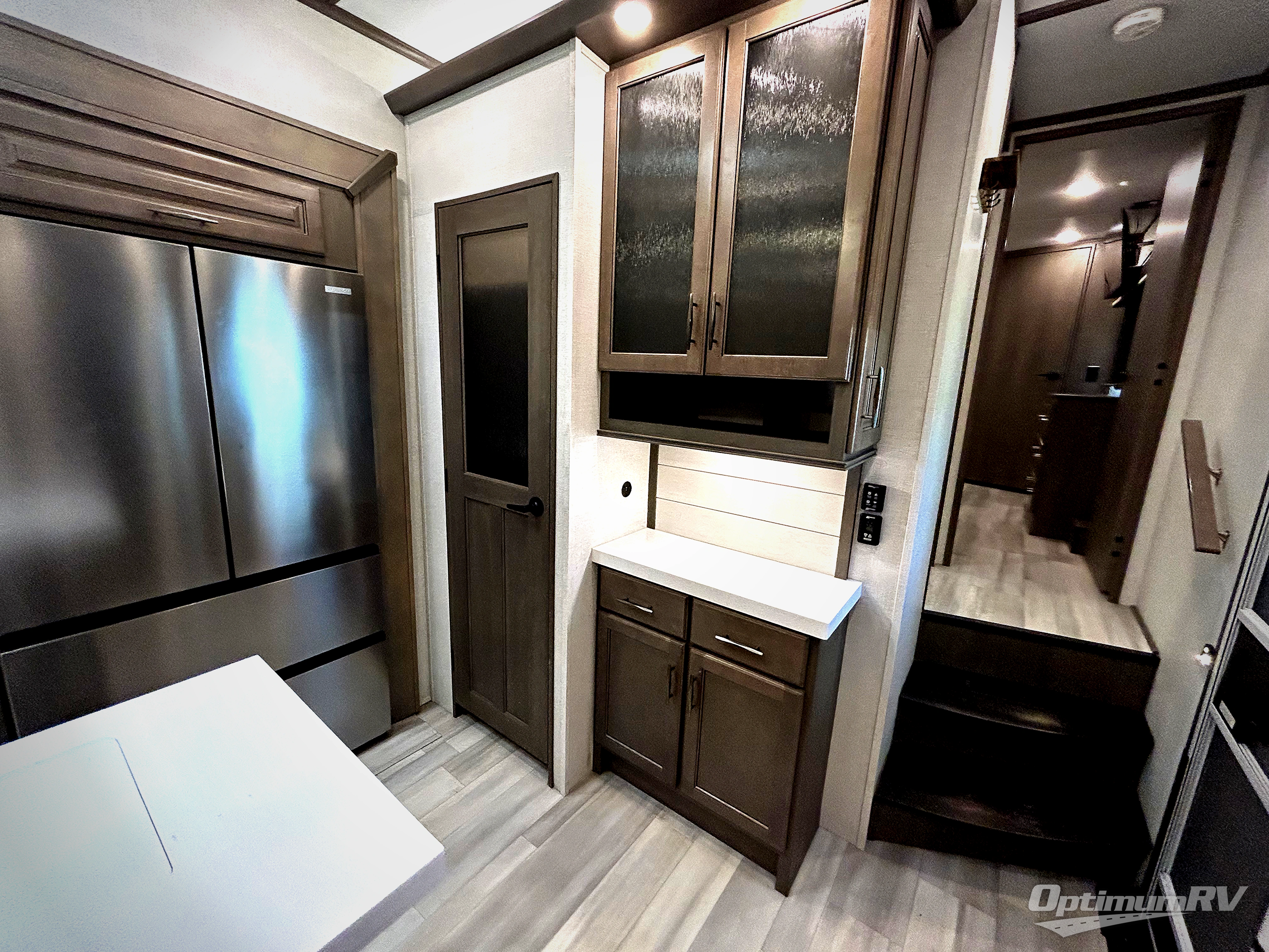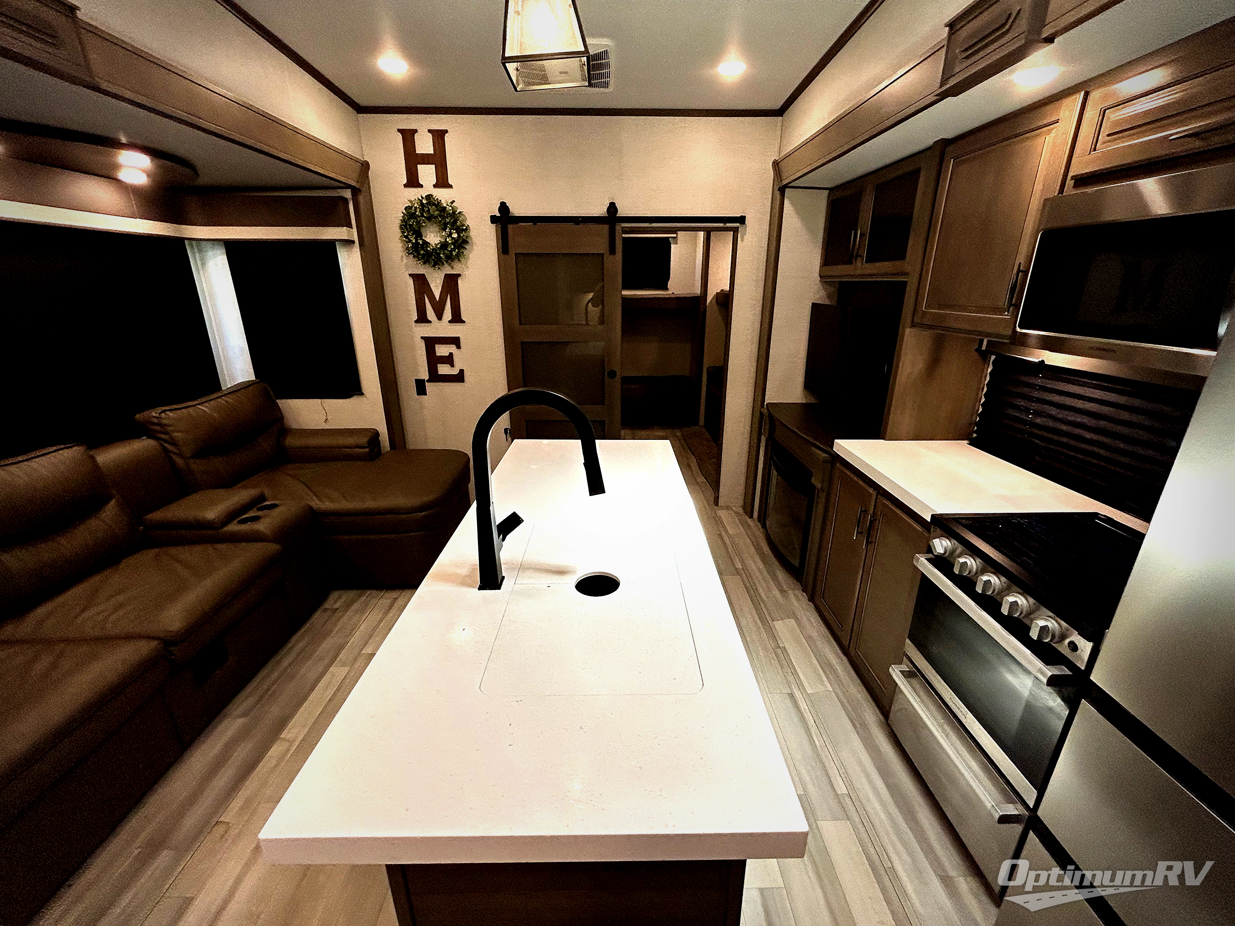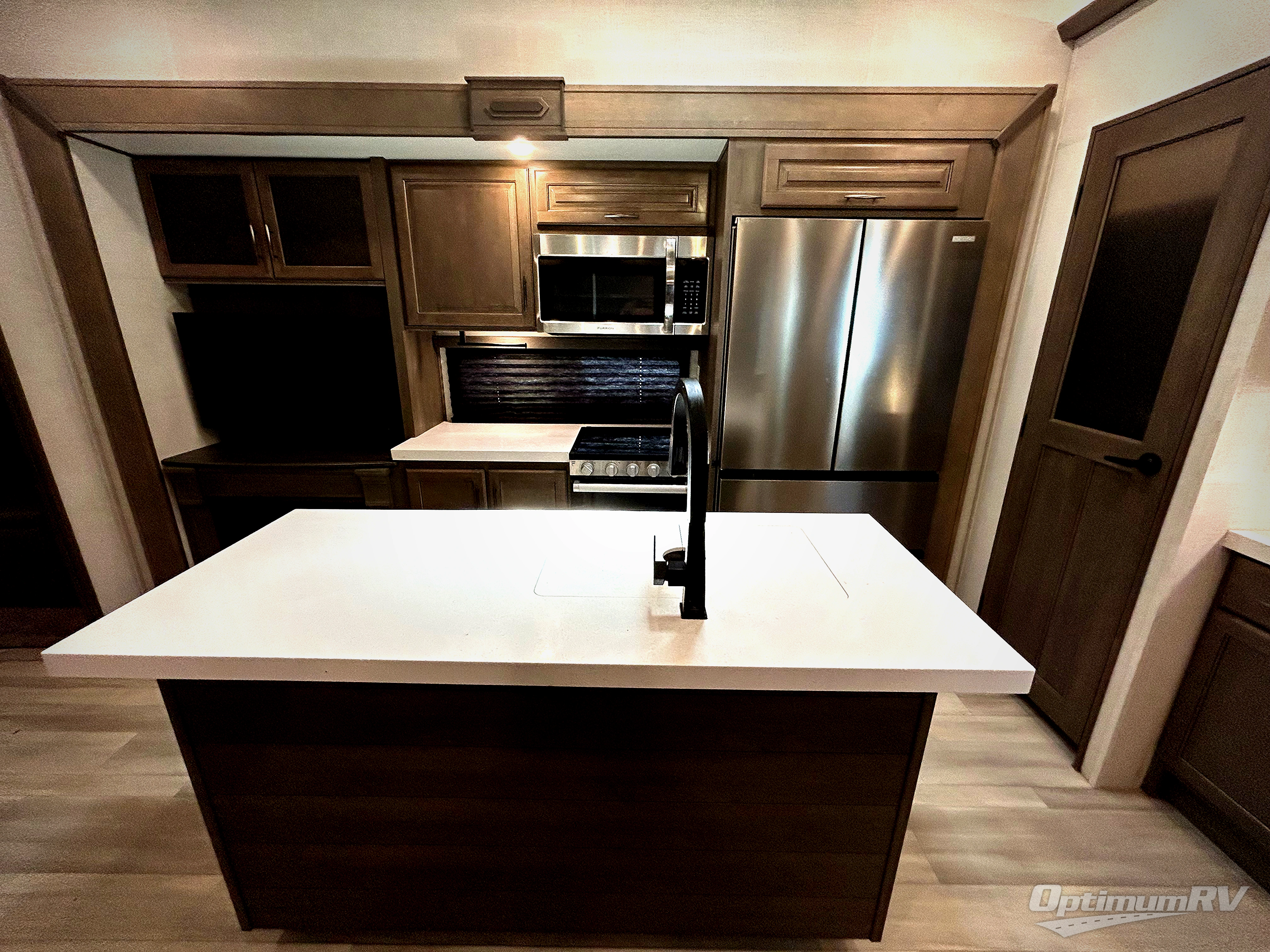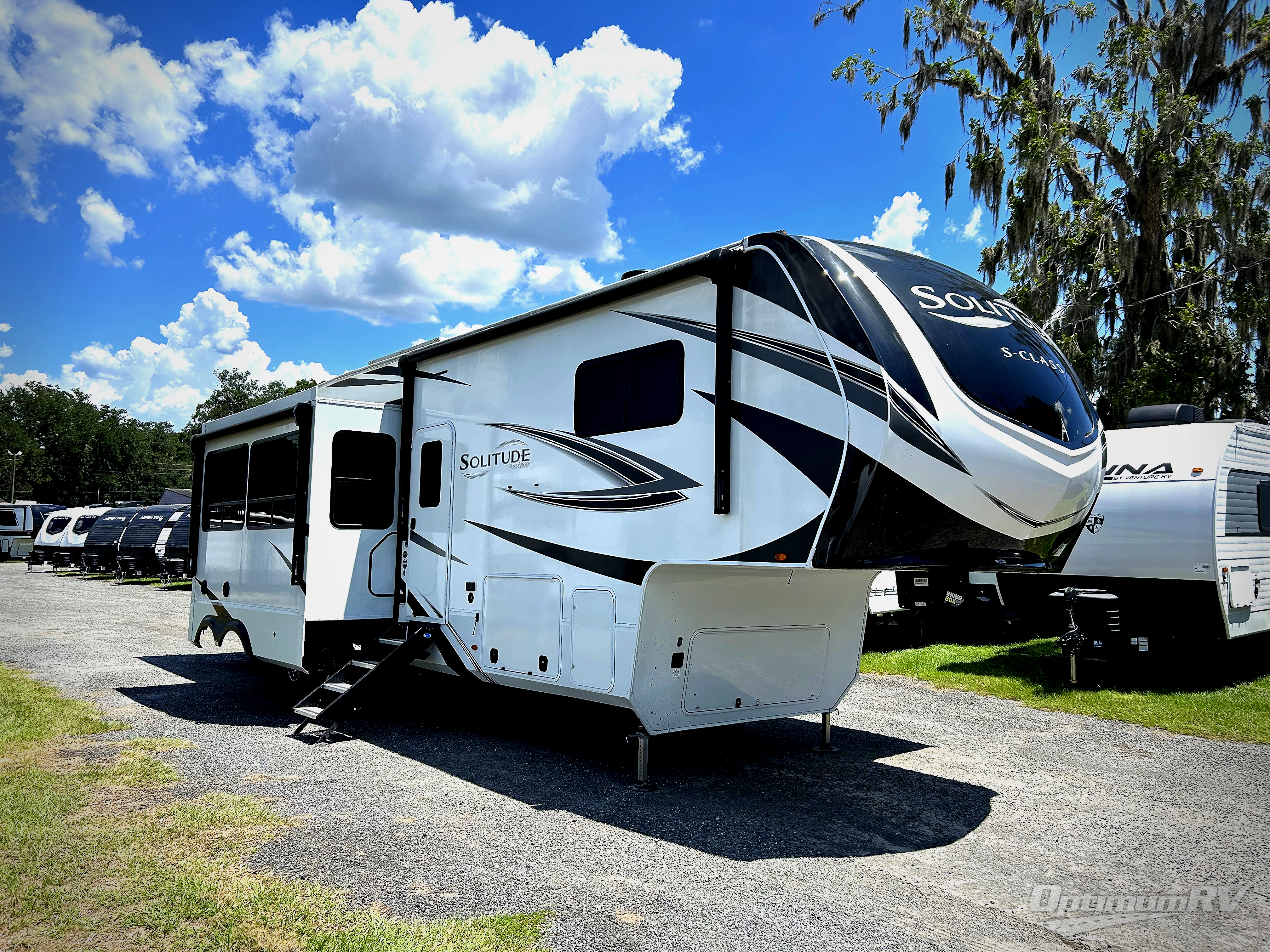 With any Solitude S-Class fifth wheel by Grand Design you will appreciate the Max Built Construction Package that features a 101" wide-body, gel coat exterior sidewalls, heavy-duty 7,000 lb. axles, plus many more durable construction materials. The self-adjusting brakes and the MORryde CRE3000 suspension system will provide a smooth towing experience, and each model includes heavy duty 17.5" H-rated tires with NitroFill. Some of the features you are sure to love are included in the Residential Living Package, like the solid surface countertops and sink covers, the hardwood cabinet doors, the night stands with USB ports, and the Rockford Fosgate stereo entertainment system with HDMI and App controls. These fifth wheels are extended-stay approved thanks to the Weather-Tek Package with a 35,000 BTU high-capacity furnace, the Stealth A/C system, and many high-end residential finishes to make you feel like you taken home with you!