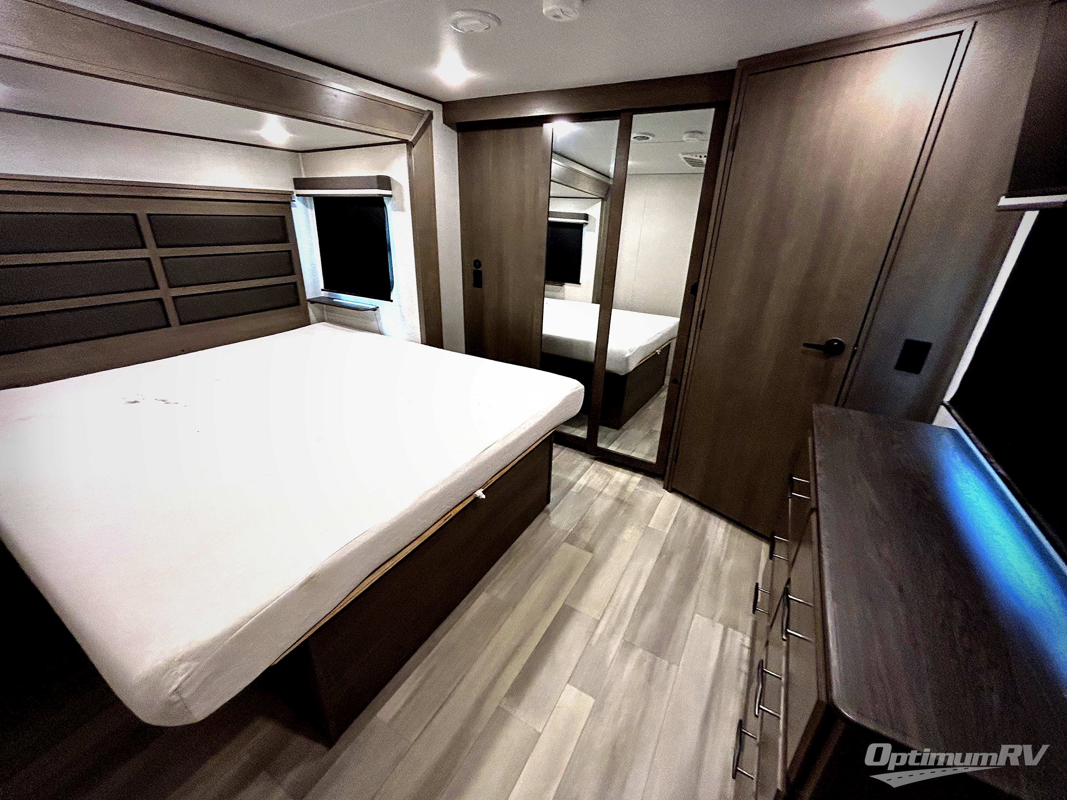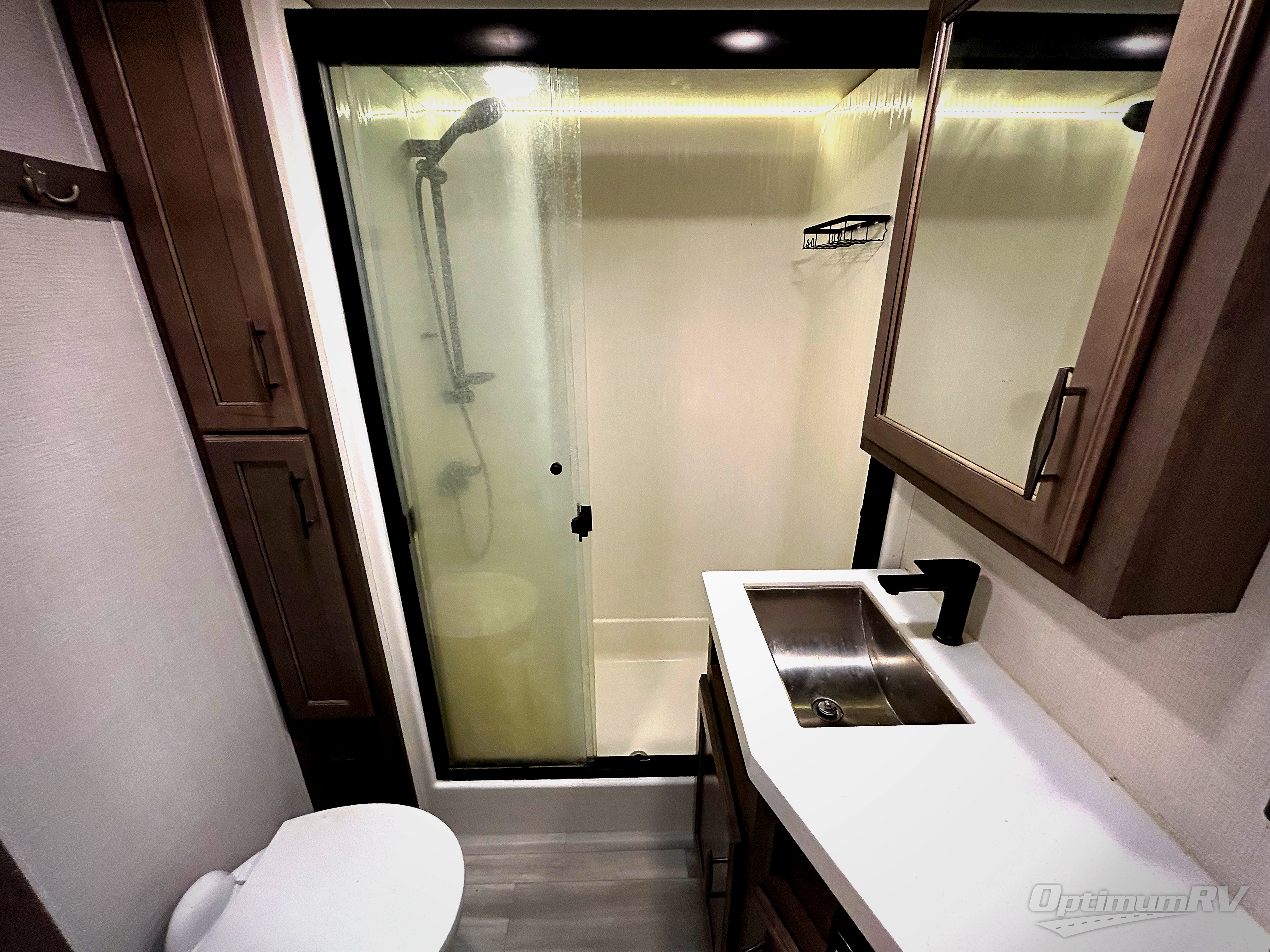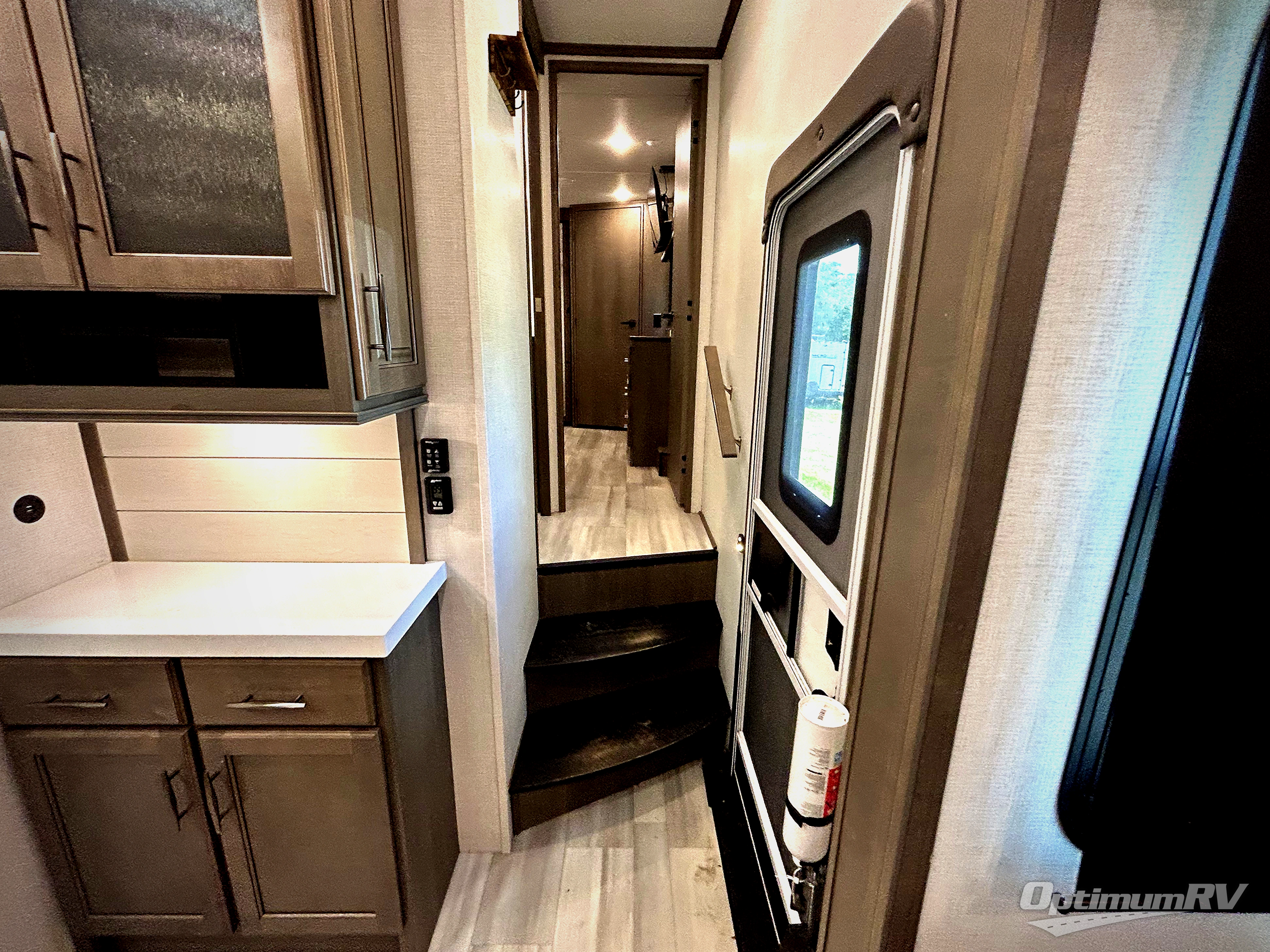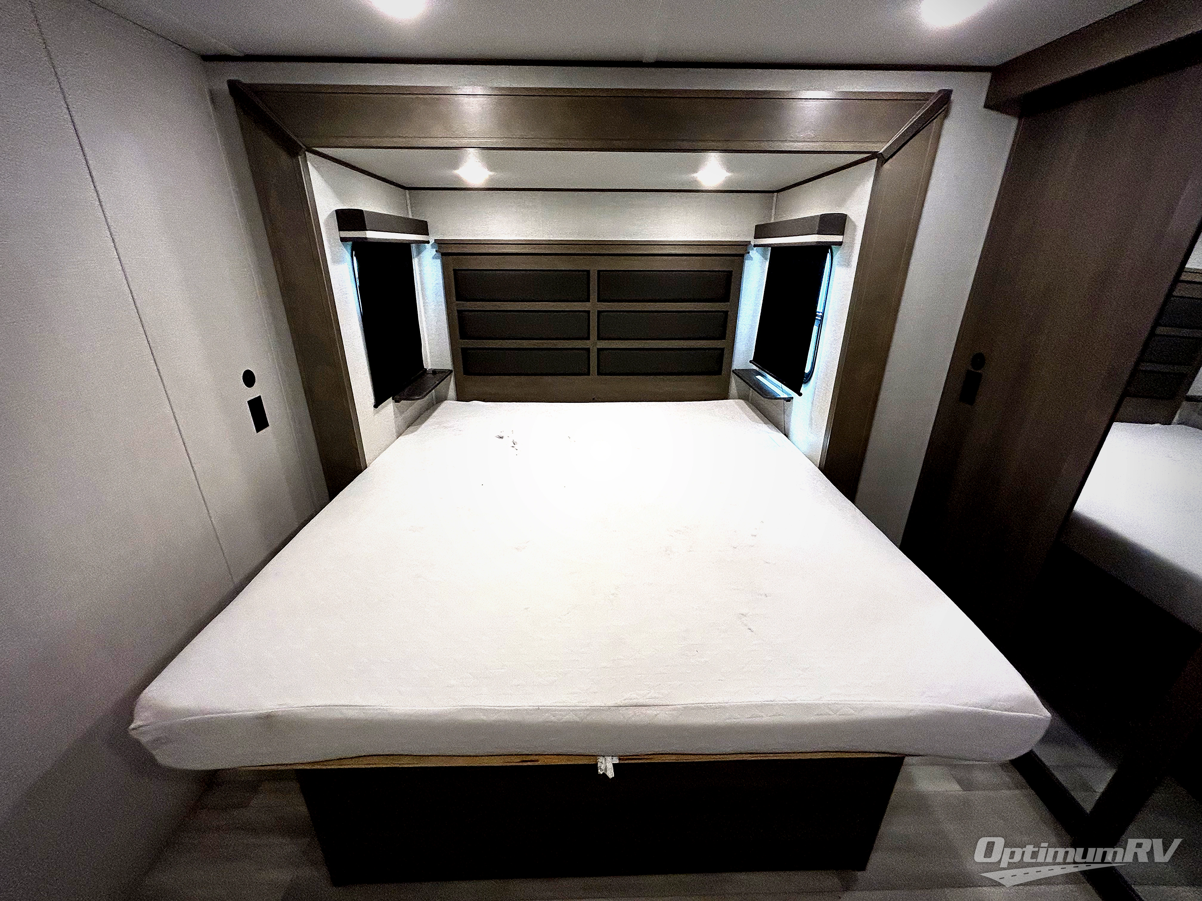 With any Solitude S-Class fifth wheel by Grand Design you will appreciate the Max Built Construction Package that features a 101" wide-body, gel coat exterior sidewalls, heavy-duty 7,000 lb. axles, plus many more durable construction materials. The self-adjusting brakes and the MORryde CRE3000 suspension system will provide a smooth towing experience, and each model includes heavy duty 17.5" H-rated tires with NitroFill. Some of the features you are sure to love are included in the Residential Living Package, like the solid surface countertops and sink covers, the hardwood cabinet doors, the night stands with USB ports, and the Rockford Fosgate stereo entertainment system with HDMI and App controls. These fifth wheels are extended-stay approved thanks to the Weather-Tek Package with a 35,000 BTU high-capacity furnace, the Stealth A/C system, and many high-end residential finishes to make you feel like you taken home with you!