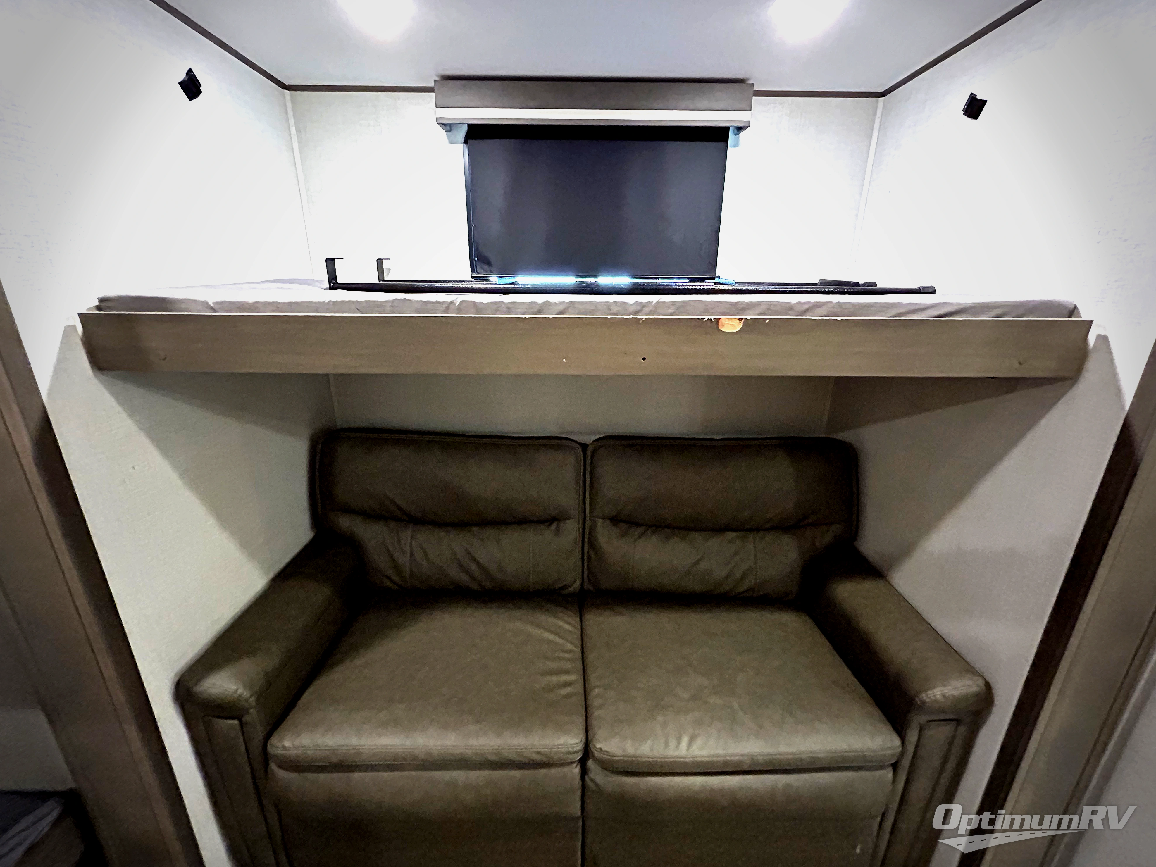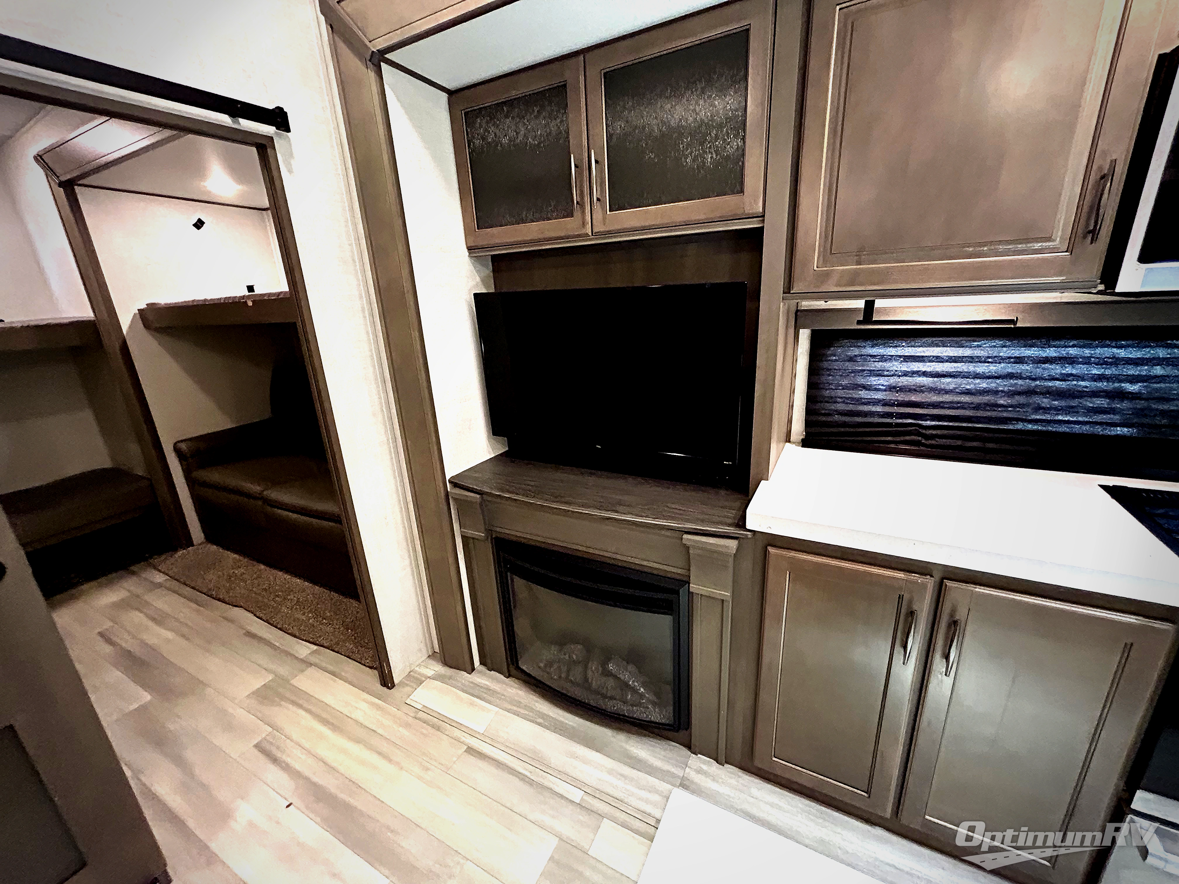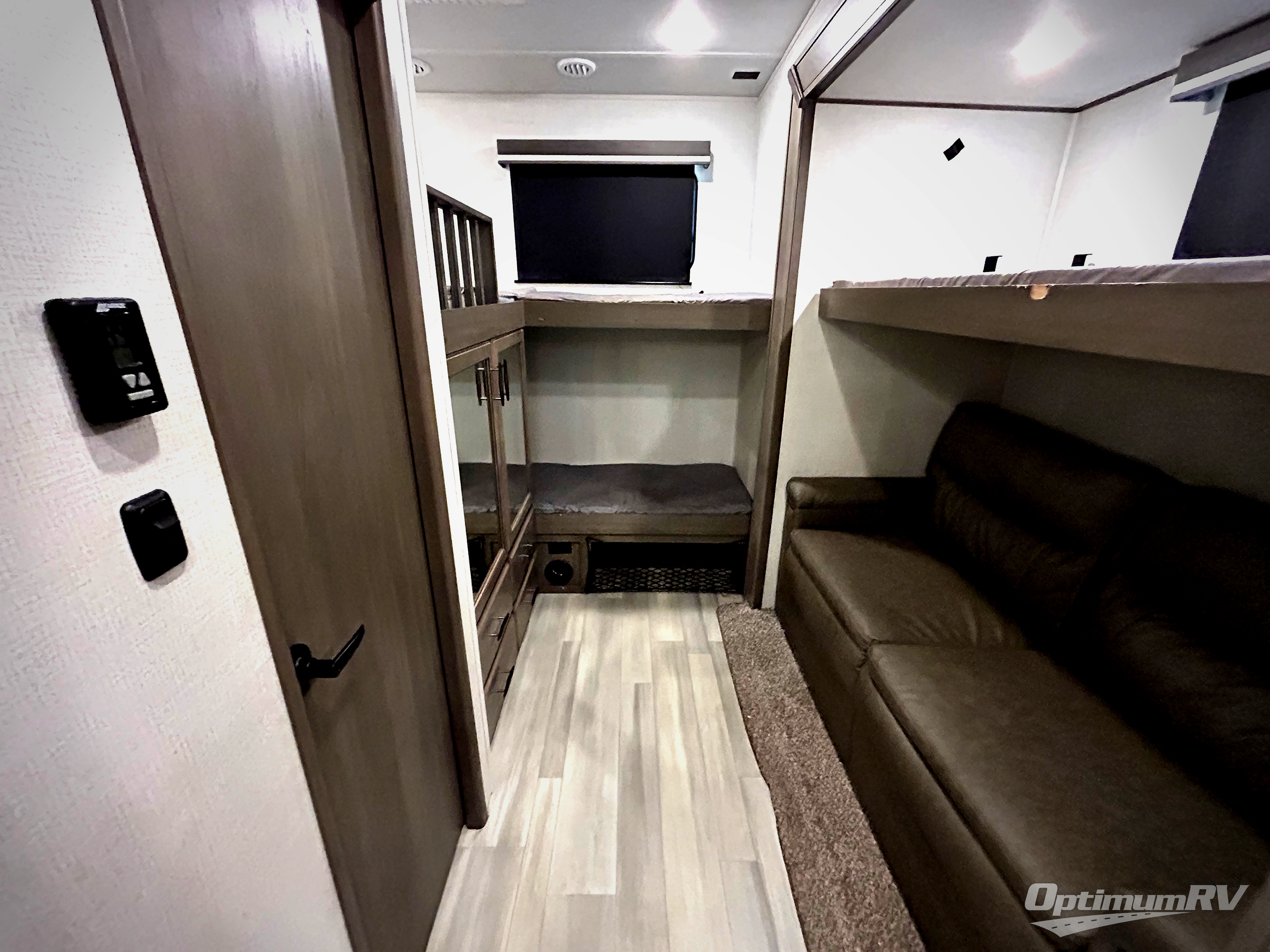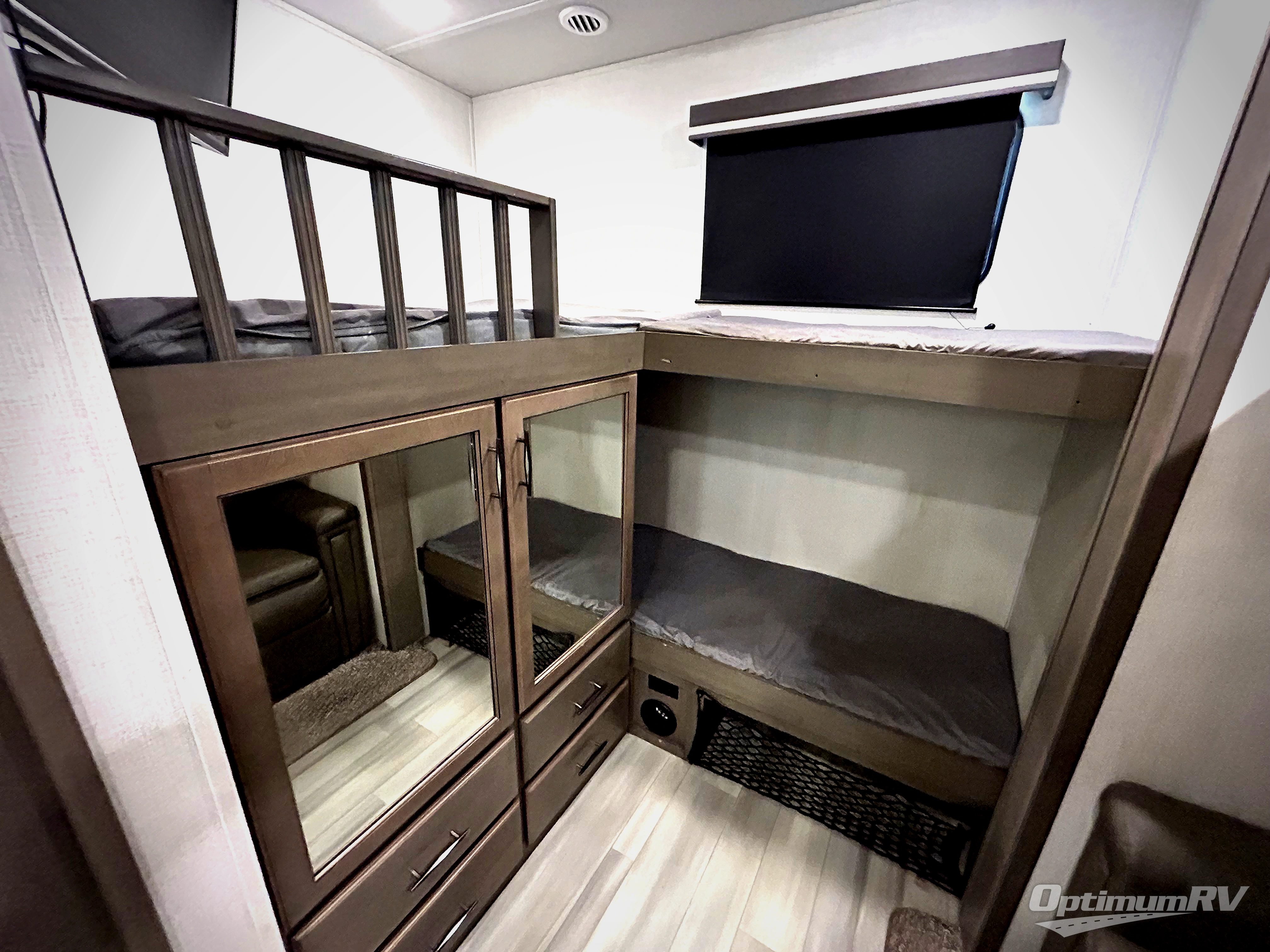 Wow! Check out this fifth wheel with dual entry doors, a private bunkhouse suite, two power awnings, and tons of interior space thanks to the four slide outs! Your guests will have three bunks in the bunkhouse, a tri-fold sofa, plus a convenient half bath with its own exterior entry door. Make yourself at home in the front private bedroom that includes a queen bed that can be optioned out for a king bed, a dresser with an LED TV, plus a large front closet with washer and dryer prep. And don't overlook the main living area/kitchen with theatre seating with USB ports, a kitchen island, plus an LED TV and a fireplace!