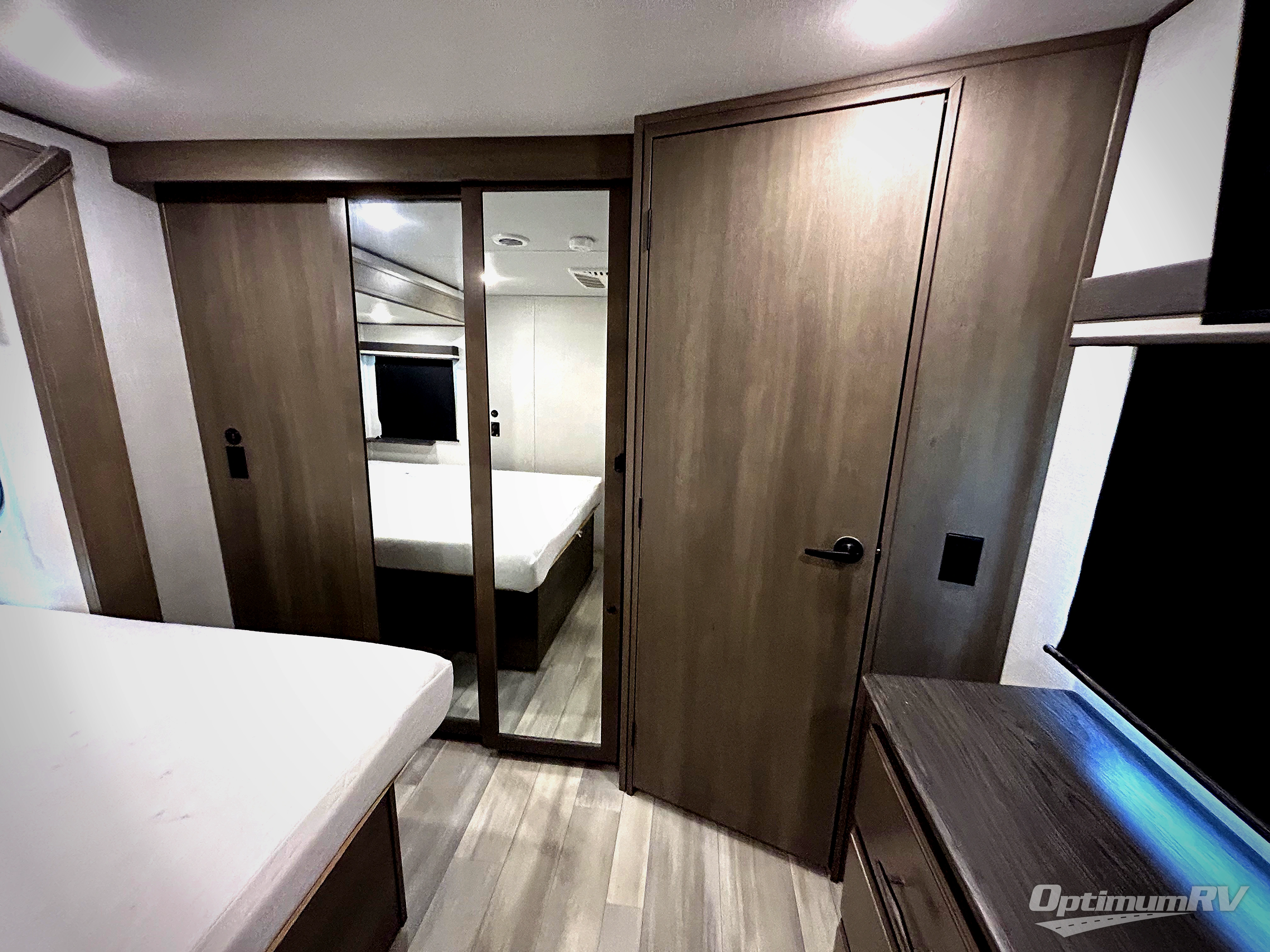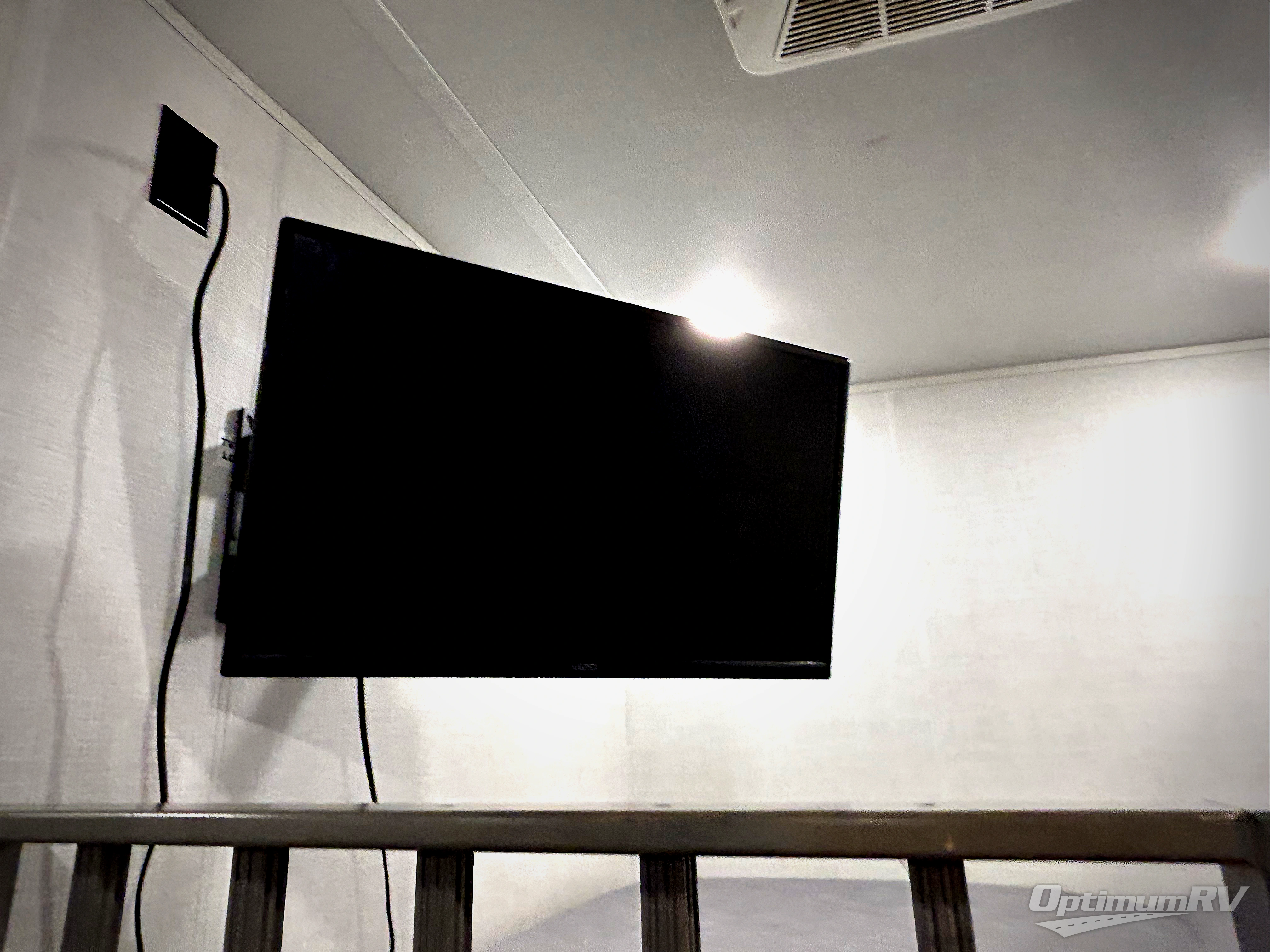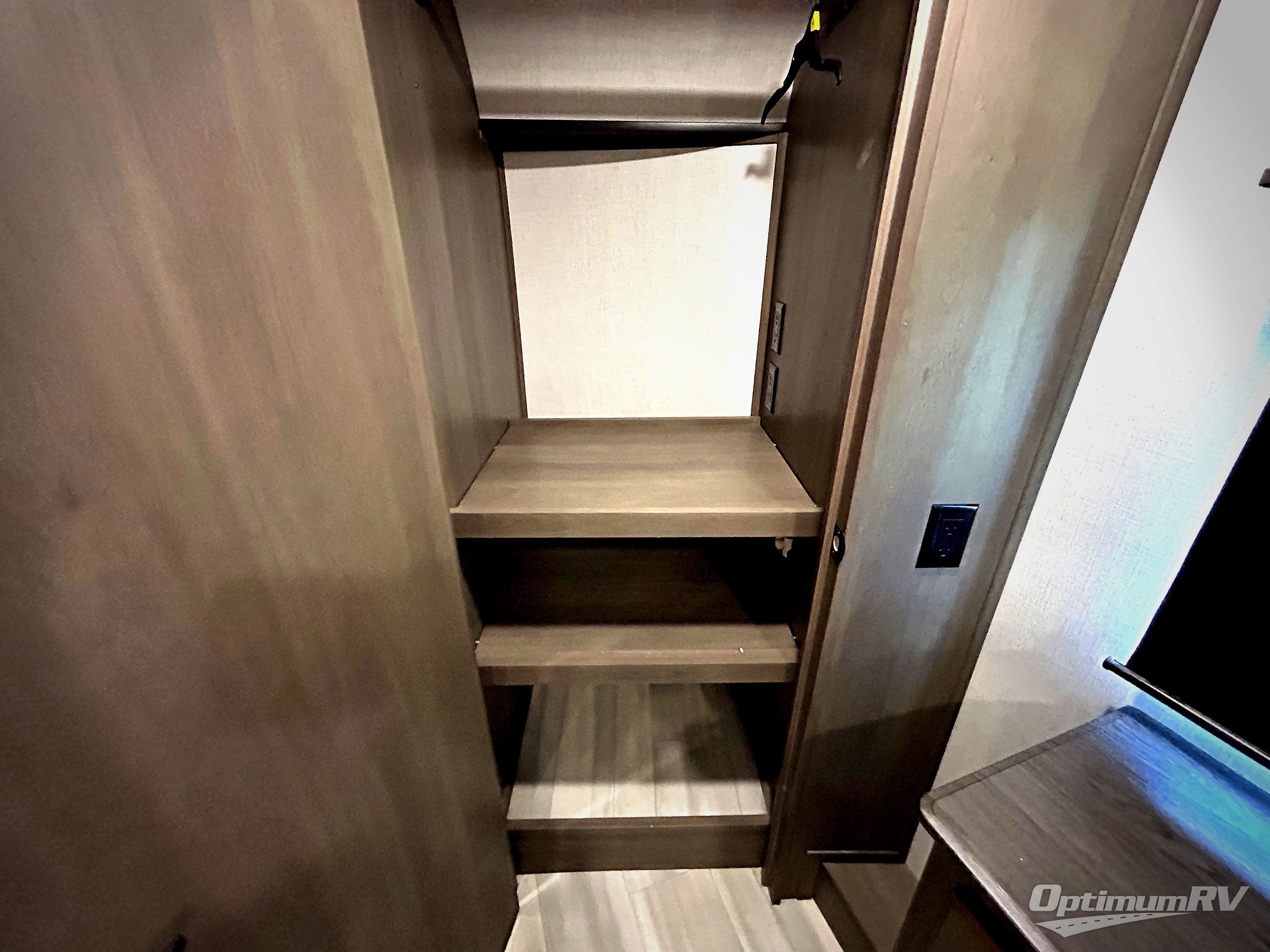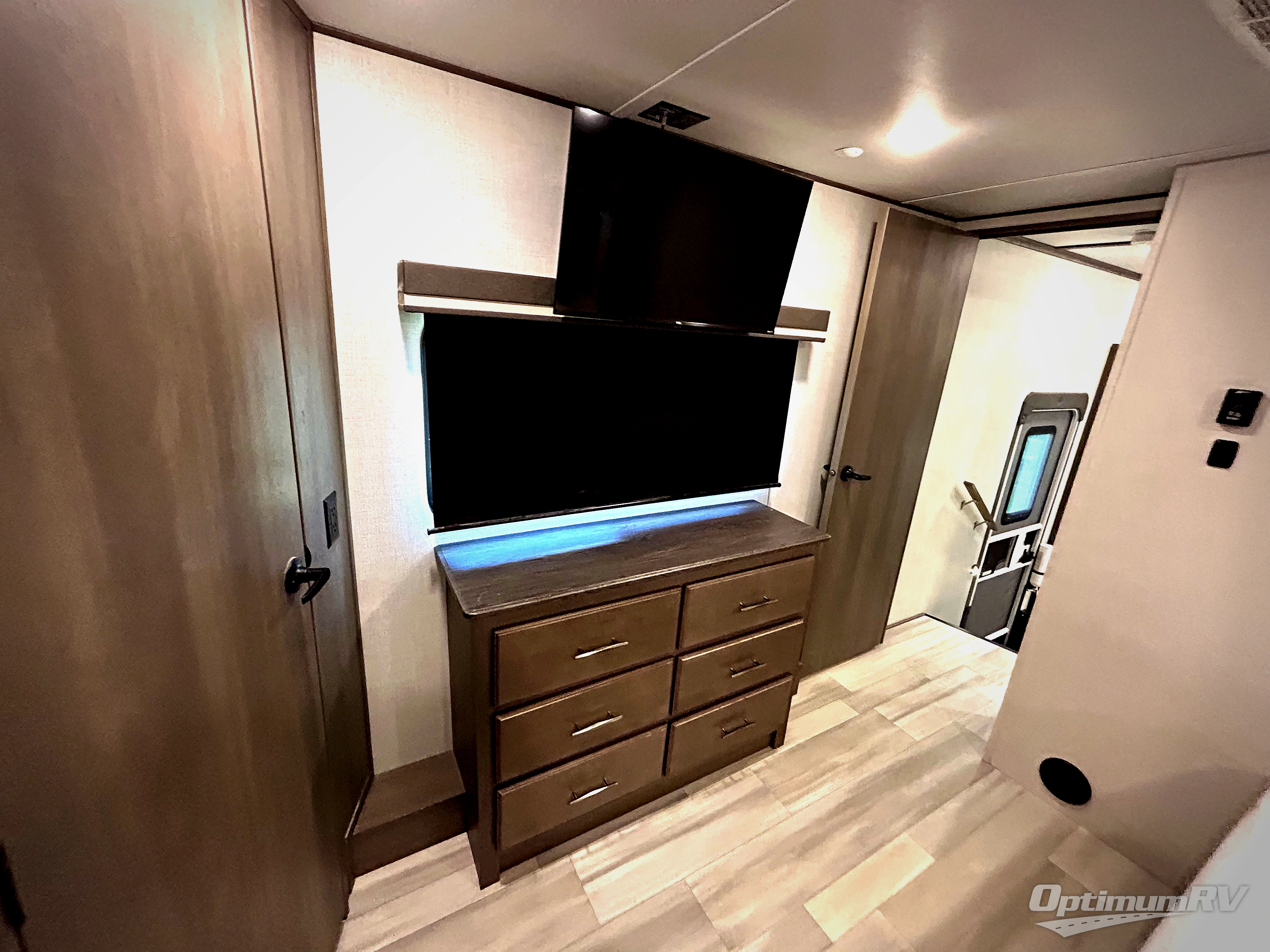 Wow! Check out this fifth wheel with dual entry doors, a private bunkhouse suite, two power awnings, and tons of interior space thanks to the four slide outs! Your guests will have three bunks in the bunkhouse, a tri-fold sofa, plus a convenient half bath with its own exterior entry door. Make yourself at home in the front private bedroom that includes a queen bed that can be optioned out for a king bed, a dresser with an LED TV, plus a large front closet with washer and dryer prep. And don't overlook the main living area/kitchen with theatre seating with USB ports, a kitchen island, plus an LED TV and a fireplace!