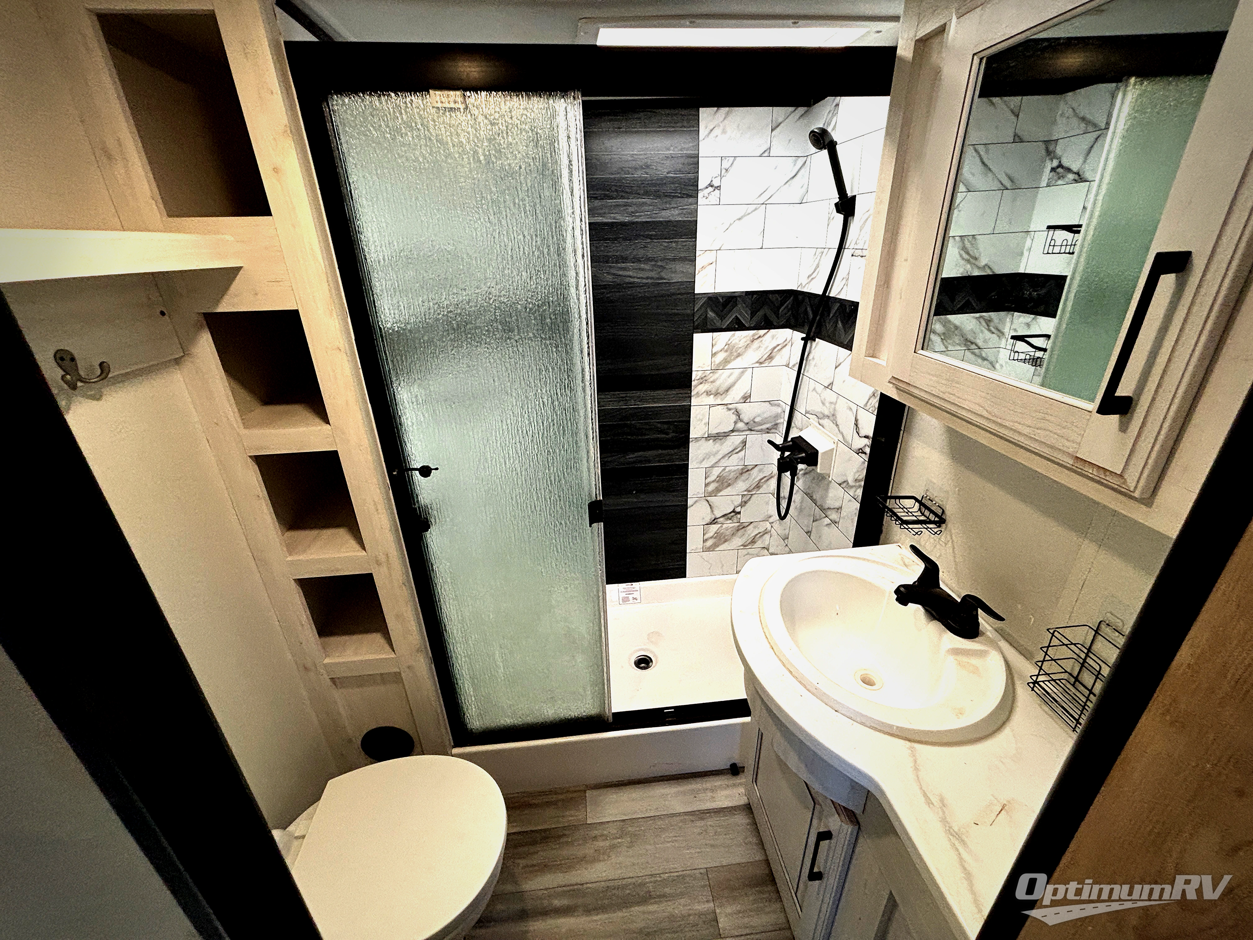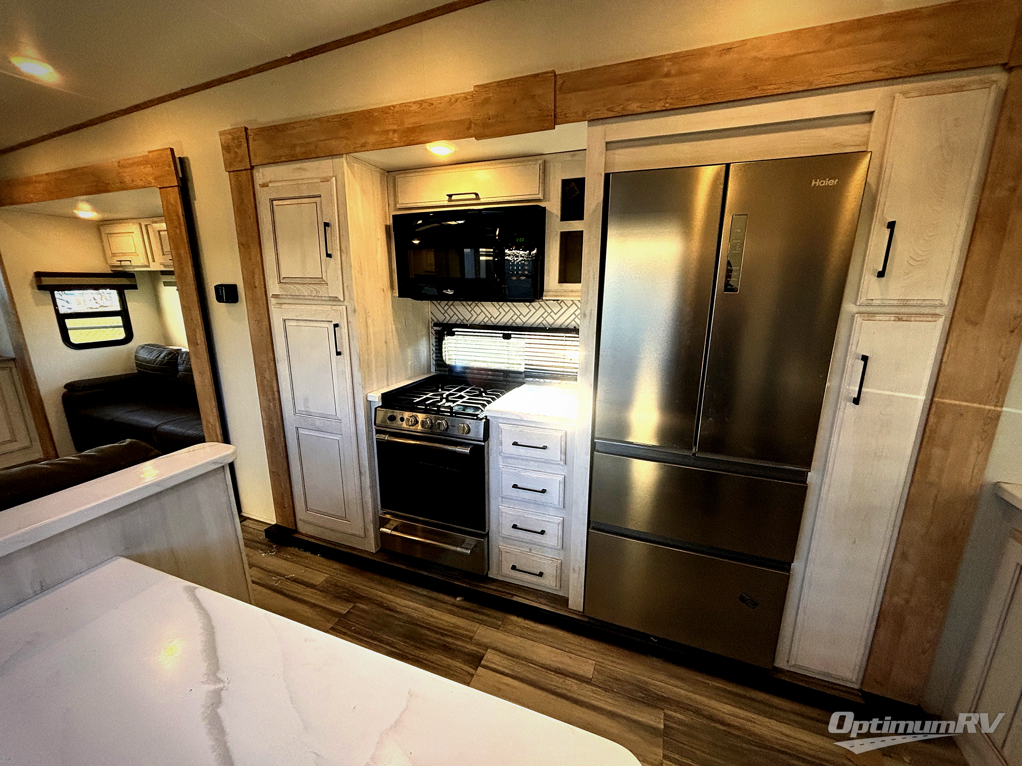 Comfort and fun is found in this fifth wheel with four slides and sleeping space for six! Once you arrive at the campground, set up the 18' power awning, then make lunch on the two burner cooktop. Head inside to find a dinette with bench seating on one side and chairs on the other, plus a 16.2 cu. ft. 12V refrigerator for tons of food storage space. Your crew can visit in the rear living area in front of the entertainment center with a fireplace, plus there are two sofas and theater seats. The full bath includes a spacious shower, a 6' 4" bath ceiling height, plus a domed shower skylight for more standing space. And don't overlook the front private bedroom with a king bed slide out, a large front closet, plus washer and dryer prep, allowing you to go full-time if you choose!