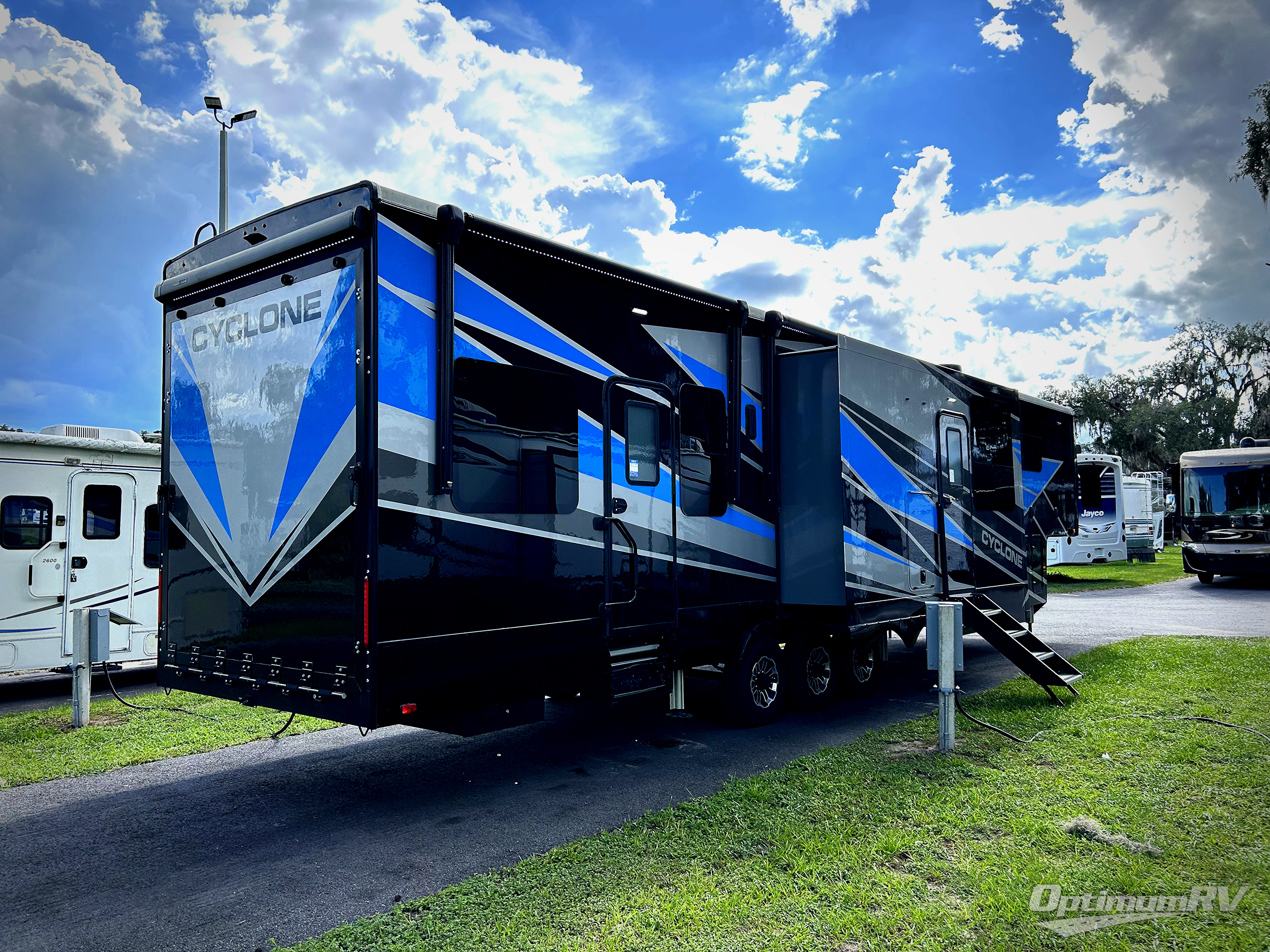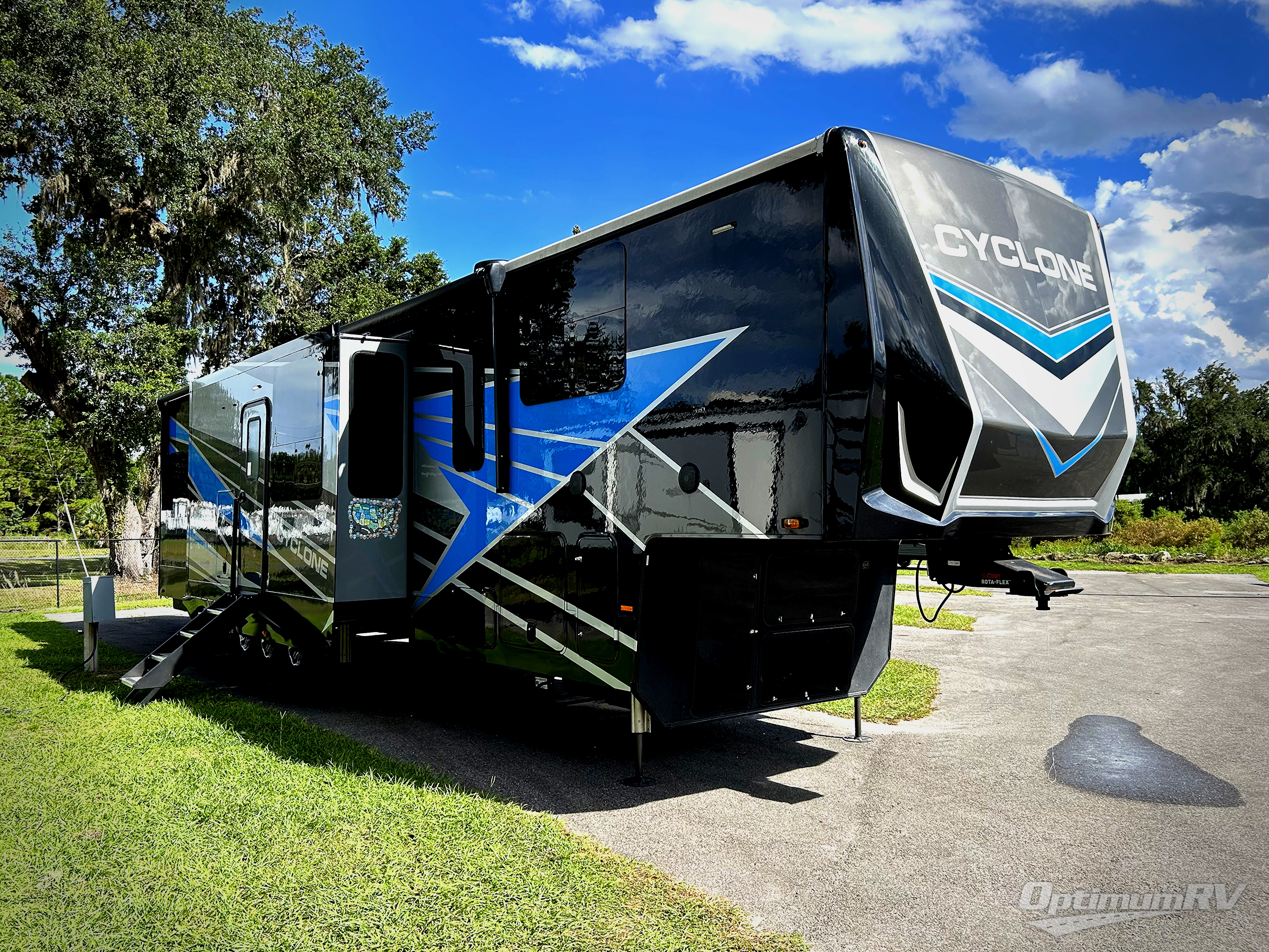 Satisfy your wanderlust with a Heartland Cyclone fifth wheel toy hauler! You won't have to sacrifice any luxury either with indulgent features like the king bedroom suite with an exclusive East to West bed tilt system with 30% more floor space, Stor-Mor three-sided access to the basement with 30% more storage capacity, and Step Caddy folding patio step for better stability as you enter or exit the patio. The industry first Grill and Go 25" residential pull out 3 burner griddle combo comes on models with an exterior kitchen for an easier cooking experience. Full height shaker cabinetry provides 25% more storage space so you can bring more camping necessities with you. If you like to dry camp longer then you will appreciate the industry's largest 150 gallons fresh water tanks. Come find the perfect model for you today!