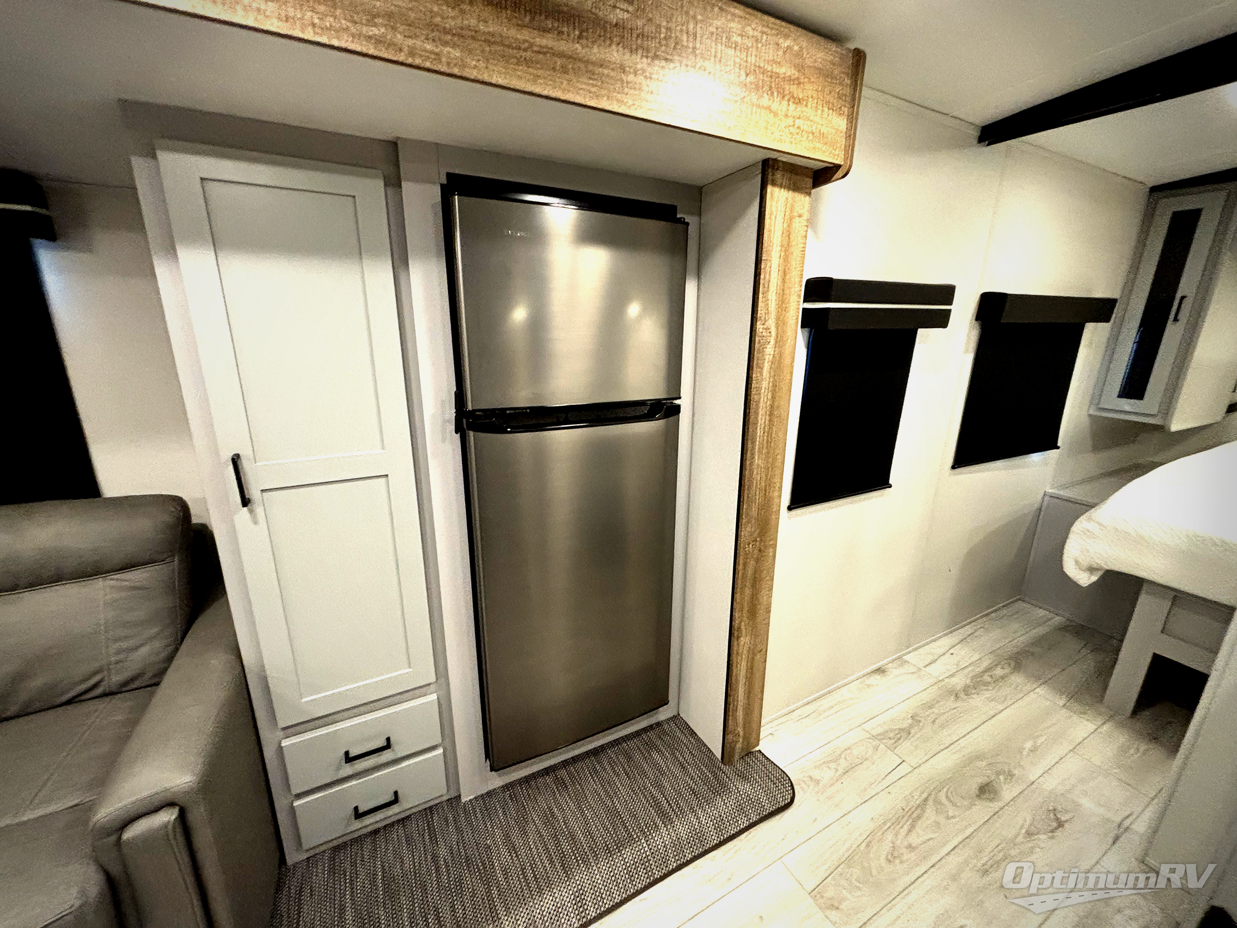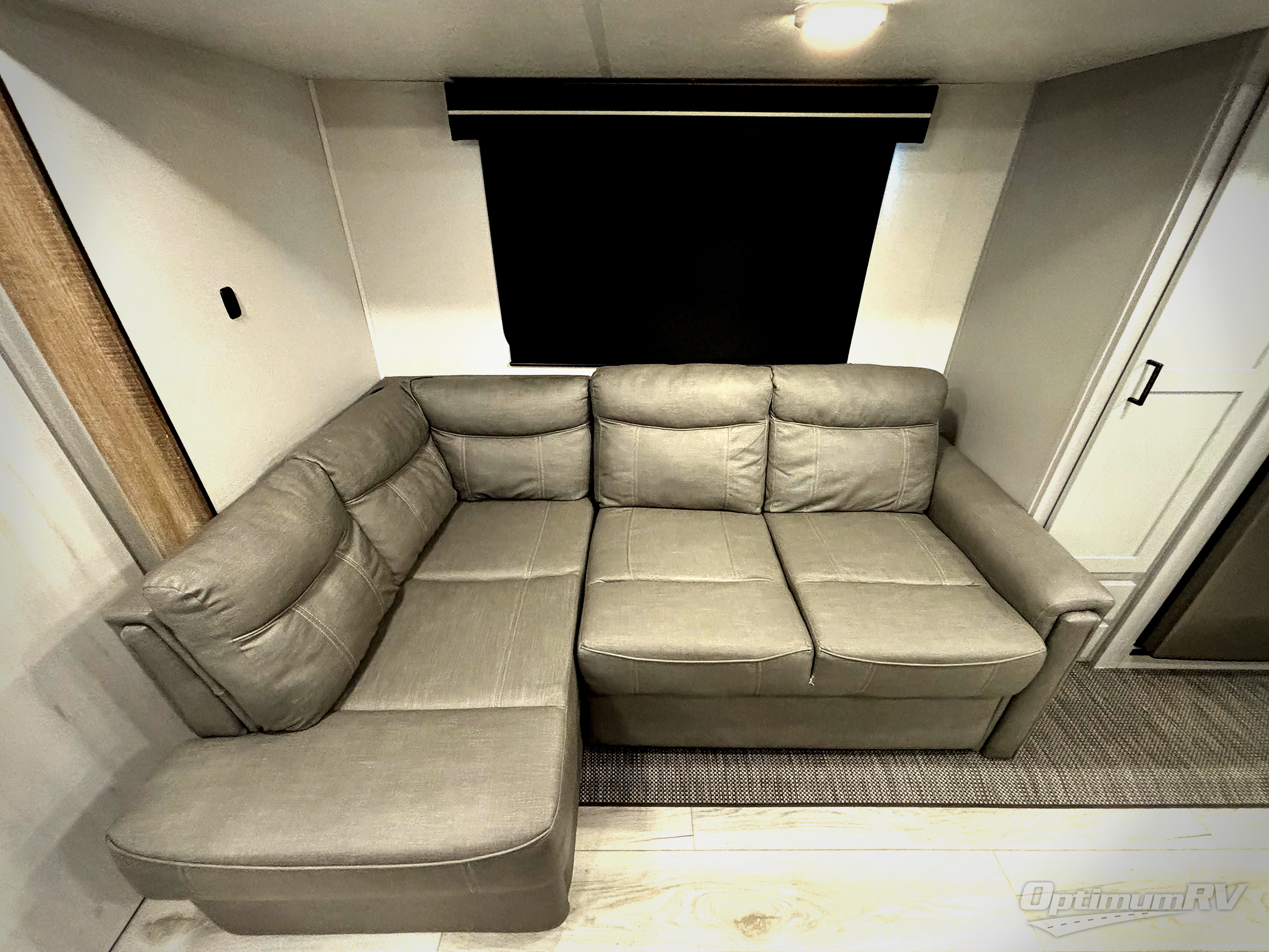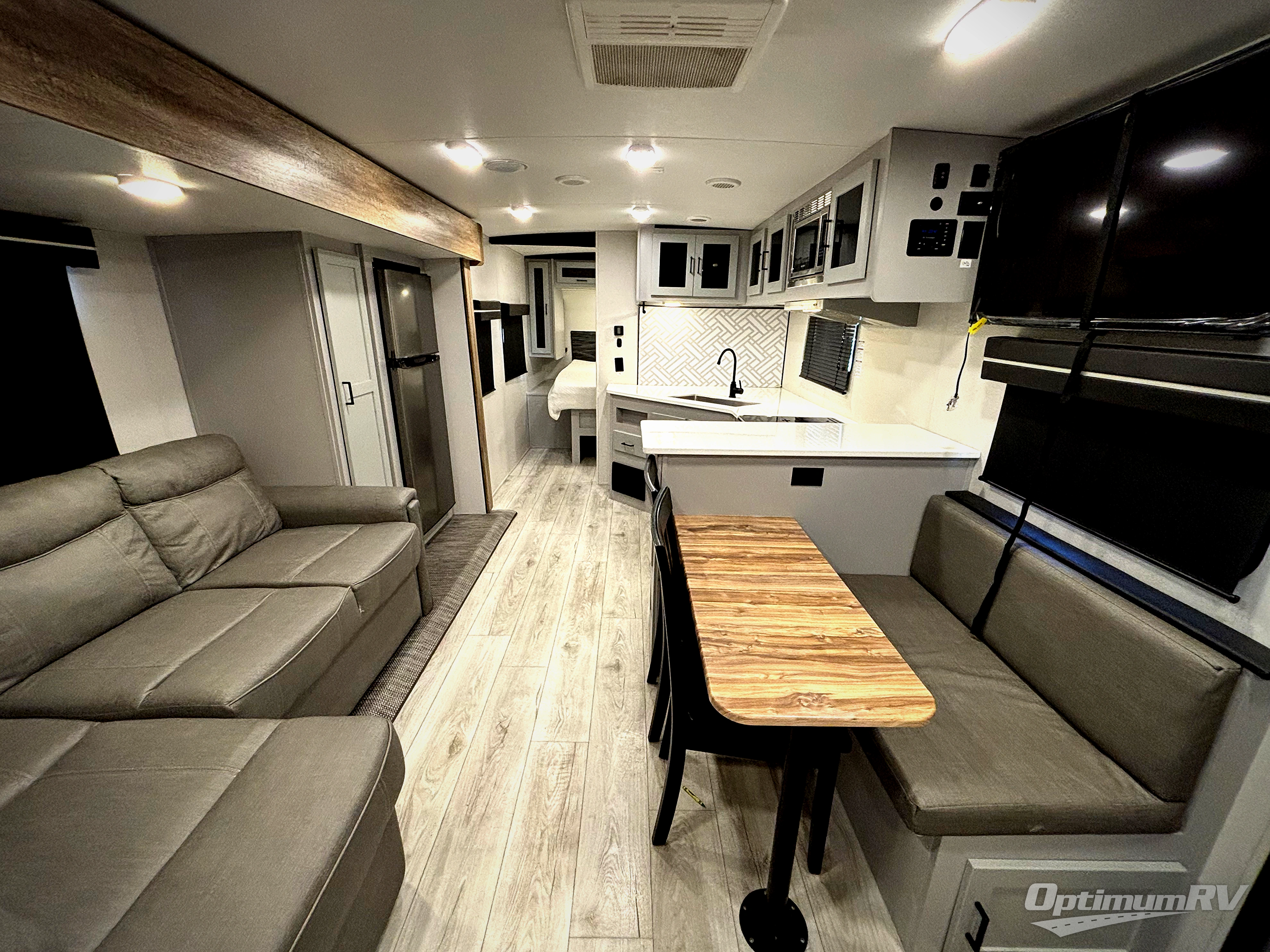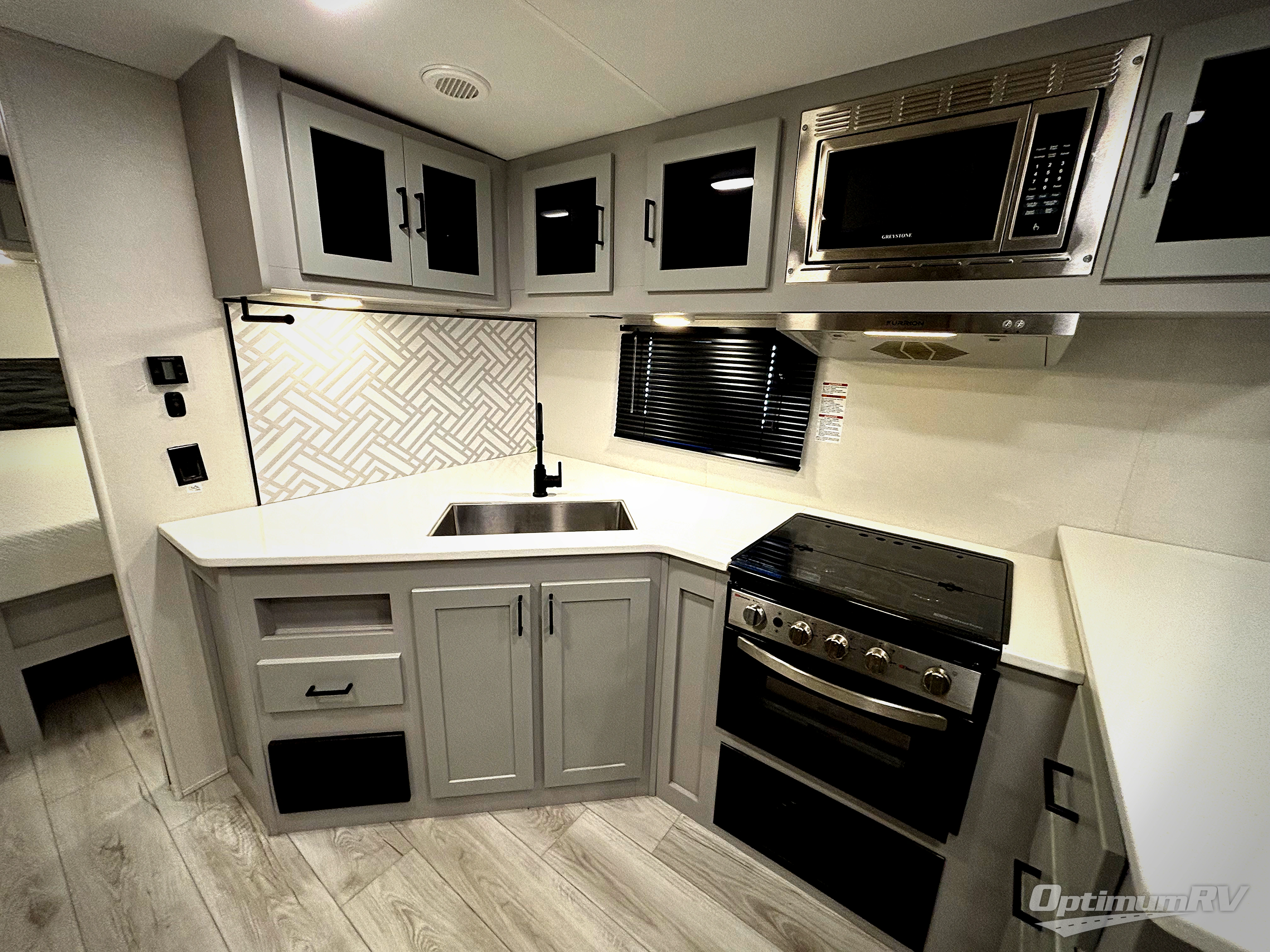 Head to your state park in this spacious travel trailer that can sleep four people each night. The sleeper sofa with a stowaway table within the large slide will provide comfortable dining and sleeping space, plus there is a dinette with bench seating on one side and two chairs on the other. You and your spouse will love the full rear bath with generous counter space and a shower skylight to let natural light in. This model also includes an outdoor kitchen, plus a 16' power awning with LED lights for great outdoor fun!