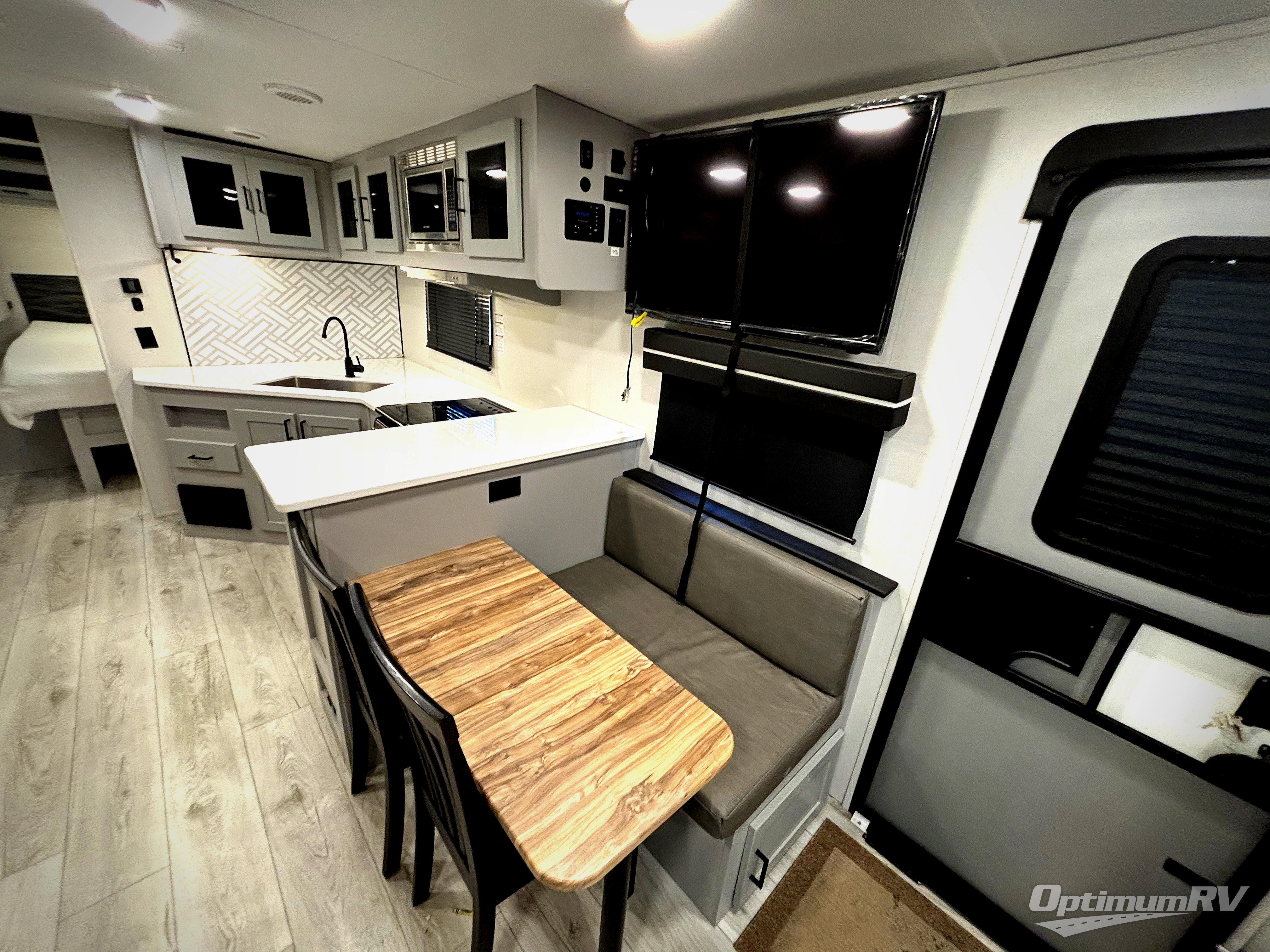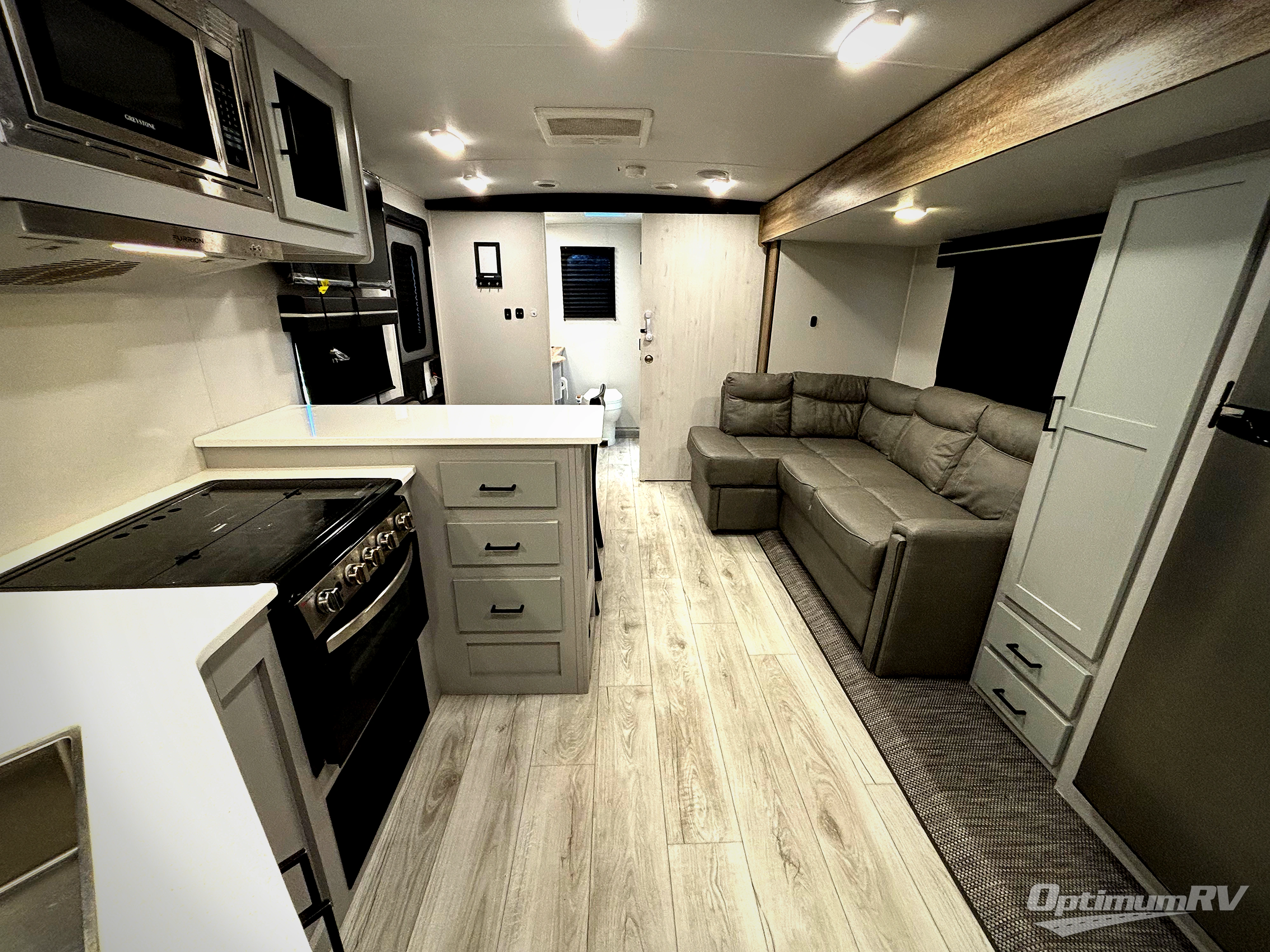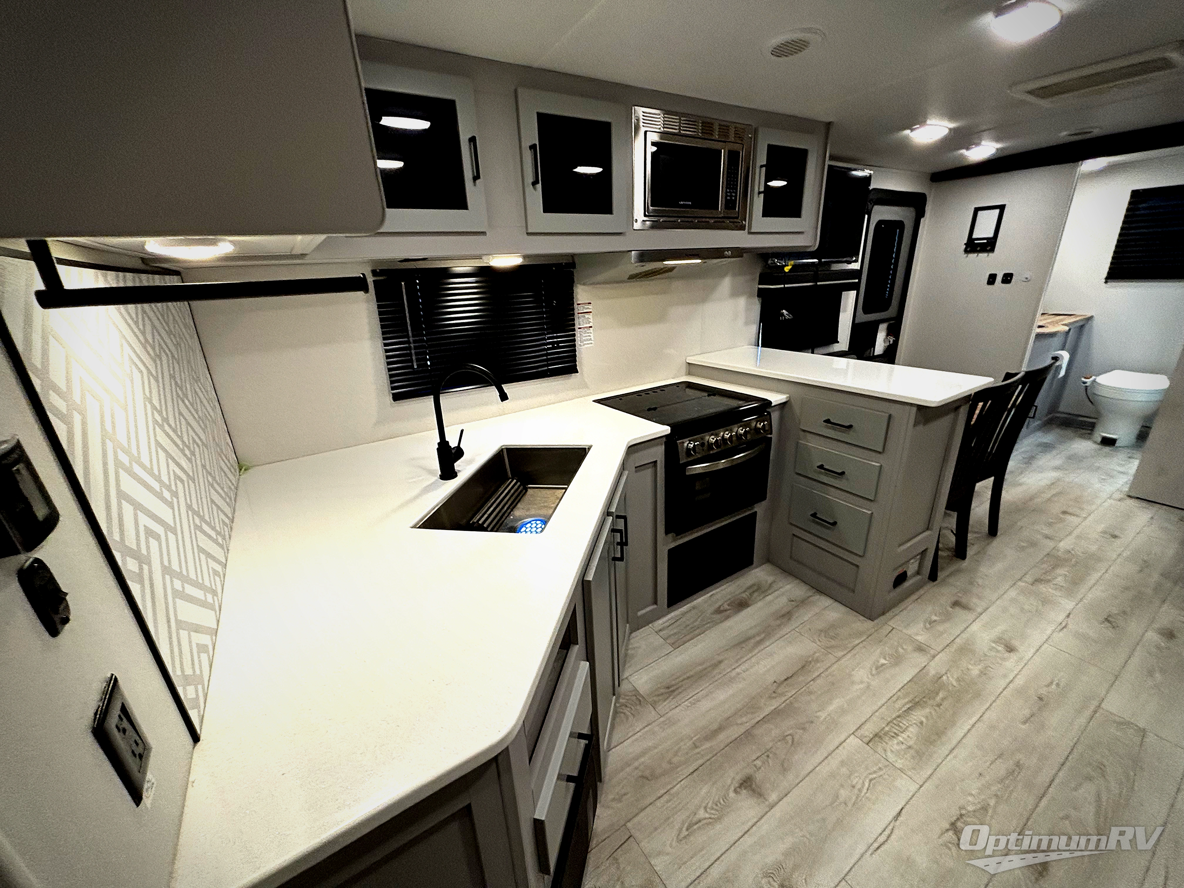 Head to your state park in this spacious travel trailer that can sleep four people each night. The sleeper sofa with a stowaway table within the large slide will provide comfortable dining and sleeping space, plus there is a dinette with bench seating on one side and two chairs on the other. You and your spouse will love the full rear bath with generous counter space and a shower skylight to let natural light in. This model also includes an outdoor kitchen, plus a 16' power awning with LED lights for great outdoor fun!