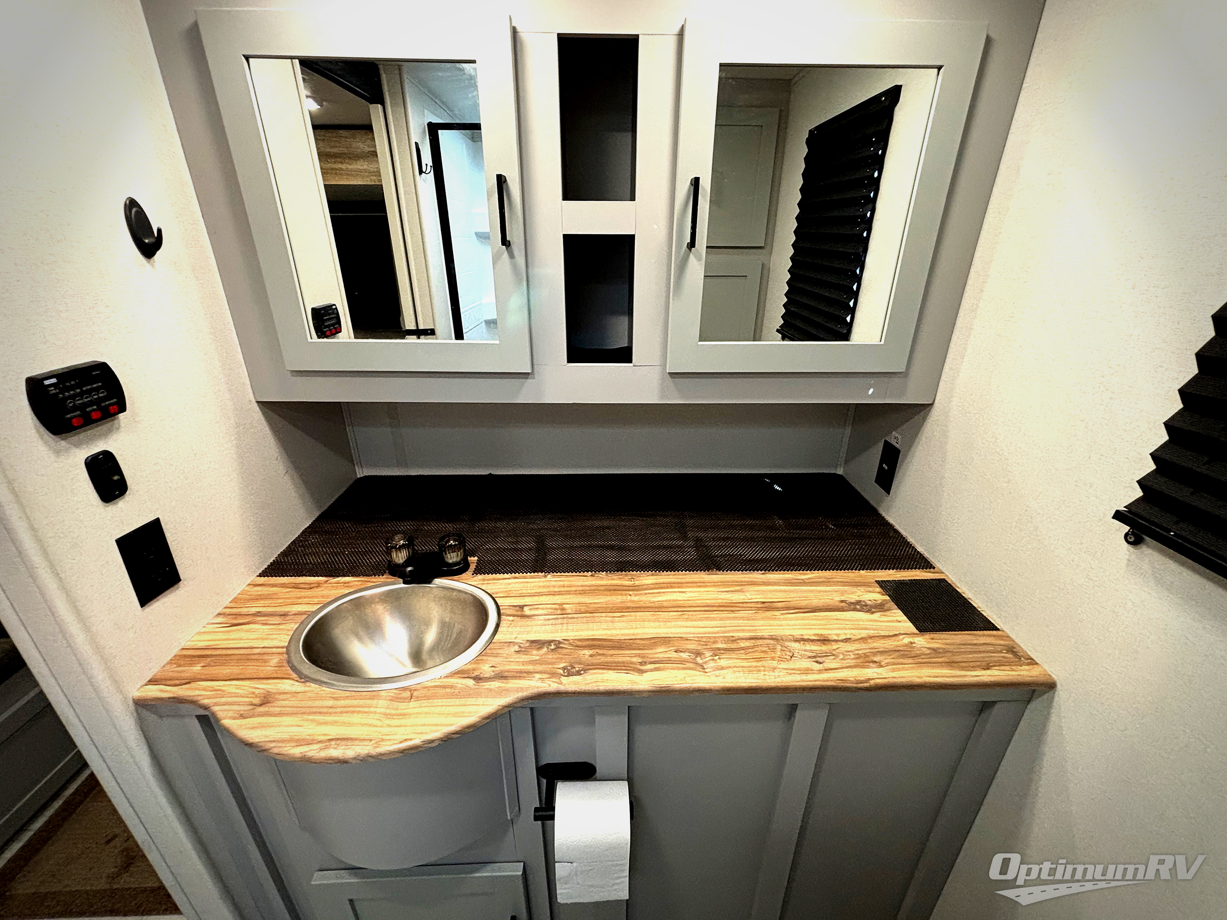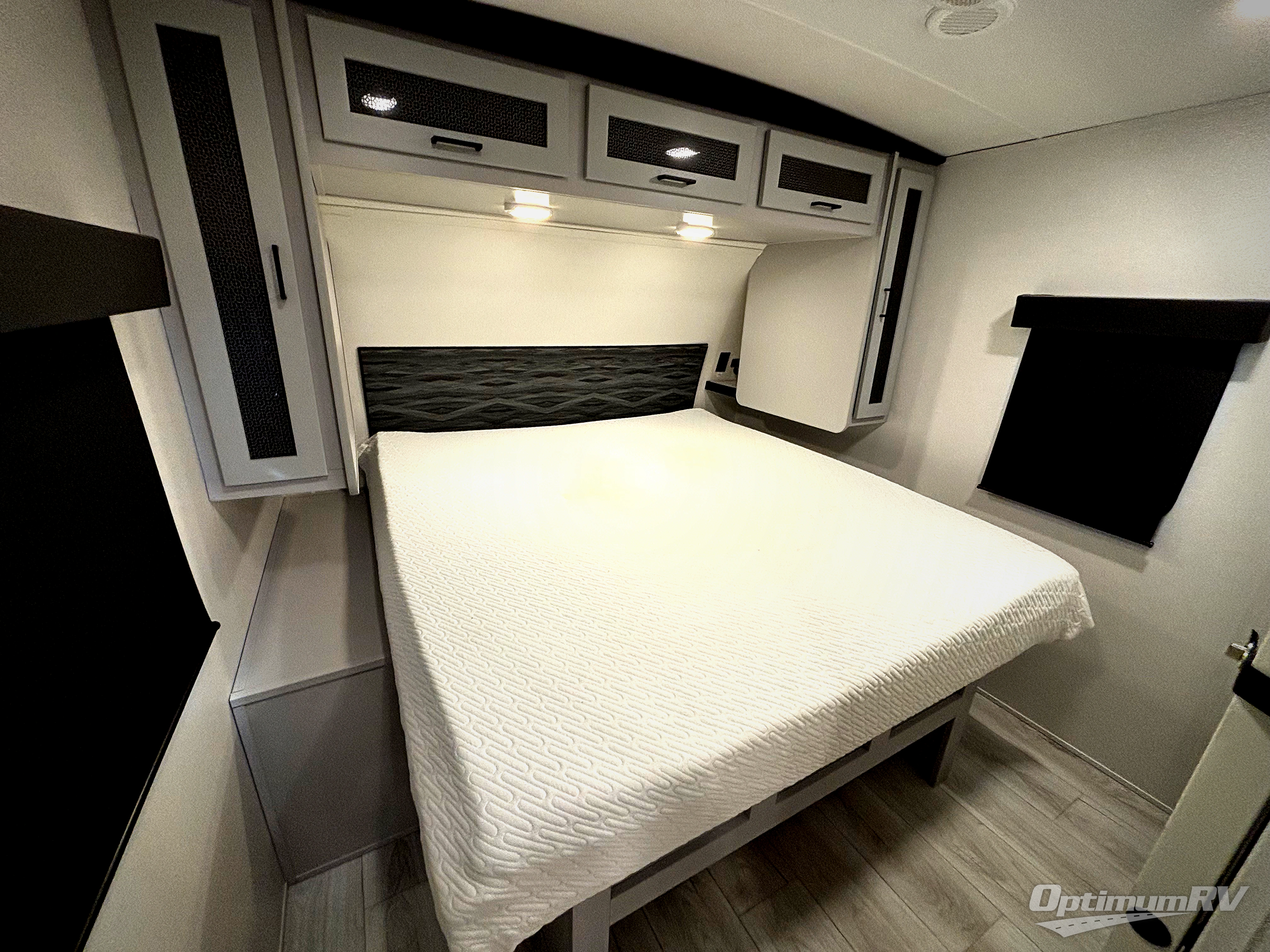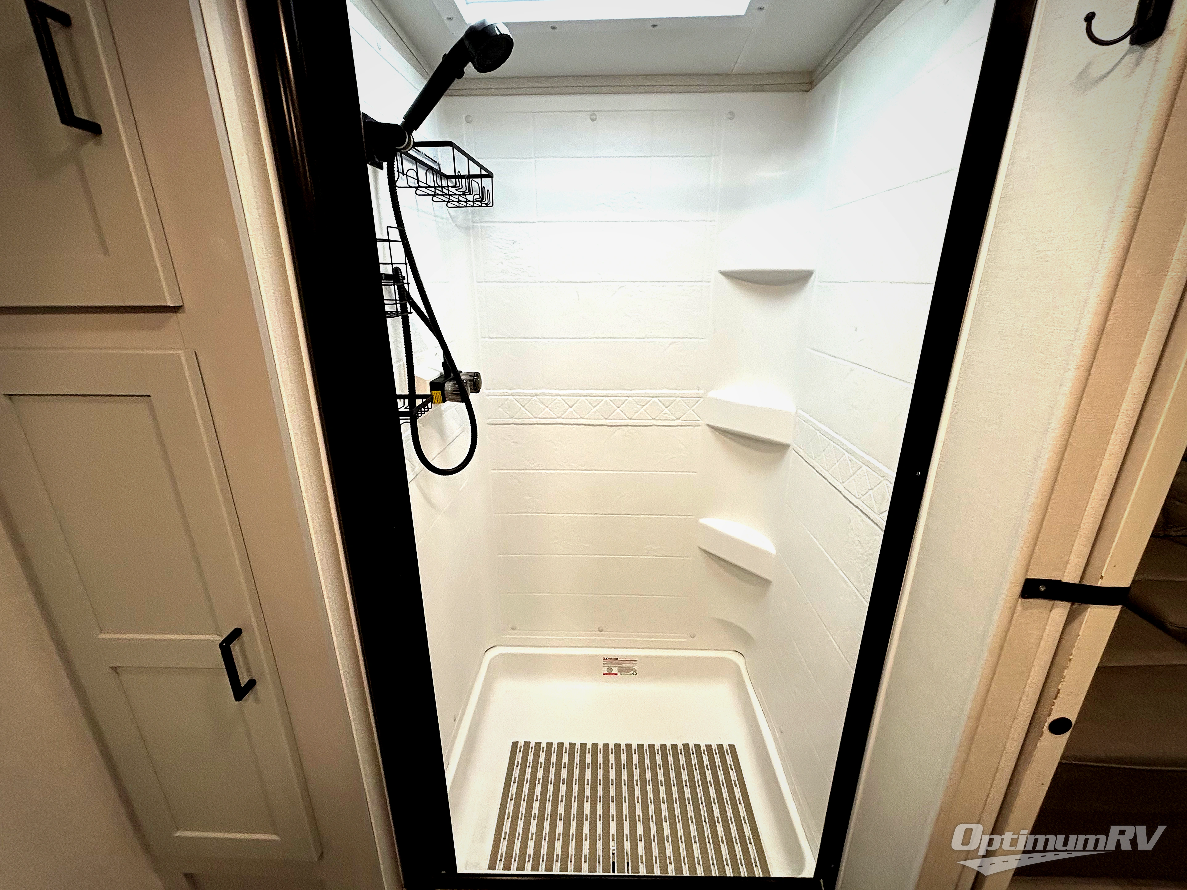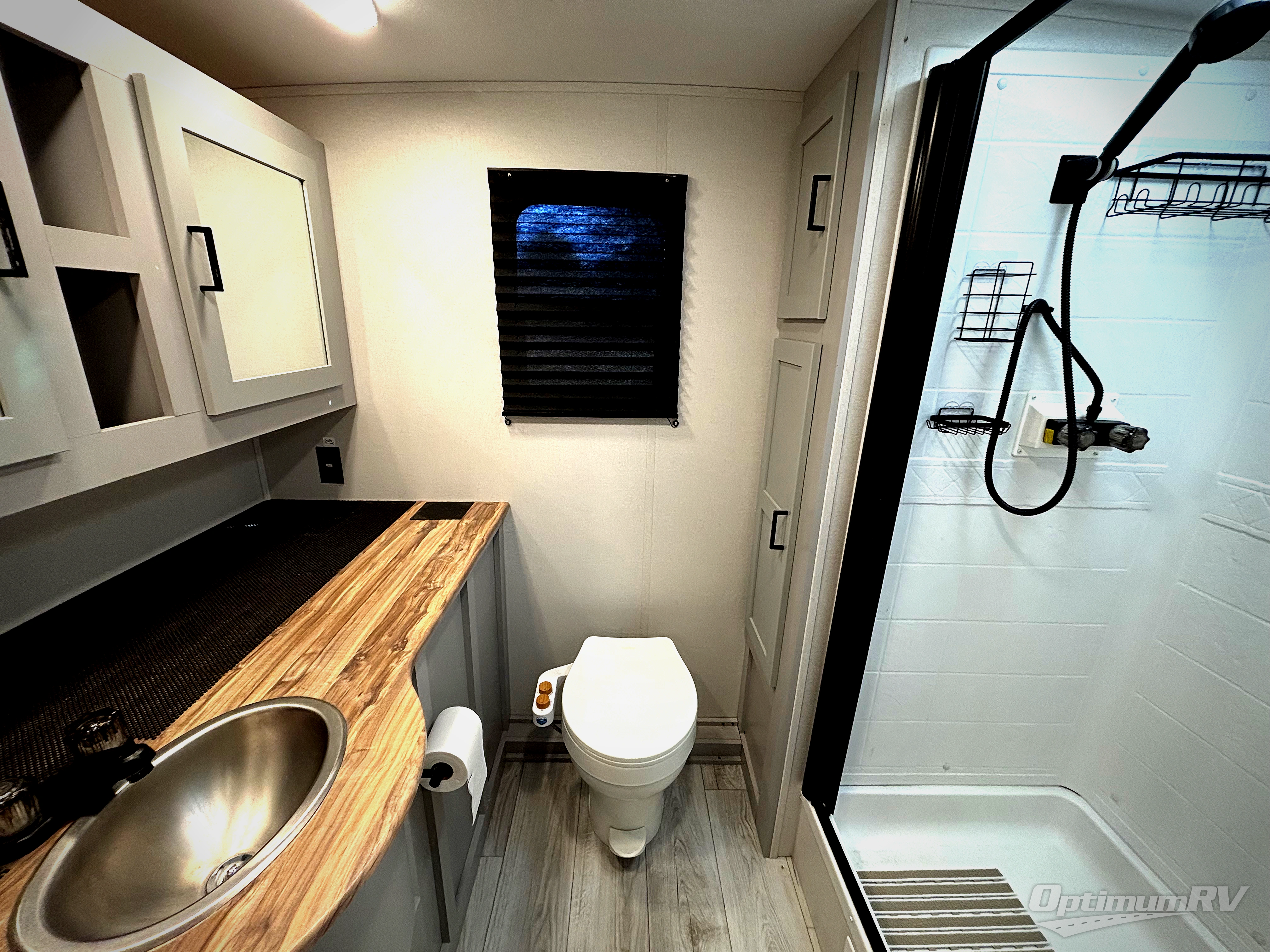 Head to your state park in this spacious travel trailer that can sleep four people each night. The sleeper sofa with a stowaway table within the large slide will provide comfortable dining and sleeping space, plus there is a dinette with bench seating on one side and two chairs on the other. You and your spouse will love the full rear bath with generous counter space and a shower skylight to let natural light in. This model also includes an outdoor kitchen, plus a 16' power awning with LED lights for great outdoor fun!