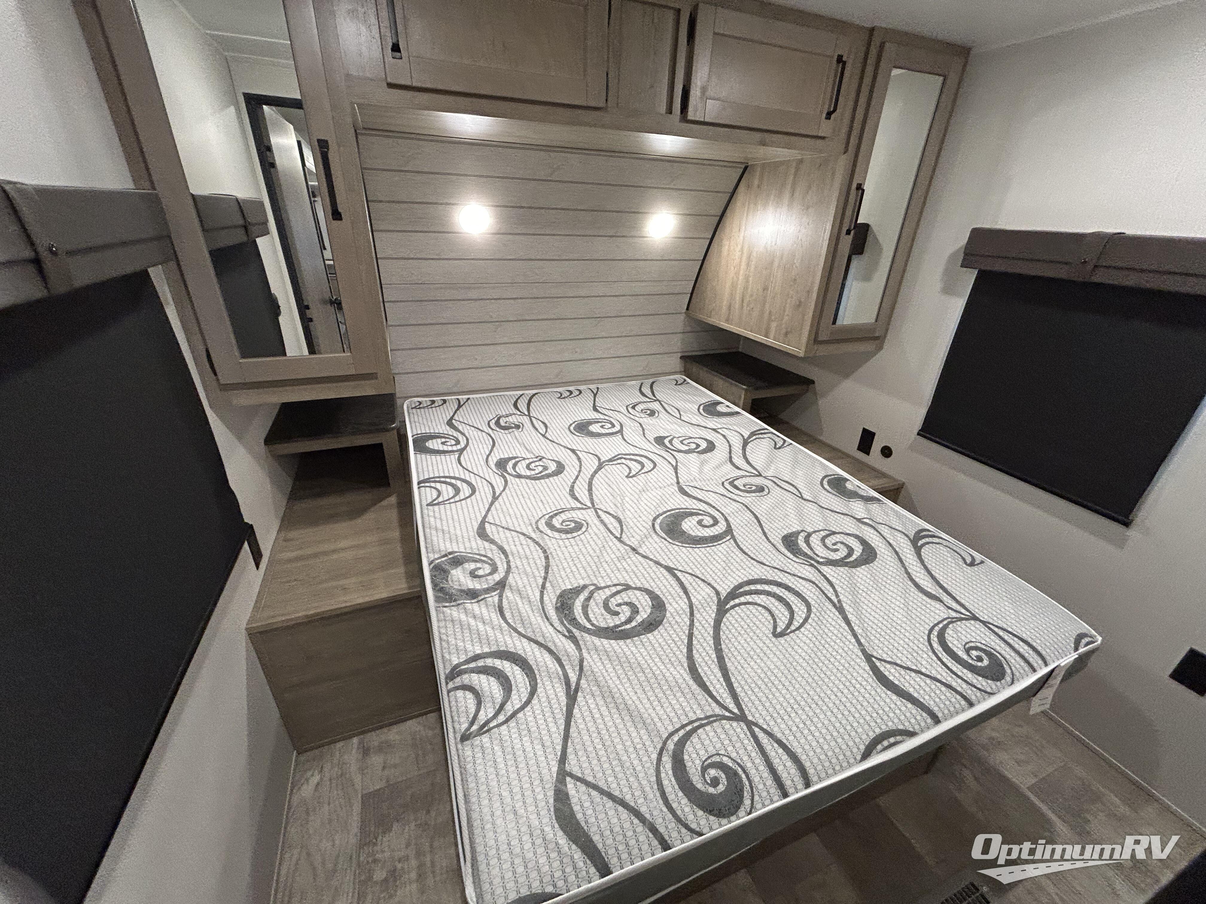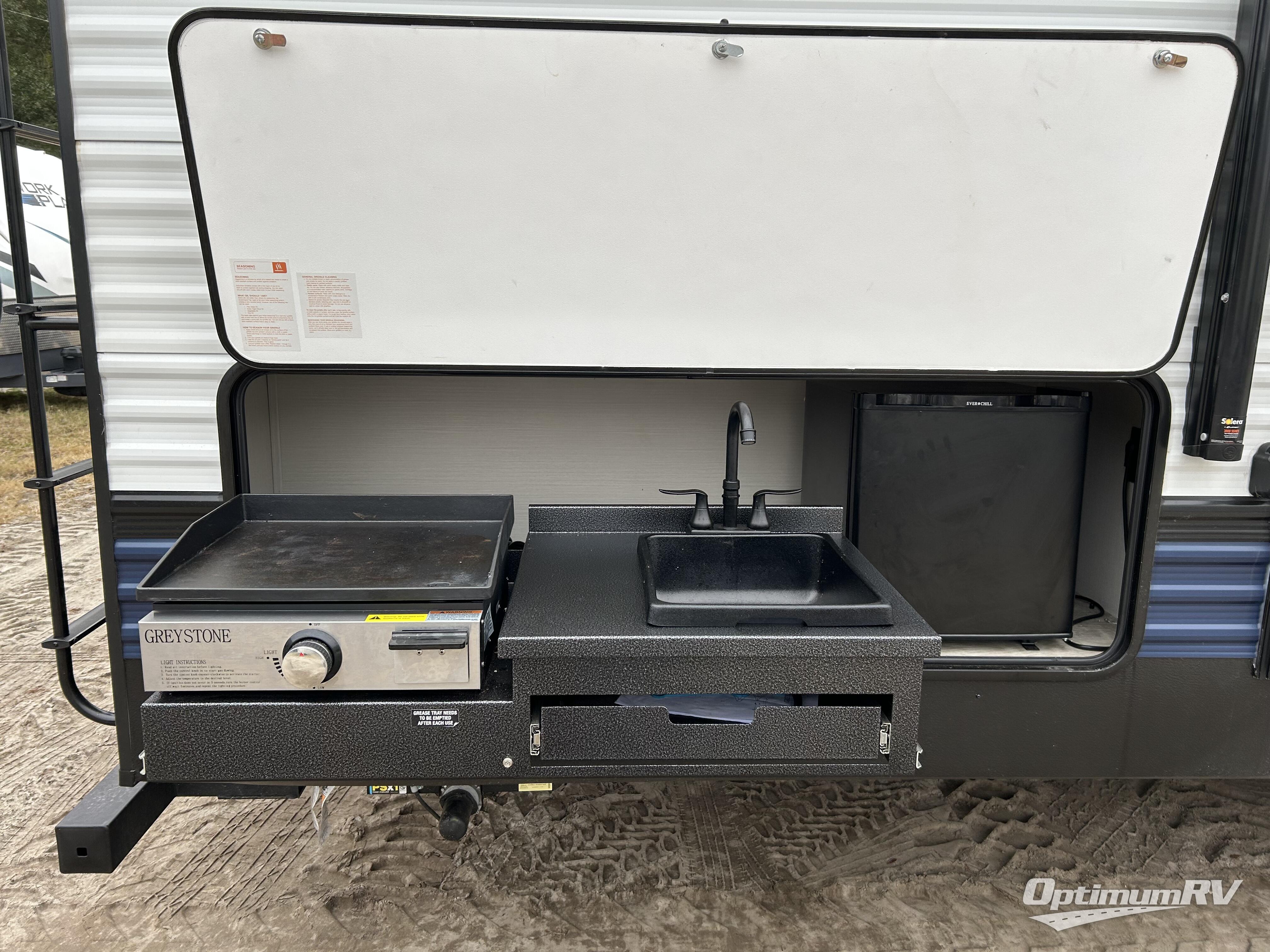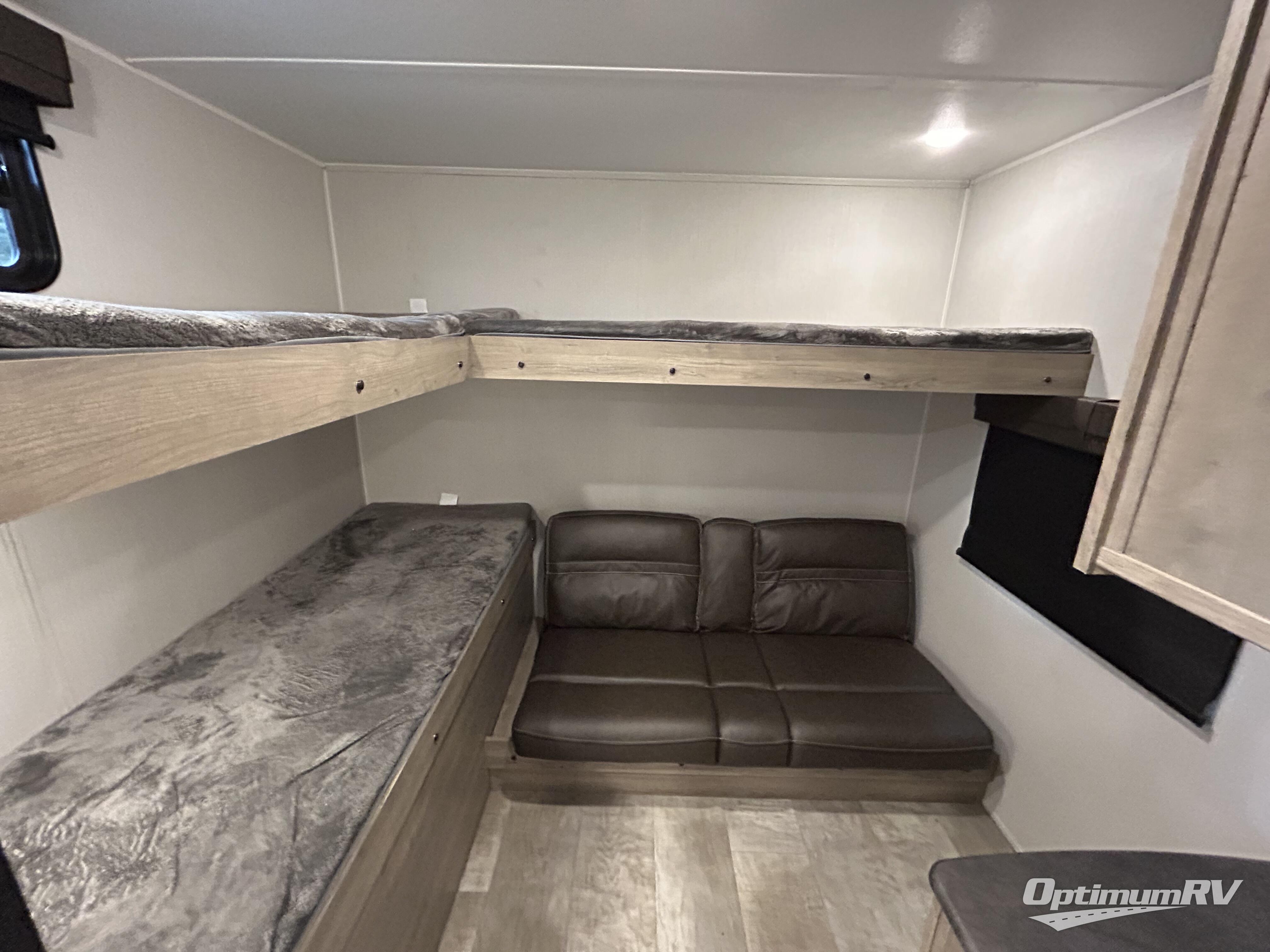 There's room for the whole family in this travel trailer! You will enjoy your own privacy with the front private bedroom which features a 60" x 74" RV queen bed with shirt closets on either side to hang your clothes, and a shelf above for your books or alarm clock. The kiddos can sleep on the set of 48" x 76" double bunk beds with storage underneath. They can even invite a friend or two to join in on the fun and sleep on either the sofa or booth dinette once converted. Everyone can freshen up in the rear corner bathroom with a 32" x 40" shower with a seat, and keep their bellies full with the three burner cooktop. You could even choose to add the optional outside mini kitchen if you enjoy cooking outdoors!