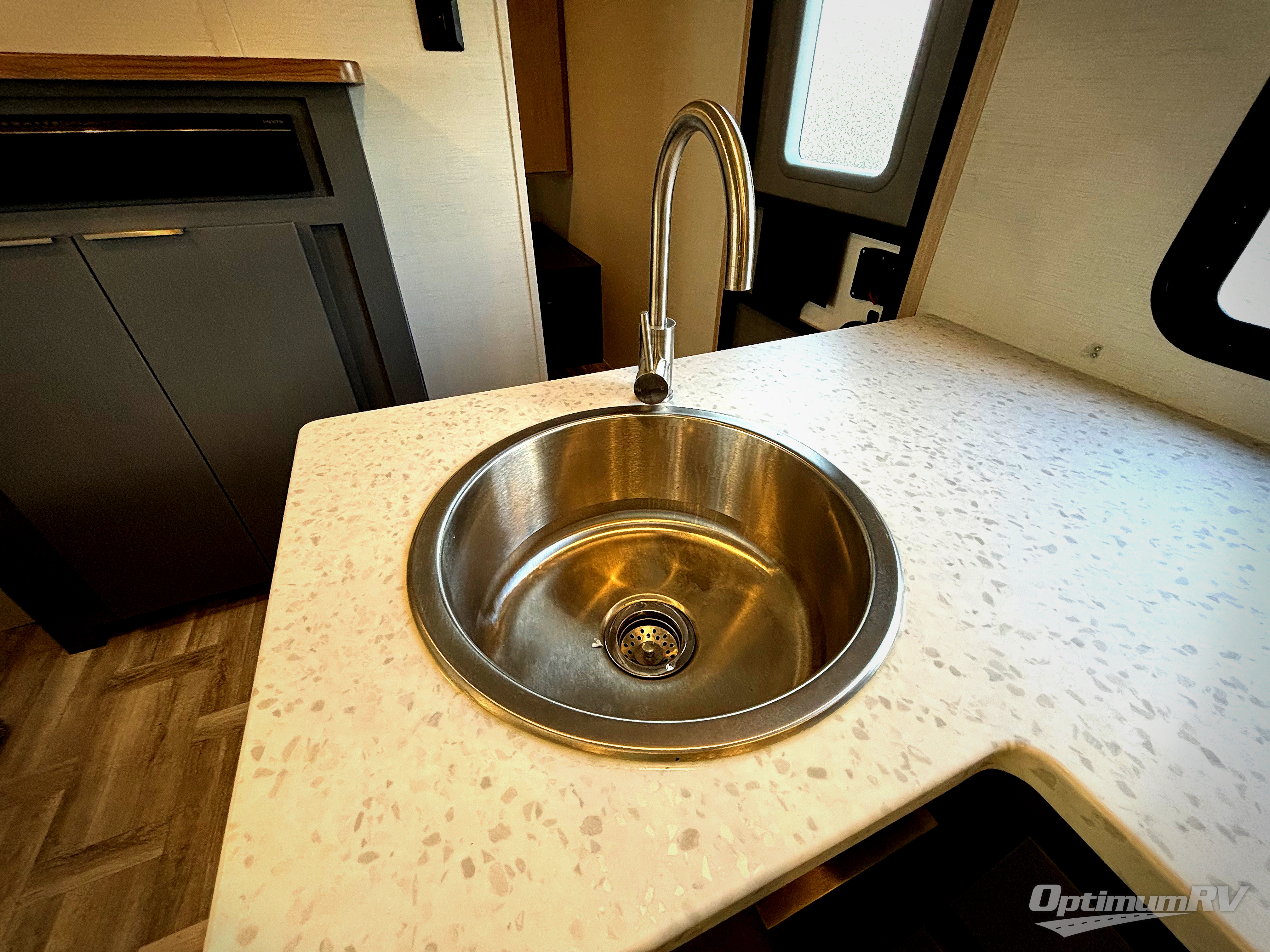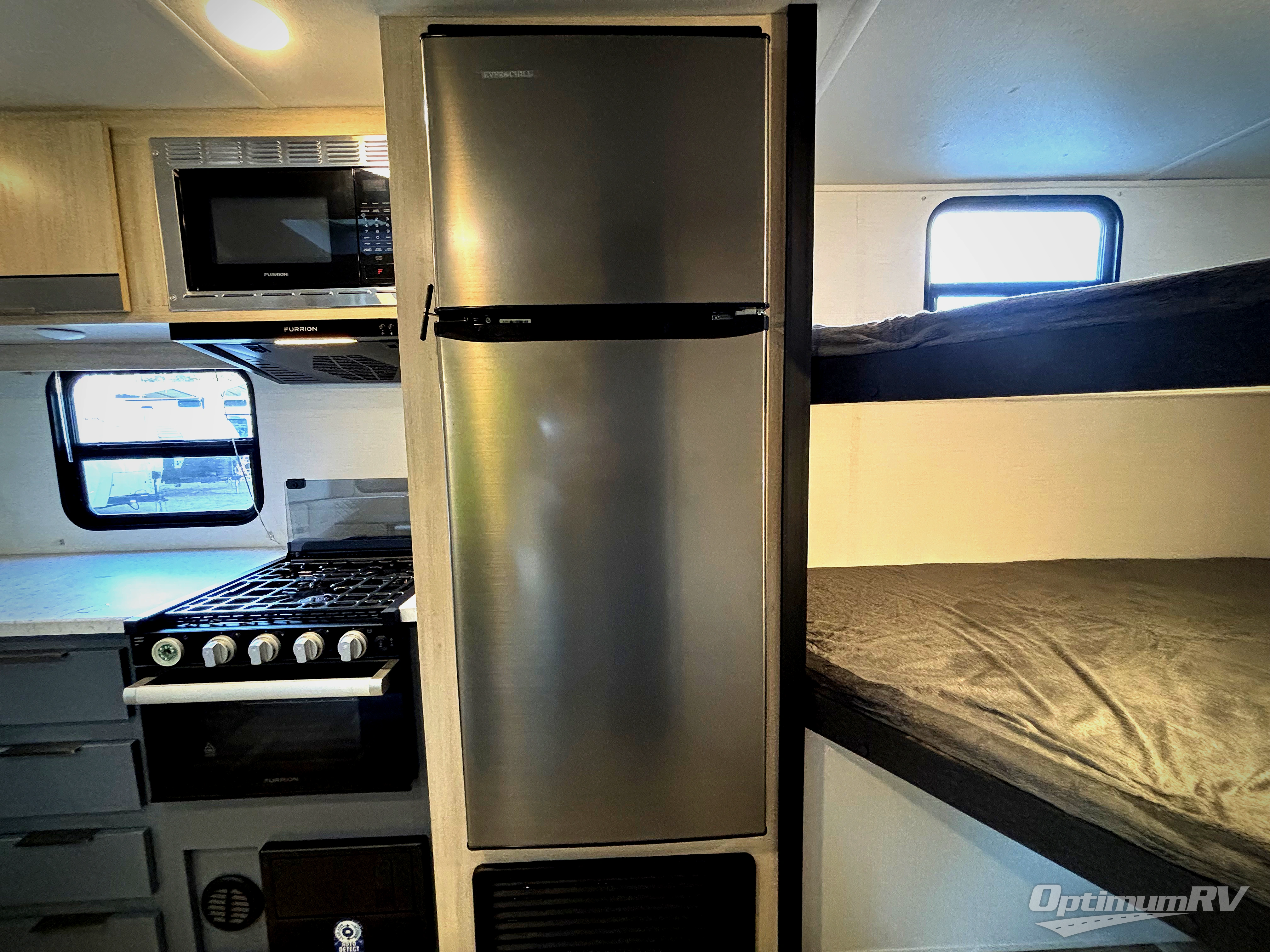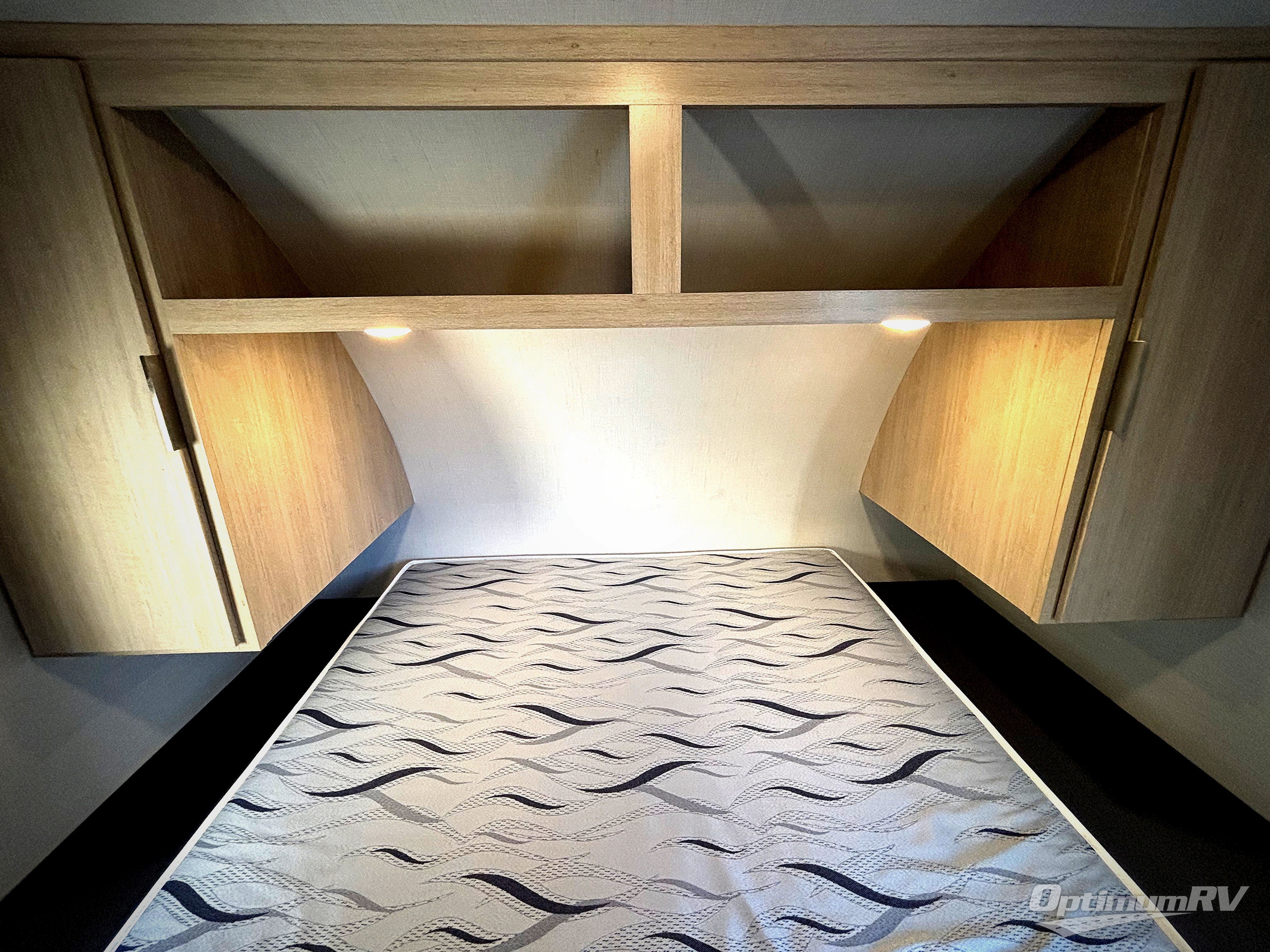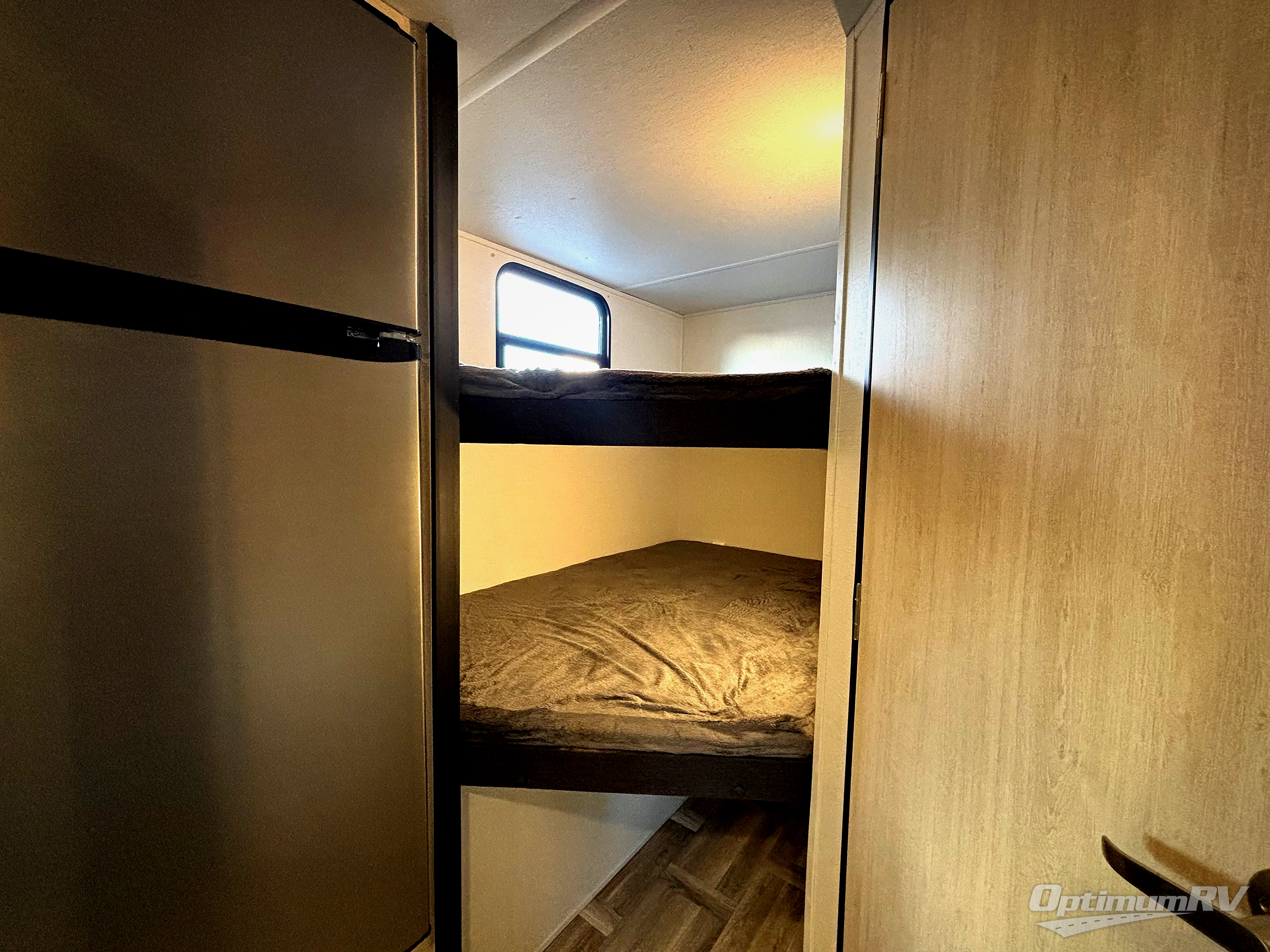 If you are looking for a trailer with double-size bunks and a private bedroom, you have found it! The queen bed and two wardrobes are behind a partial wall for added privacy. The double-size bunks are in the rear corner next to the full bathroom for convenience for the kids or your guests. And the L-shaped counter with a kitchen sink and full amenities sets up the cook nicely to be able to make meals for everyone. And you will love the extra floor space created by the booth dinette and sofa slide out.