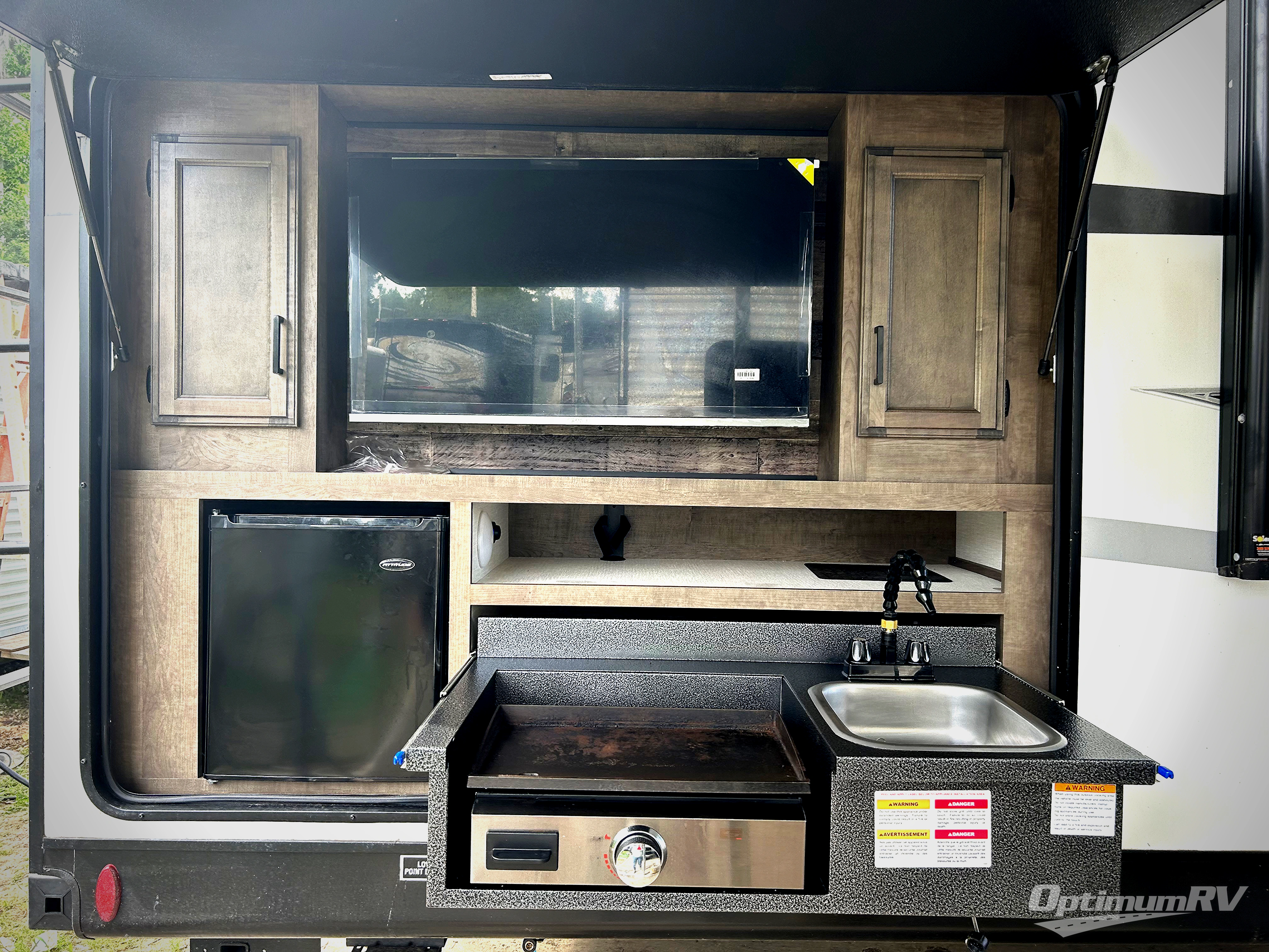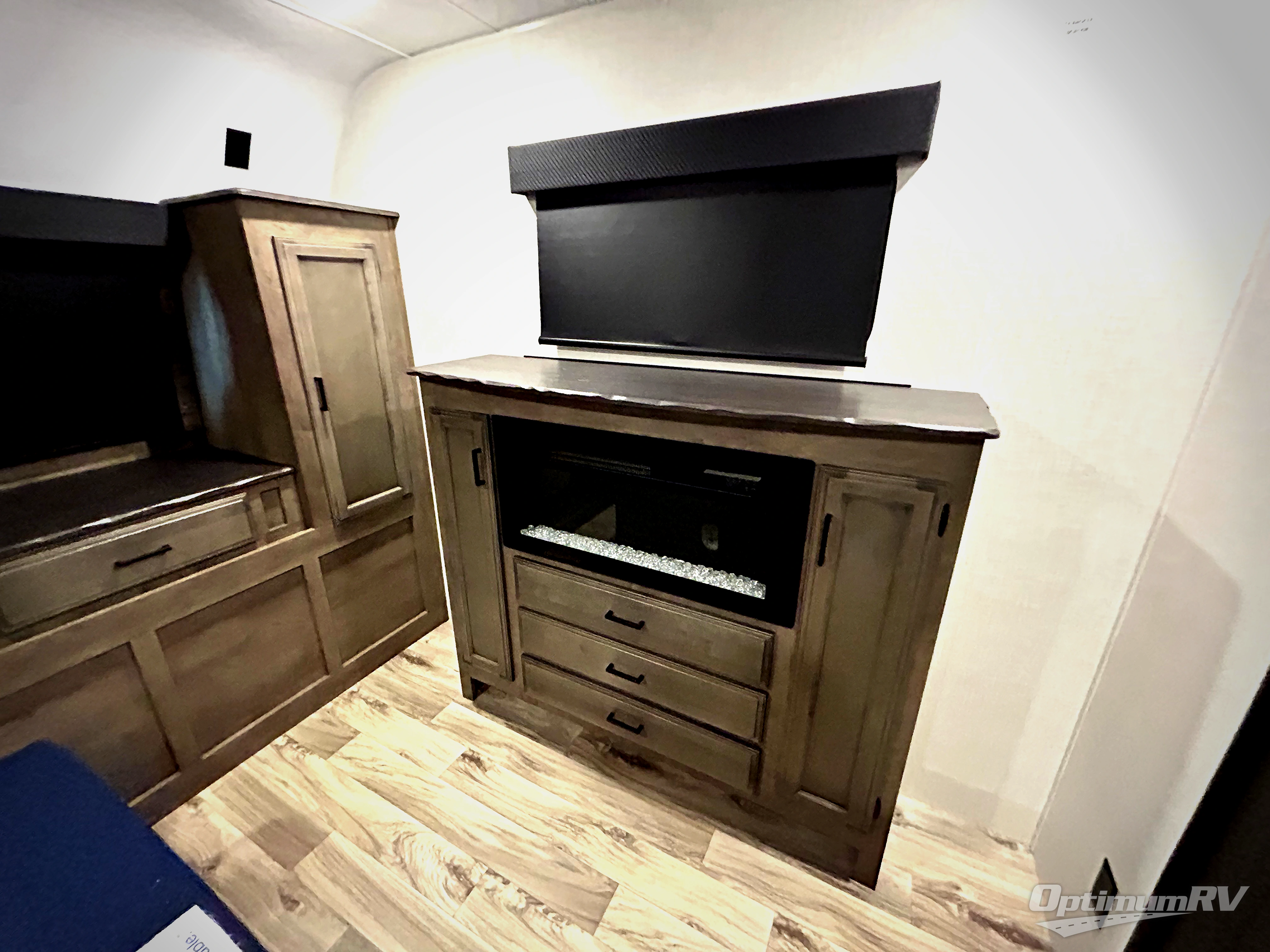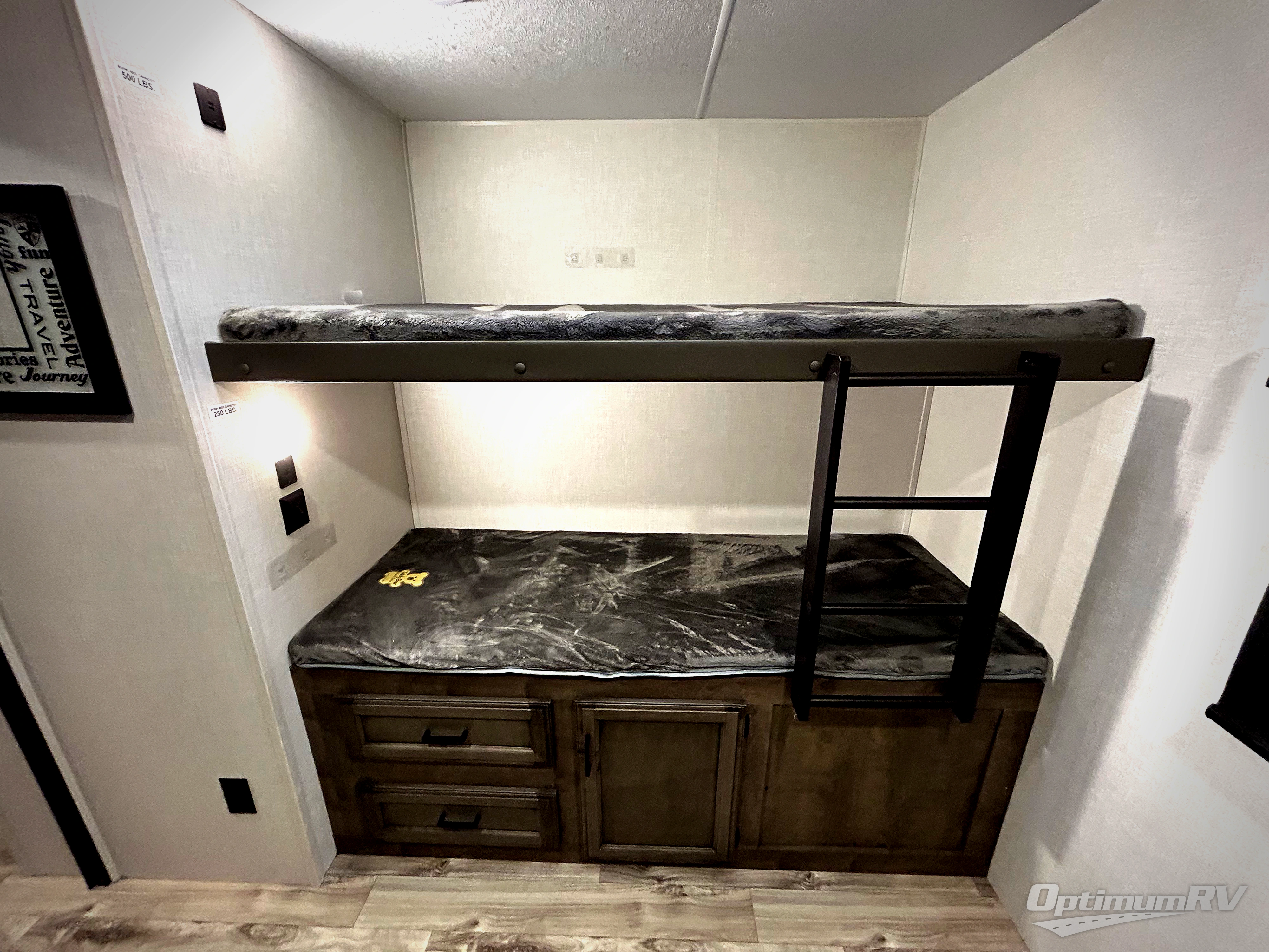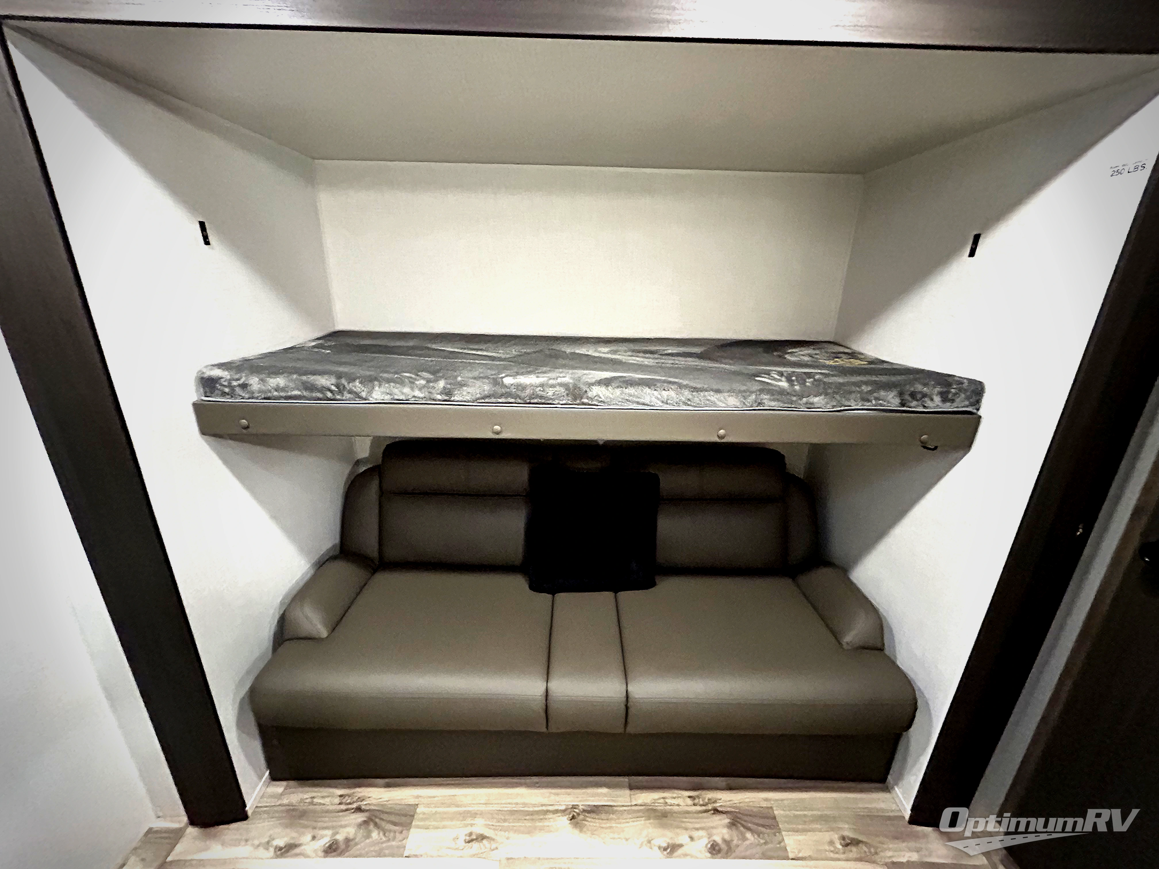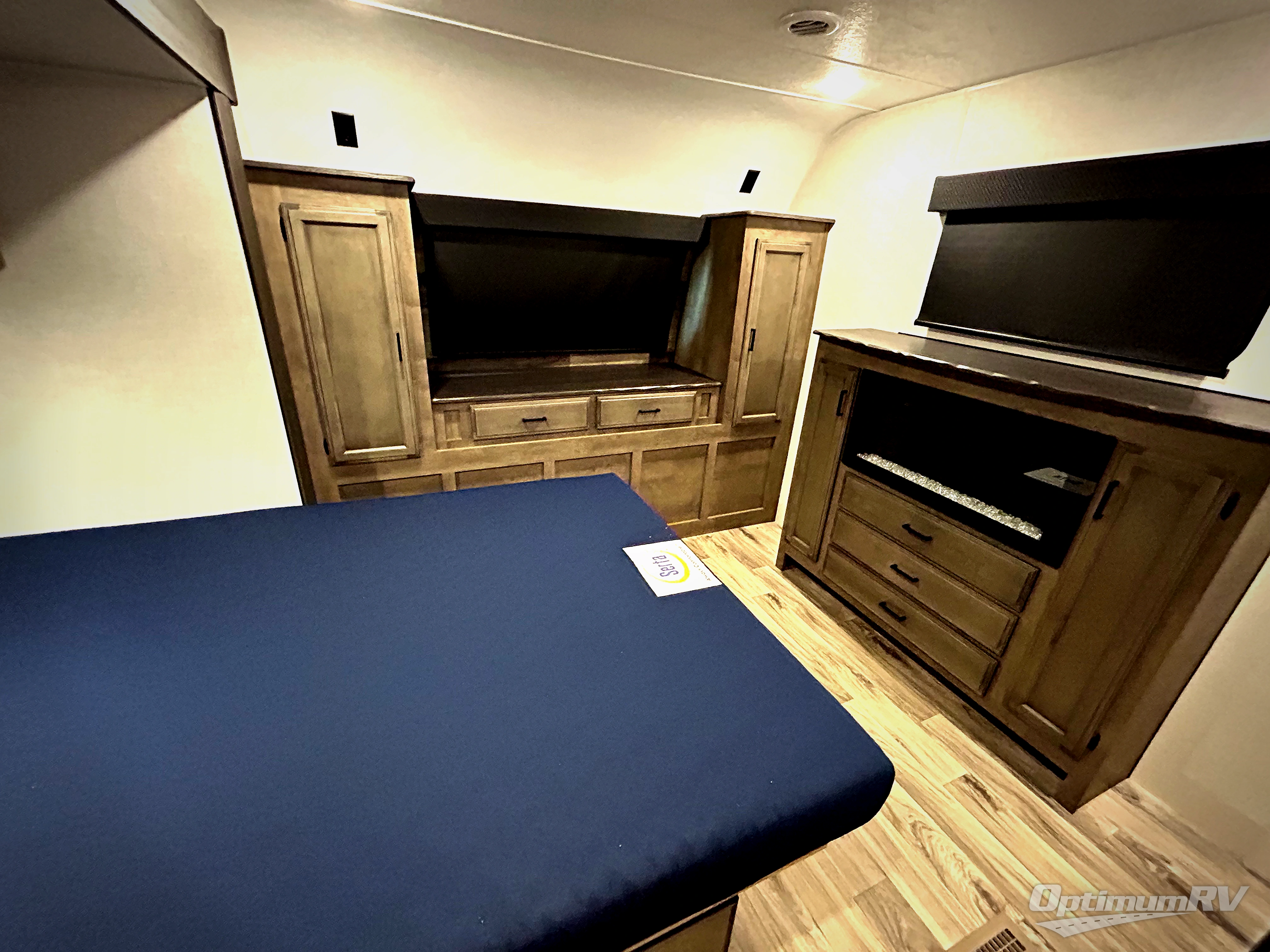 The whole family can camp together in this travel trailer! It features a rear private bunkhouse with a 28" x 70" top bunk above a 40" x 70" bottom bunk, a closet, and a 28" x 73" flip up top bunk above a 70" sofa with table slide. One of the dual entry doors leads directly into the half bathroom with fold-out aluminum steps so you can get back to having fun faster. The chef can prepare their best meals for the crew either indoors with the three burner cooktop or at the exterior campfire café with a 40" TV/DVD/speakers to entertain them while they cook. Everyone can gather together at the 42" grand dinette and 70" tri-fold sofa across from the entertainment center with a fireplace for a cozy evening. The dual entry bathroom is easy to access, especially for those staying in the front private bedroom. You even have a coat closet next to the main entrance to limit the clutter!