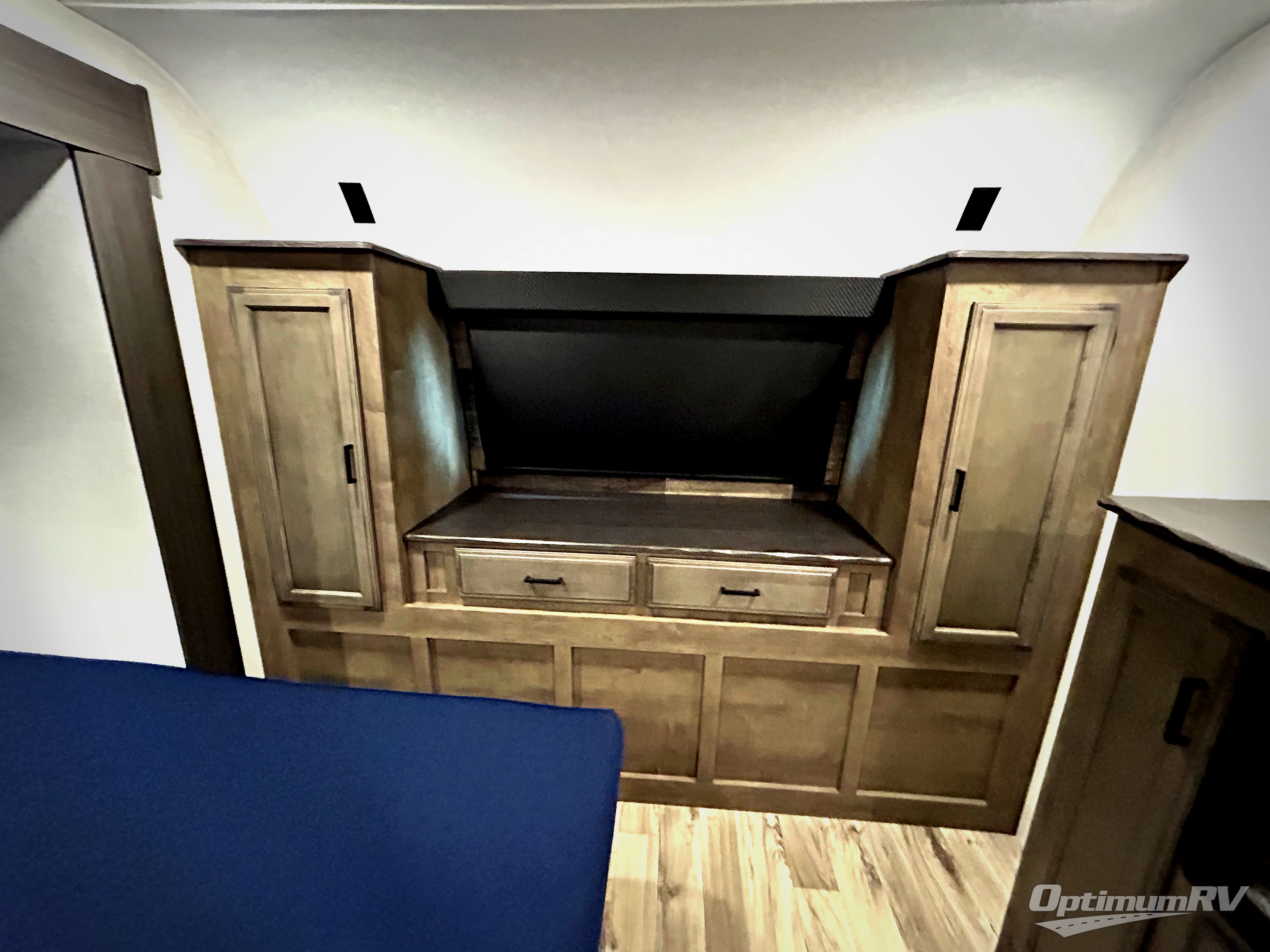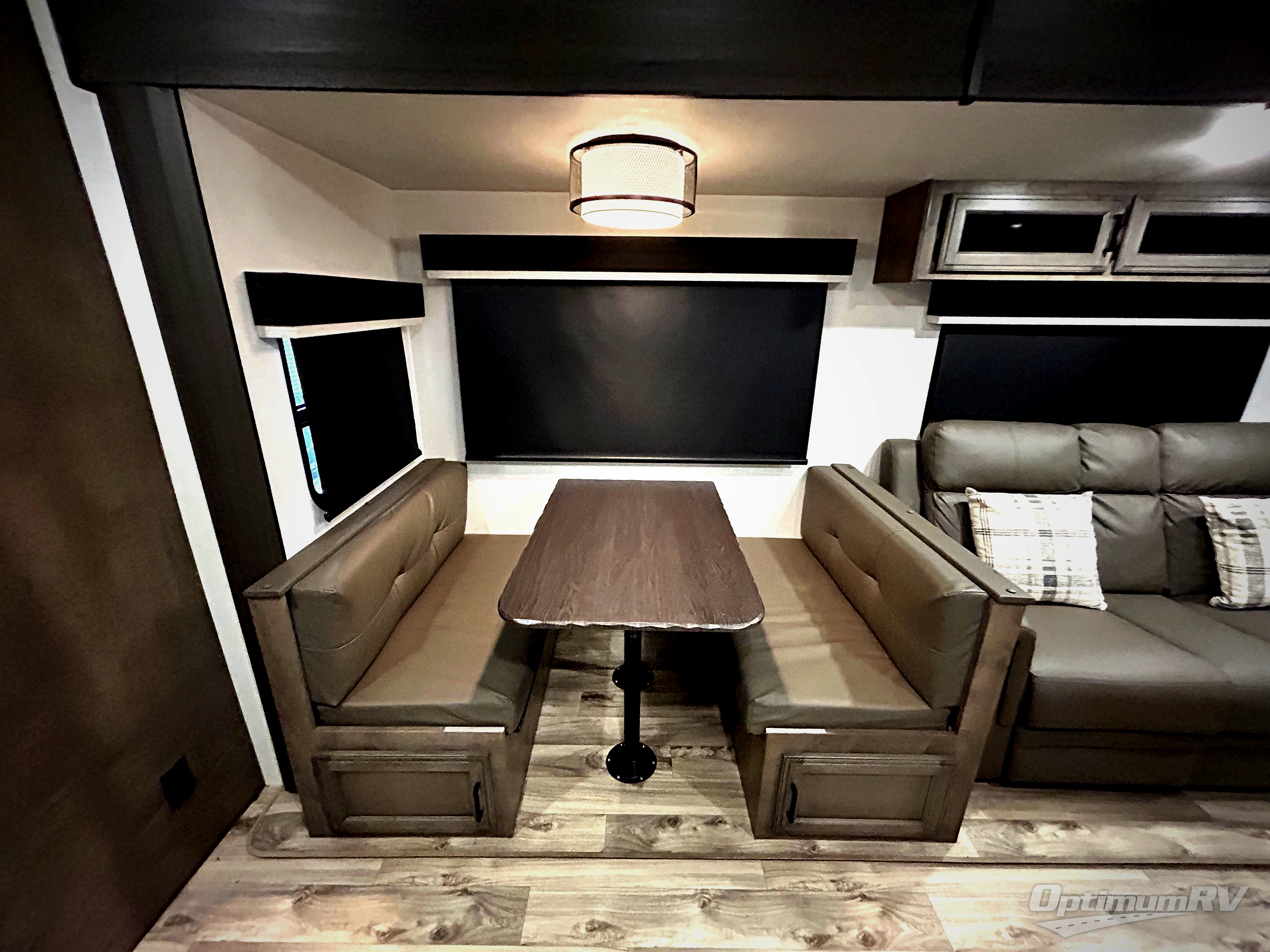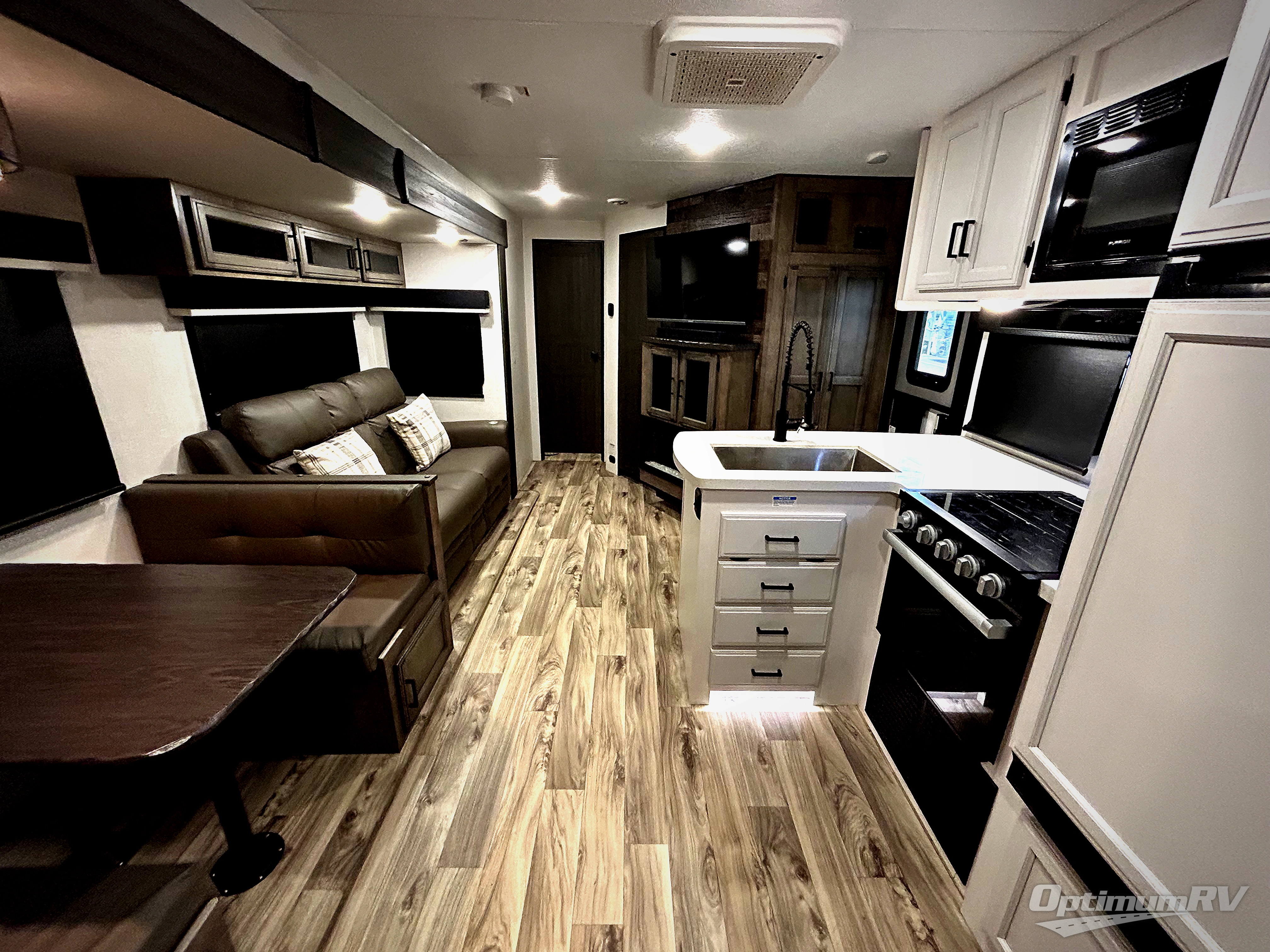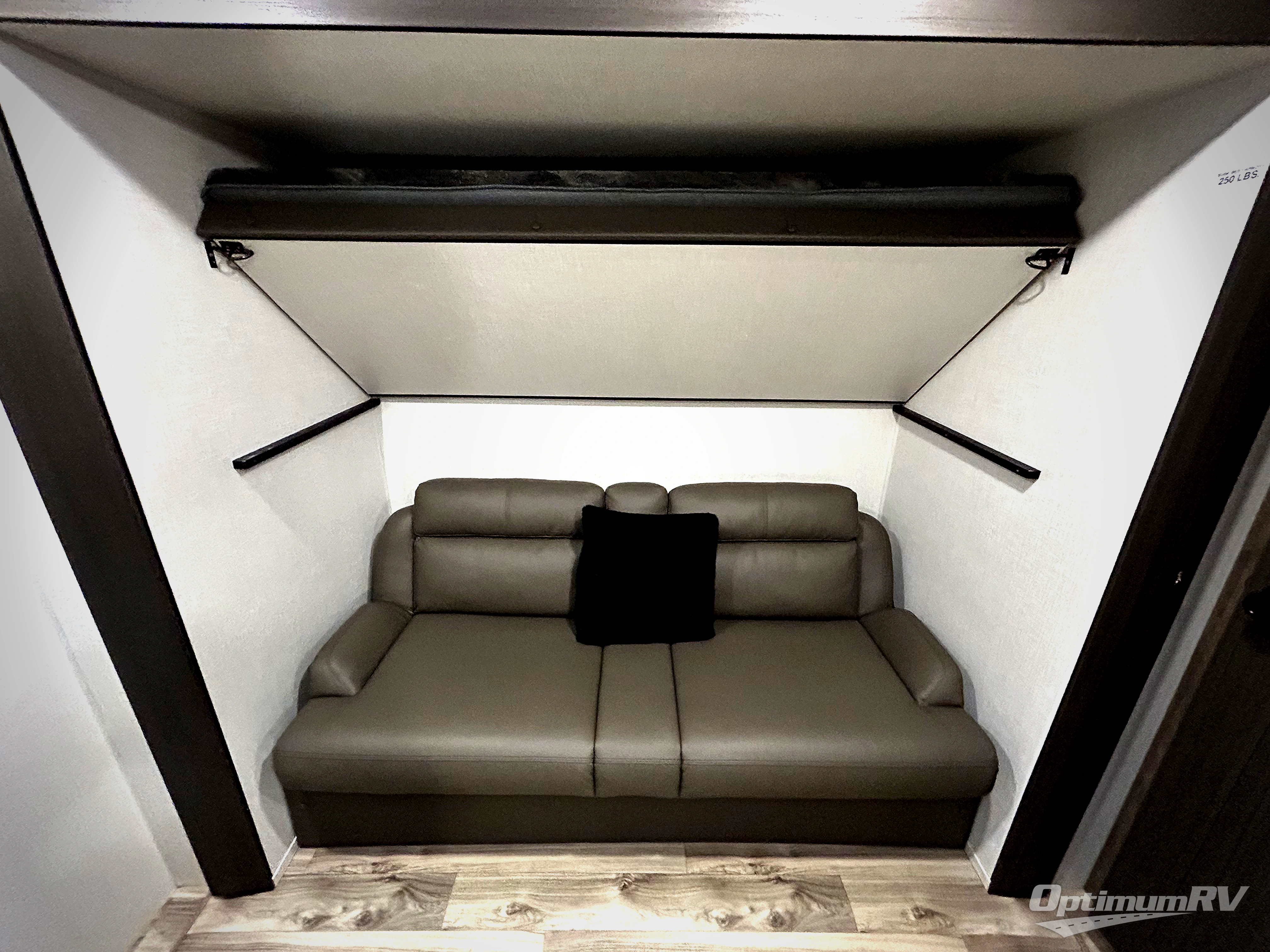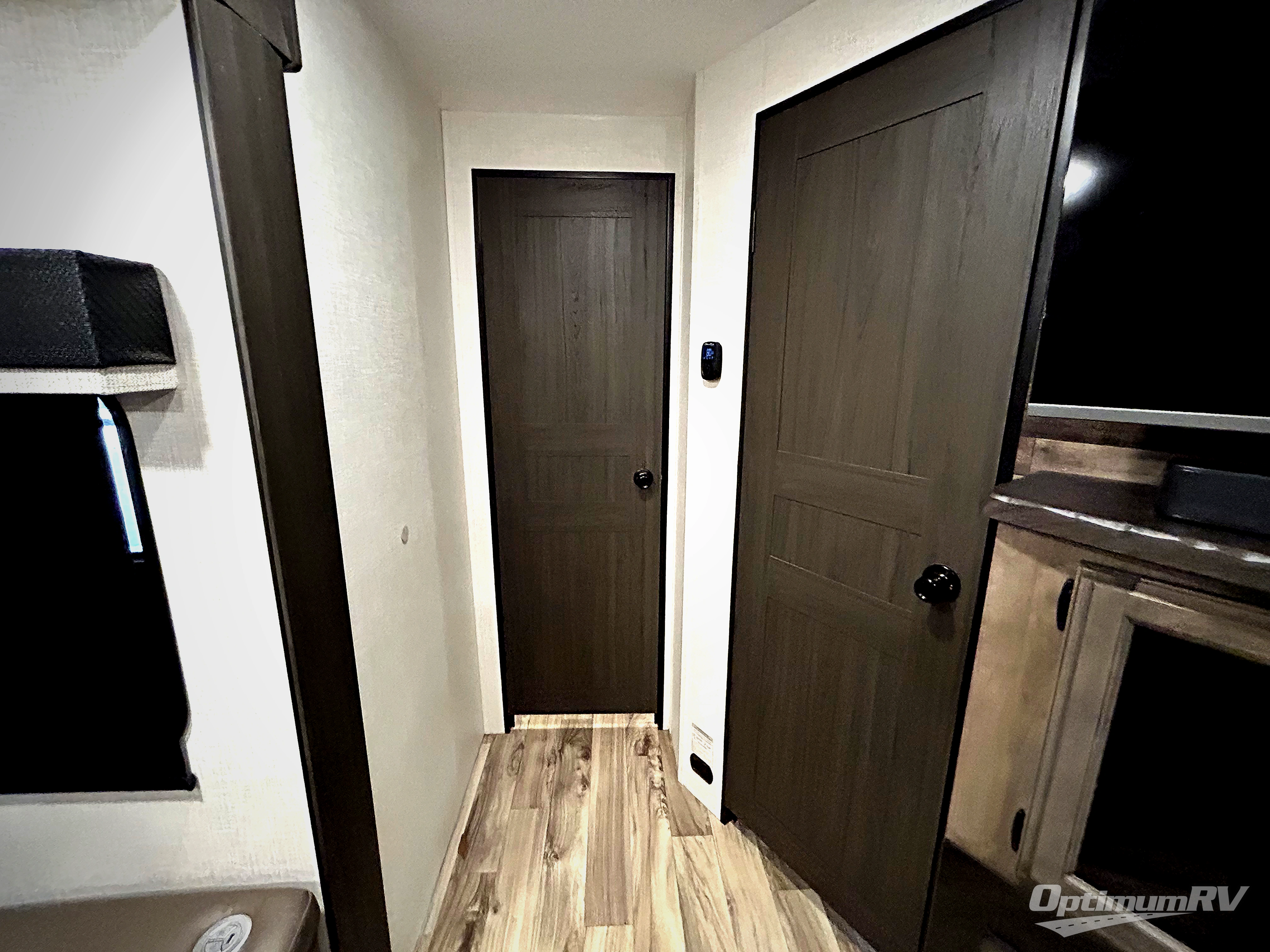 The whole family can camp together in this travel trailer! It features a rear private bunkhouse with a 28" x 70" top bunk above a 40" x 70" bottom bunk, a closet, and a 28" x 73" flip up top bunk above a 70" sofa with table slide. One of the dual entry doors leads directly into the half bathroom with fold-out aluminum steps so you can get back to having fun faster. The chef can prepare their best meals for the crew either indoors with the three burner cooktop or at the exterior campfire café with a 40" TV/DVD/speakers to entertain them while they cook. Everyone can gather together at the 42" grand dinette and 70" tri-fold sofa across from the entertainment center with a fireplace for a cozy evening. The dual entry bathroom is easy to access, especially for those staying in the front private bedroom. You even have a coat closet next to the main entrance to limit the clutter!
