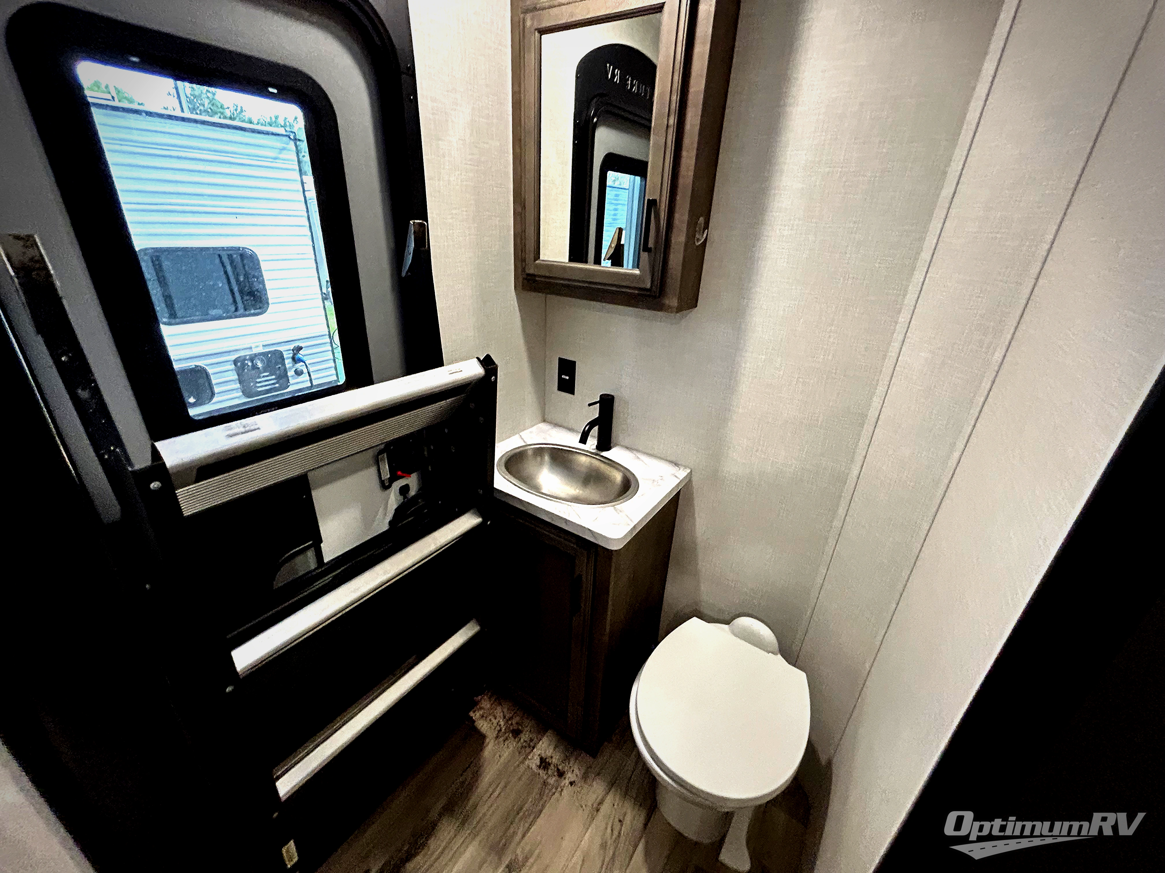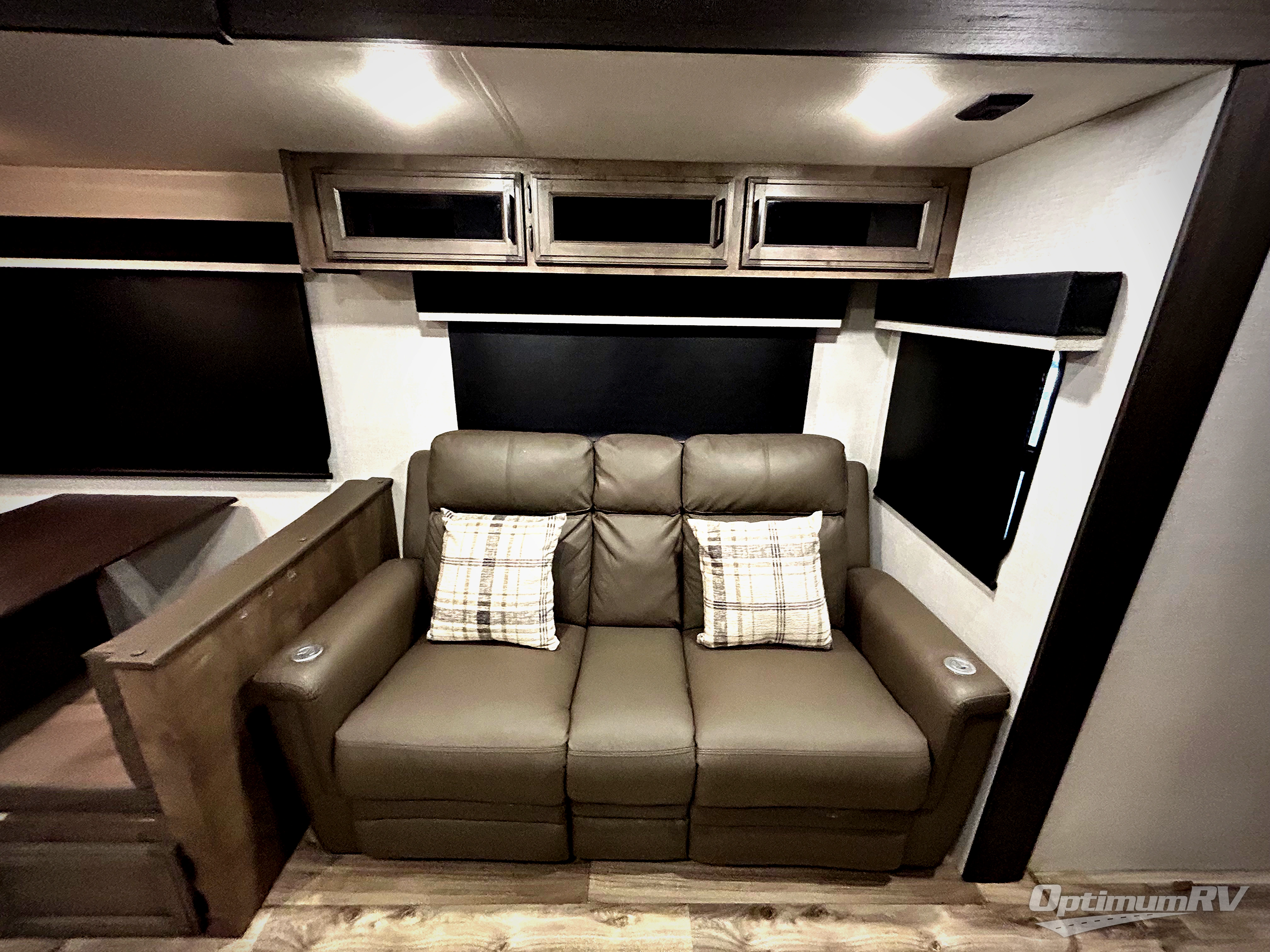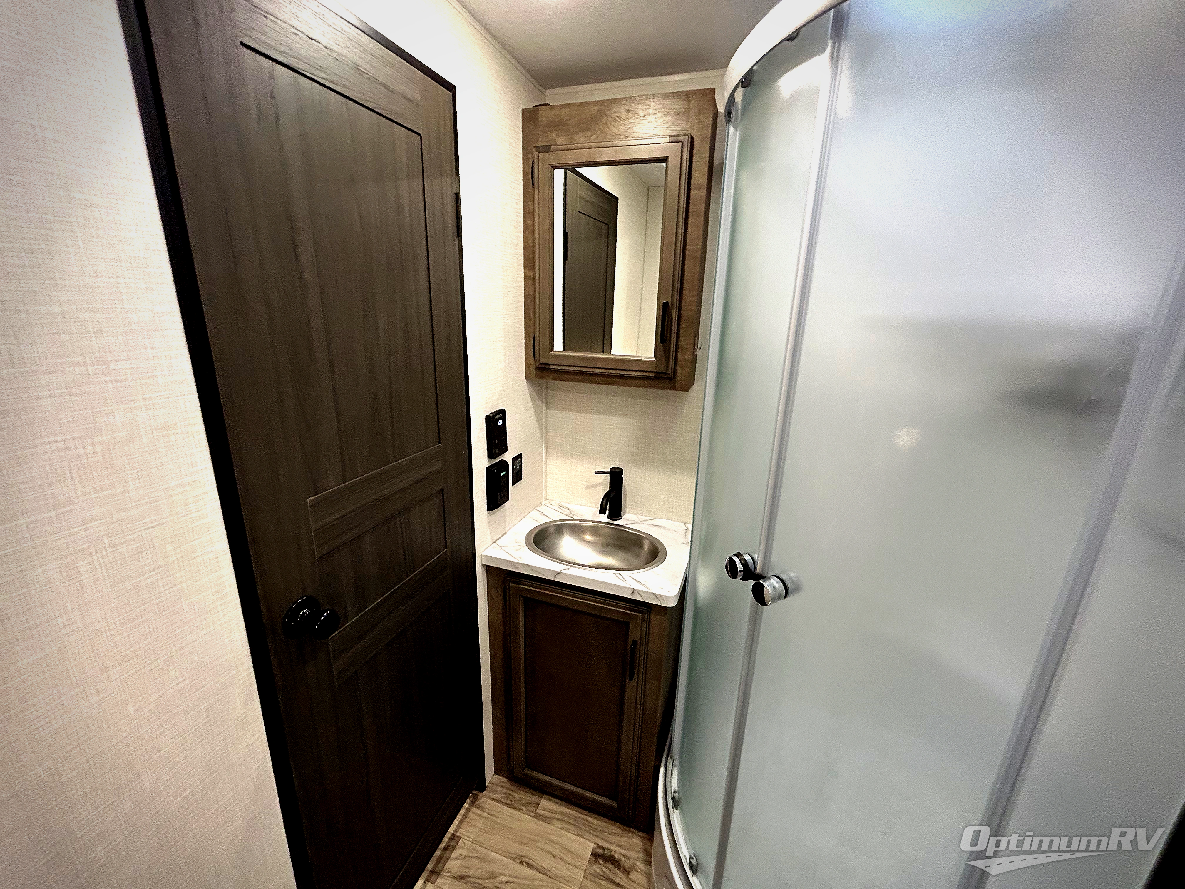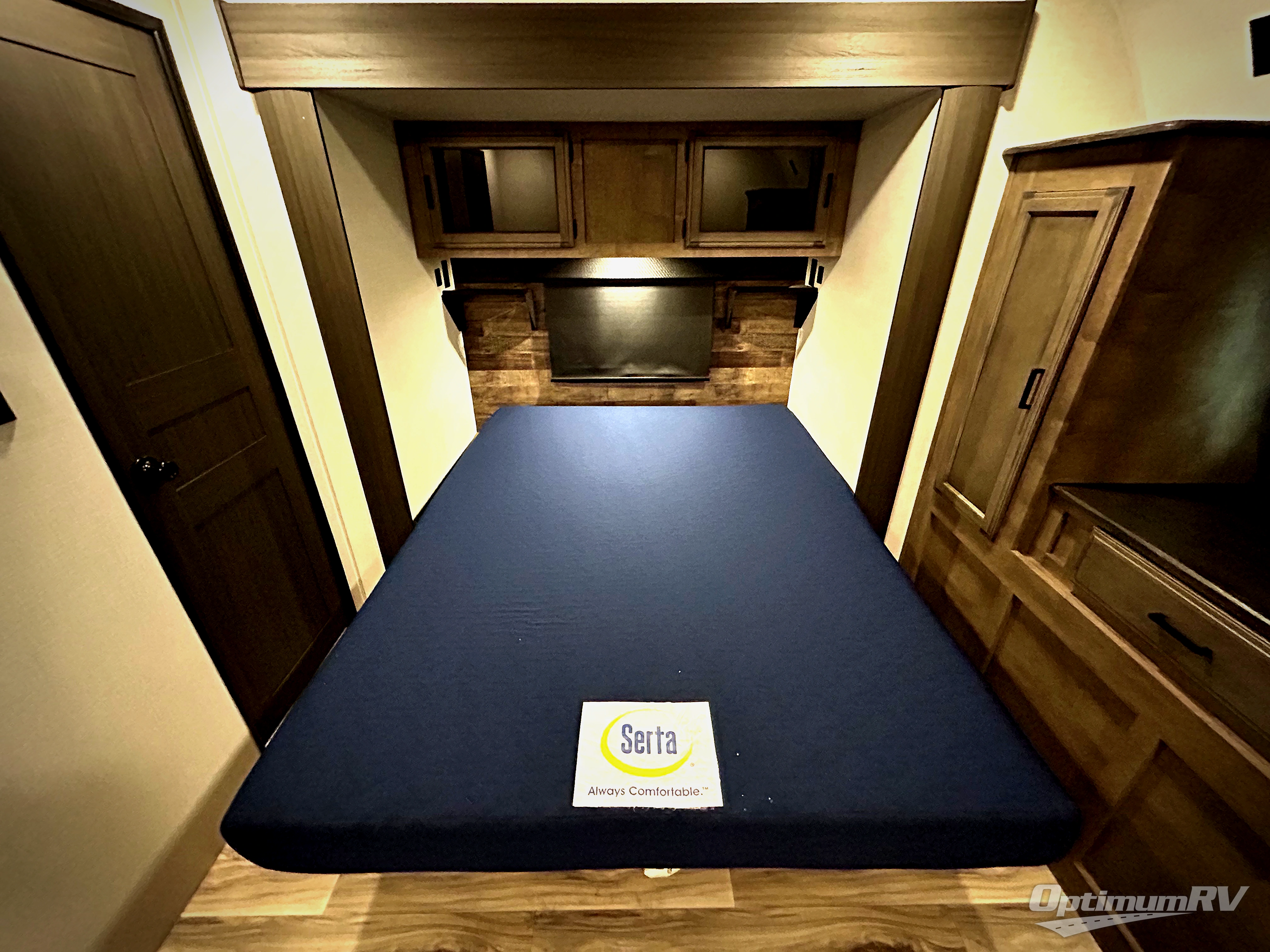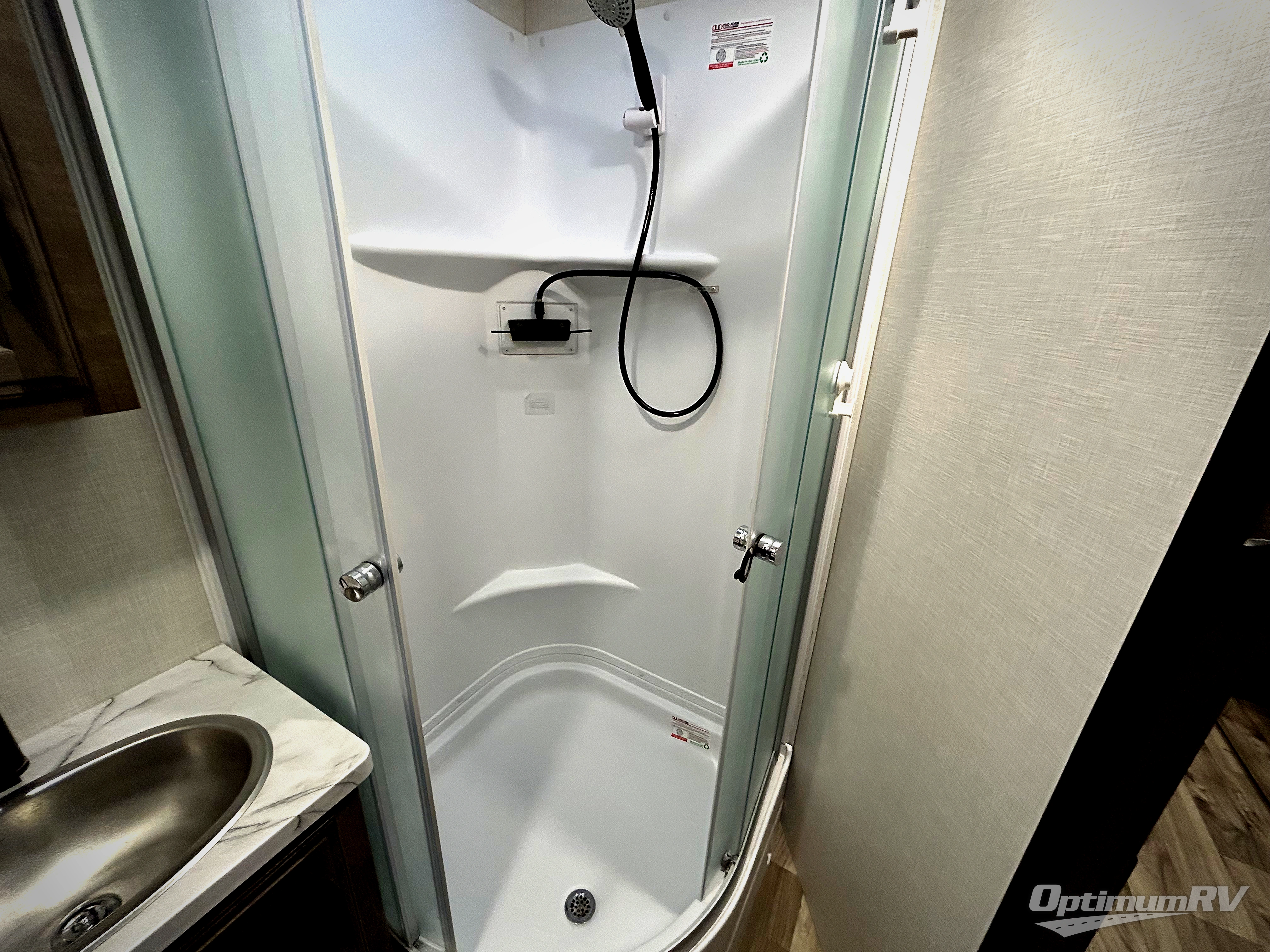 The whole family can camp together in this travel trailer! It features a rear private bunkhouse with a 28" x 70" top bunk above a 40" x 70" bottom bunk, a closet, and a 28" x 73" flip up top bunk above a 70" sofa with table slide. One of the dual entry doors leads directly into the half bathroom with fold-out aluminum steps so you can get back to having fun faster. The chef can prepare their best meals for the crew either indoors with the three burner cooktop or at the exterior campfire café with a 40" TV/DVD/speakers to entertain them while they cook. Everyone can gather together at the 42" grand dinette and 70" tri-fold sofa across from the entertainment center with a fireplace for a cozy evening. The dual entry bathroom is easy to access, especially for those staying in the front private bedroom. You even have a coat closet next to the main entrance to limit the clutter!