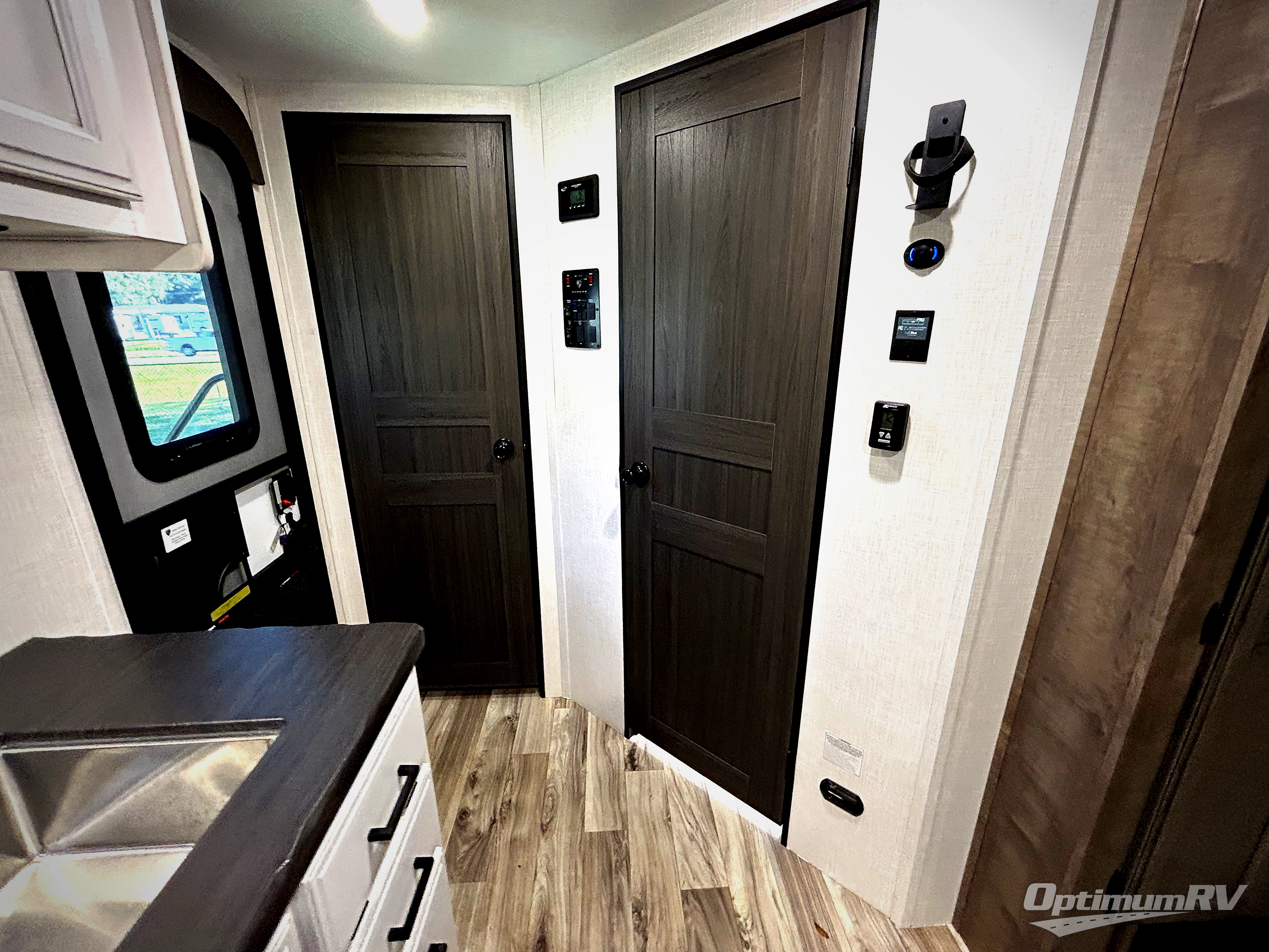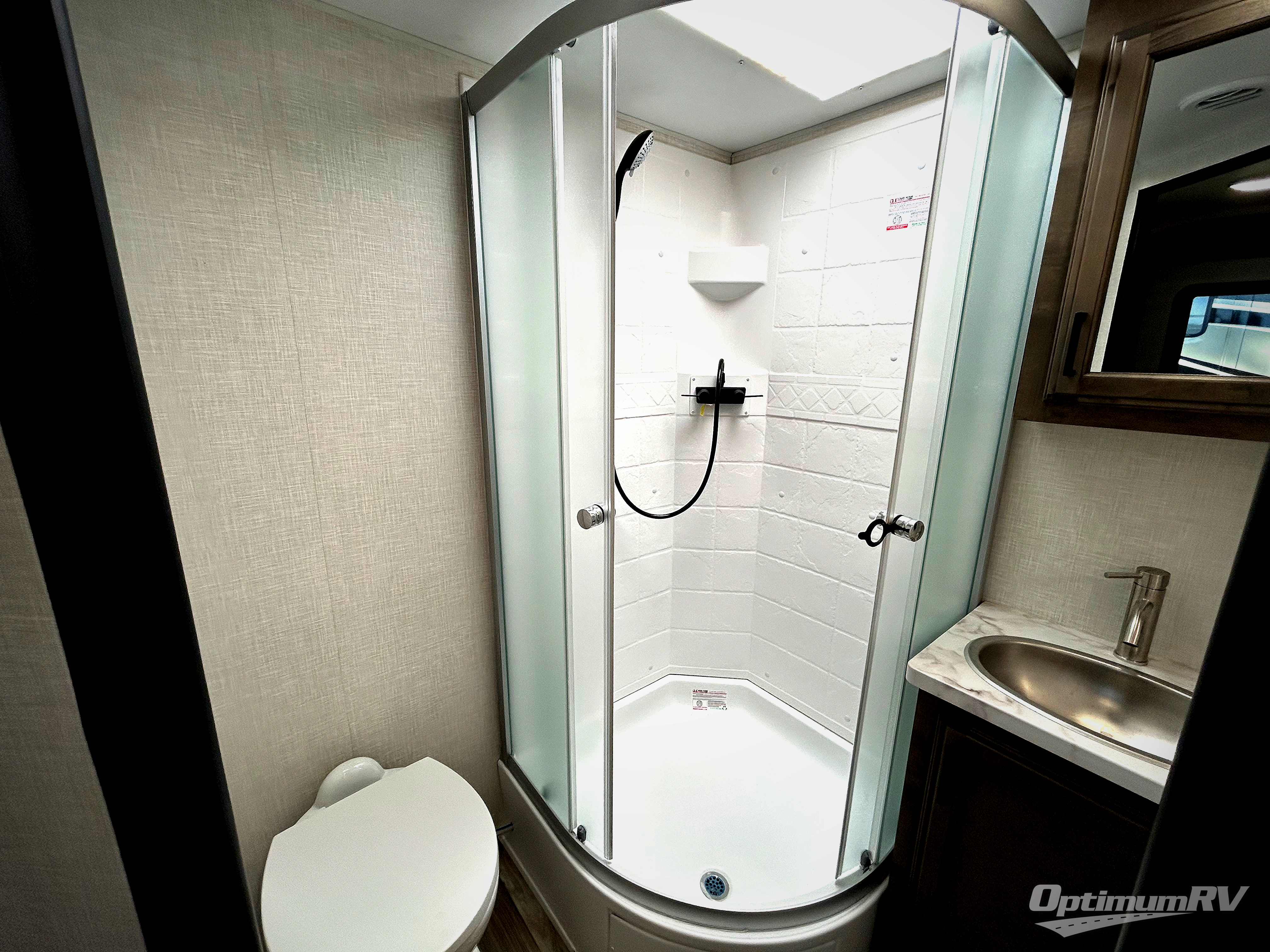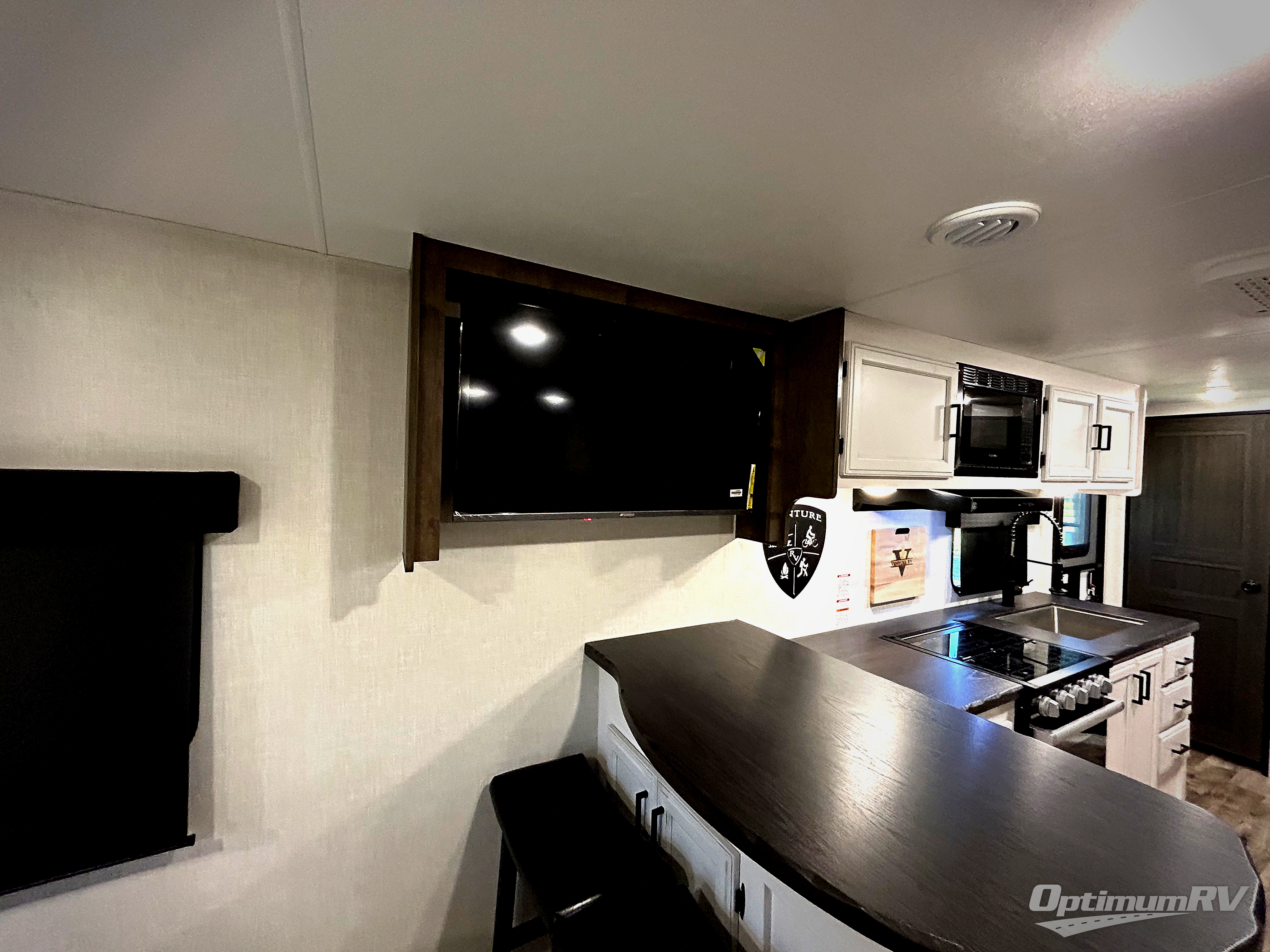 This travel trailer is perfect for two people who wish to escape the hustle and bustle of everyday life! You will enjoy a good night's rest on the sleep tight queen bed with shelves and wardrobes on either side to hang your clothes, and if you want an extra guest or two to tag along then you can transform the 88" x 42" U-shaped dinette into an extra sleeping space. Everyone will stay clean and refreshed with a rear corner bathroom that has a 34" radius shower. Grab your dry goods from the walk-in pantry, your perishables from the 10 cu. ft. refrigerator, and cook them all on the three burner cooktop. The bar top with two bar stools is the perfect place to enjoy your morning coffee and eggs!