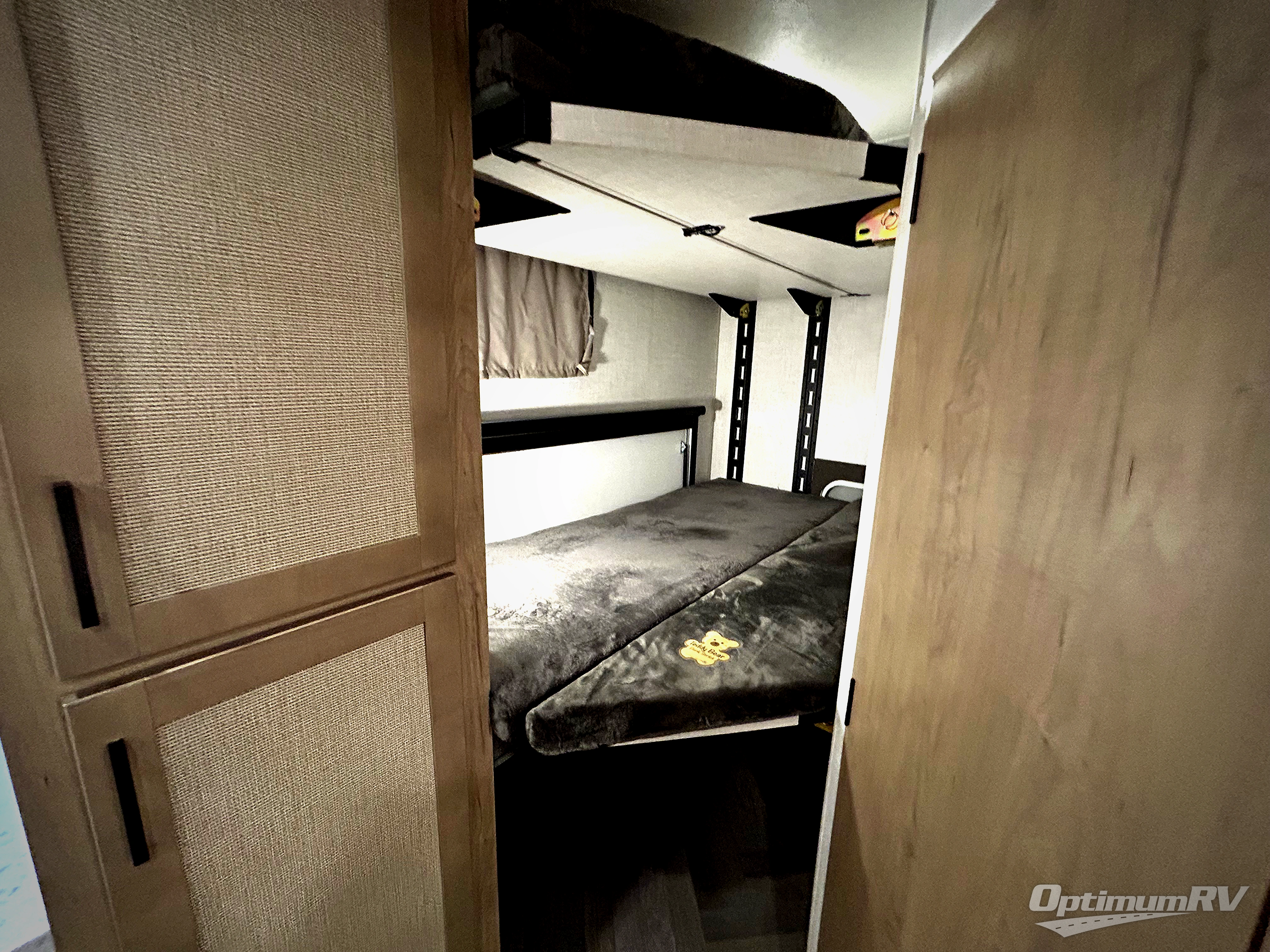 - You'll love every minute spent in this spacious travel trailer that can sleep up to six. The patent-pending repositionable EmberTrack E-Track bunk/storage system includes 74" x 45" cargo space, and there are multiple single/double bunk configurations to fit your needs. The front walk-around true residential queen bed includes dual nightstands and dual wardrobes, plus a privacy curtain if you have guests staying over. This E-Series kitchen includes an air fryer convection microwave, a two burner cooktop, plus a breakfast bar with bar stools so you can visit with the chef as they cook meals. A legless dinette or optional theater seating will provide a place to dine, or you can take your plate outdoors to sit under the 14' power awning with a dimmable LED light. You'll also find a pass-through storage outside, along with a docking station and a kayak/bike storage door!