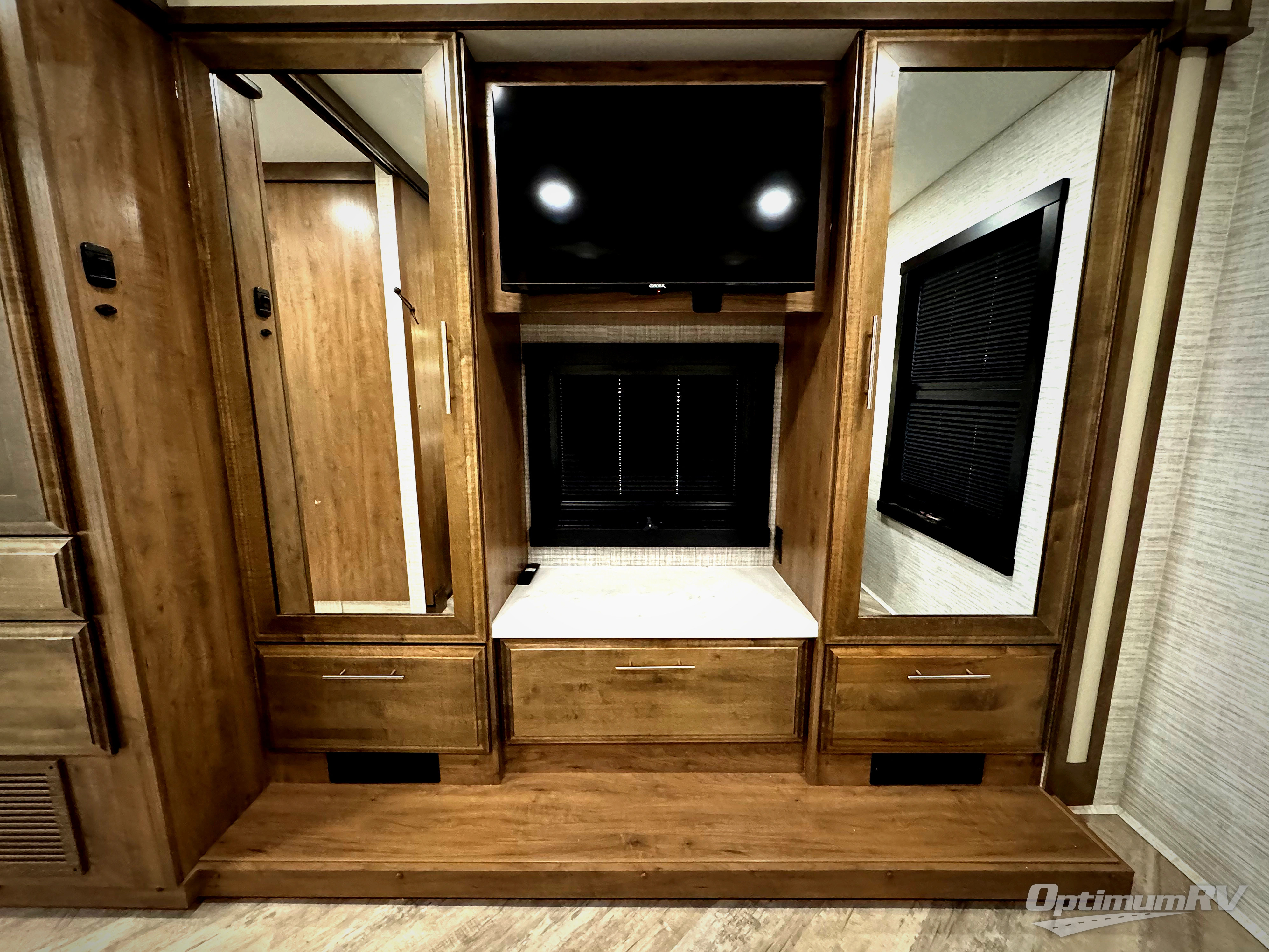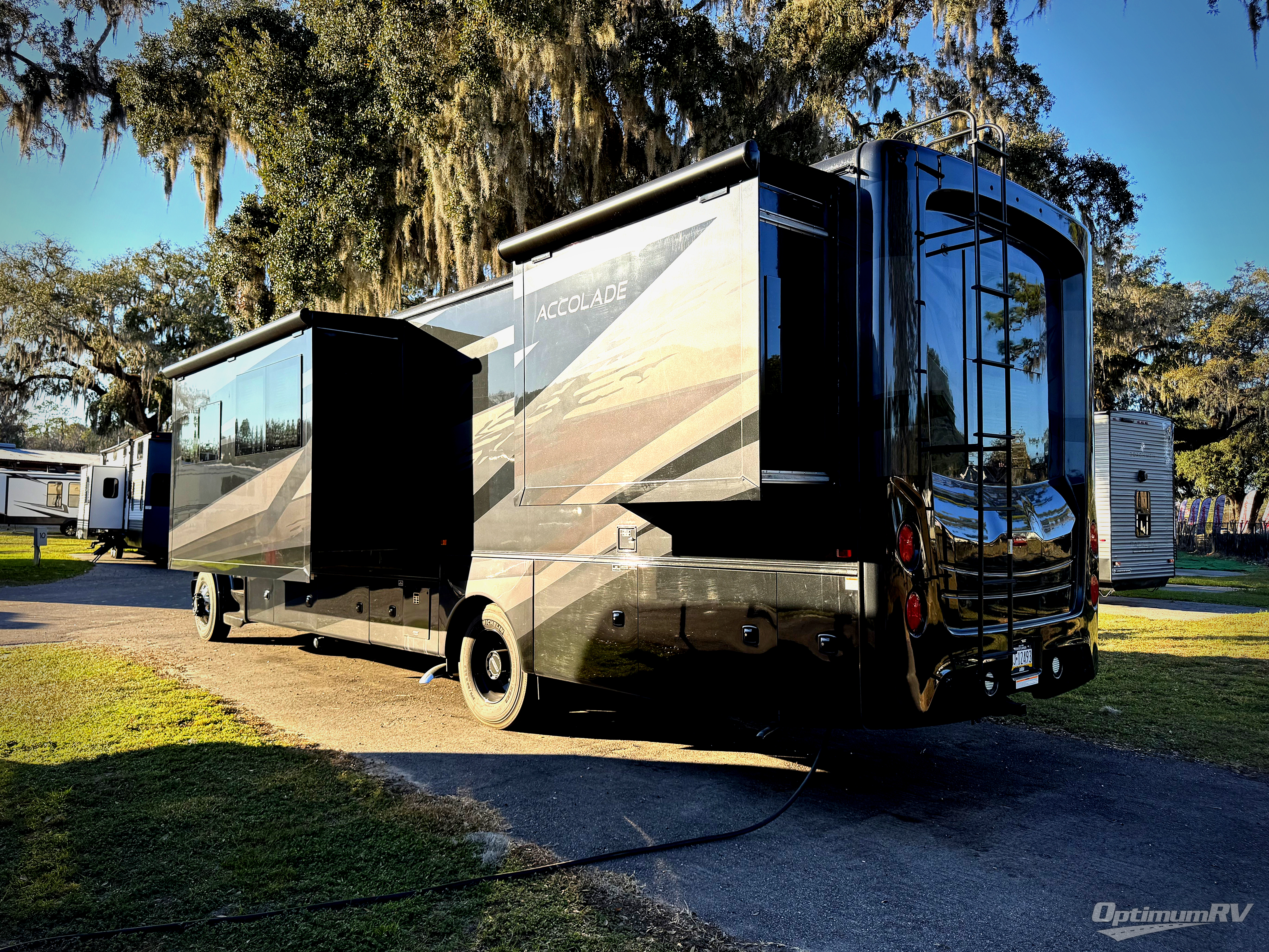 If you liked the Accolade model 37L, but don't need the extra sleeping space from the bunks, this 37M Accolade coach is perfect for you! You'll still have the cab-over bunk, the full-wall slide, and the rear private bedroom. The power head lift king bed will allow you to sit up and read at night, or you may just want to watch a movie on the bedroom LED TV. The chef of your group can prepare meals on the two burner induction cooktop, or use the residential-size convection microwave, and there is a residential refrigerator just like at home. Relaxing each day will be a breeze with the power theater seating across from the 50" TV lift and second sofa, and you can dine at the booth dinette. There is also a hutch for added storage space, and an impressive 23' power awning with LED lights!