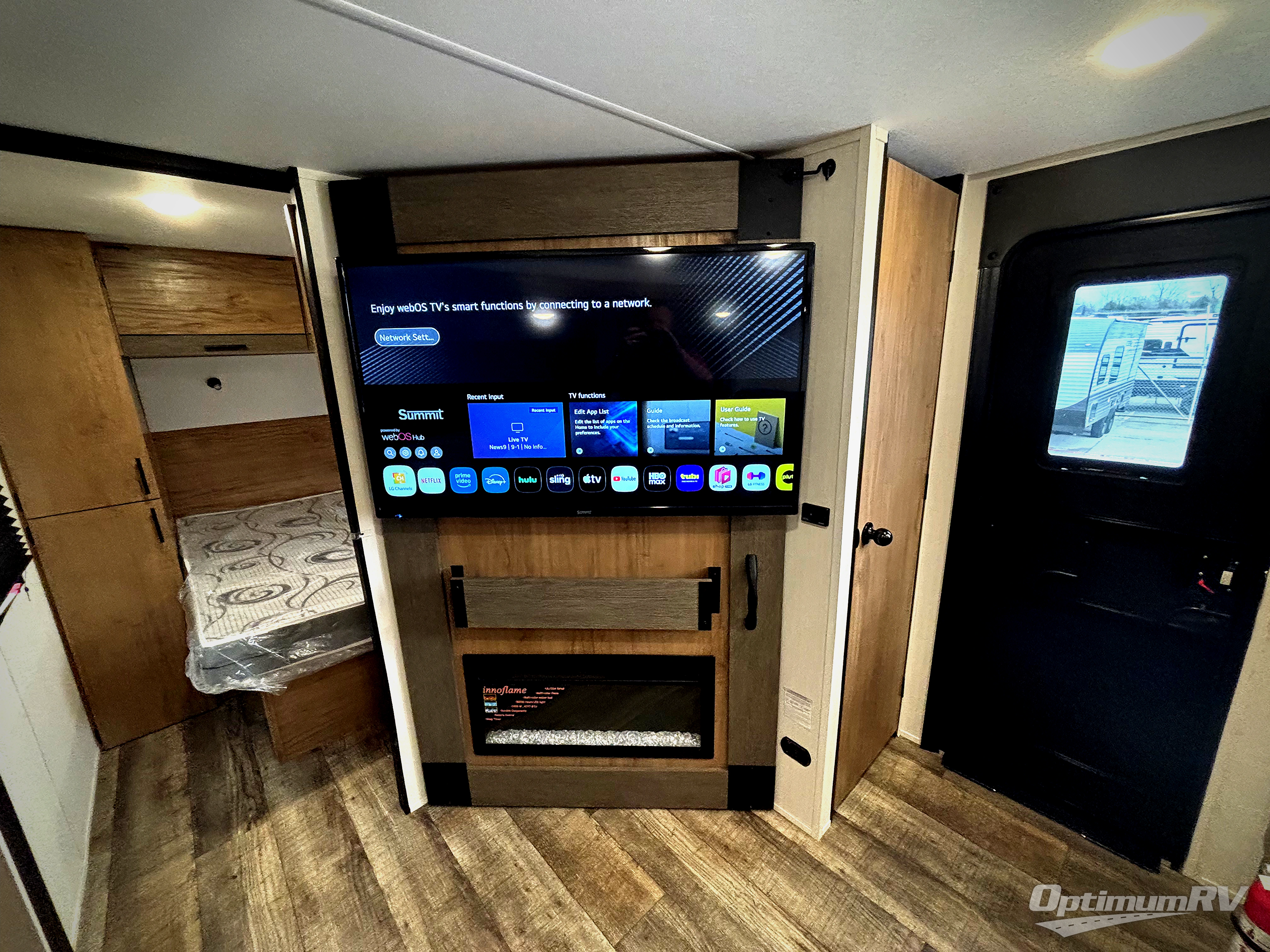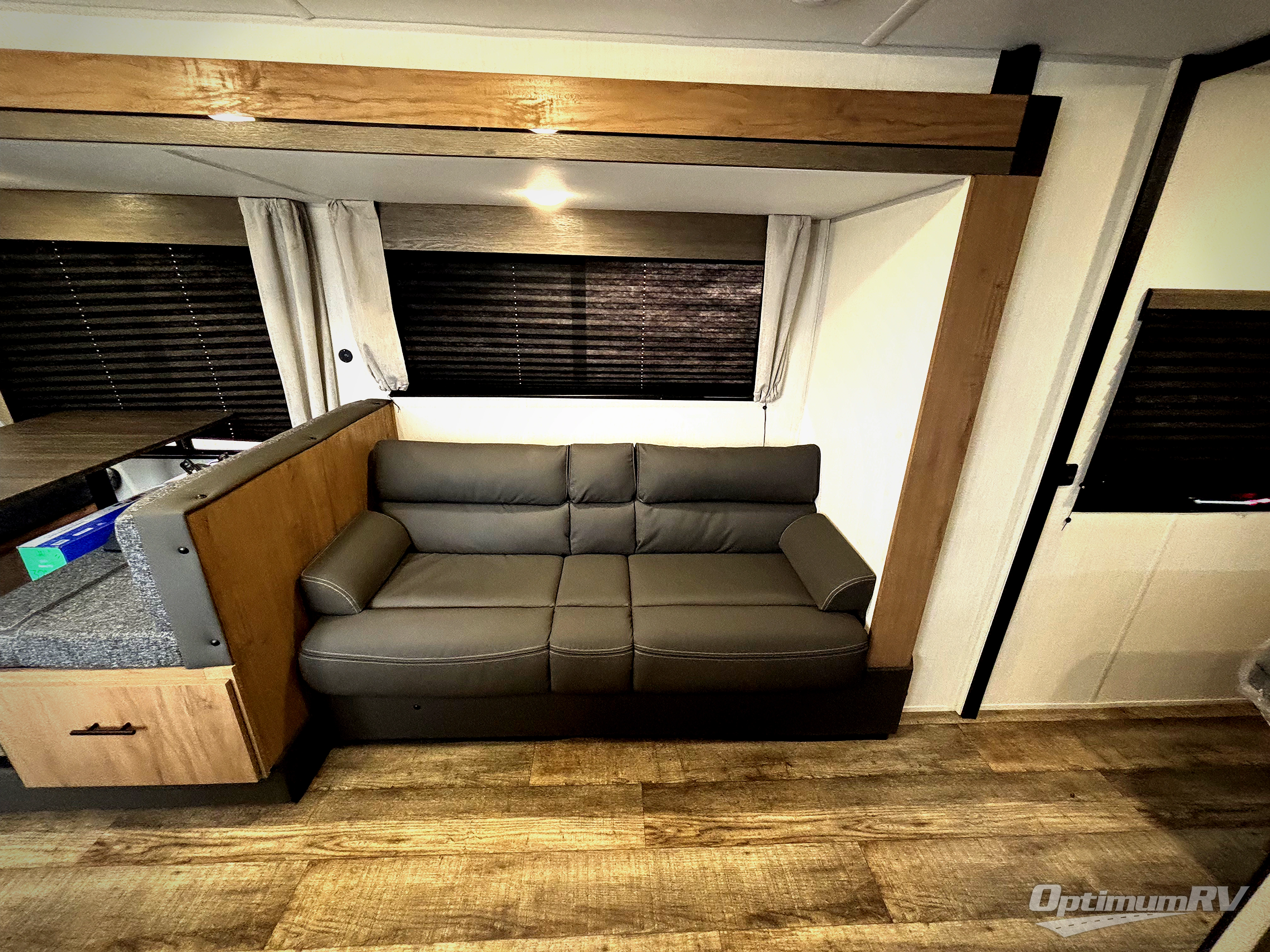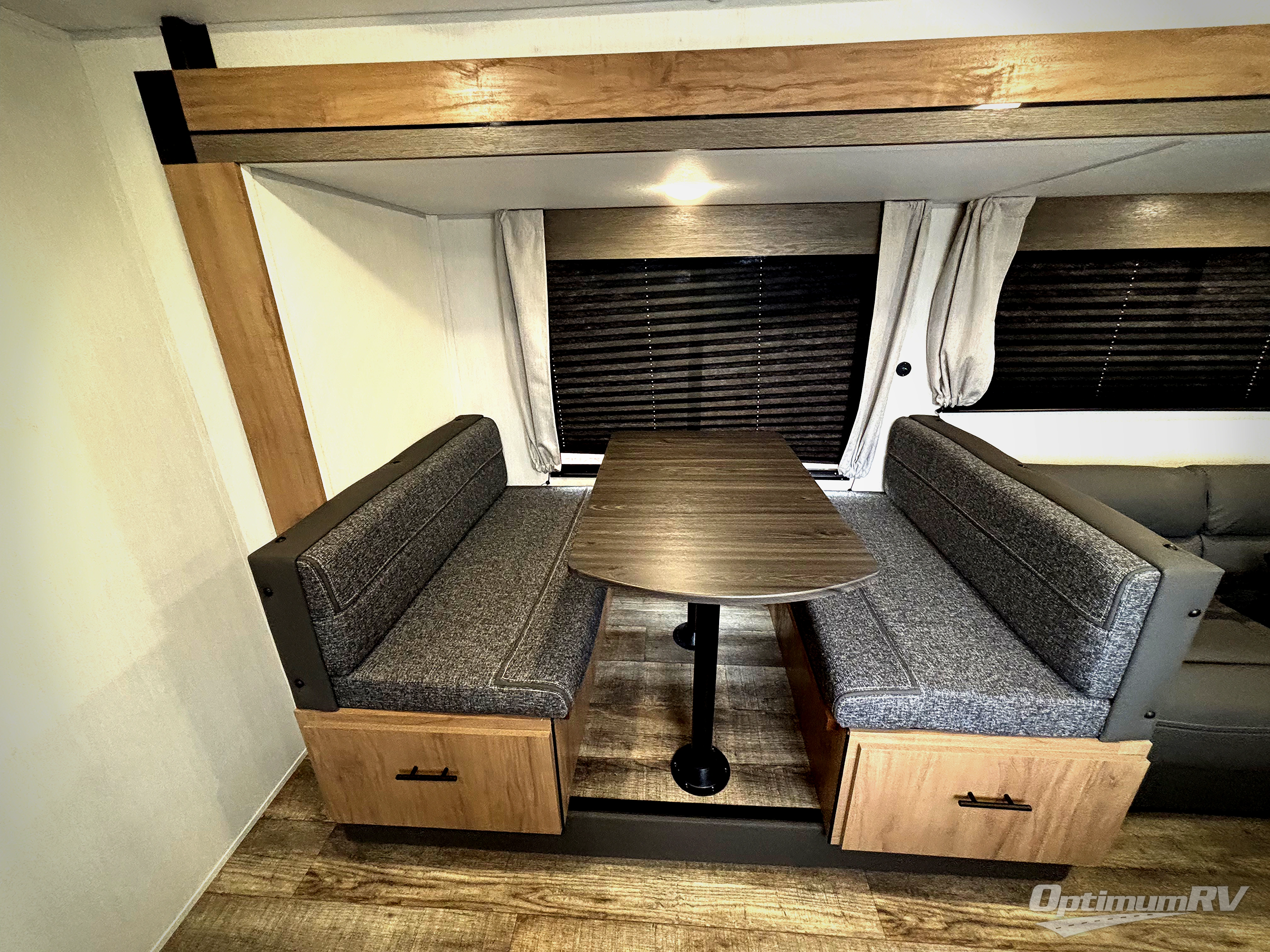 If you're looking for more interior space, this unit with a large slide out is sure to meet your needs! There is an extra thick cascade edge sofa and a booth dinette within the slide out plus panoramic windows for wide open outdoor views. The entertainment center with a fireplace will have your space feeling more like home, and the hidden shelves here can hold board games, movies, or books! After a day of exploring, you can clean up in the full rear bath that includes a spacious shower, then head to bed on the camp king bed in the front private bedroom. This model also includes an inside kitchen and an outside kitchen so you can choose where you want to cook each day!