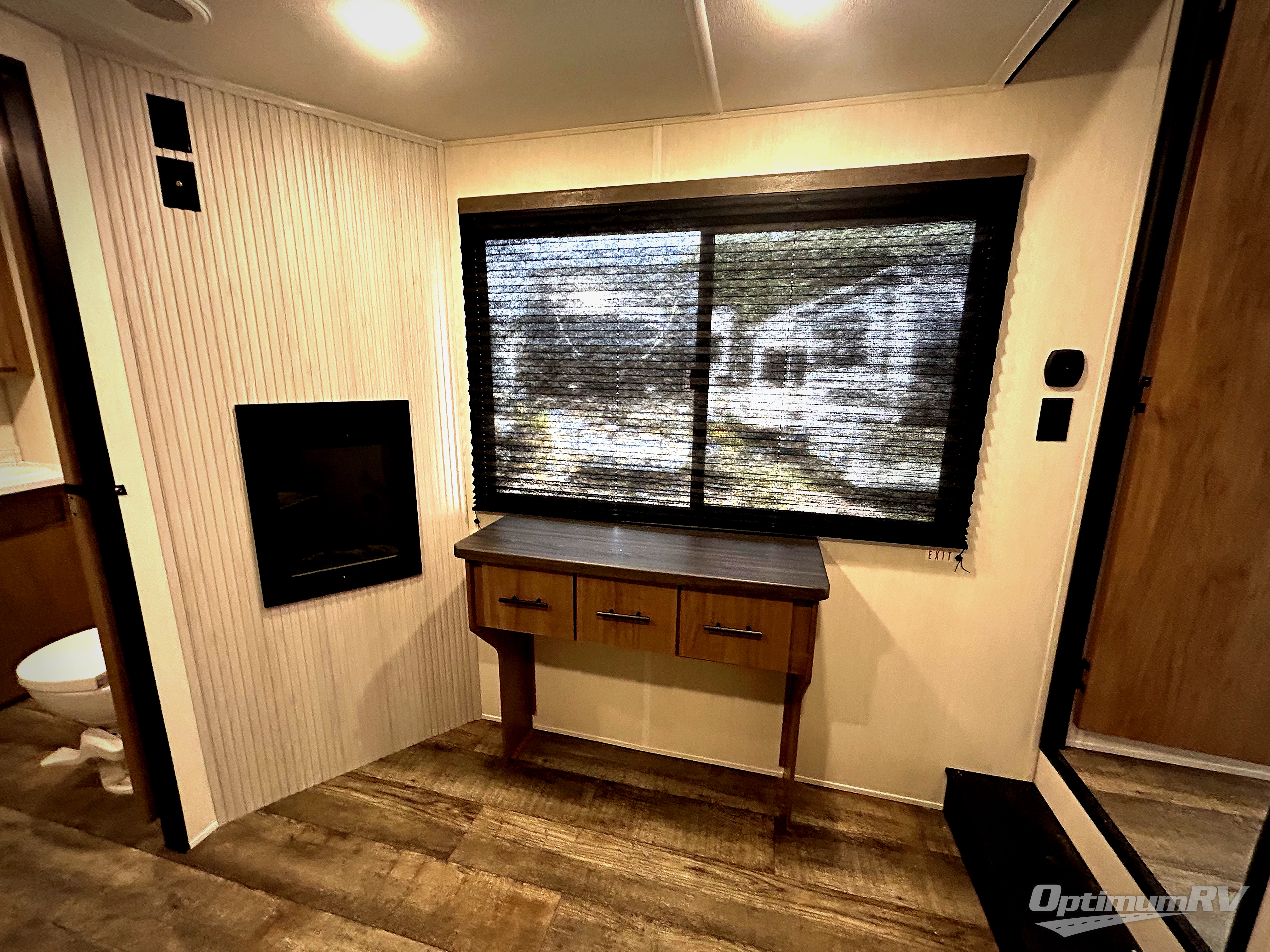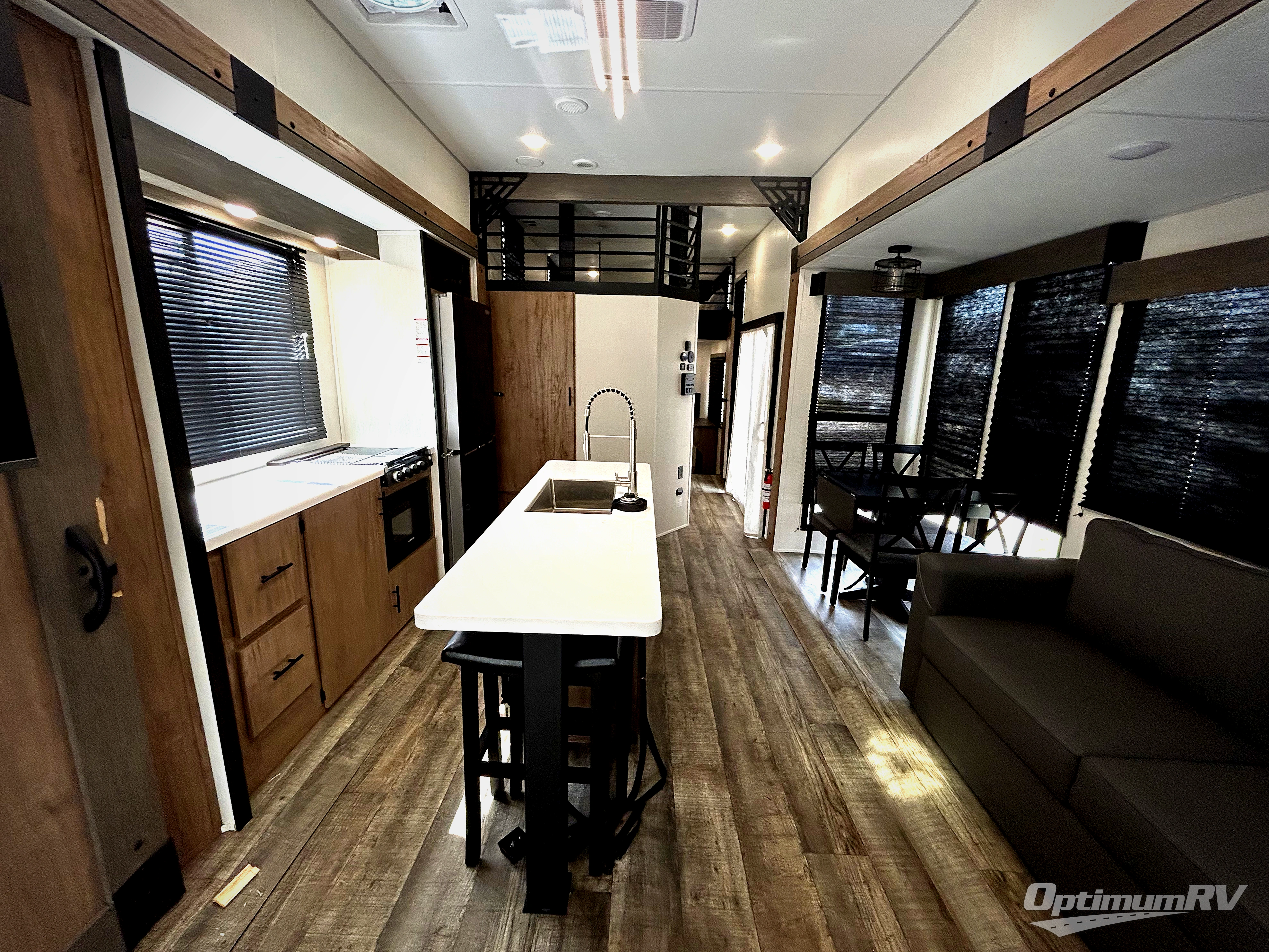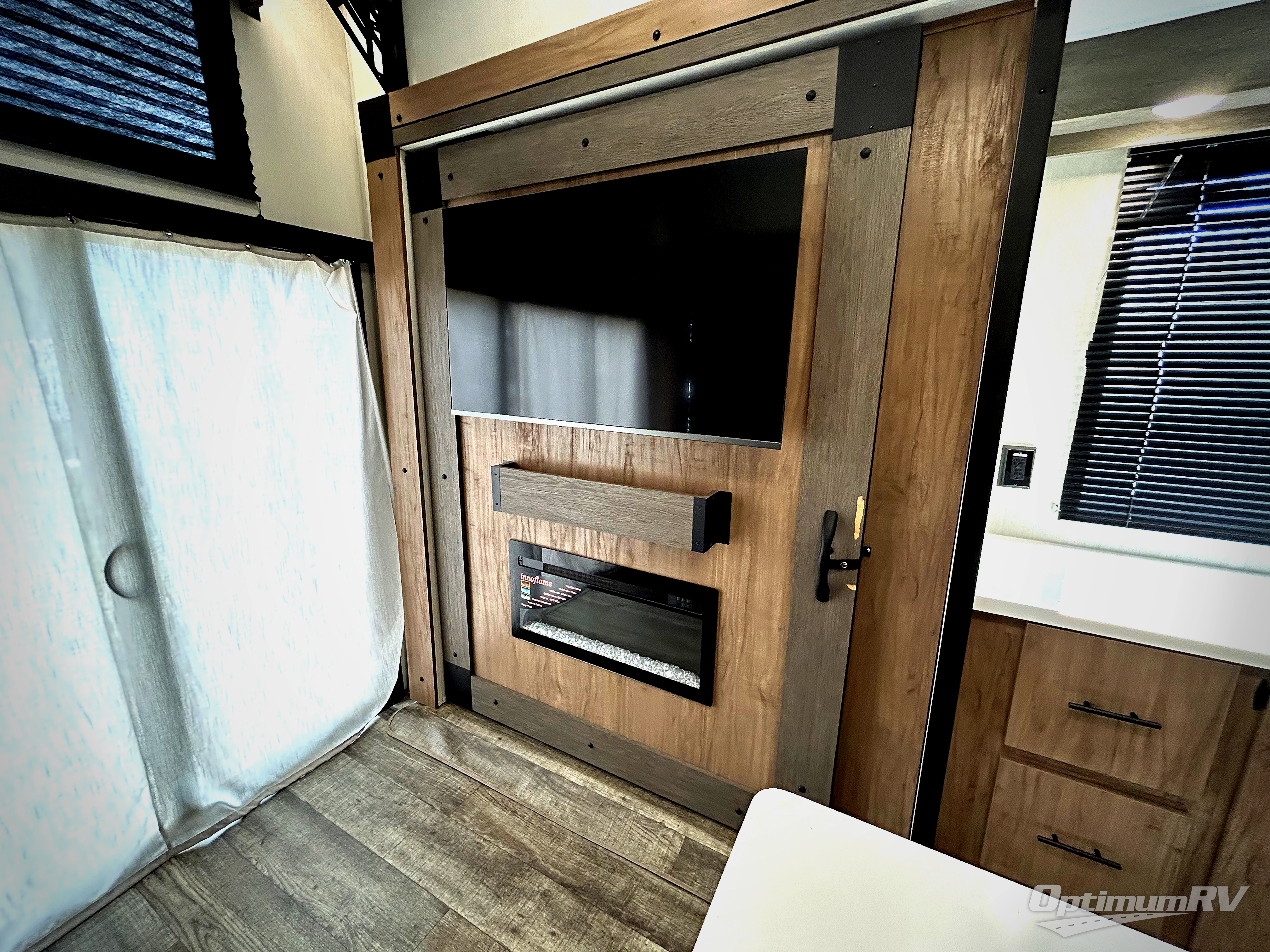 Choosing this trailer as your next RV won't be a hard decision! You'll love the front bath that includes dual bath sinks, a shower with a seat, and a medicine cabinet for your necessities. The master bedroom is connected to this bath for added convenience, and you're sure to enjoy the bedroom fireplace and camp king bed slide out. Just outside this room are the stairs that lead to the loft where you'll find two camp queen-size beds on one side and an open area where the kids can play or to use as storage. A second full bath is found next the stairs on the lower level, and there is a wardrobe with washer/dryer prep if you want to add these appliances. Everyone will love to join together and visit in the combined kitchen and living room. Here, you'll find a free-standing dinette, an L-shaped sofa, a kitchen island with a raised bar, plus an entertainment center with a fireplace! The hidden pantry behind the fireplace will let you keep food stocked, and the rear patio doors will let natural light in!
