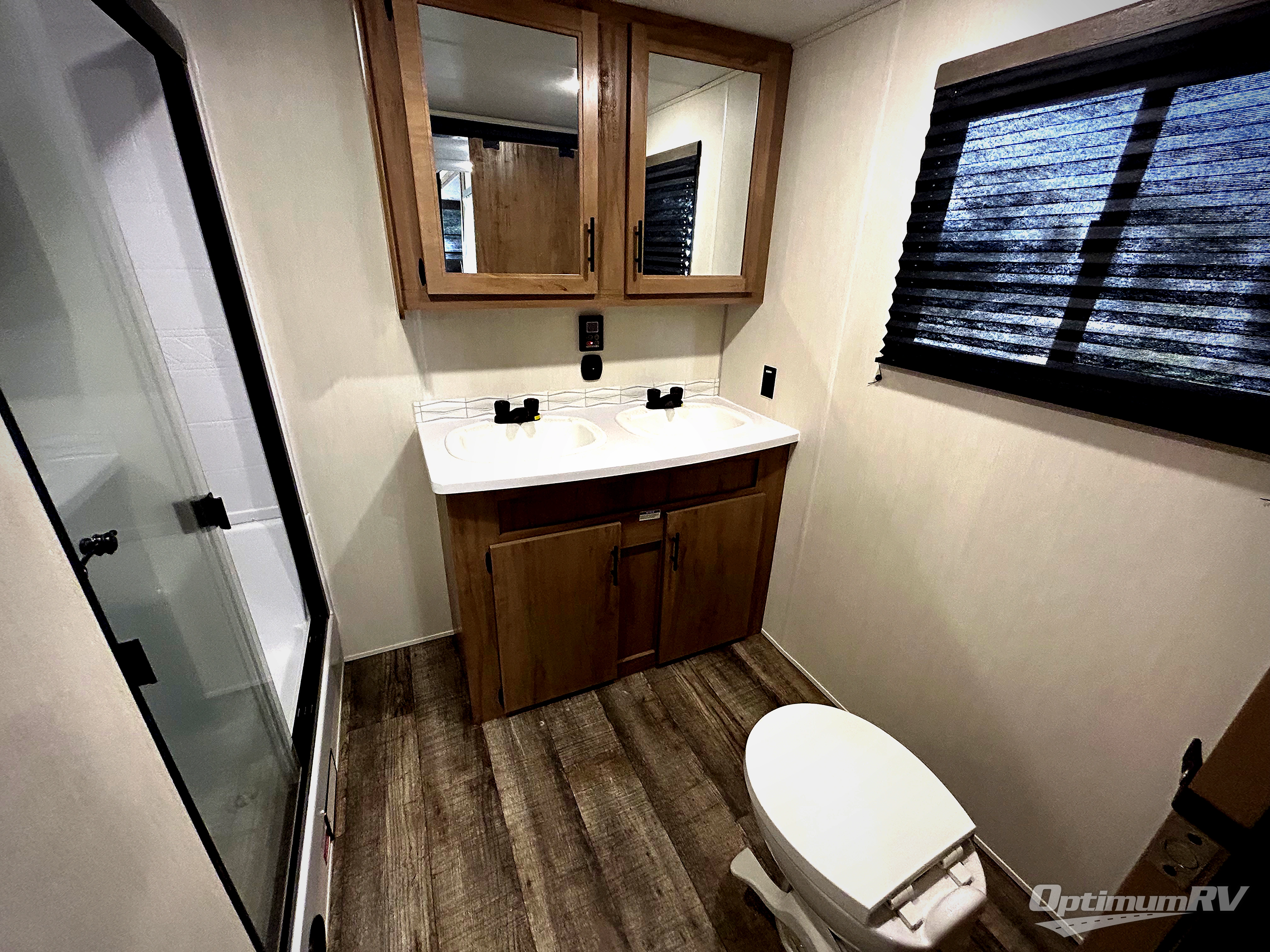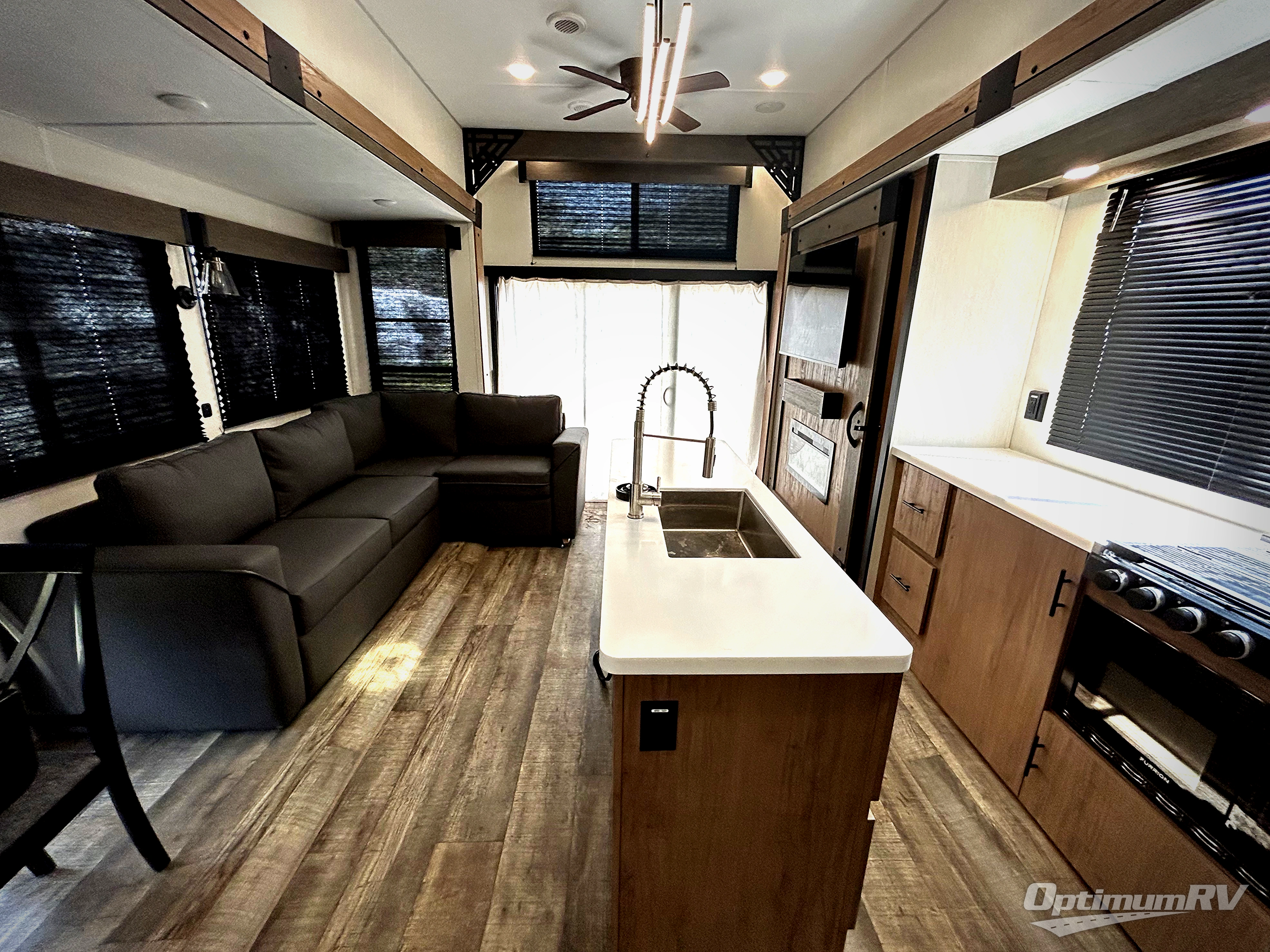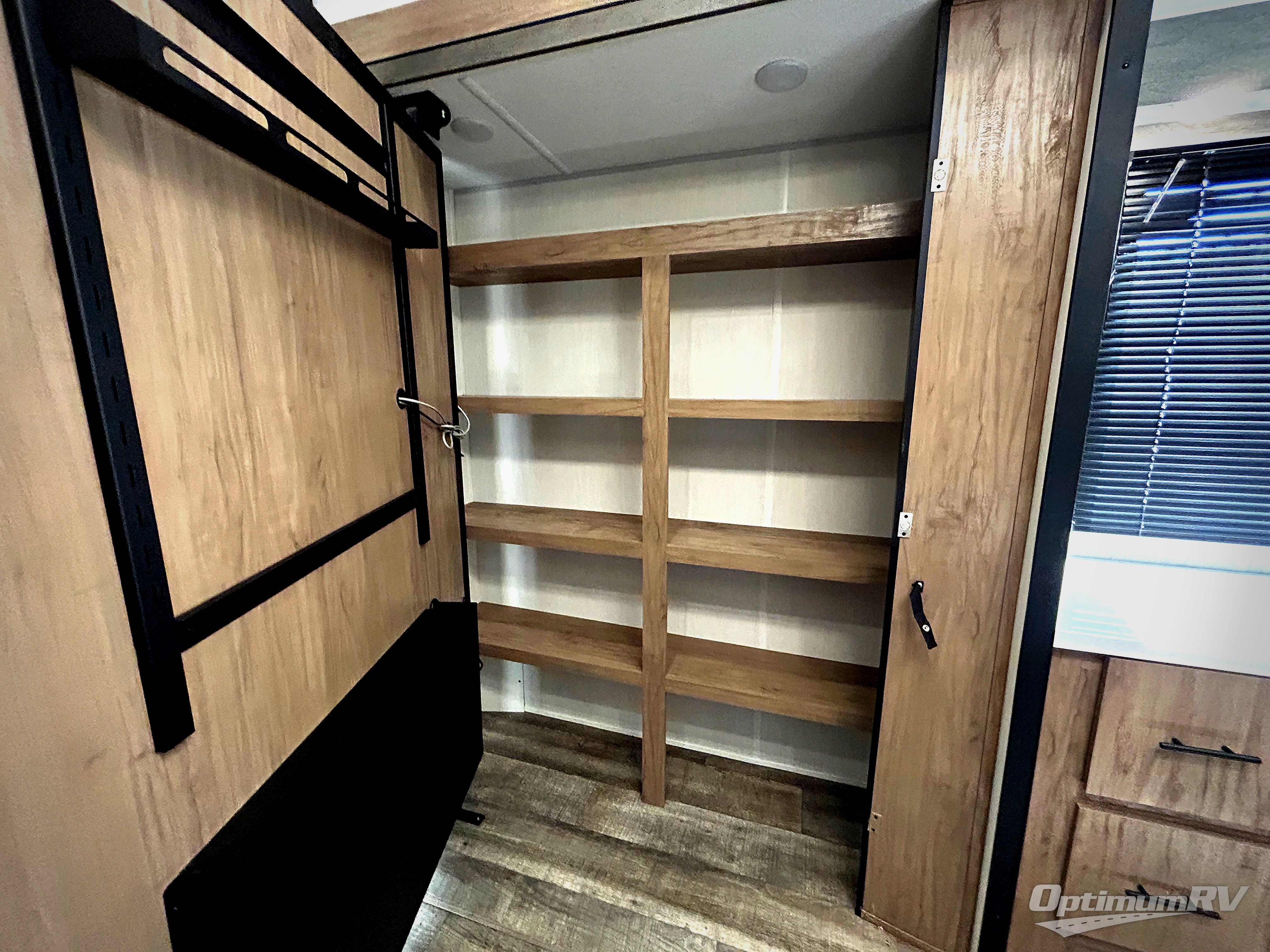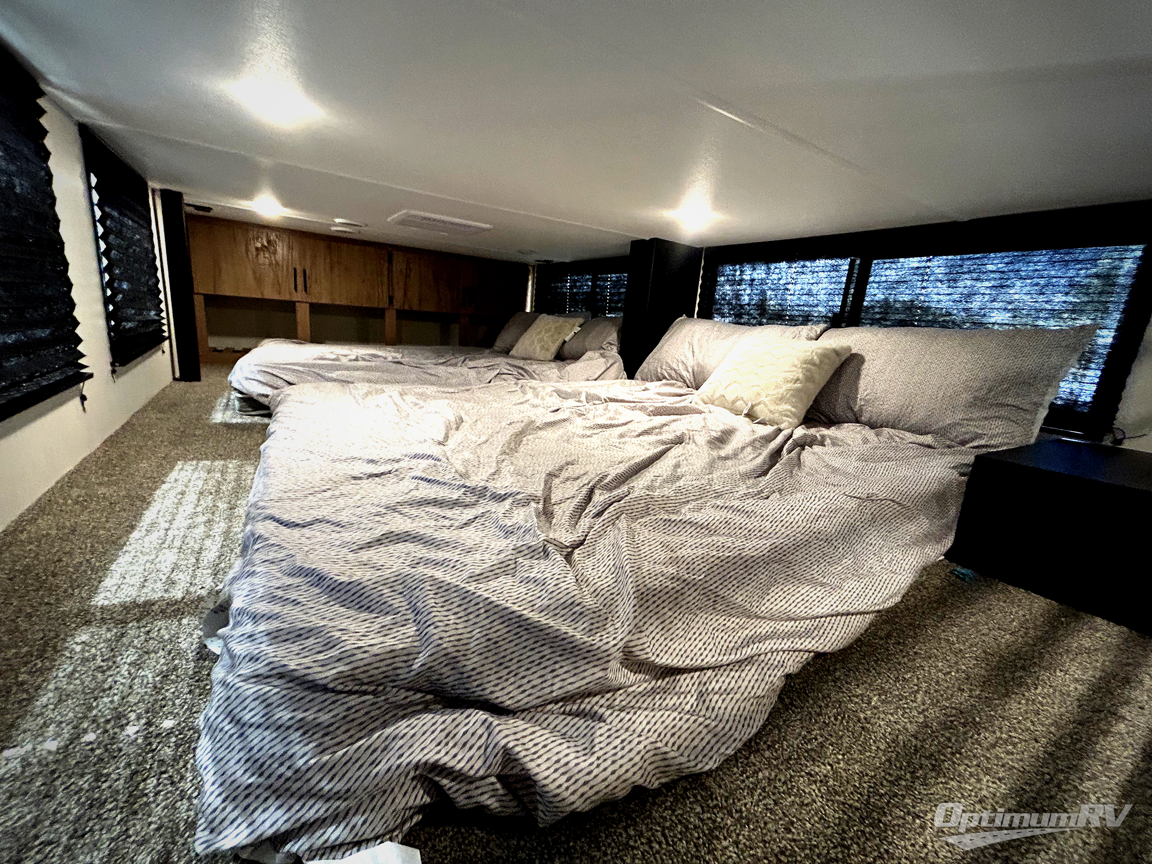 Choosing this trailer as your next RV won't be a hard decision! You'll love the front bath that includes dual bath sinks, a shower with a seat, and a medicine cabinet for your necessities. The master bedroom is connected to this bath for added convenience, and you're sure to enjoy the bedroom fireplace and camp king bed slide out. Just outside this room are the stairs that lead to the loft where you'll find two camp queen-size beds on one side and an open area where the kids can play or to use as storage. A second full bath is found next the stairs on the lower level, and there is a wardrobe with washer/dryer prep if you want to add these appliances. Everyone will love to join together and visit in the combined kitchen and living room. Here, you'll find a free-standing dinette, an L-shaped sofa, a kitchen island with a raised bar, plus an entertainment center with a fireplace! The hidden pantry behind the fireplace will let you keep food stocked, and the rear patio doors will let natural light in!