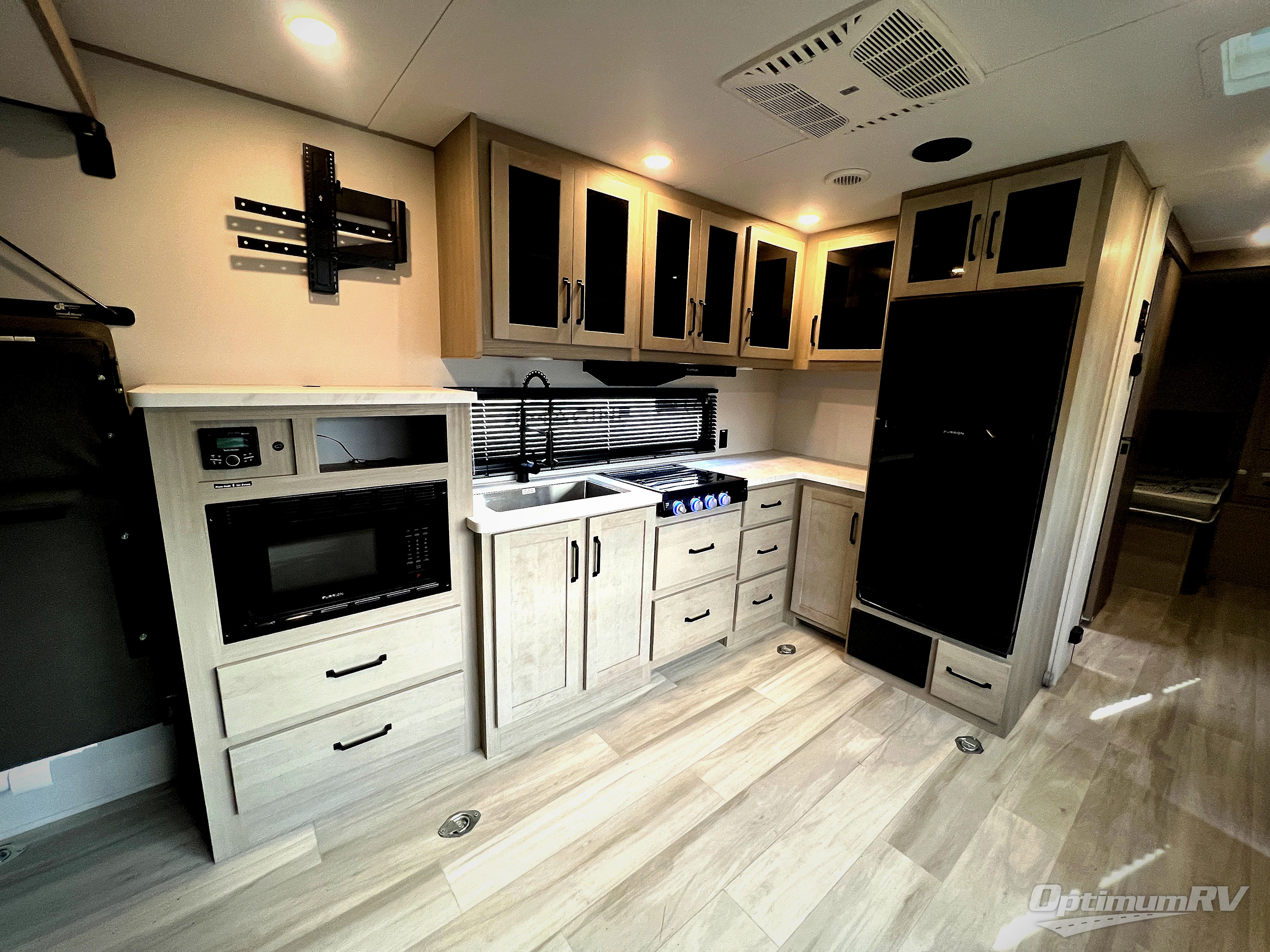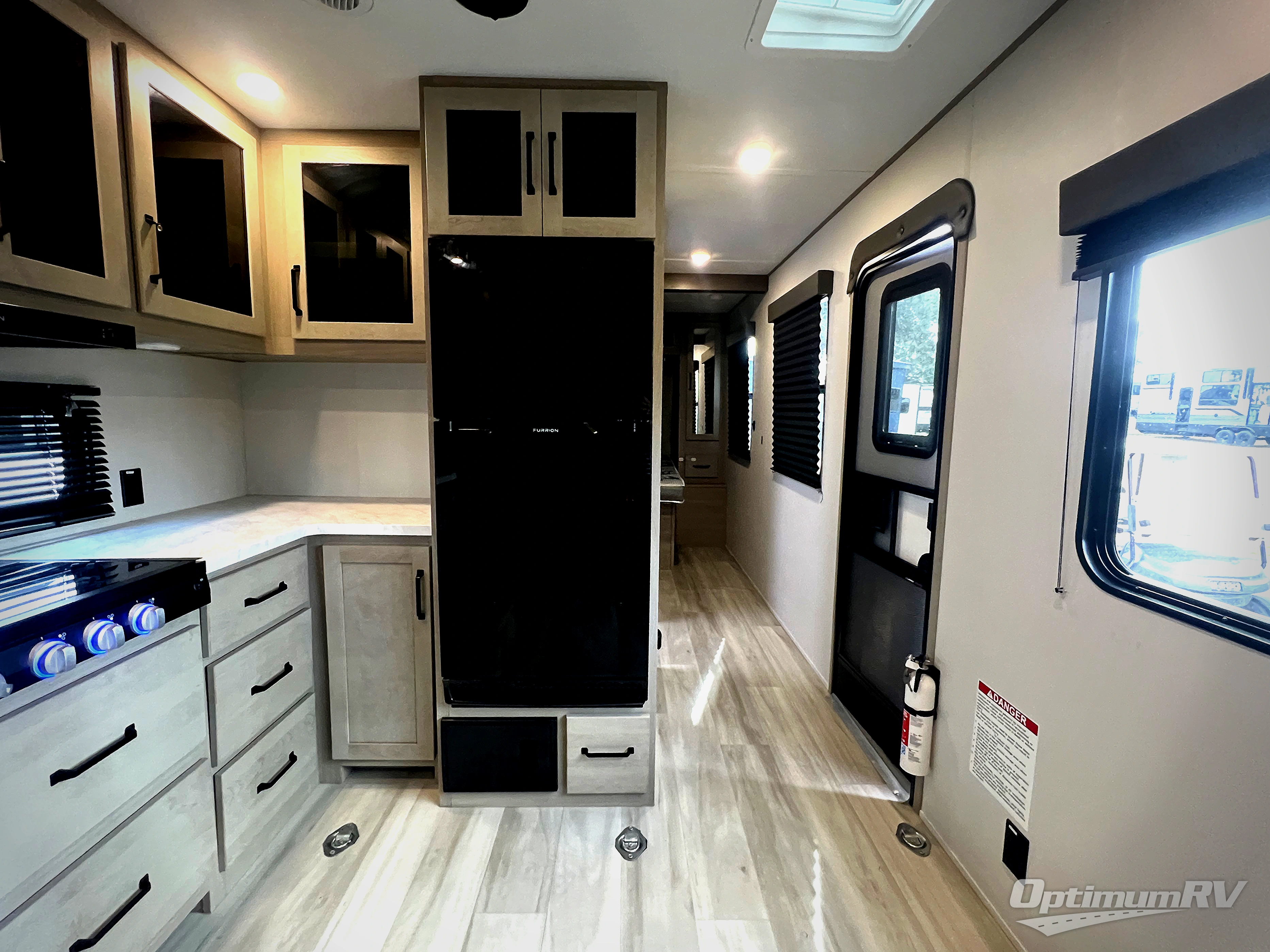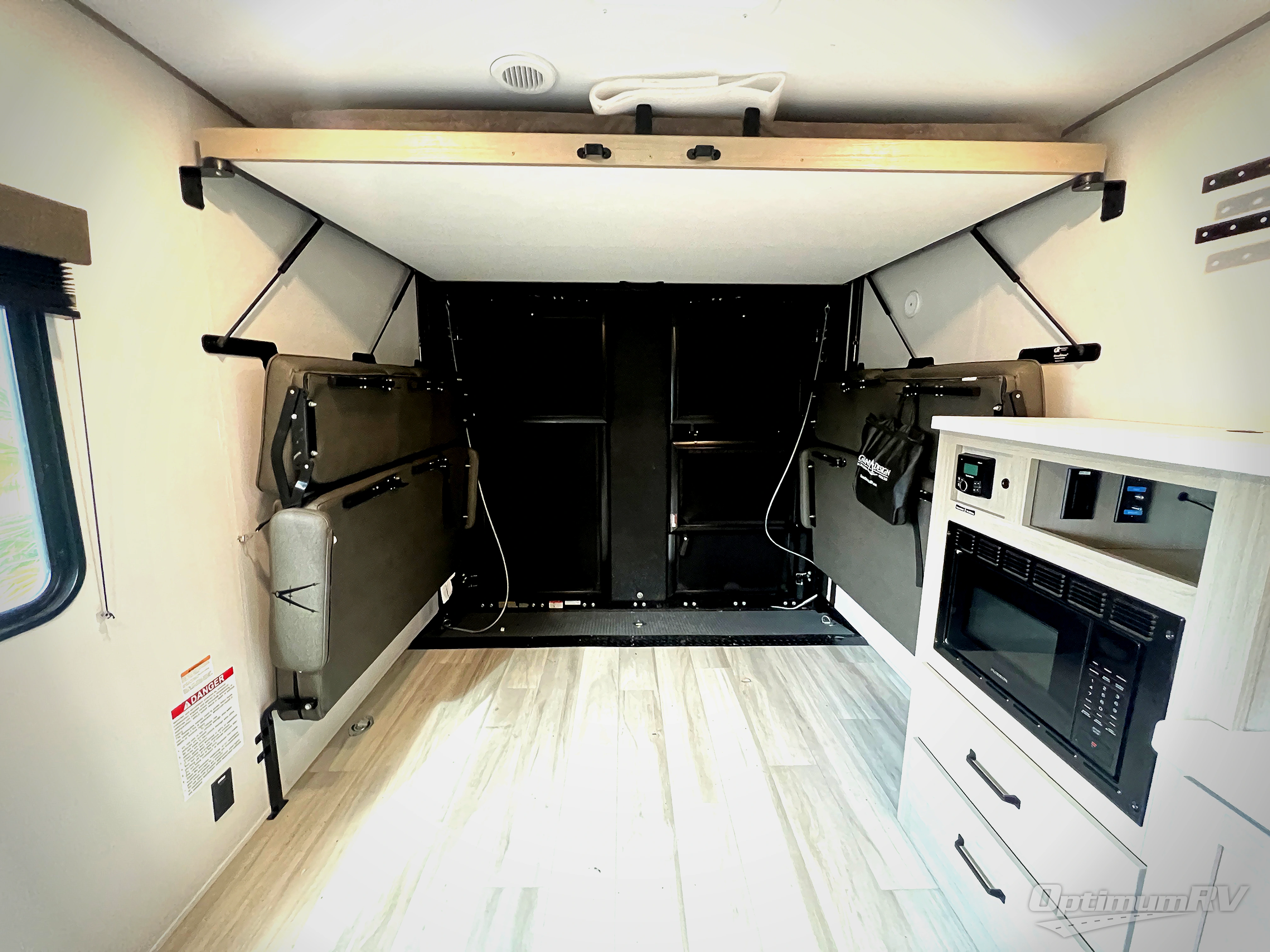 You will love this Momentum MAV toy hauler travel trailer! The front bedroom features a queen bed, and there is plenty of room to walk around. The sliding solid bedroom door helps with space. Overhead storage and a pair of nightstands are convenient storage, plus there is a wardrobe with both drawers and space to hang items. The kitchen offers a microwave, stainless steel sink, and an 8 cu. ft. 12V refrigerator. In the garage, you'll find rollover sofas with a table and a top bed for guests to sleep on. The ramp door/patio will provide additional living space once your toys are unloaded, and the pull down screen will keep bugs out!