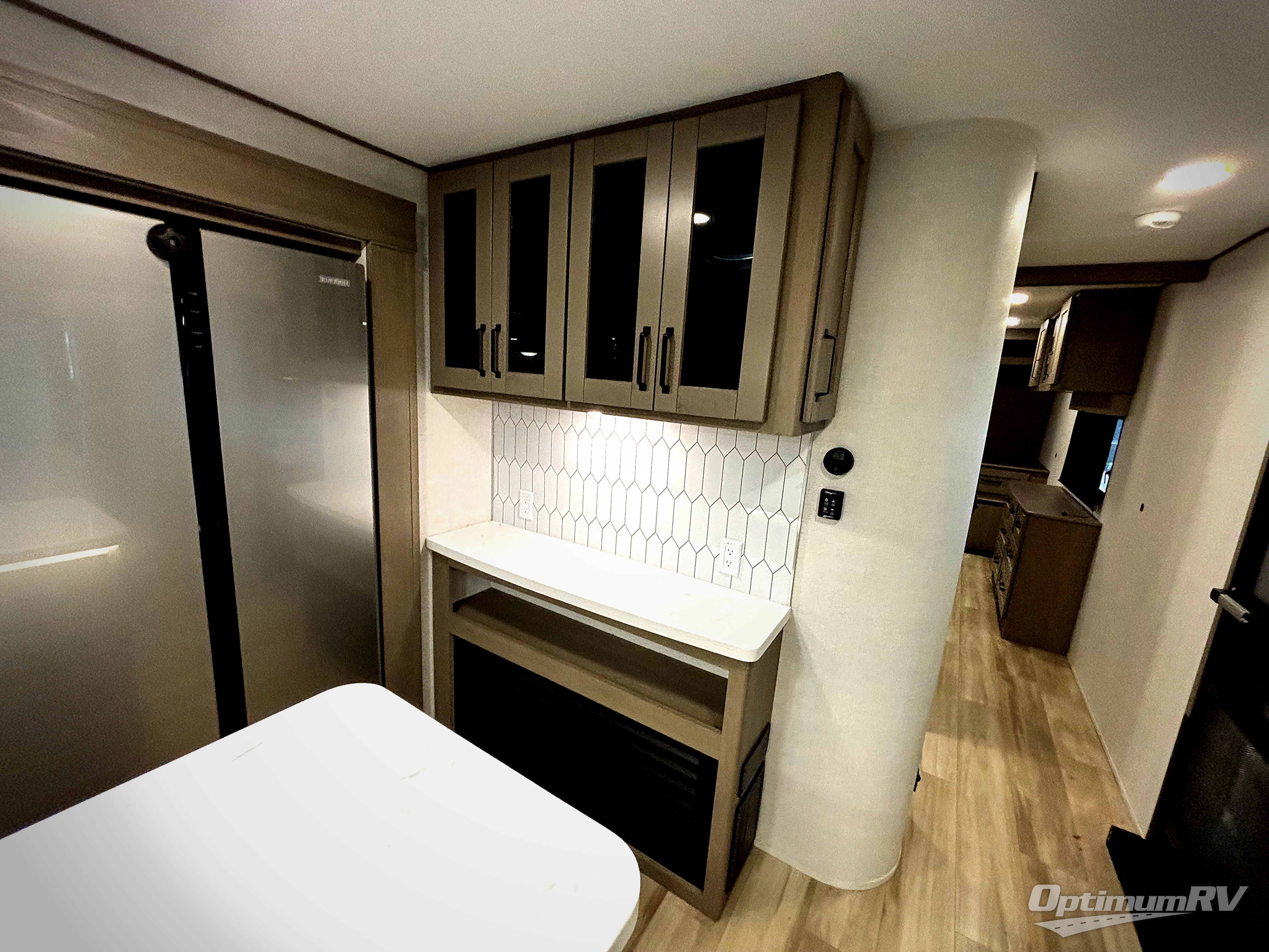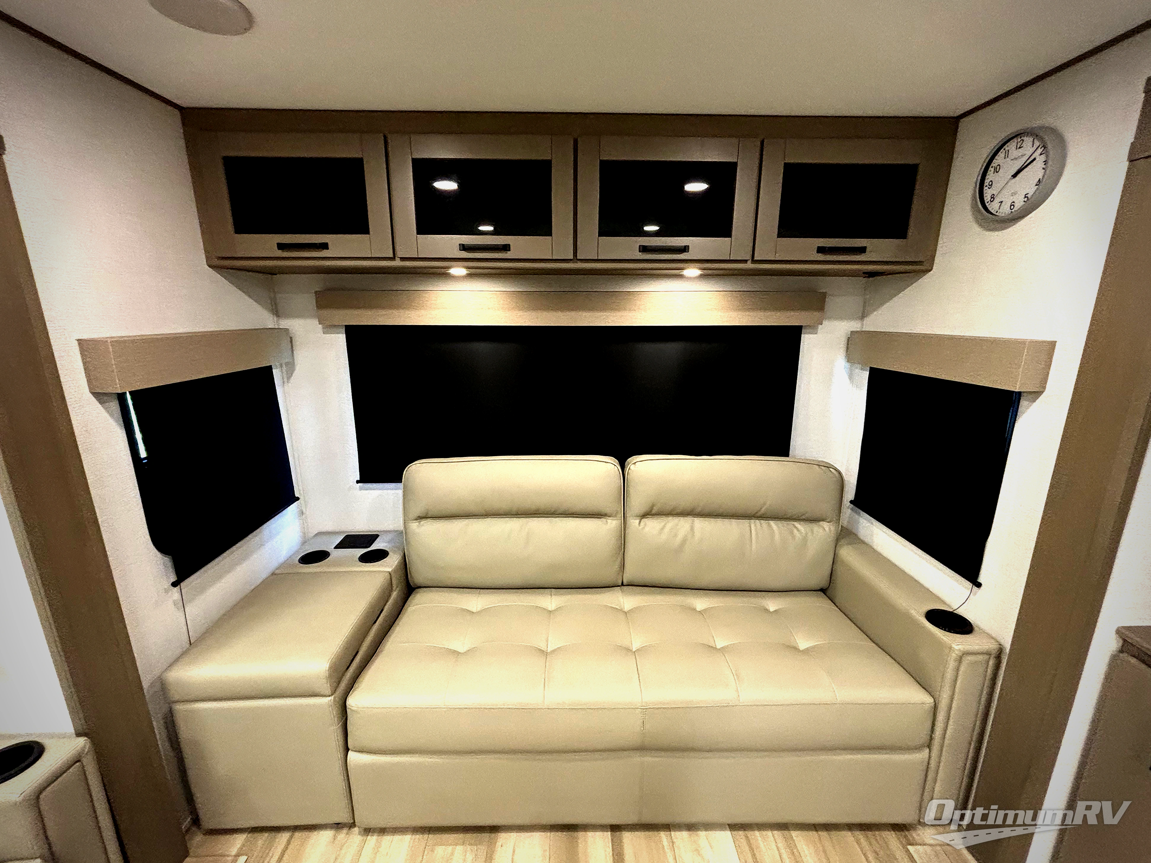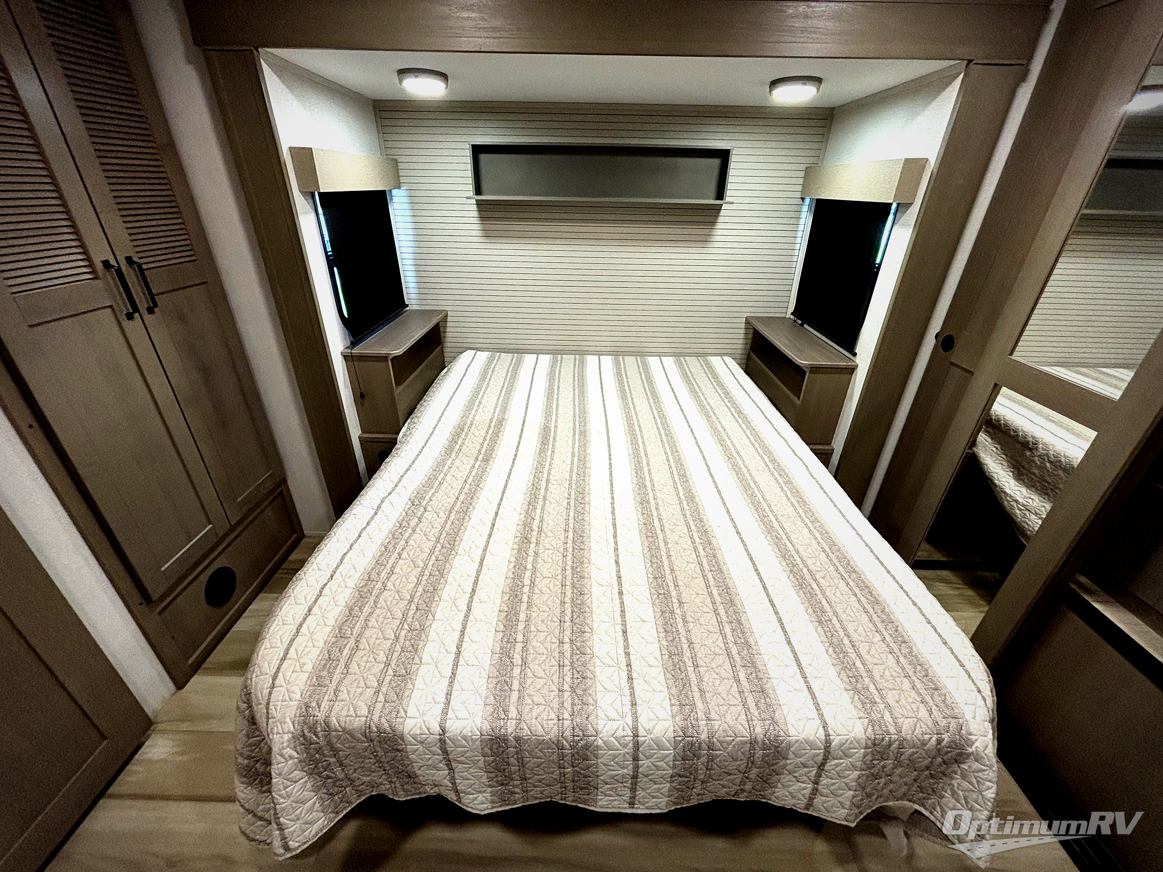 This rear living travel trailer will be perfect for extended stays at the campground or quick weekend trips to the lake! Once you've unloaded your gear from the pass-thru storage, head inside to relax on the rear tri-fold sofa with an adjustable headrest or on the theater seating across from the 40" TV and fireplace. There is also a booth dinette where you can dine together, or you can choose the optional swivel dinette. The spacious kitchen island will make meal time easier than ever, plus there is a pantry and 16 cu. ft. 12V refrigerator for food storage. The full bath is right next to the front private bedroom for easy nighttime use, and speaking of nighttime, you're sure to sleep soundly on the queen bed slide. There is also a large front closet, TV prep, plus washer and dryer prep if you choose to add these appliances.
