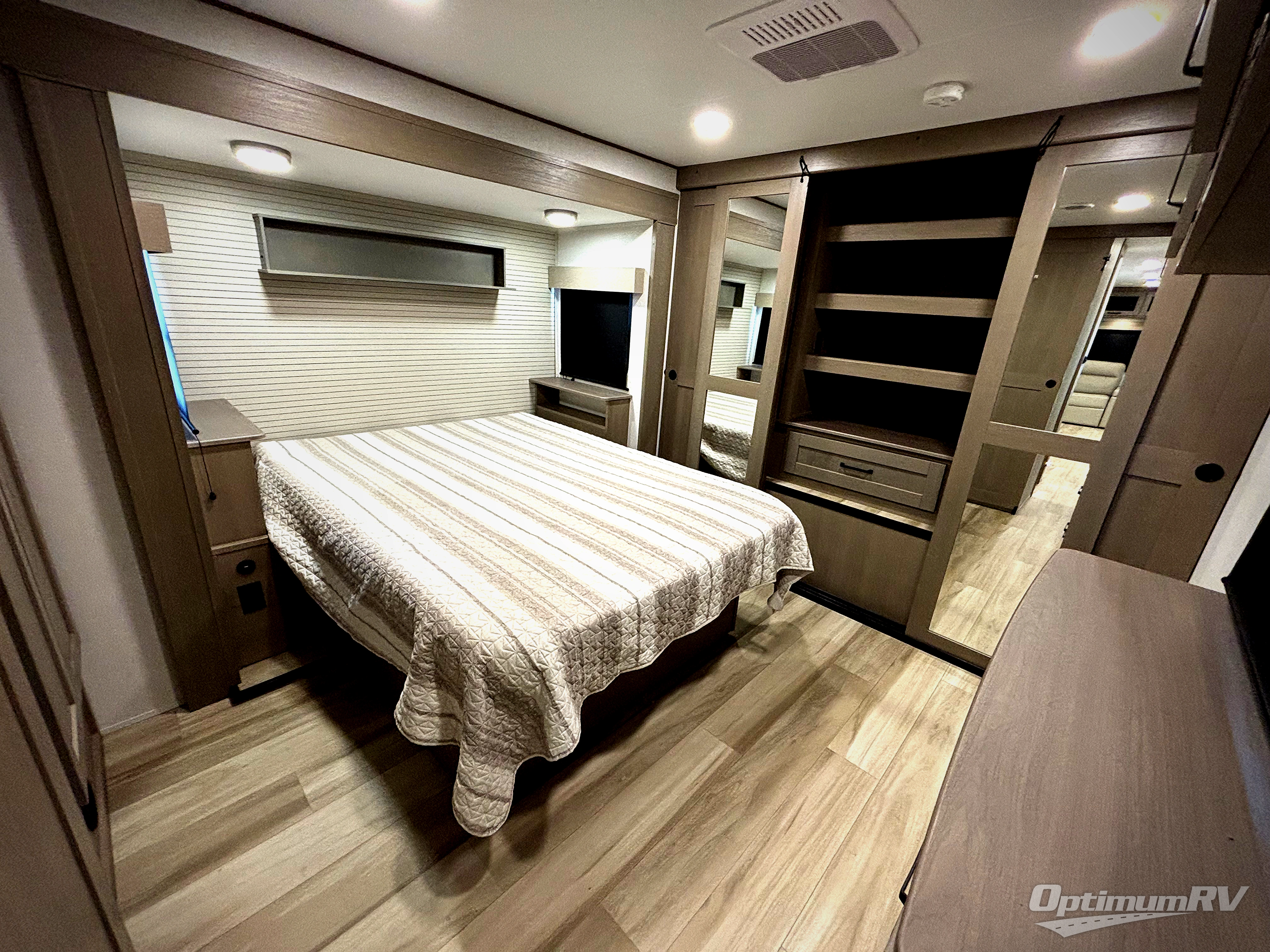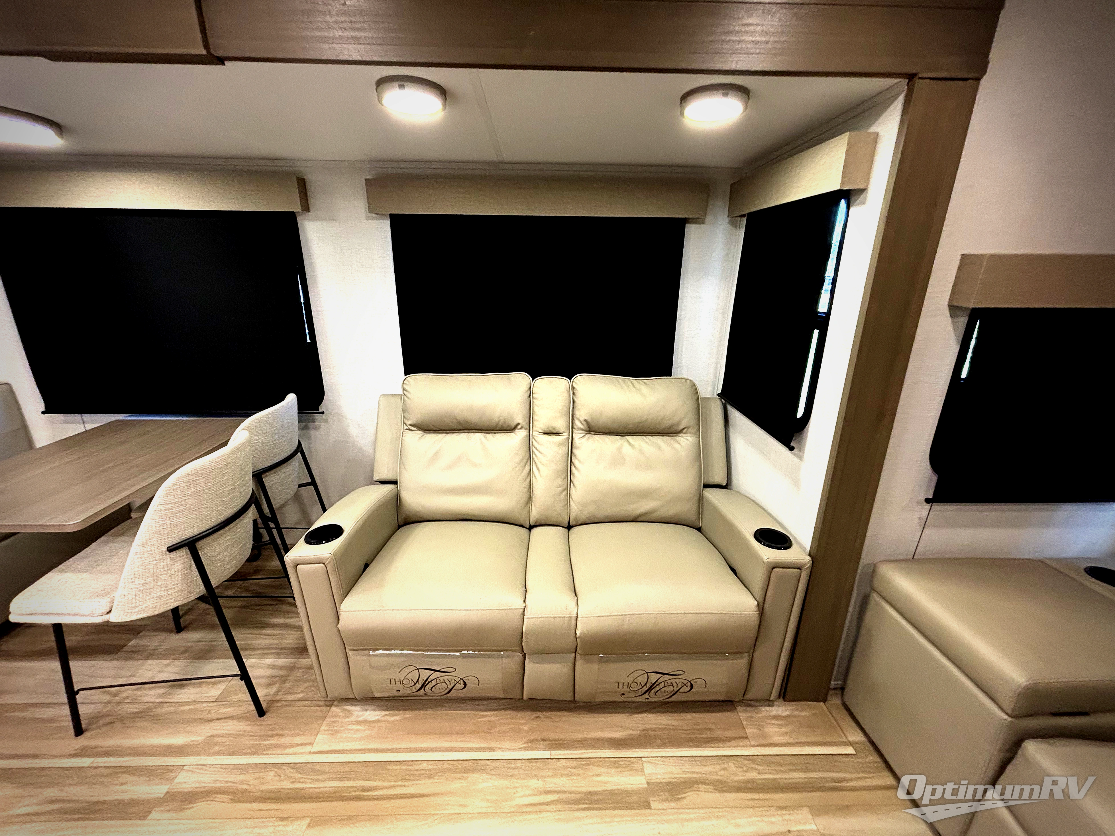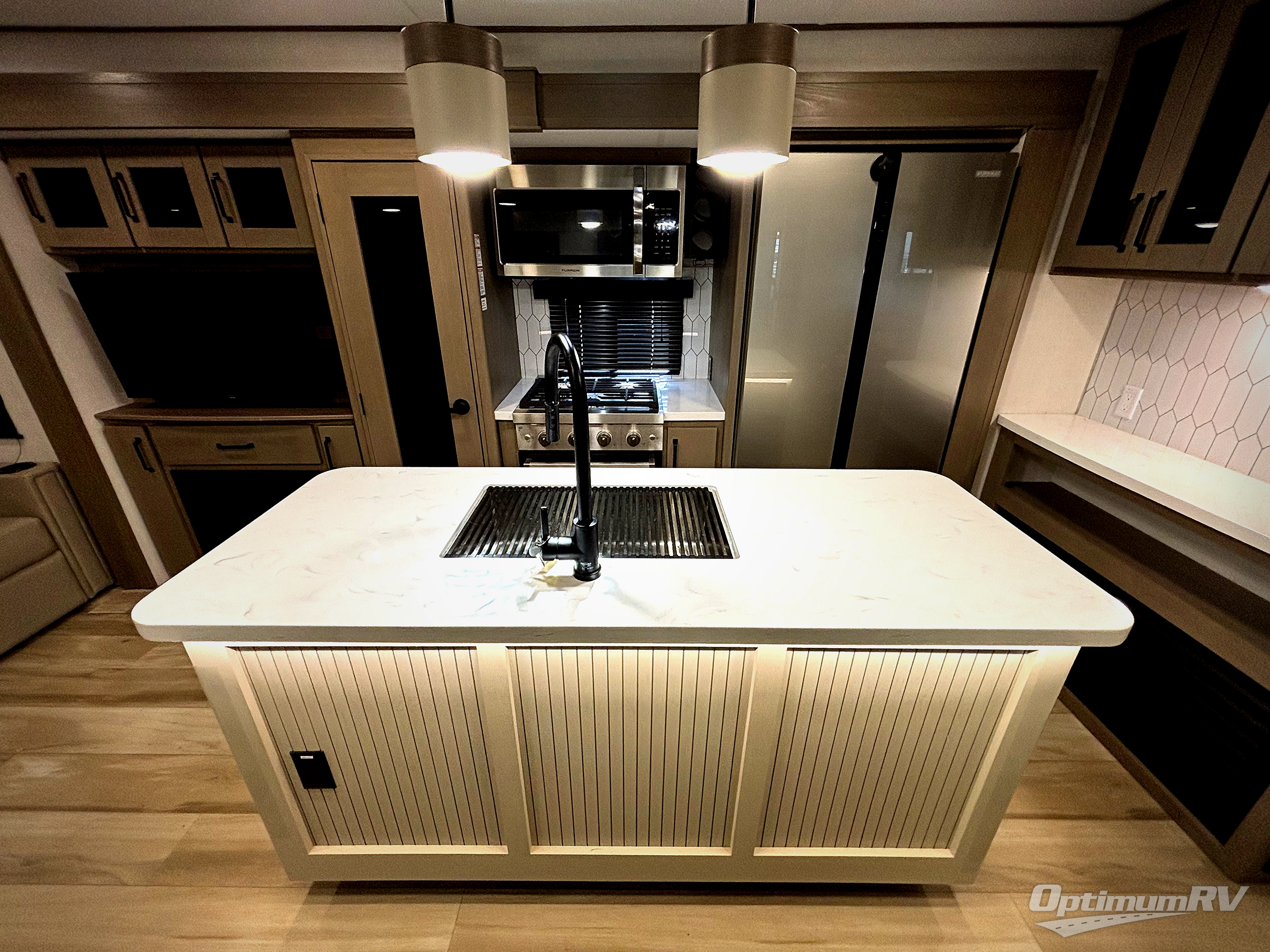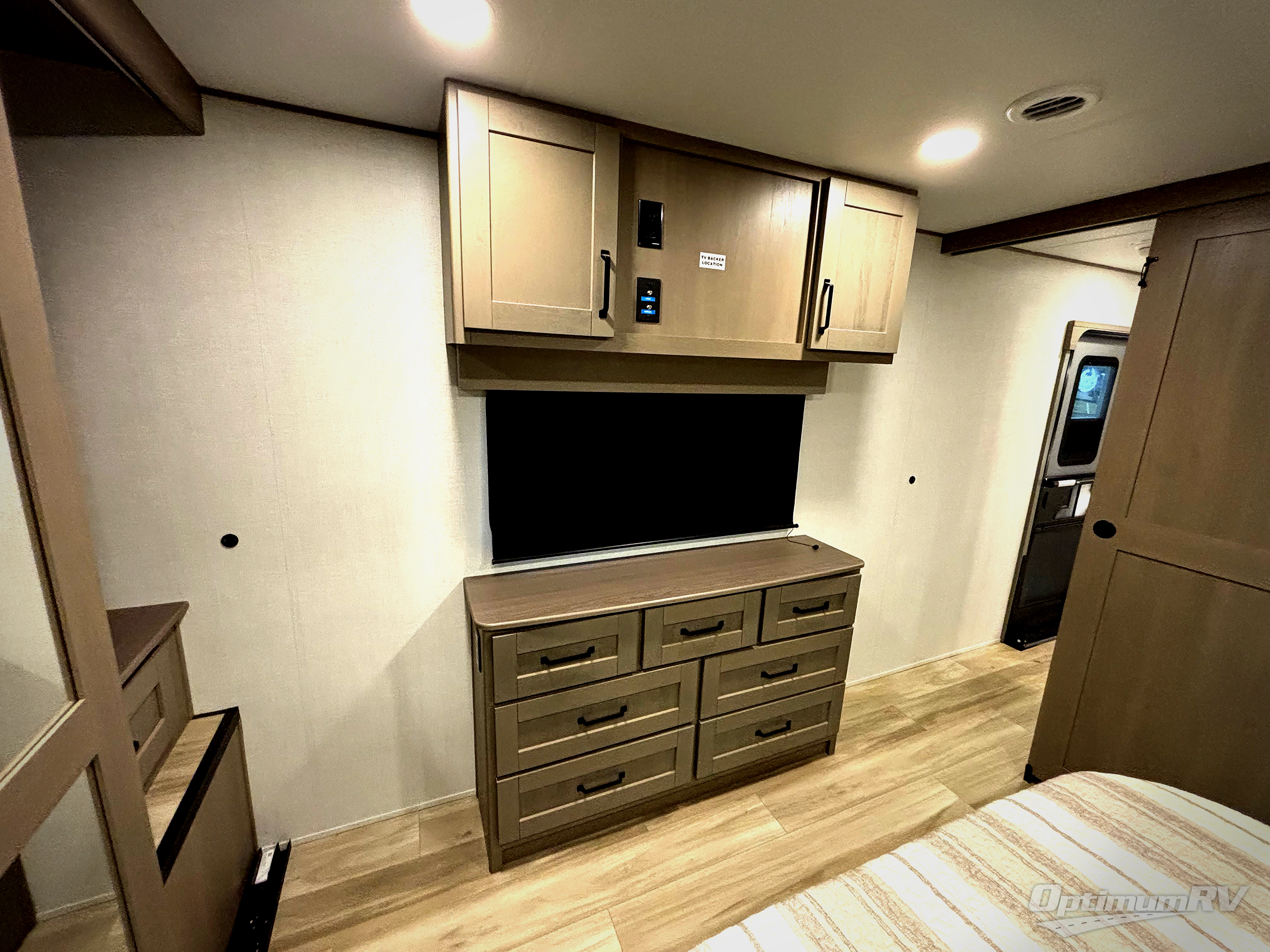 This rear living travel trailer will be perfect for extended stays at the campground or quick weekend trips to the lake! Once you've unloaded your gear from the pass-thru storage, head inside to relax on the rear tri-fold sofa with an adjustable headrest or on the theater seating across from the 40" TV and fireplace. There is also a booth dinette where you can dine together, or you can choose the optional swivel dinette. The spacious kitchen island will make meal time easier than ever, plus there is a pantry and 16 cu. ft. 12V refrigerator for food storage. The full bath is right next to the front private bedroom for easy nighttime use, and speaking of nighttime, you're sure to sleep soundly on the queen bed slide. There is also a large front closet, TV prep, plus washer and dryer prep if you choose to add these appliances.