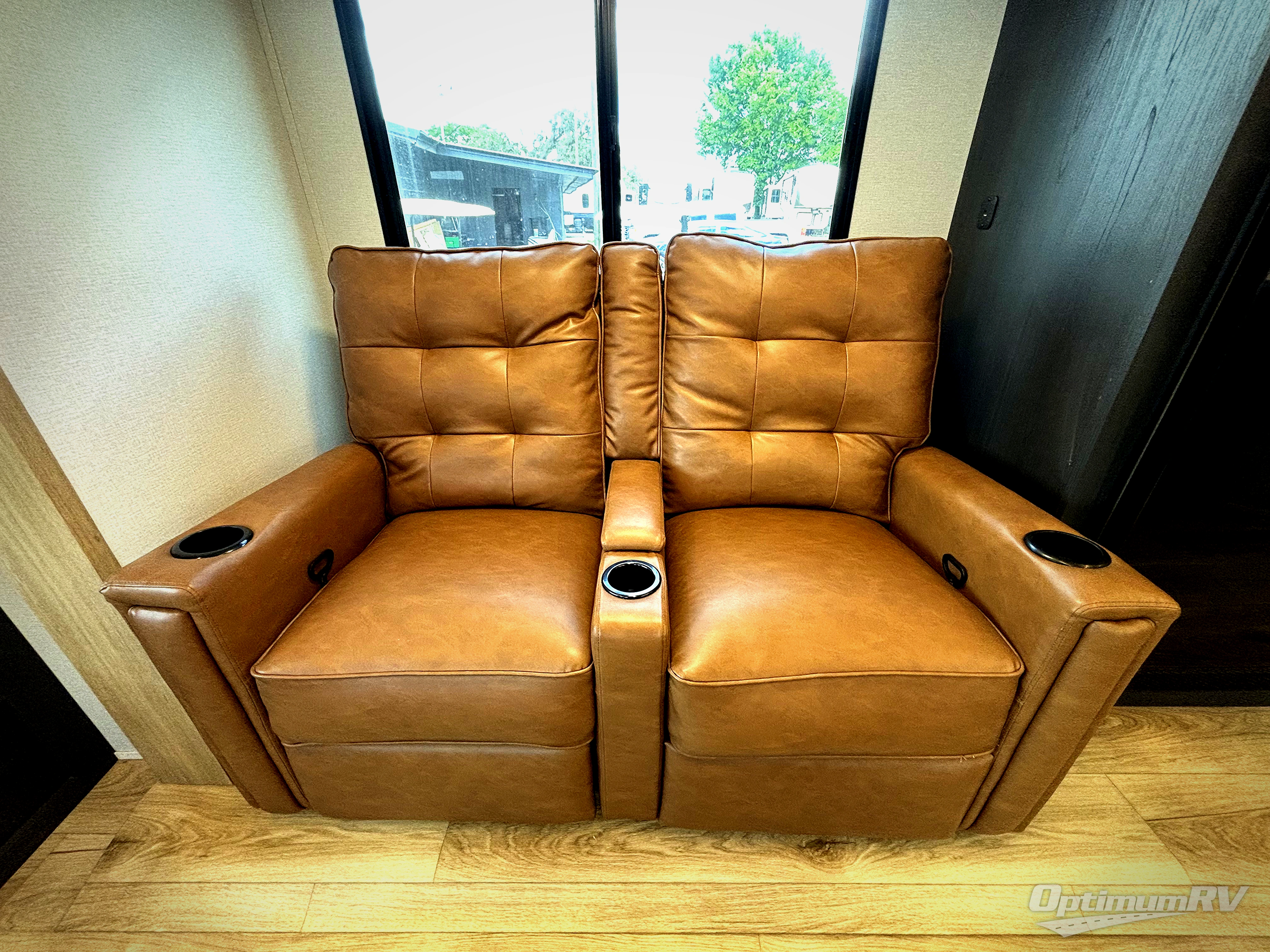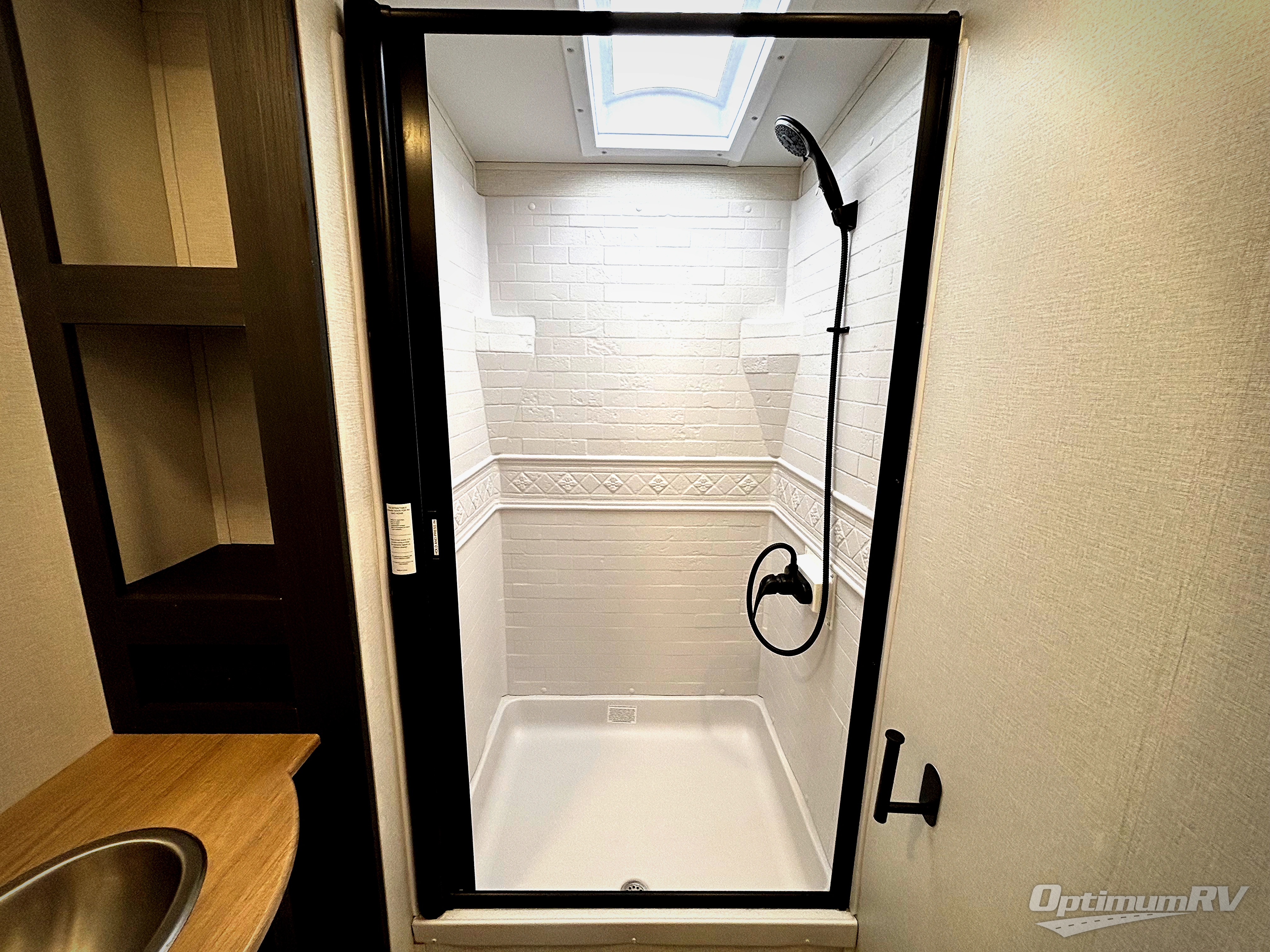 You and your spouse will love camping in this travel trailer! It features a front private bedroom with a king bed to lay your head on at night. Freshen up each morning in the full bathroom with a shower that has a skylight above to bring the outdoors inside. The chef can prepare their best home cooked meals with the three burner cooktop, conventional oven, and 10.7 cu. ft. 12V refrigerator. Enjoy all of your meals and play games at the rear U-shaped dinette, plus it can transform into an extra sleeping space for an extra guest or two depending on their size. With theater seating and an entertainment center with a fireplace, you can have a truly relaxing evening indoors!
