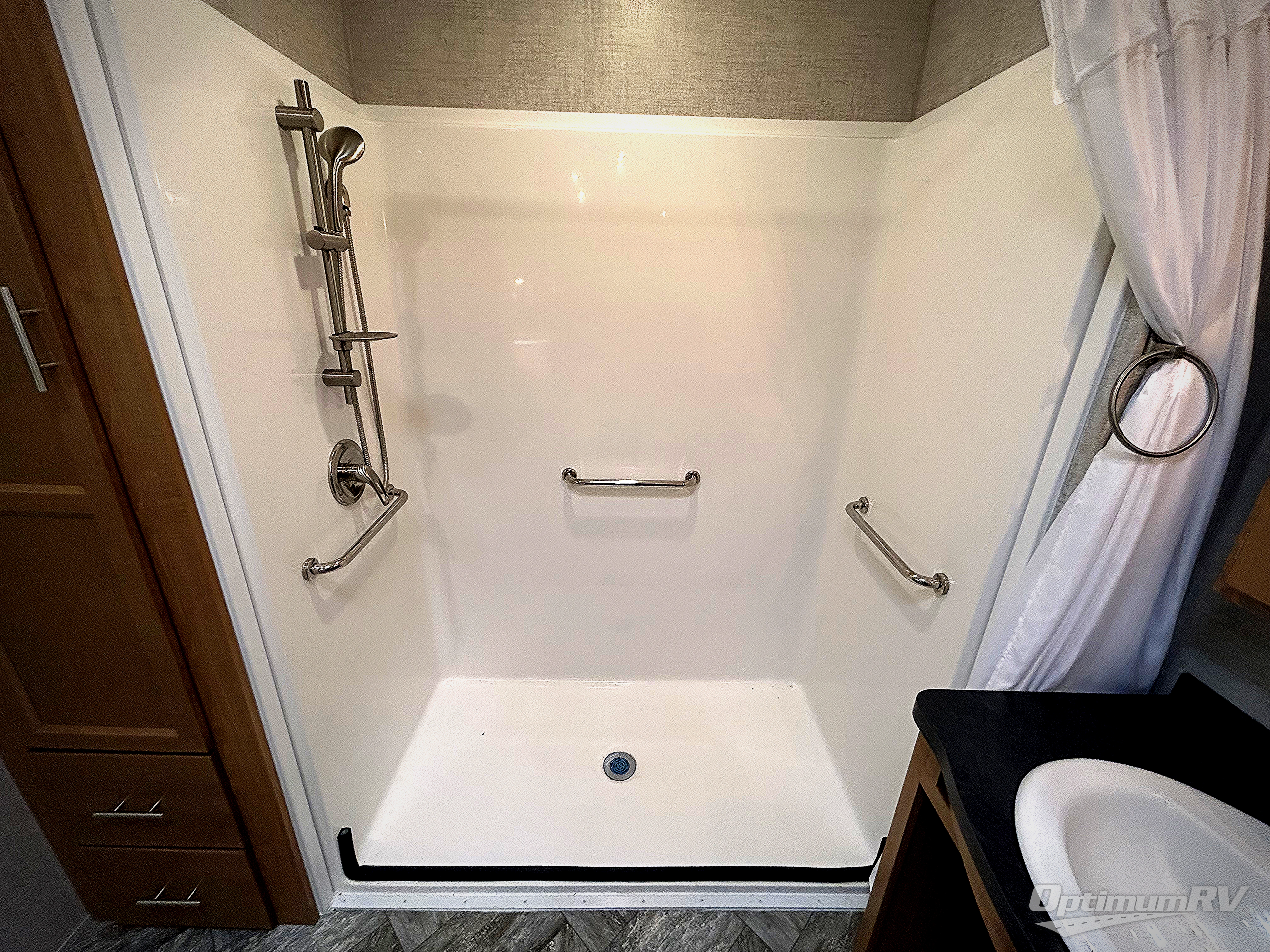 - Accessible bathroom featuring a roll-in shower, built-in stainless-steel grab bars, and a wheelchair-accessible sink.