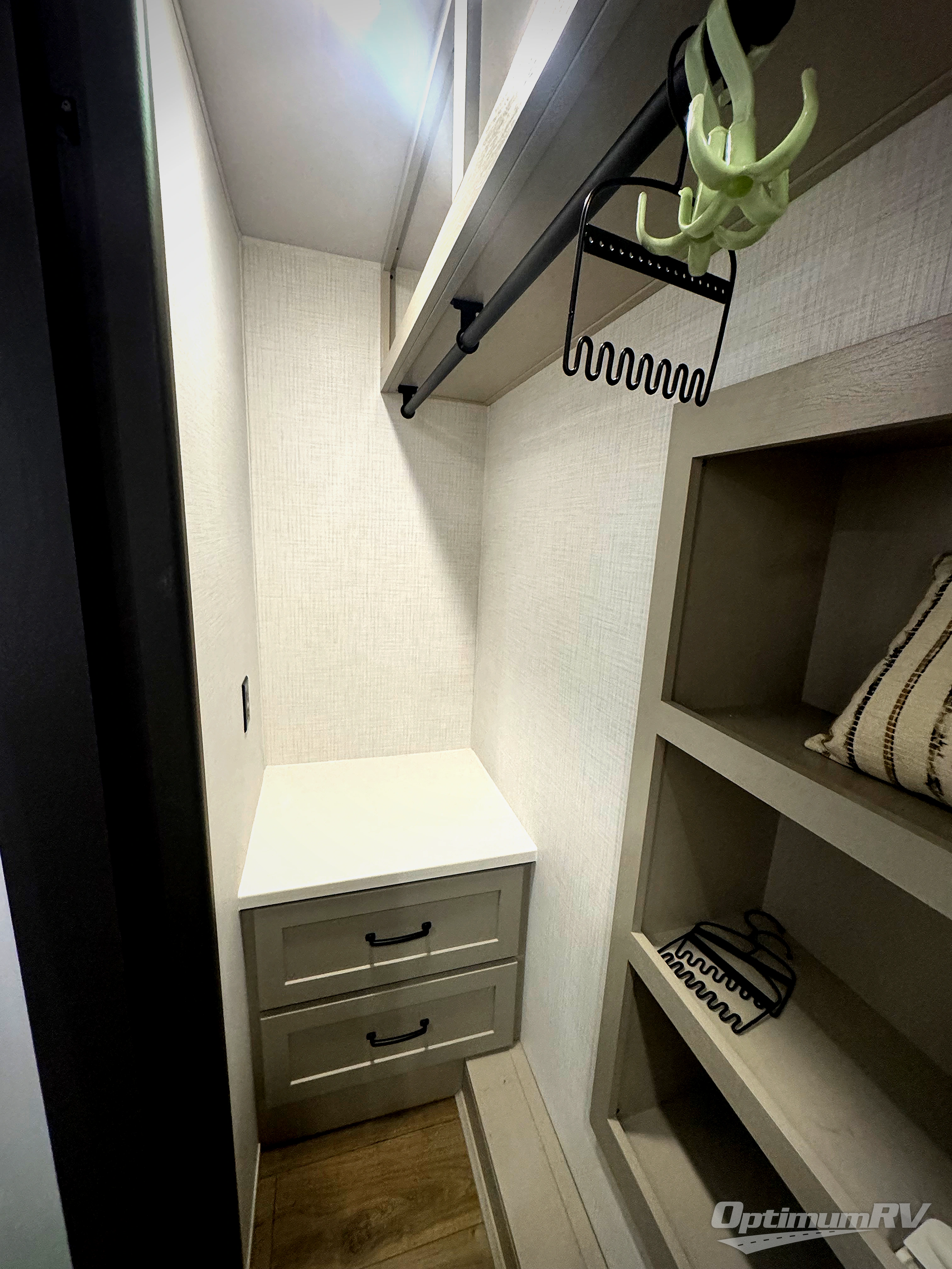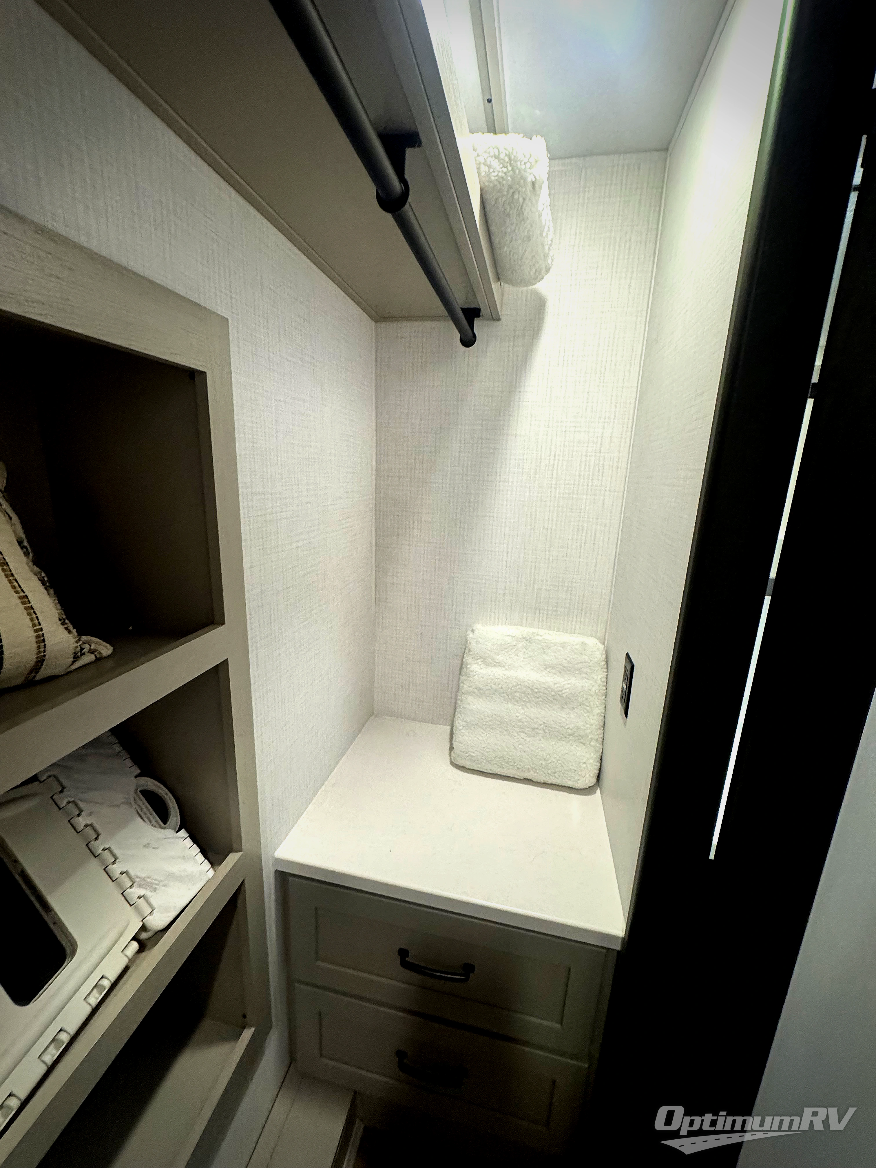 You won't believe all that this fifth wheel has to offer! Starting with the rear kitchen which has plenty of countertop space to prepare your delicious meals, a four burner cooktop with a stainless steel 24" oven to cook them, and a large single bowl stainless steel sink for easy clean up. The living area has opposing sofas and a theater seat with USB charging and storage across from an entertainment center with 50" Smart TV. The half bathroom is close to the living area so you can get back to watching your movie faster. You will feel right at home sleeping in the master suite on a slide out king bed across from a dresser and hamper to keep your space tidy, plus entrance into the front full bathroom. Inside the bathroom, you will find a vanity with dual sinks for two to get ready at once, a spacious shower with a seat, and a walk-in closet for clothes, shoes, and more!