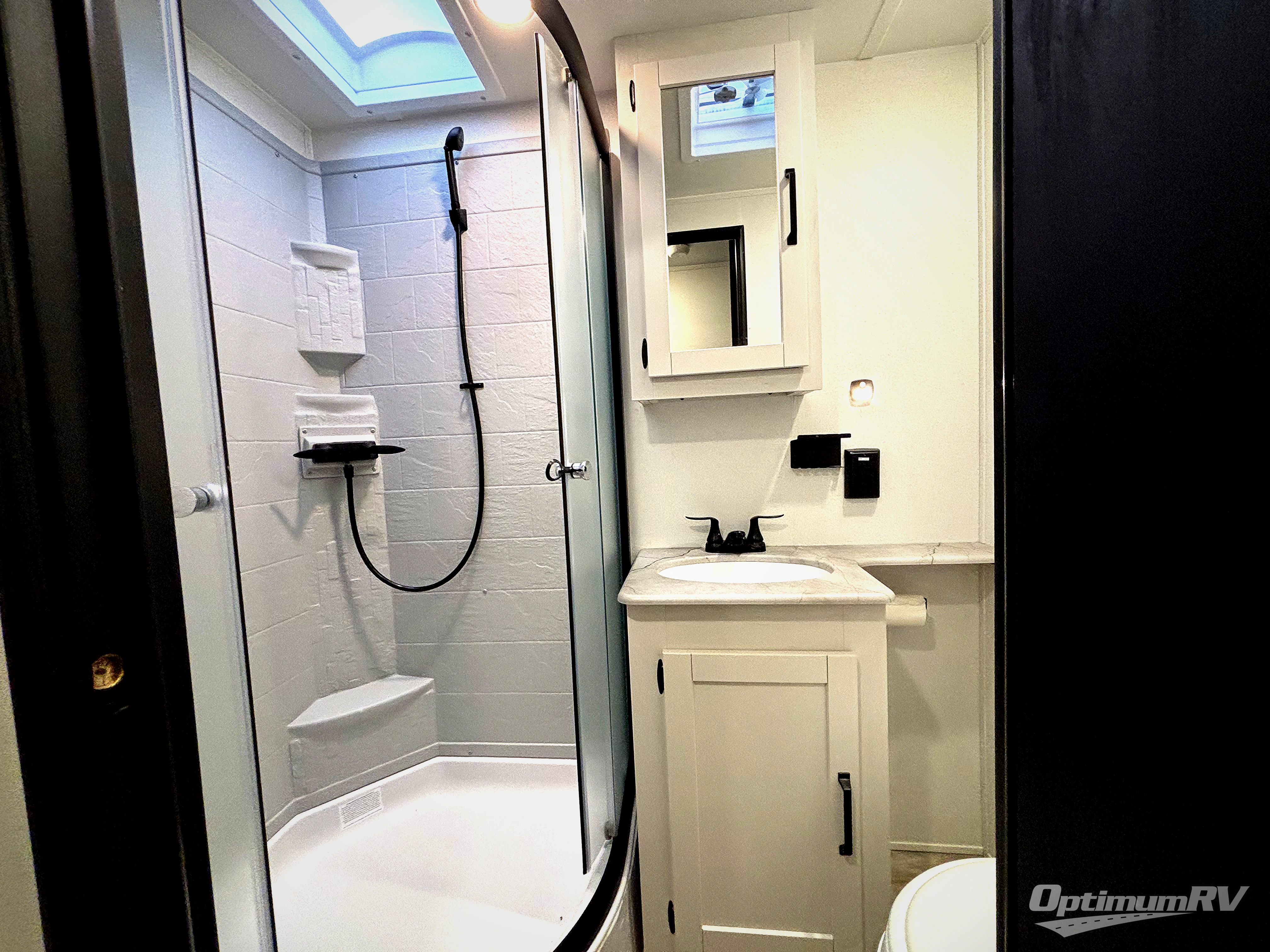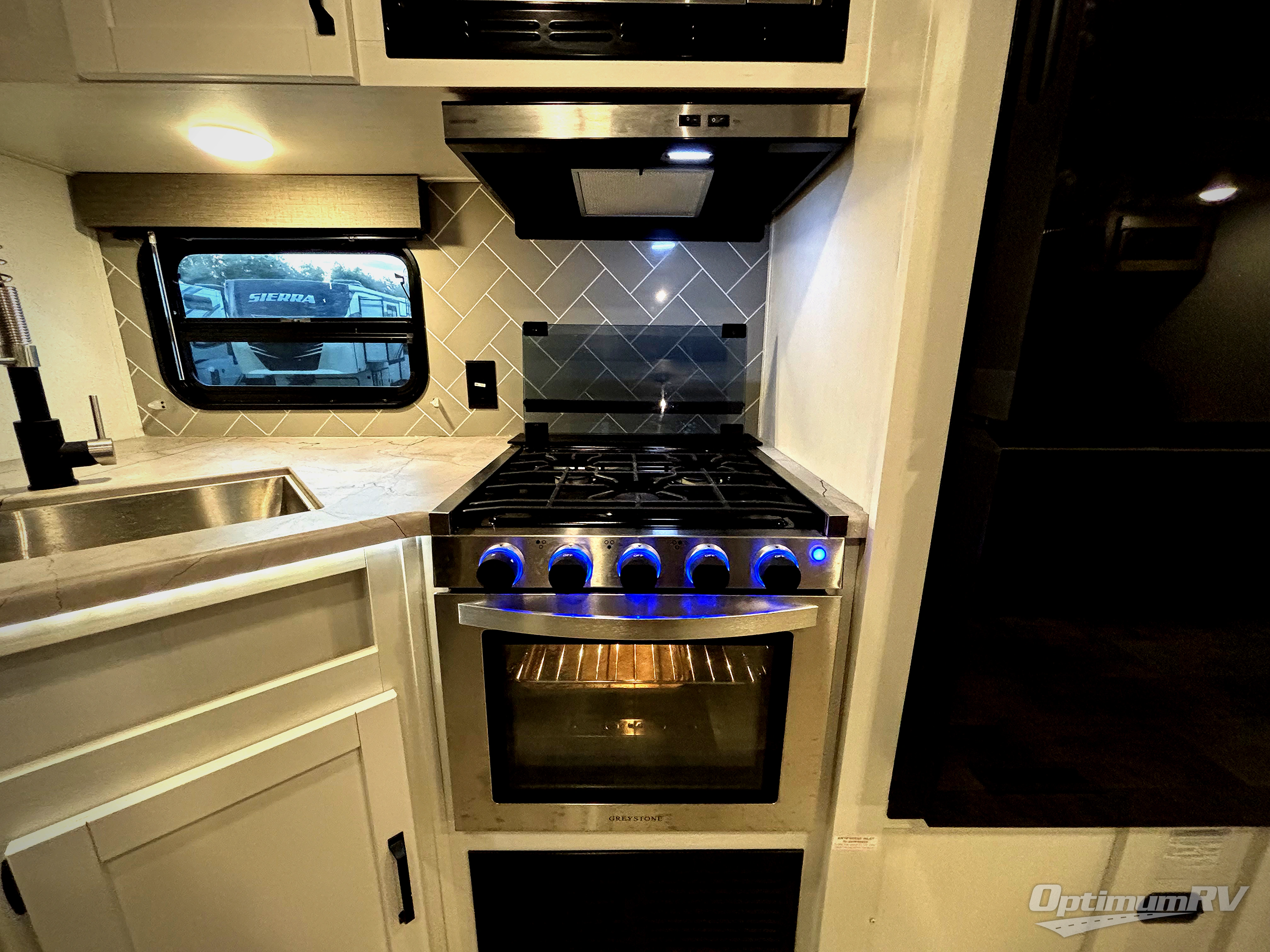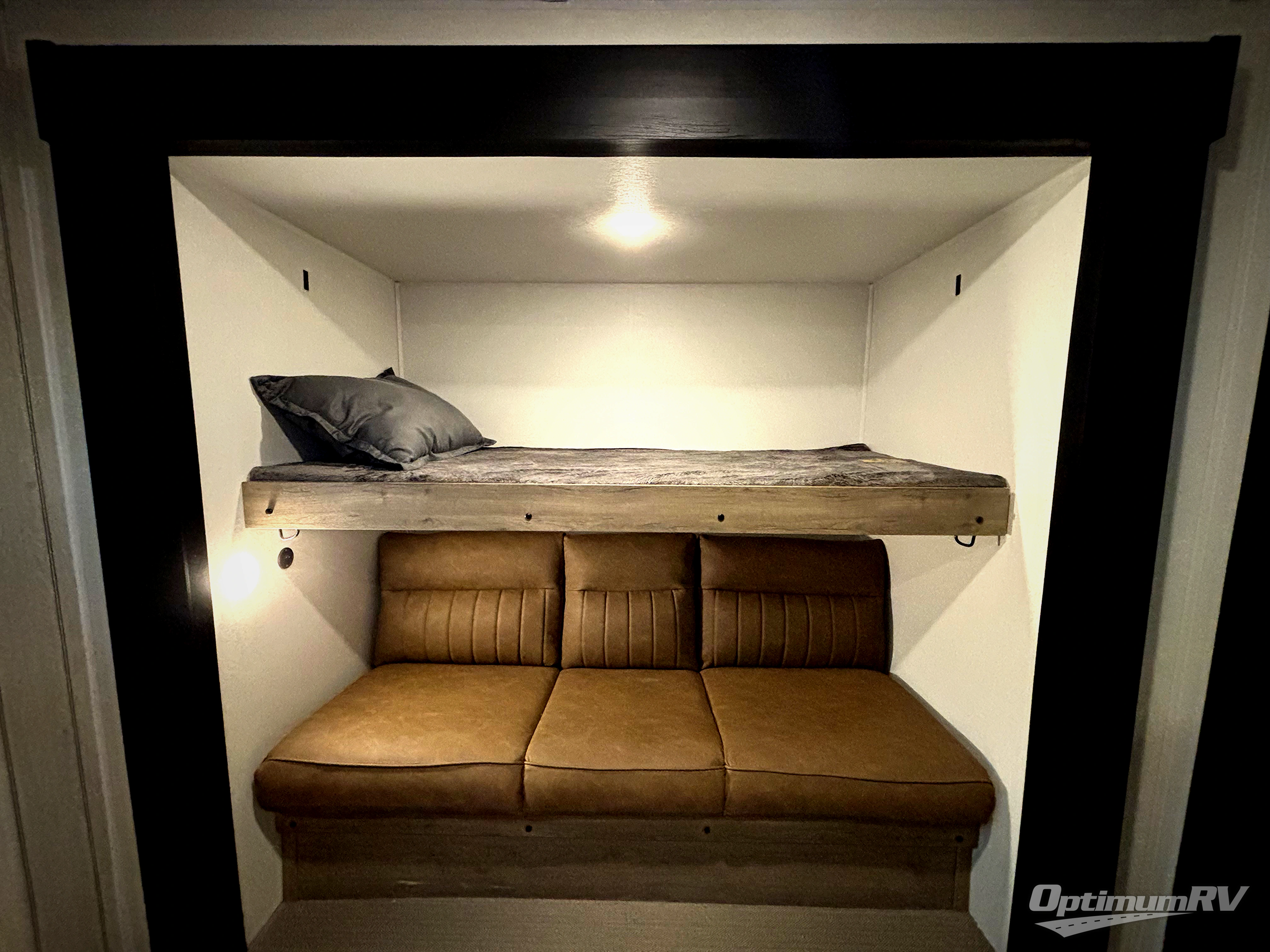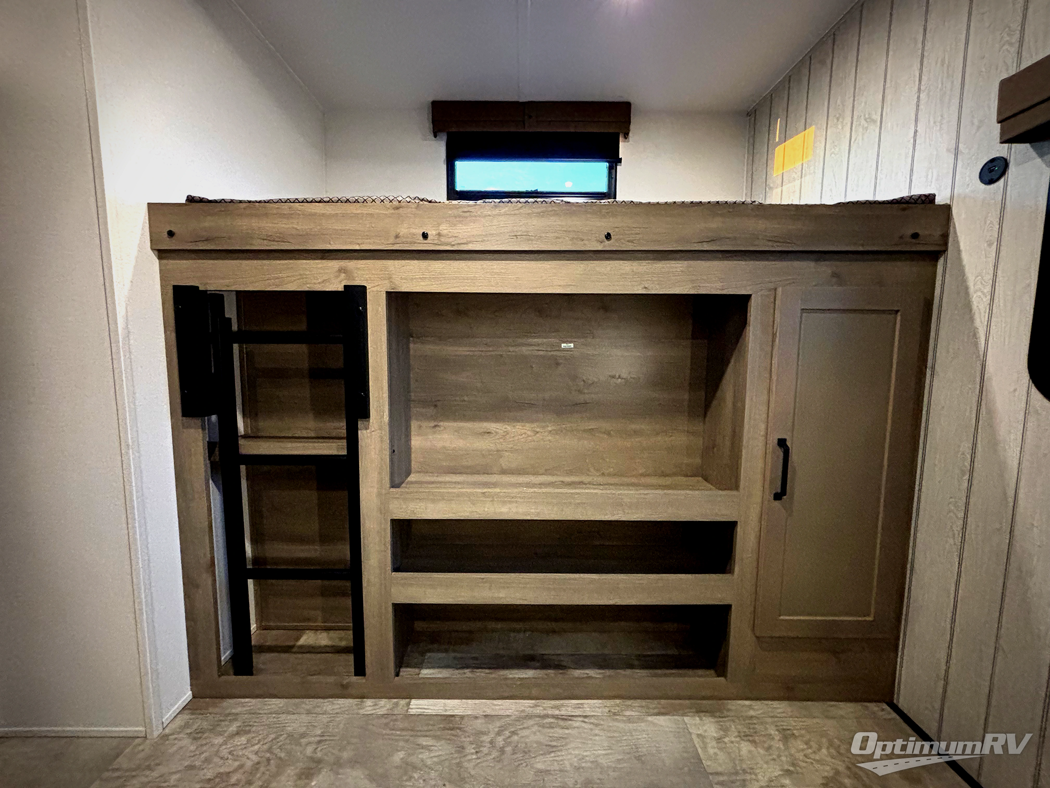 The kids will love having their own rear private bunkhouse in this travel trailer! Inside the bunkhouse is a 38" x 76" bunk above an entertainment center, a closet, and a 32" x 69" bunk above a jiffy sofa slide. The full bathroom with a 34" x 34" radius shower is just outside the bunkhouse for them to easily access it at night. They can even invite a friend or two to tag along and sleep on the sofa and U-shaped dinette once converted. Behind the entertainment center is a closet/pantry to keep your favorite snacks and the kitchen has a 12V refrigerator to keep your beverages cold. When you're ready to wind down your nights, head to the front private bedroom and relax on the queen bed with shirt closets and nightstands on either side of it, plus it has one of the dual entry doors to the unit! This model also includes two outside kitchen options if you enjoy cooking in the fresh outdoors!