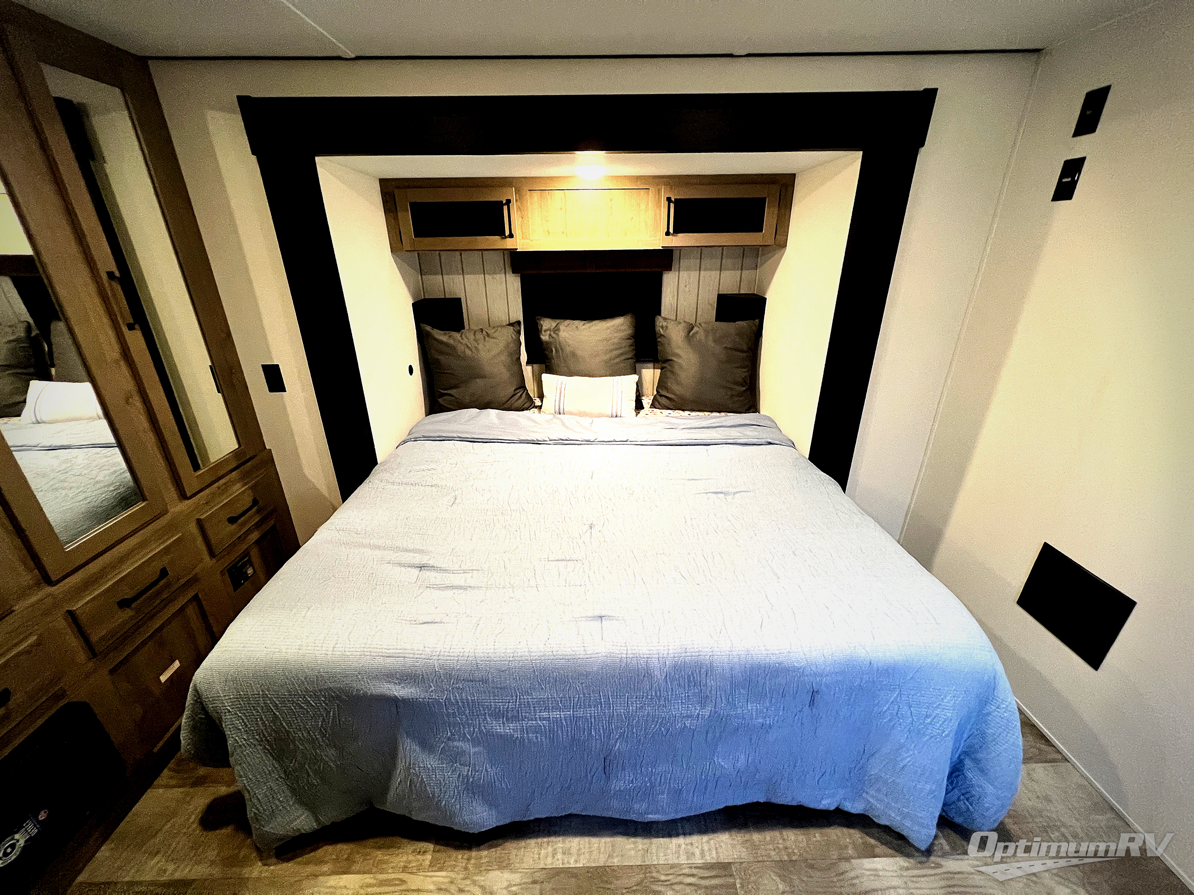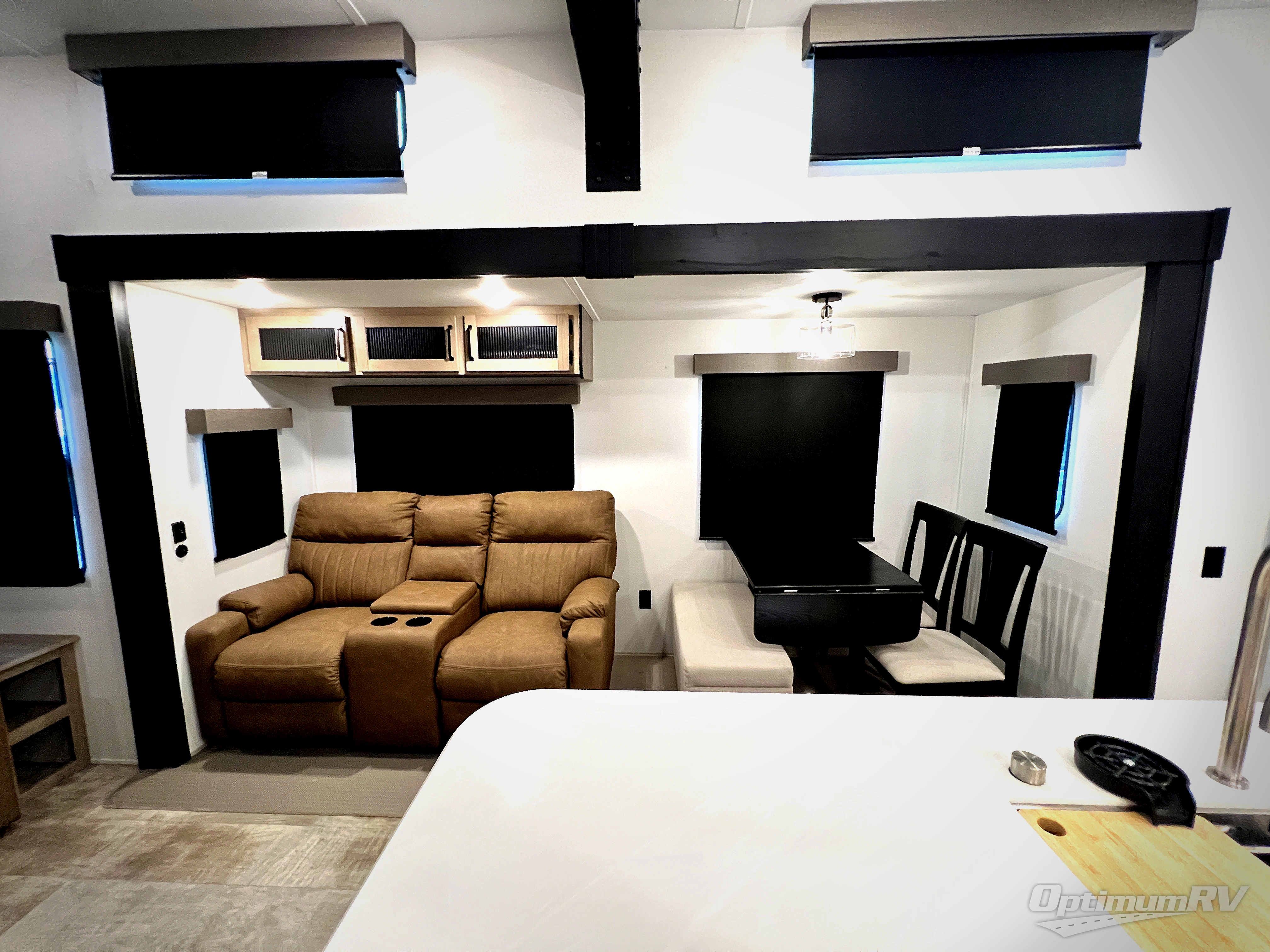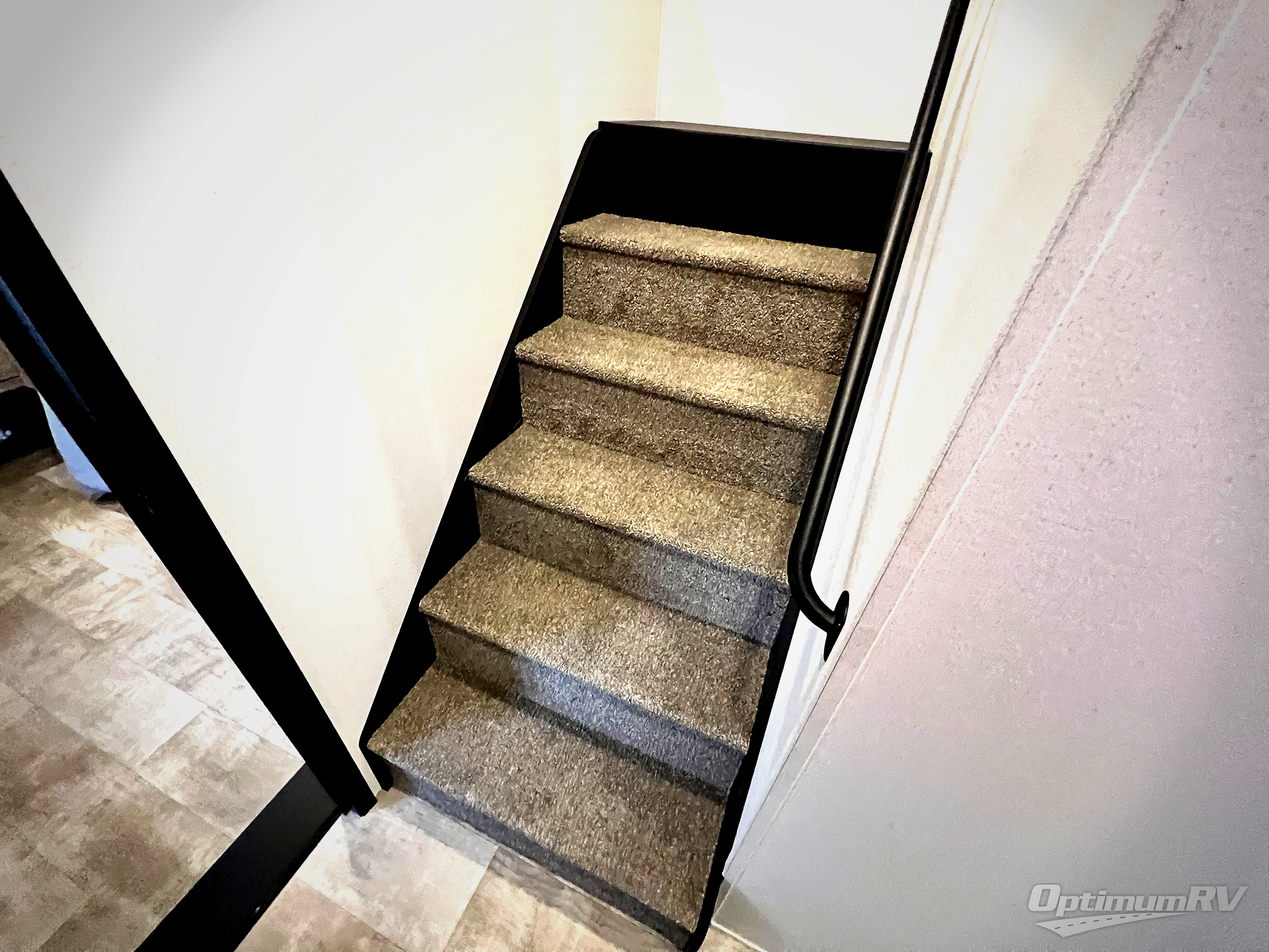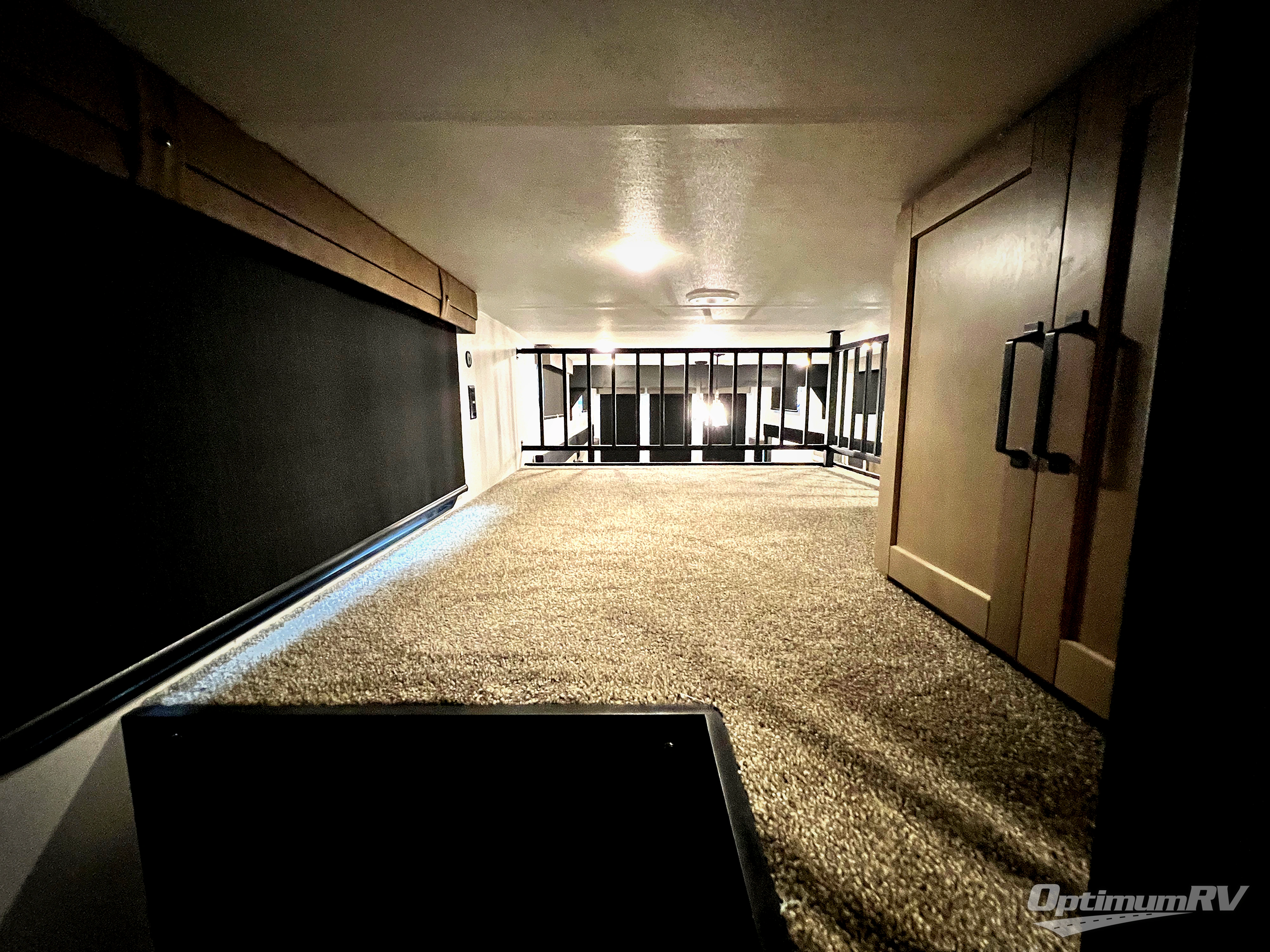 Wherever your destination may be, you can be sure to enjoy it to the fullest with this trailer in tow! With two entry doors, you can enter in through the rear private bedroom or the main living area. The bedroom includes a king bed slide out, a wardrobe/closet to keep your clothes organized, plus a closet with the option to add washer and dryer prep. Just outside this room are steps that lead to the large loft area with a 58" x 58" bunk mat and a cabinet on one side, plus two 32" x 69" bunk mats on the other. There is also a cabinet and a wardrobe/closet for plenty of storage space. Once you've headed back downstairs, you can relax on the dual recliners, front sofa, or free-standing table with a bench and two seats. And the chef of your group will love the kitchen with its residential style refrigerator and pantry, kitchen island, and four burner cooktop!