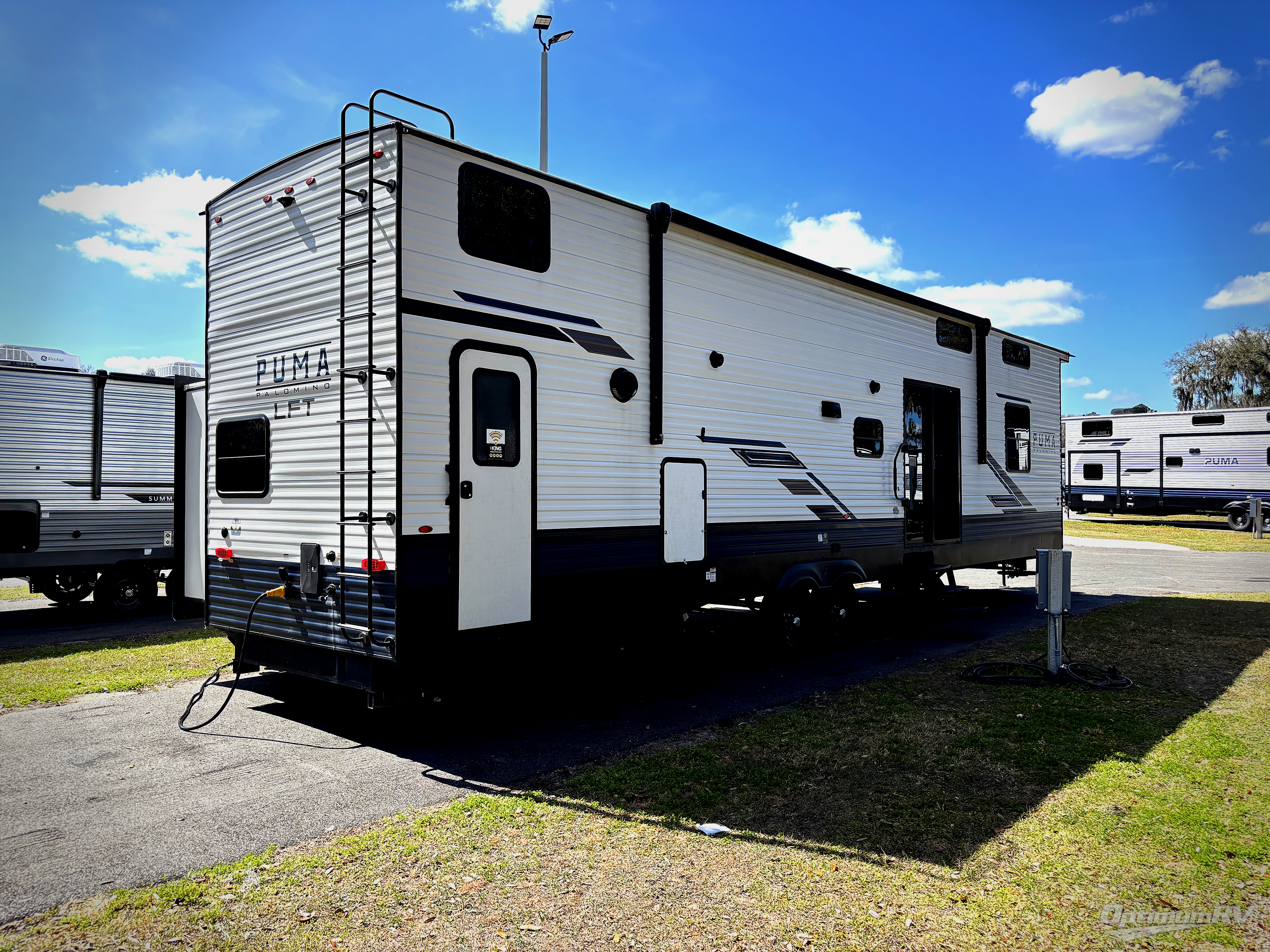 Each Puma Destination trailer by Palomino is designed to give you unforgettable getaways to the destination of your choice! The required Value Shopper Loft Package includes Congoleum designer linoleum, night roller shades, LED lighting, and a 24" stainless steel oven with a four burner stove so you can make meals just like you would at home. The tankless water heater is another feature you won't want to camp without, and there is WiFi prep, solar prep, plus optional washer and dryer prep for the option to further customize your trailer. An outside shower is included with the required Loft Package, along with two exterior speakers, solid surface countertops, four stabilizer jacks, and more!
